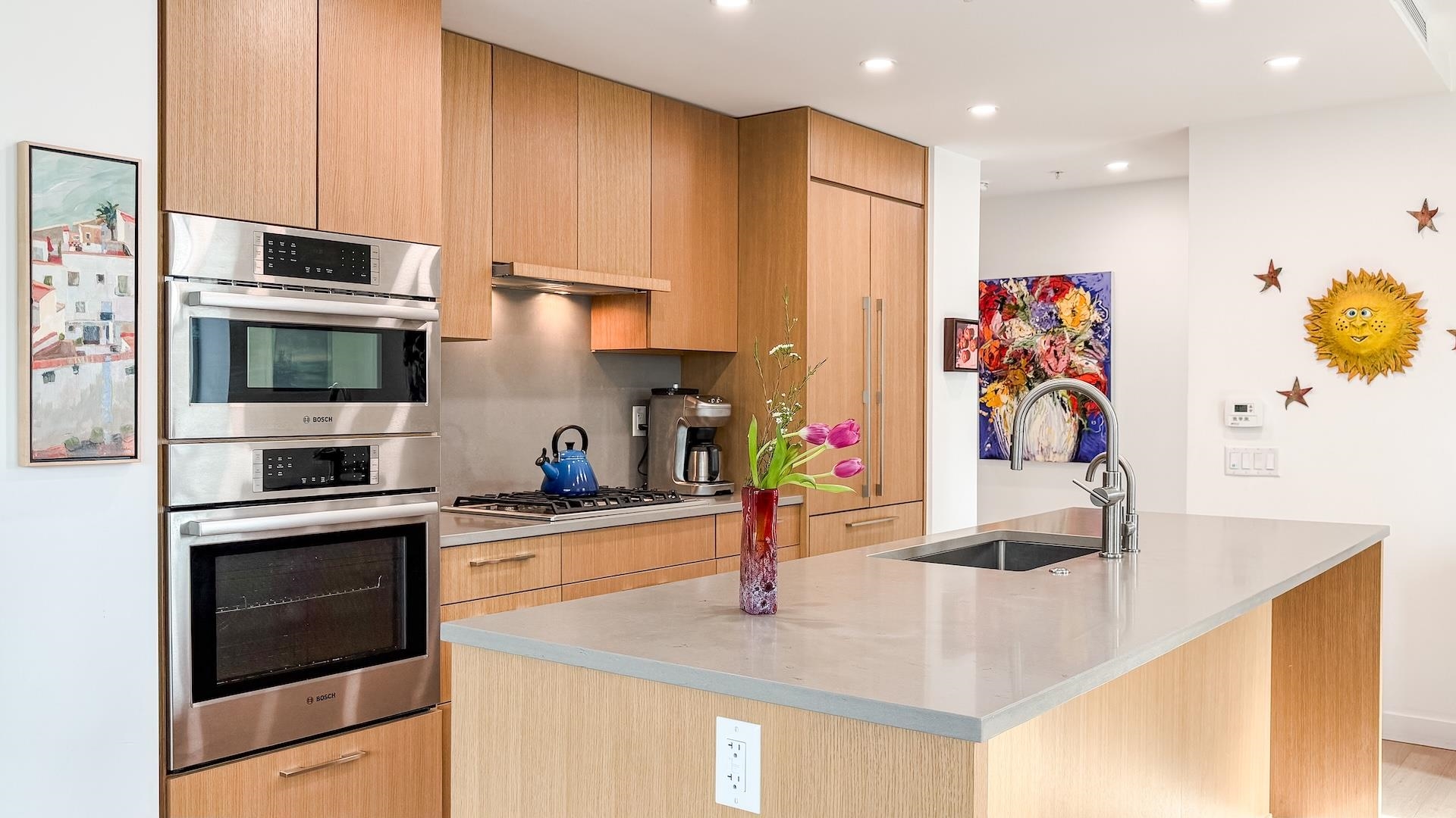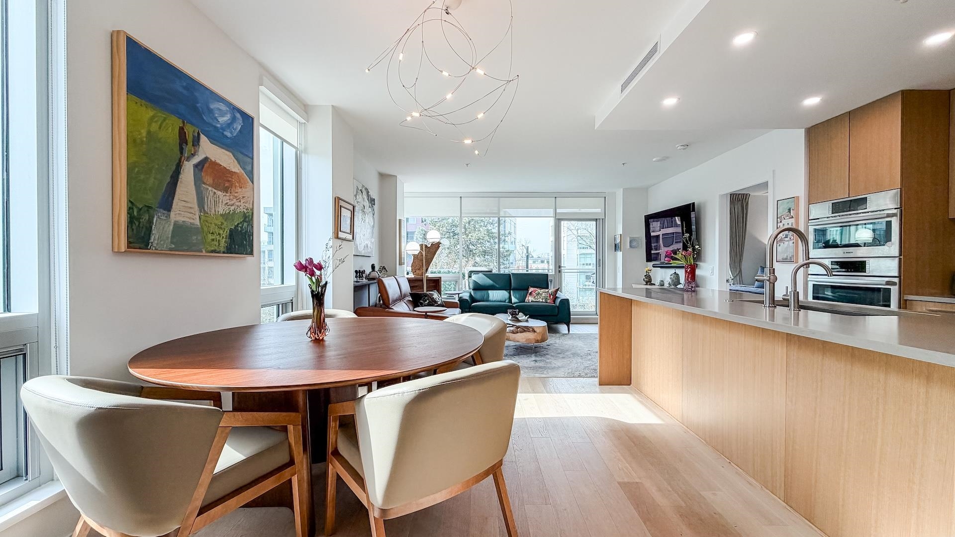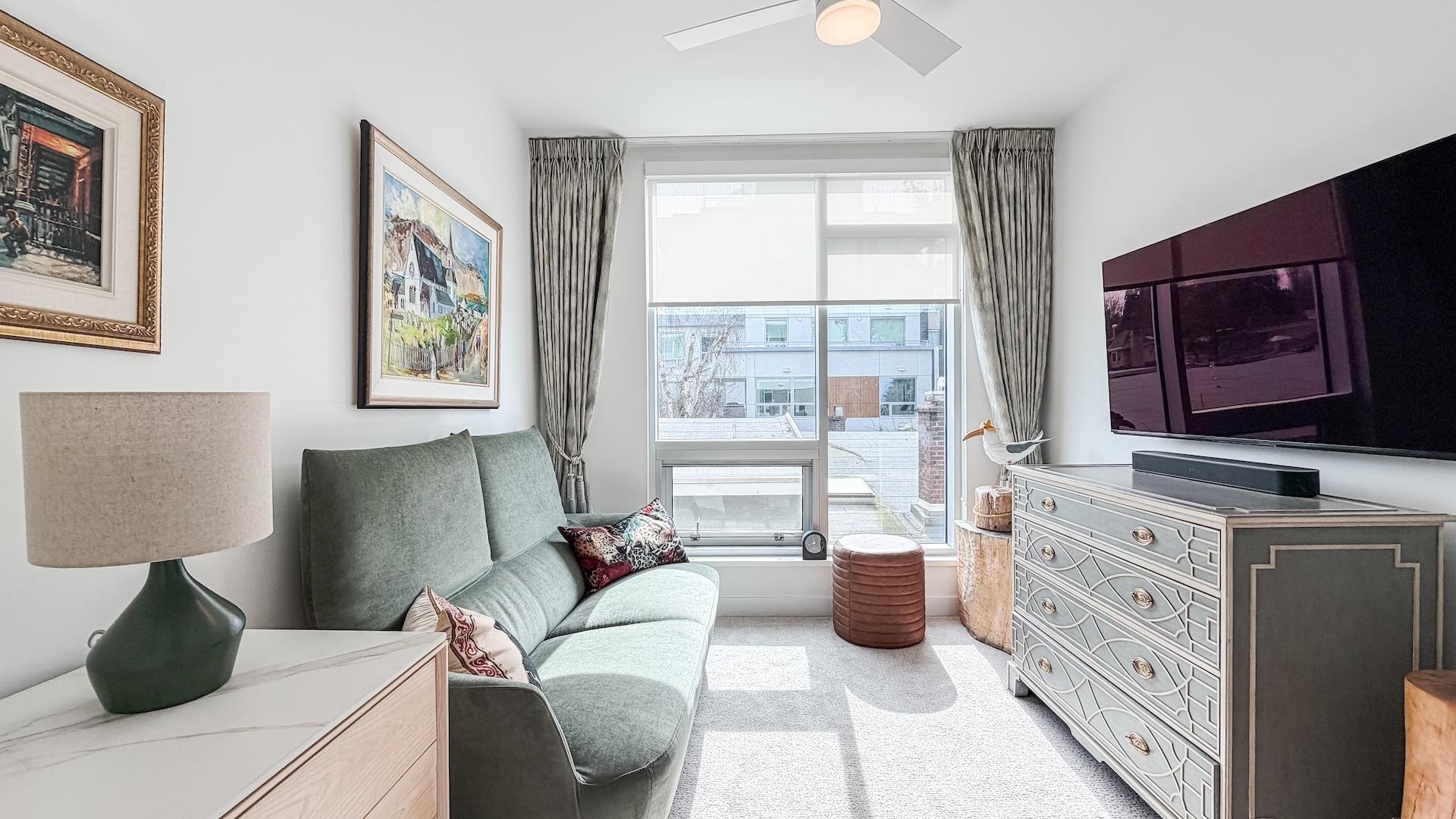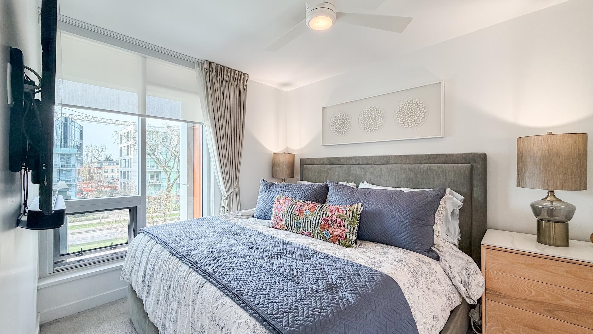 Spectacular Home! South west-facing corner residence at Hawthorne offering 1,135 sq ft, 2-bedroom, 2 bath & flex/pantry beside Queen Elizabeth Park. Open layout with dual-pane windows fills the contemporary living space with natural light. Gourmet kitchen with Bosch appliances, quartz counters /backsplash, custom cabinetry and breakfast bar. Air Conditioning, large 92 sq. ft. balcony, 2 side-by-side parking stalls and 1 large locker. Upgrades included a Viking cooktop, a Miele dishwasher, an LG washer/dryer...
