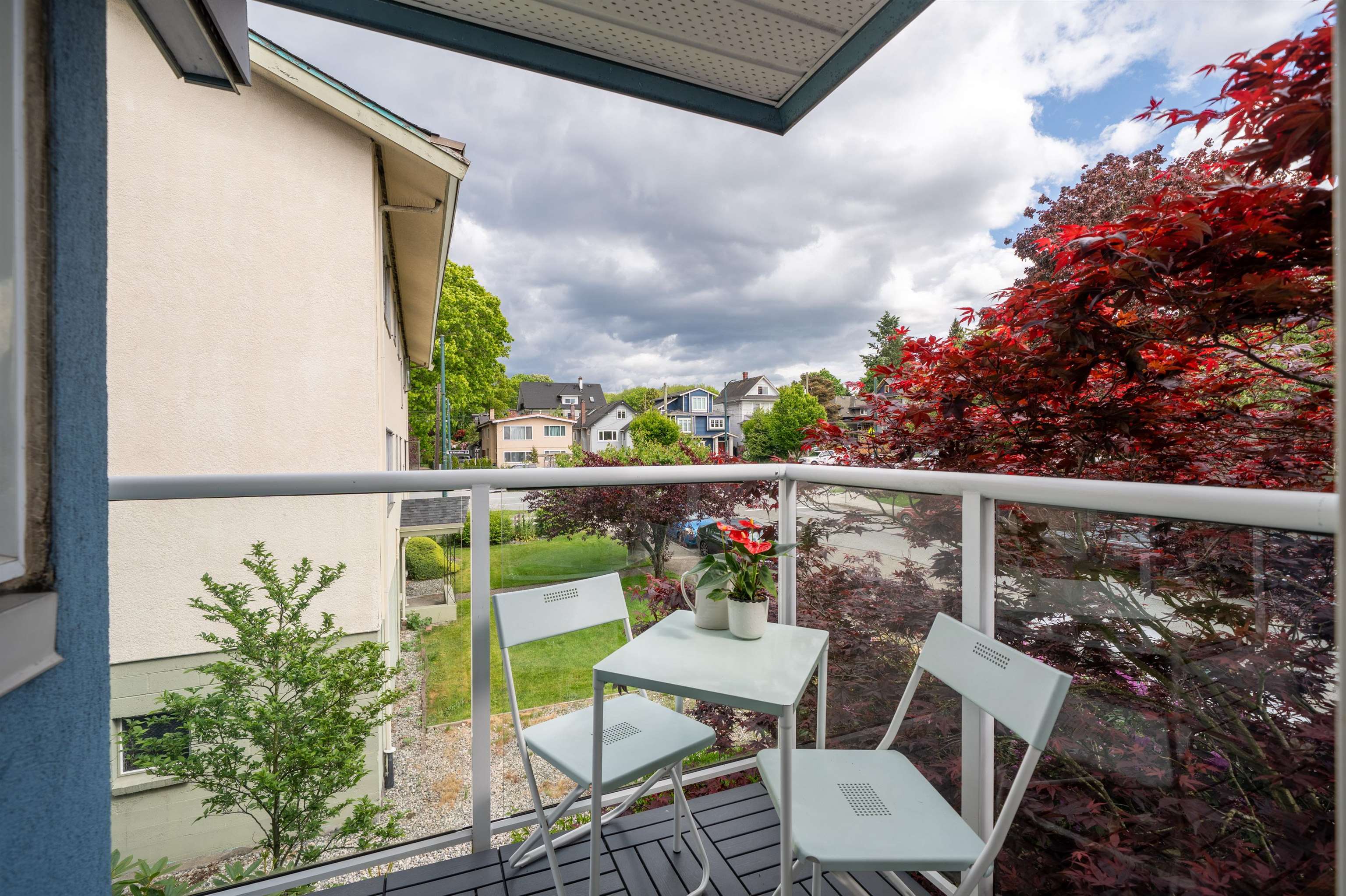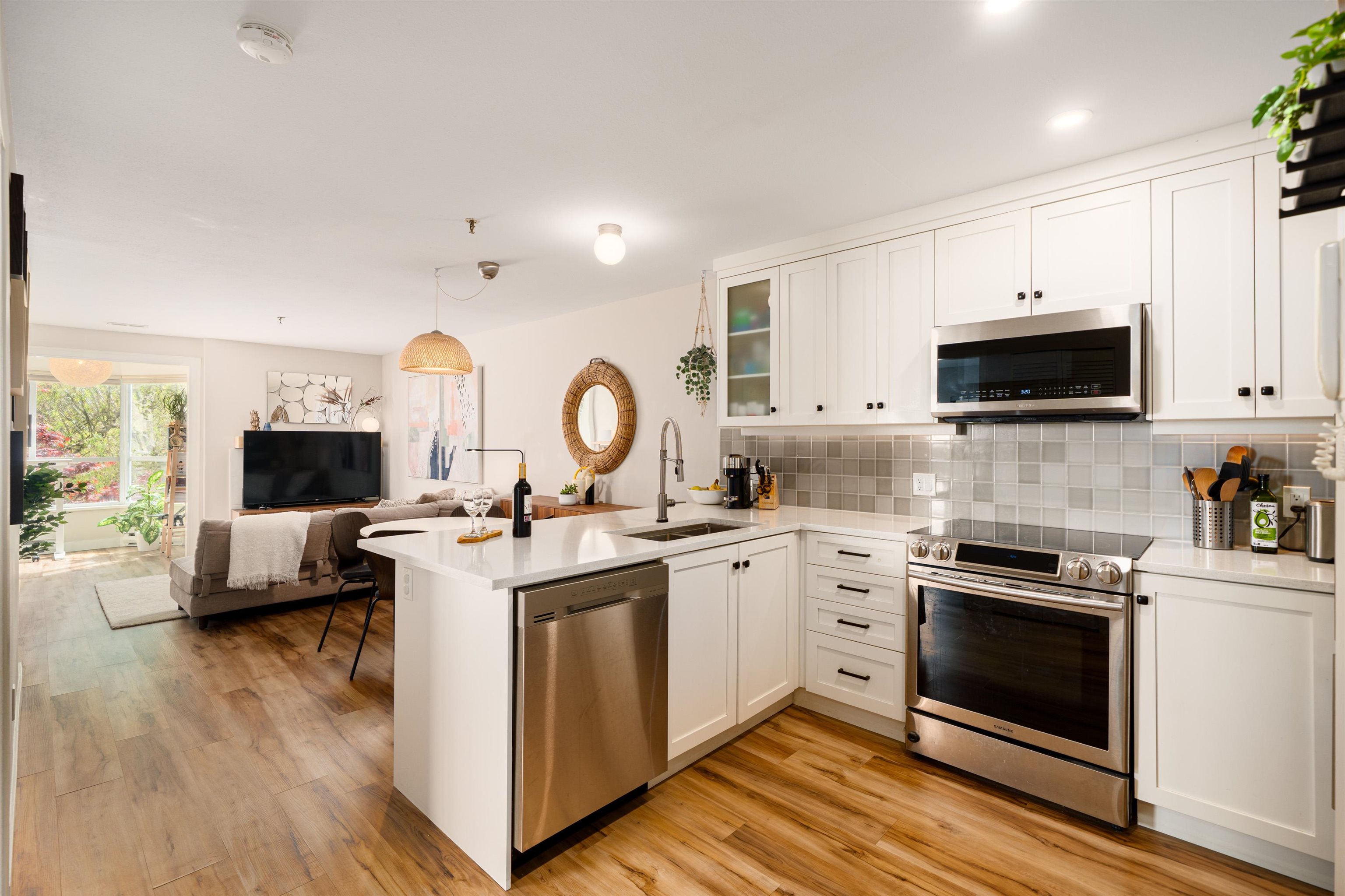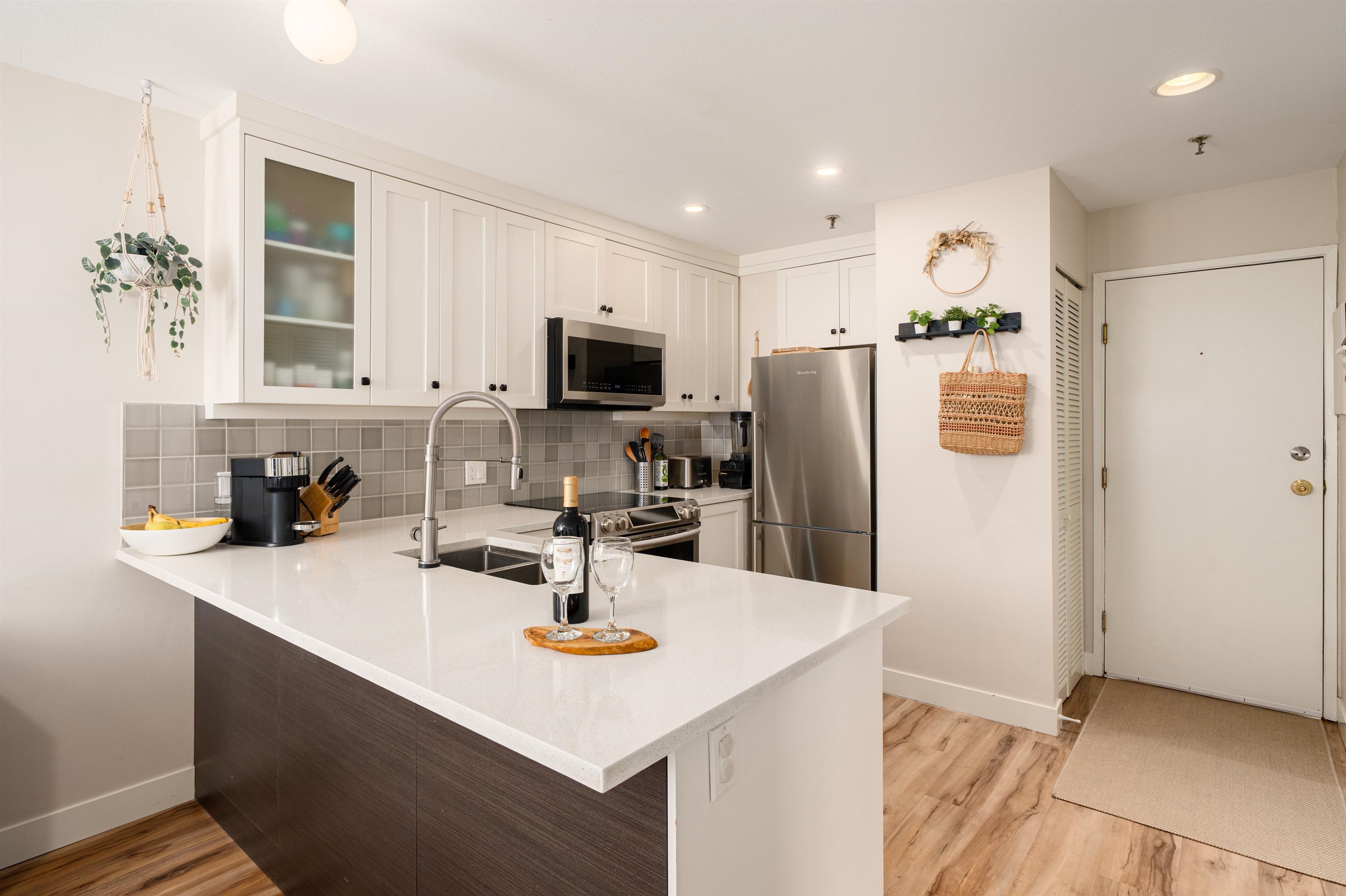 Southeast, CORNER home of a RAINSCREENED, boutique building, this airy condo offers PRIVACY and NATURAL LIGHT. This beloved home feels bigger than its 774sf with 2 bedrooms and a sunny open den (solarium). FULLY RENOVATED: vinyl plank throughout, updated appliances, cabinetry, extended quartz counters, extra hidden pantry, a deep soaker tub, newer washer/dryer & hot water tank, and Mysa thermostats. There's nothing to do but move in! Belong to a CLOSE-KNIT COMMUNITY in a hidden gem neighbourhood near Pandor...
