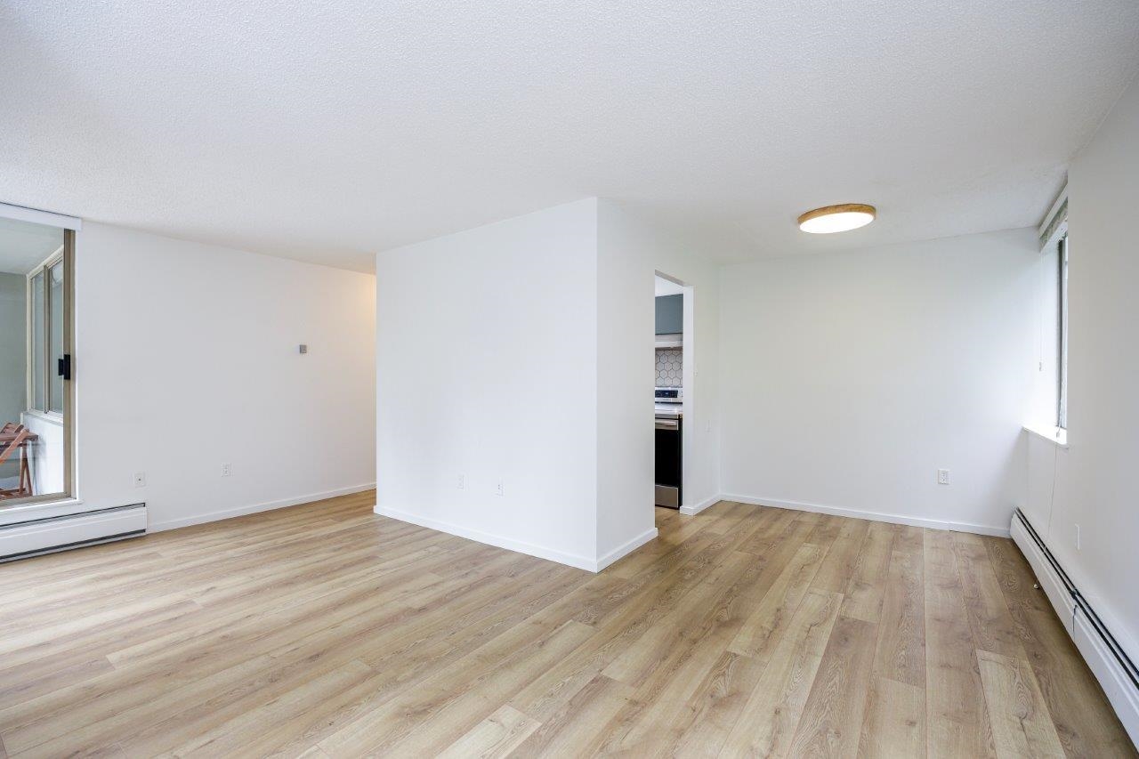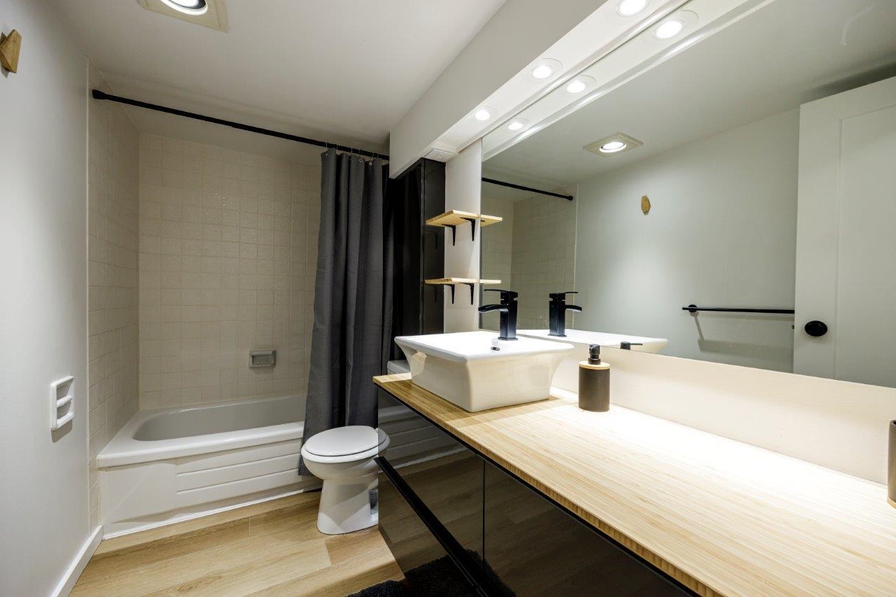 Great value here for this spacious and fully renovated, 906 sq ft, 2 bedroom plus den/storage unit is located in the popular Seymour building at Woodcroft. A beautiful renovation was completed in 2020 including paint, updated bath and stunning kitchen with quality wood countertops and new appliances. The corner unit has a lovely, green and private outlook. Relax on the covered balcony. Incredible amenities include indoor pool, whirlpool, gym, sauna and workshop. Parkade membrane project ongoing but has been...