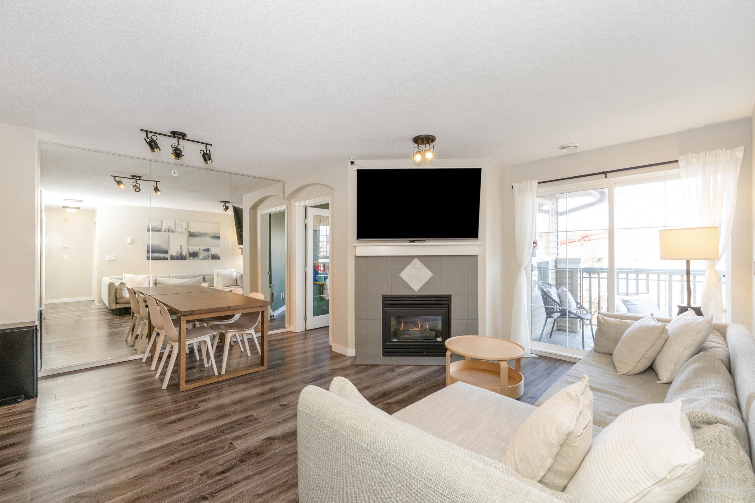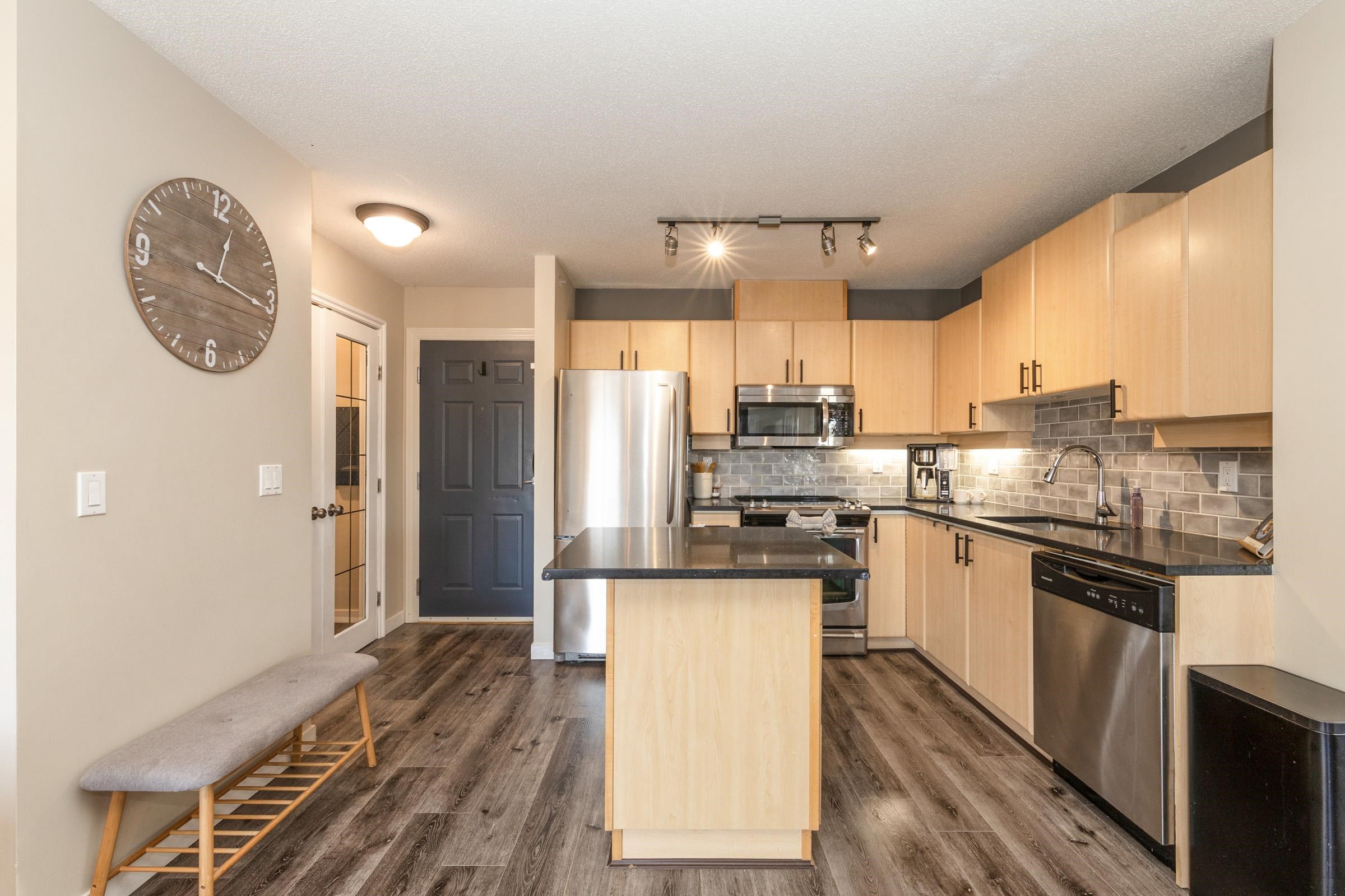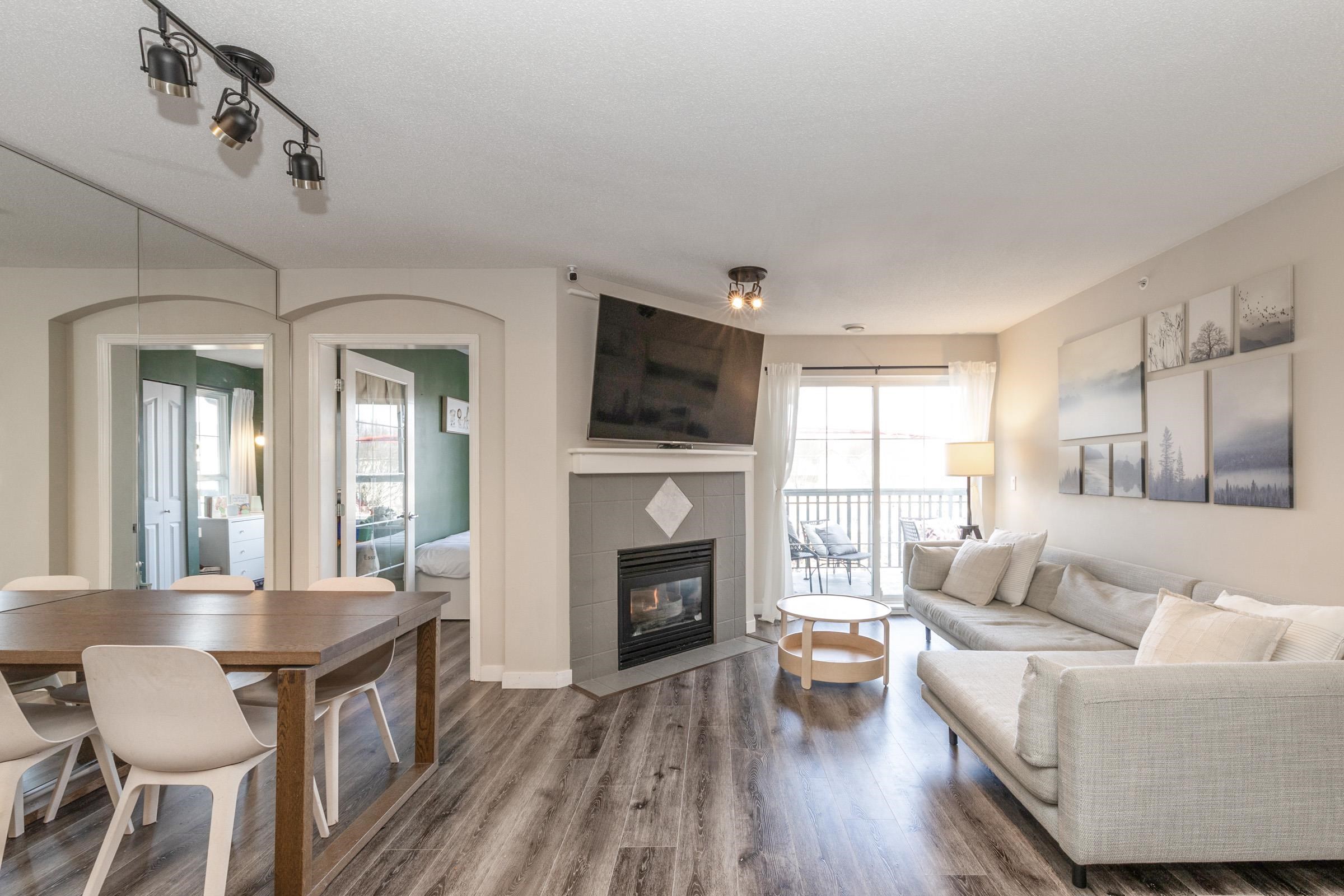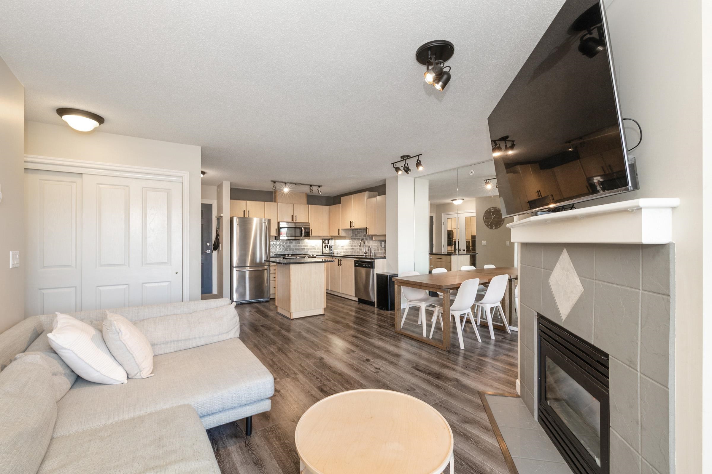 Stunning top-floor 2 bed + den condo blending modern style & comfort. Fully renovated with a sleek kitchen featuring stainless steel appliances, quartz counters, large island, stylish backsplash, fresh laminate floors & new paint. Bright, open living/dining area with cozy gas fireplace (included in fees) flows to a generous balcony offering beautiful mountain views—ideal for coffee or gatherings. Sunny primary suite has walk-in closet, large picture window & custom accent wall. Spa-like bathroom boasts new ...