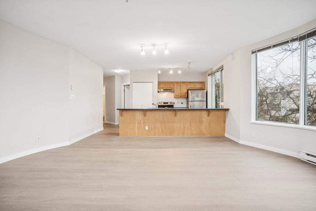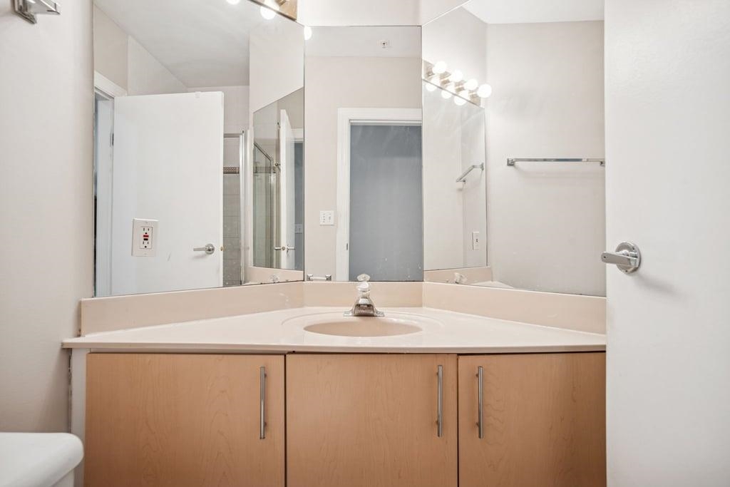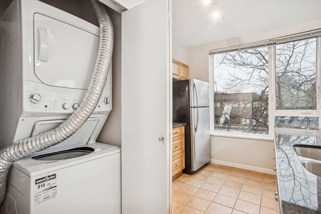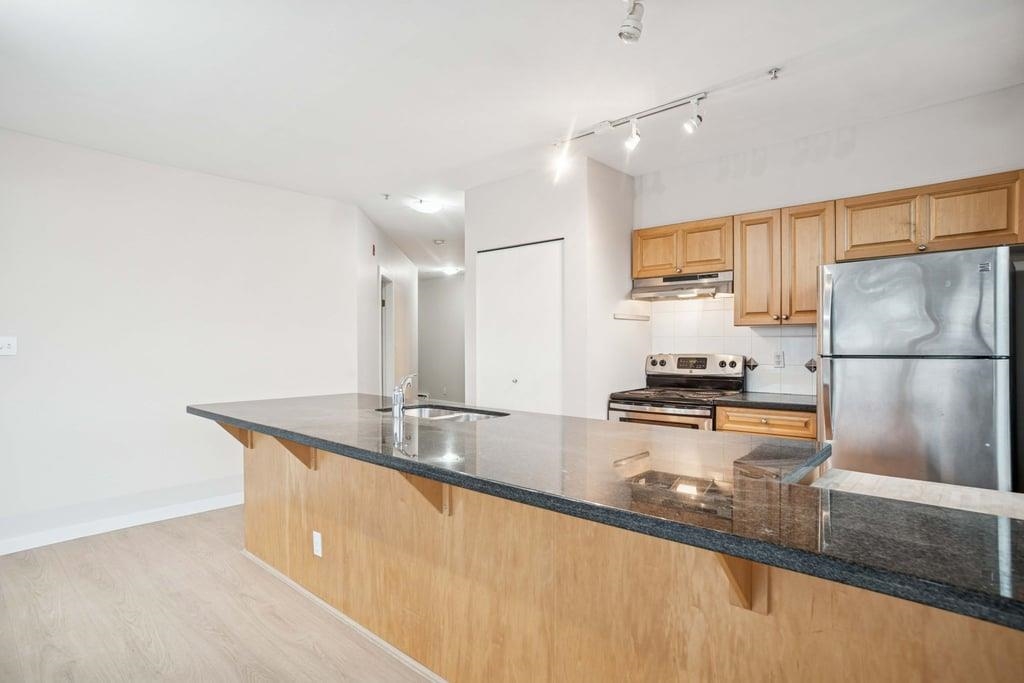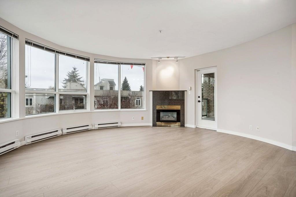 This bright 1,076 sq ft corner unit at Yorkville South features two bedrooms, two bathrooms, and laminate flooring throughout. The foyer offers a large insuite storage room and several closets. The open living room has a circular windowed corner that brings in all-day sunlight, a granite gas fireplace, and access to a large balcony. The dining area connects to a kitchen with a big center island, long breakfast bar, granite counters, maple cabinets, tile floors, and stainless steel appliances. The spacious p...