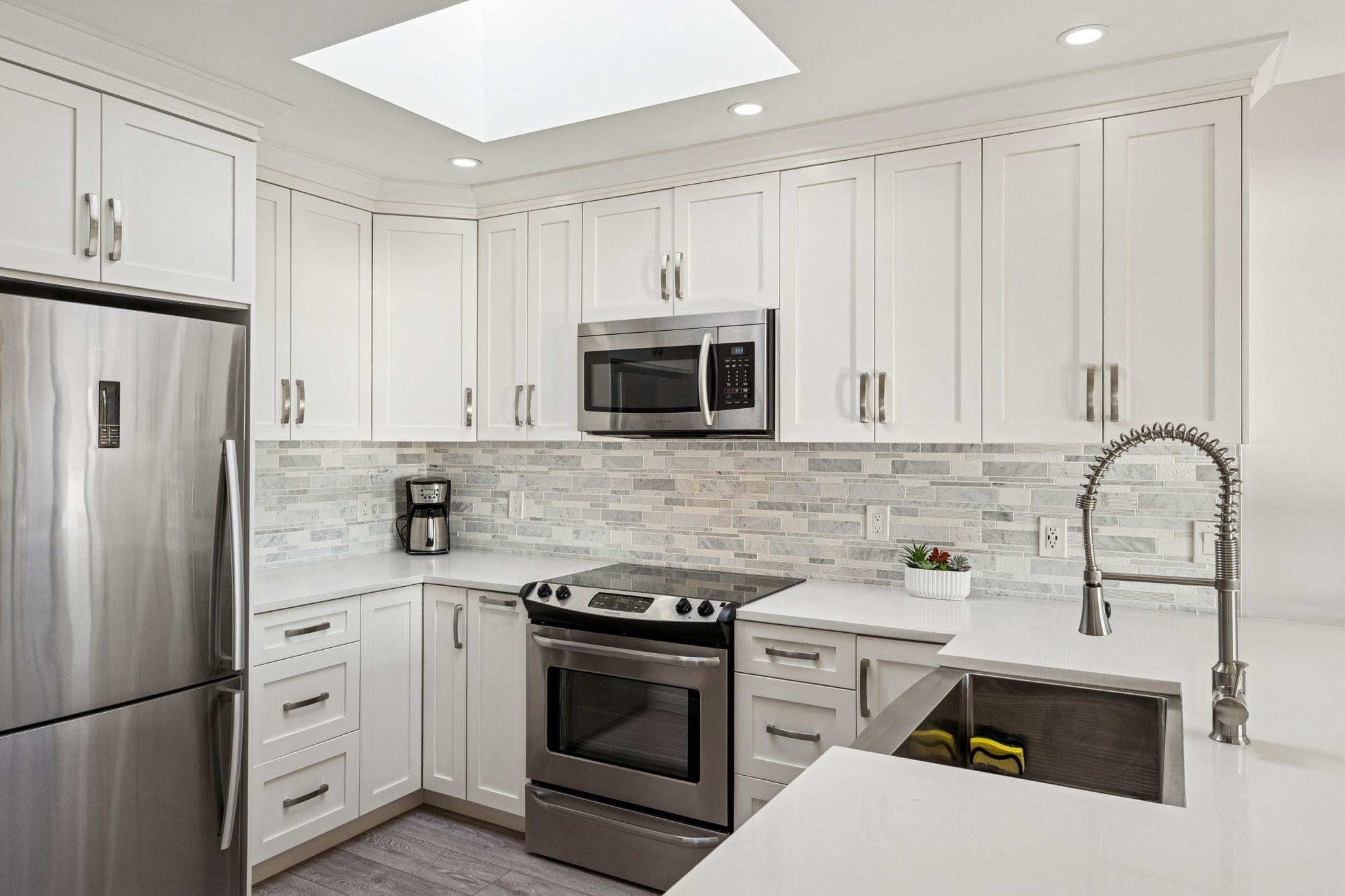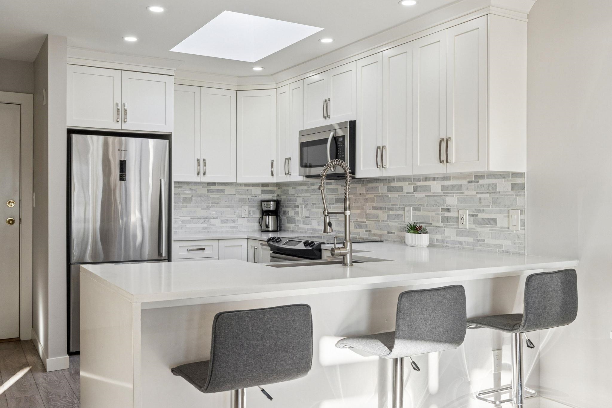 Welcome to this BRIGHT, TOP-FLOOR one-bedroom suite in Lower Lonsdale. It's on the sunny side of the building & has been beautifully renovated. You'll love the southwest VIEWS of the city & harbour, plus the skylights that illuminate the spacious kitchen & entry. The layout is perfect, with generous living & dining areas, a striking gas fireplace, & a large bedroom with custom closet organizers. The ensuite bathroom has a deluxe walk-in shower. Plus, you get IN-SUITE LAUNDRY, a built-in desk, & a private co...