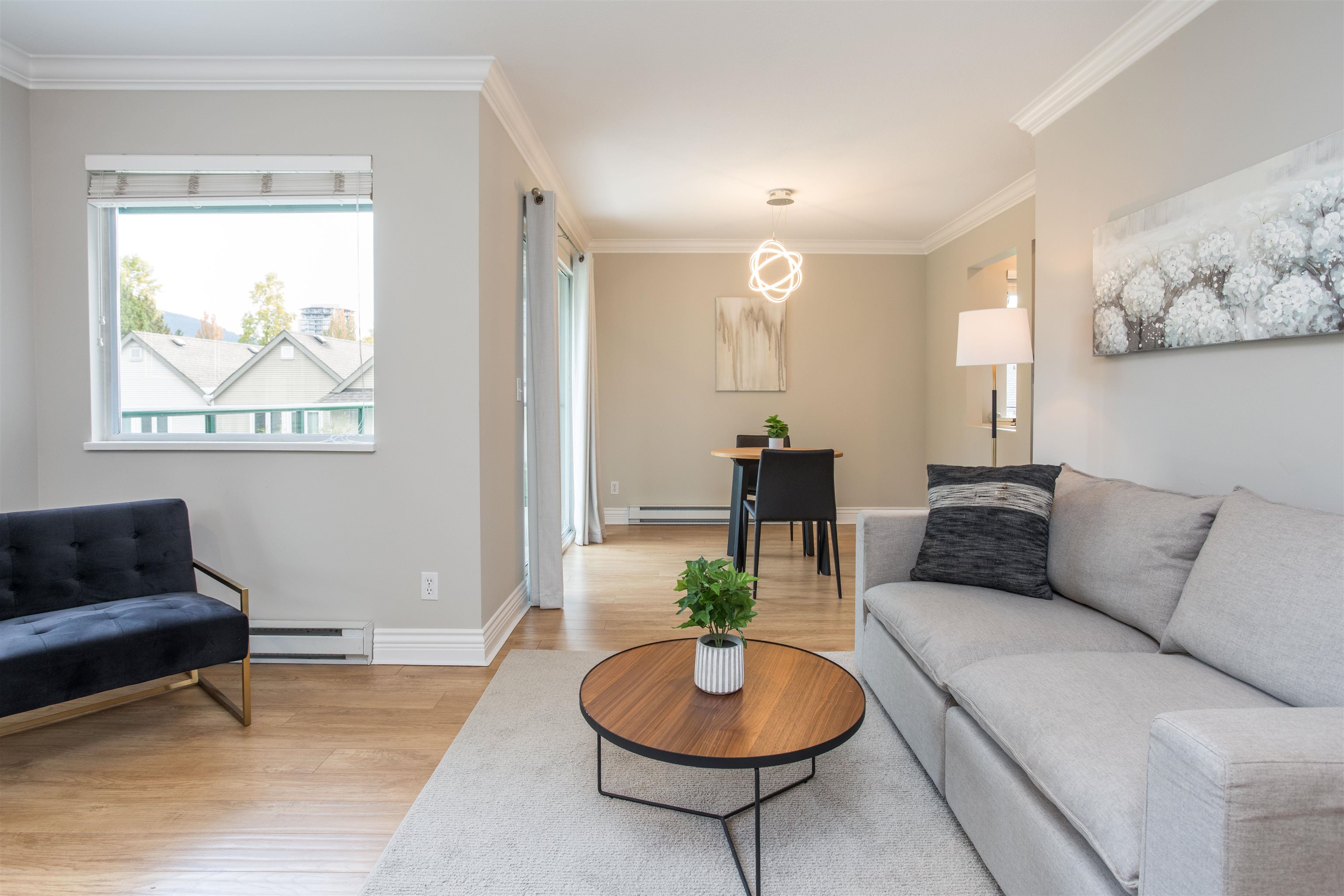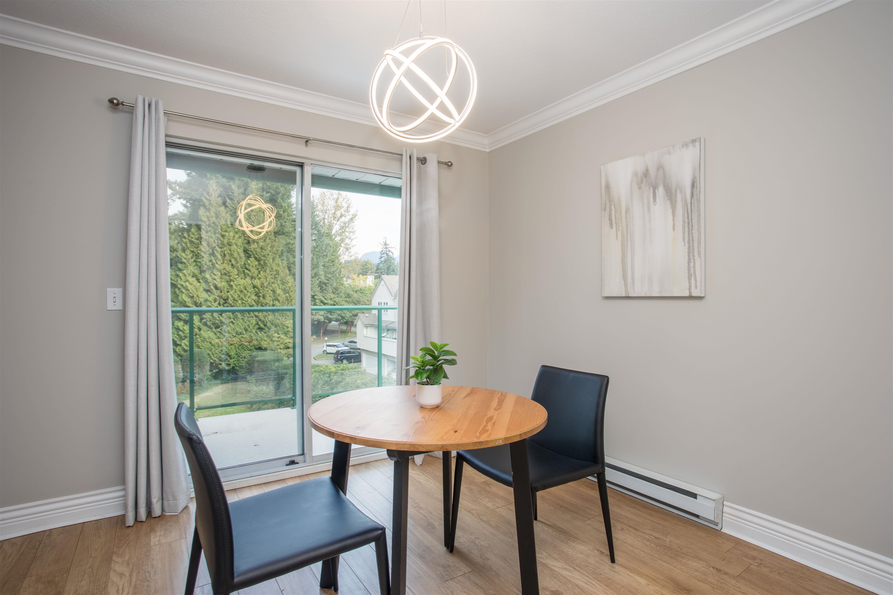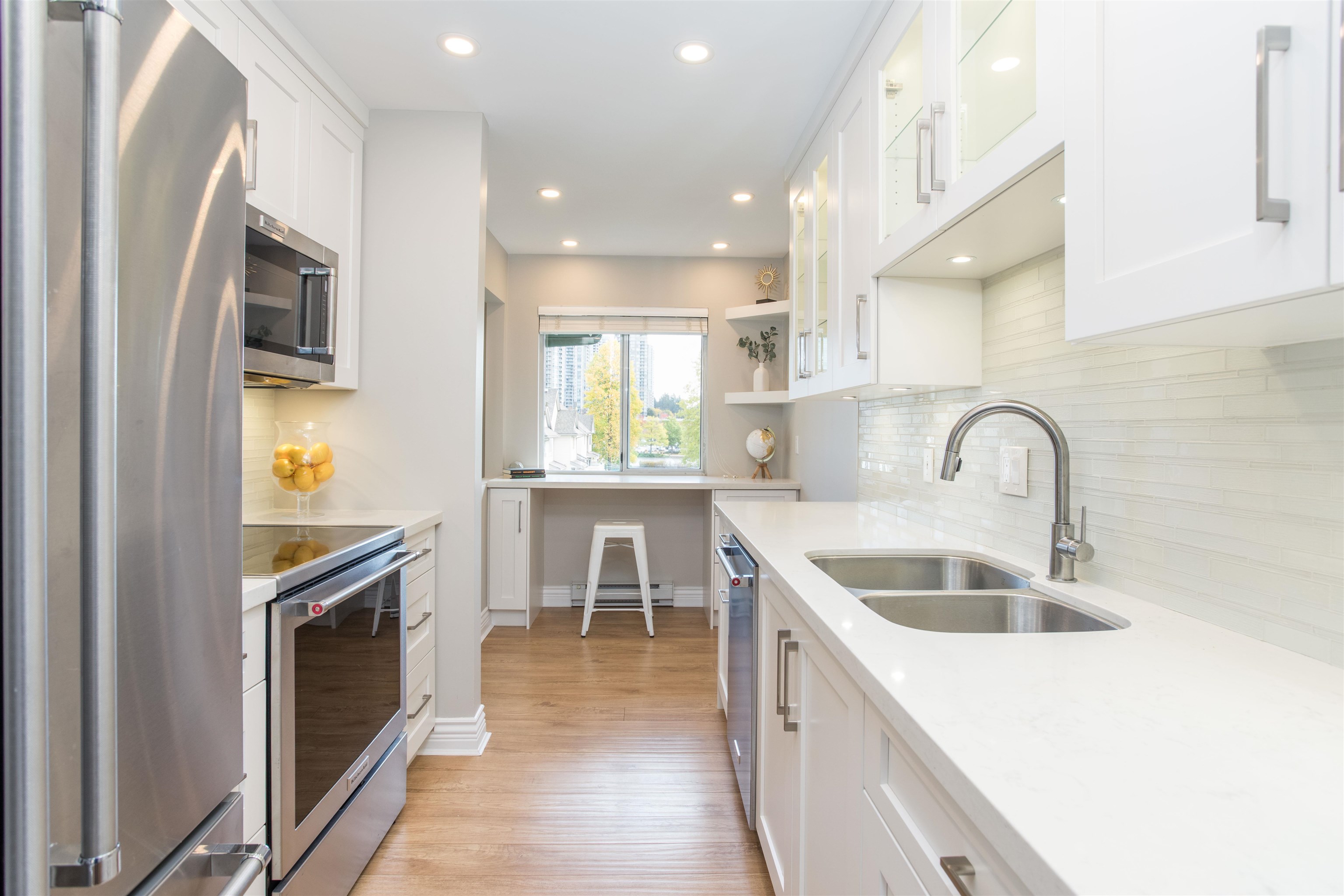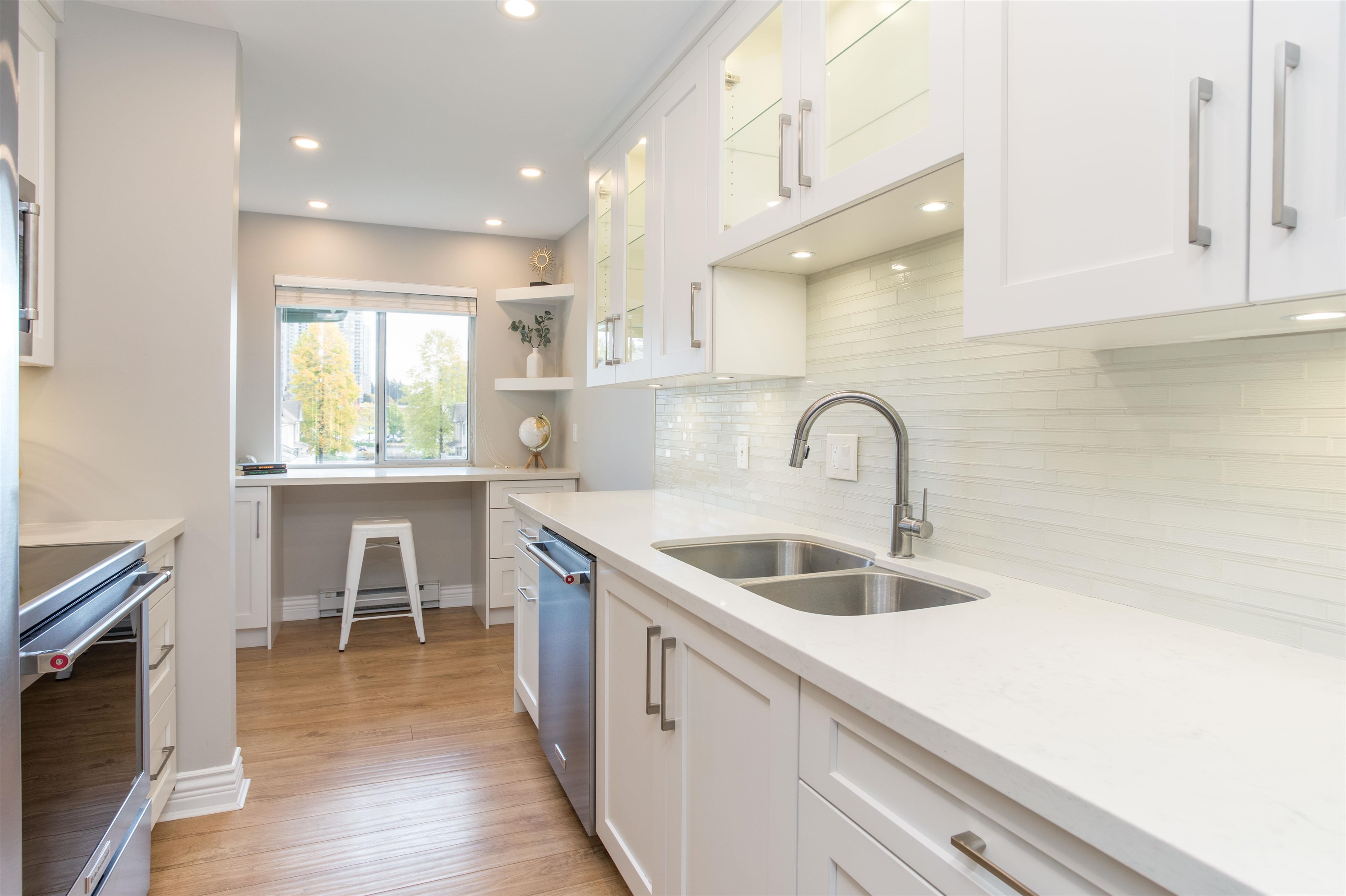 TOP FLOOR CORNER UNIT! Lots of natural daylight! Stunning 1 bed & 1 bath is perfectly situated in the heart of Coquitlam on a quiet cul-de-sac, just steps from Coquitlam Centre, Lafarge Lake & the Aquatic Centre. Recently updated! Kitchen w/ white shaker cabinets & built in lighting, quartz counters, stainless-steel appliances, glass tile backsplash, pot lights, new fixtures w/ a built-in desk-ideal for working from home. The unit boasts laminate floors, crown mouldings, thick baseboards & a spacious patio ...