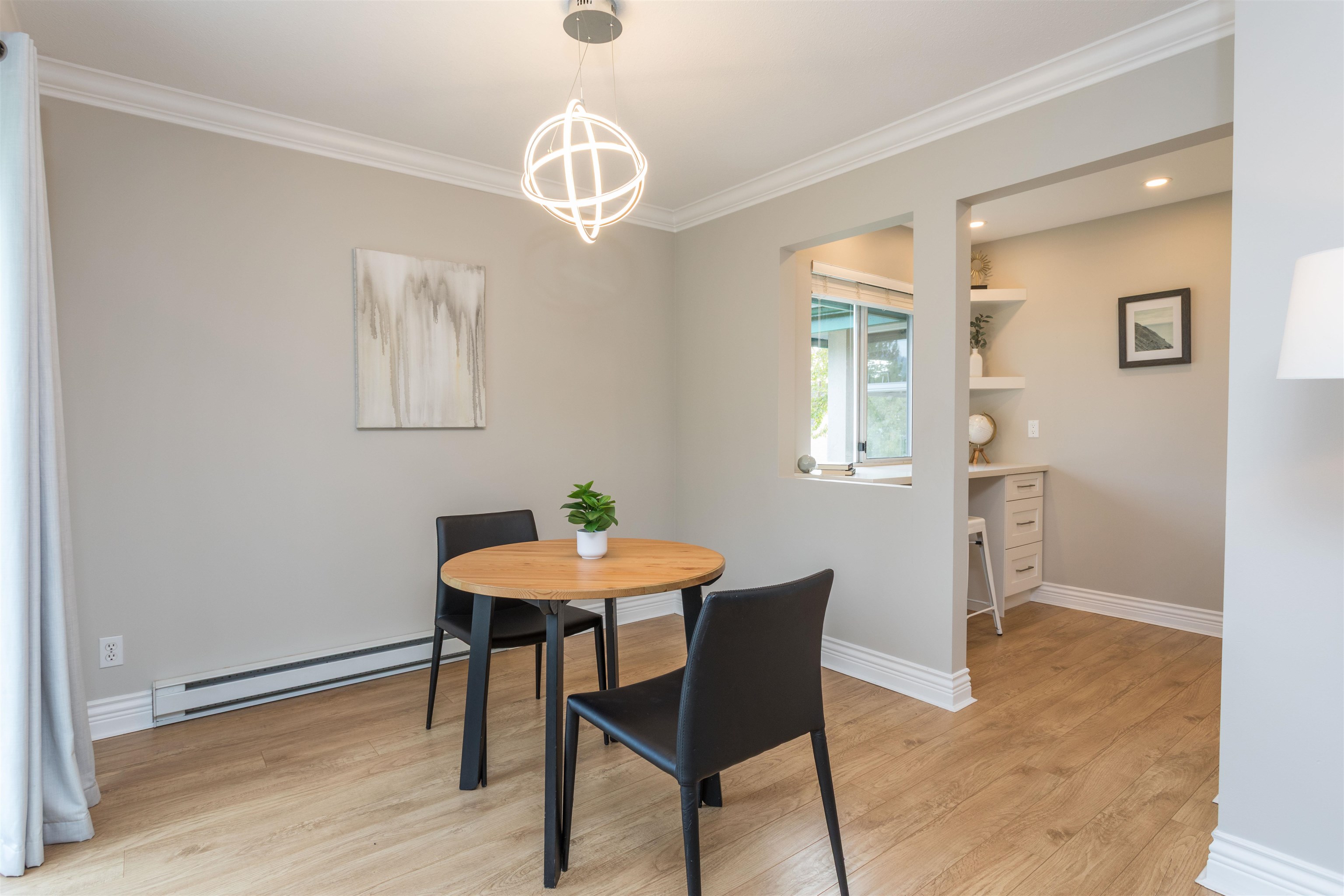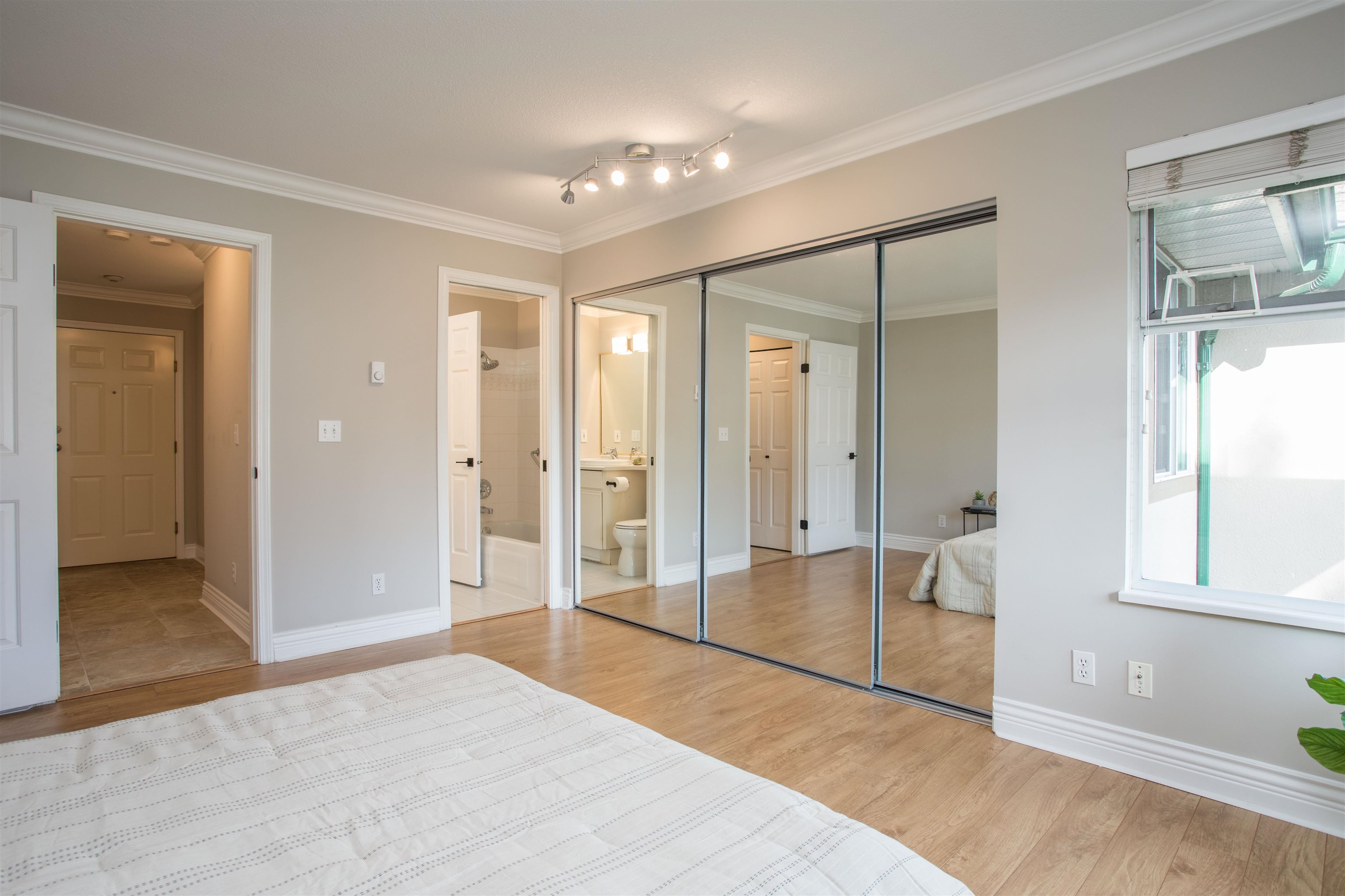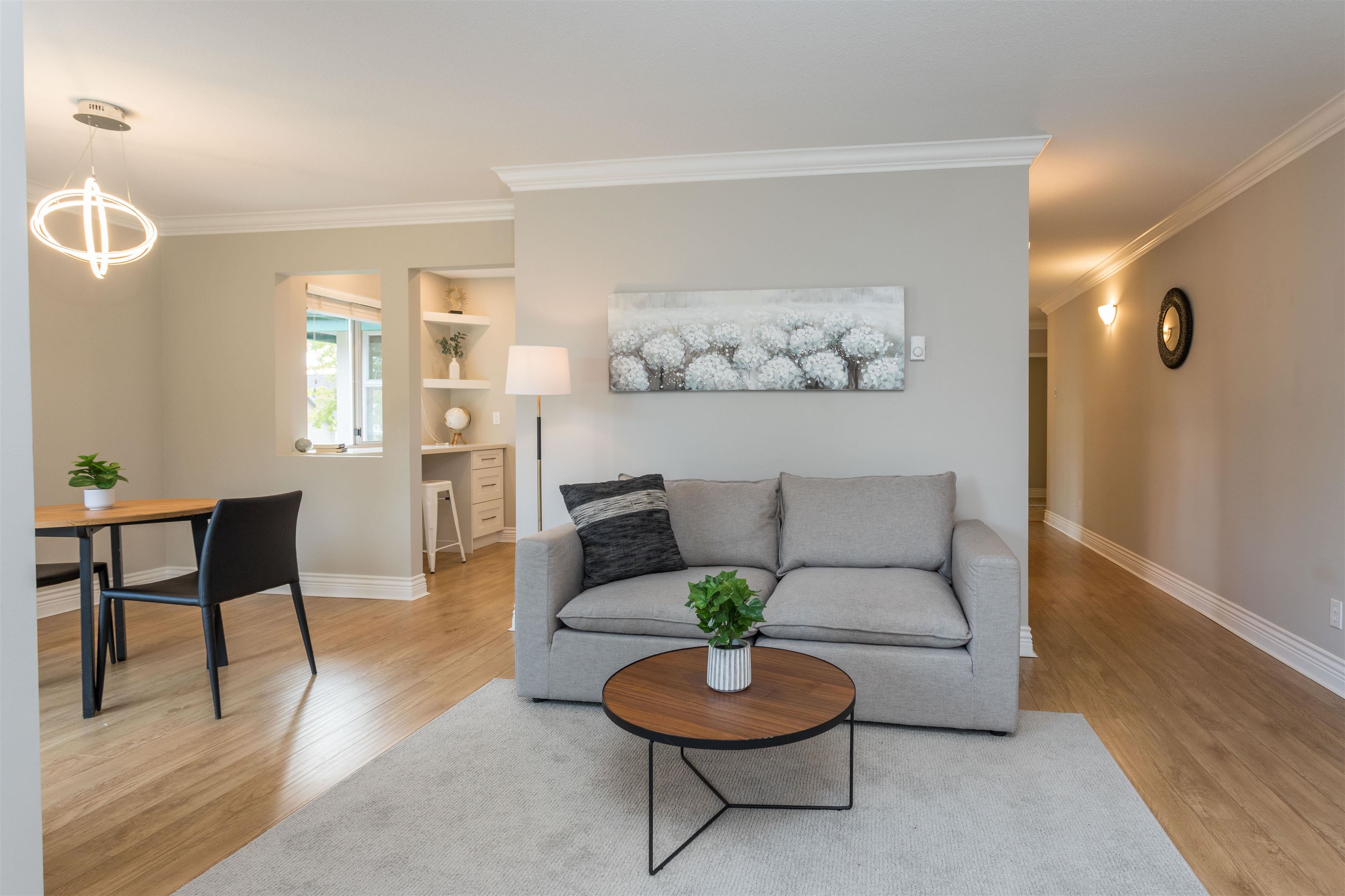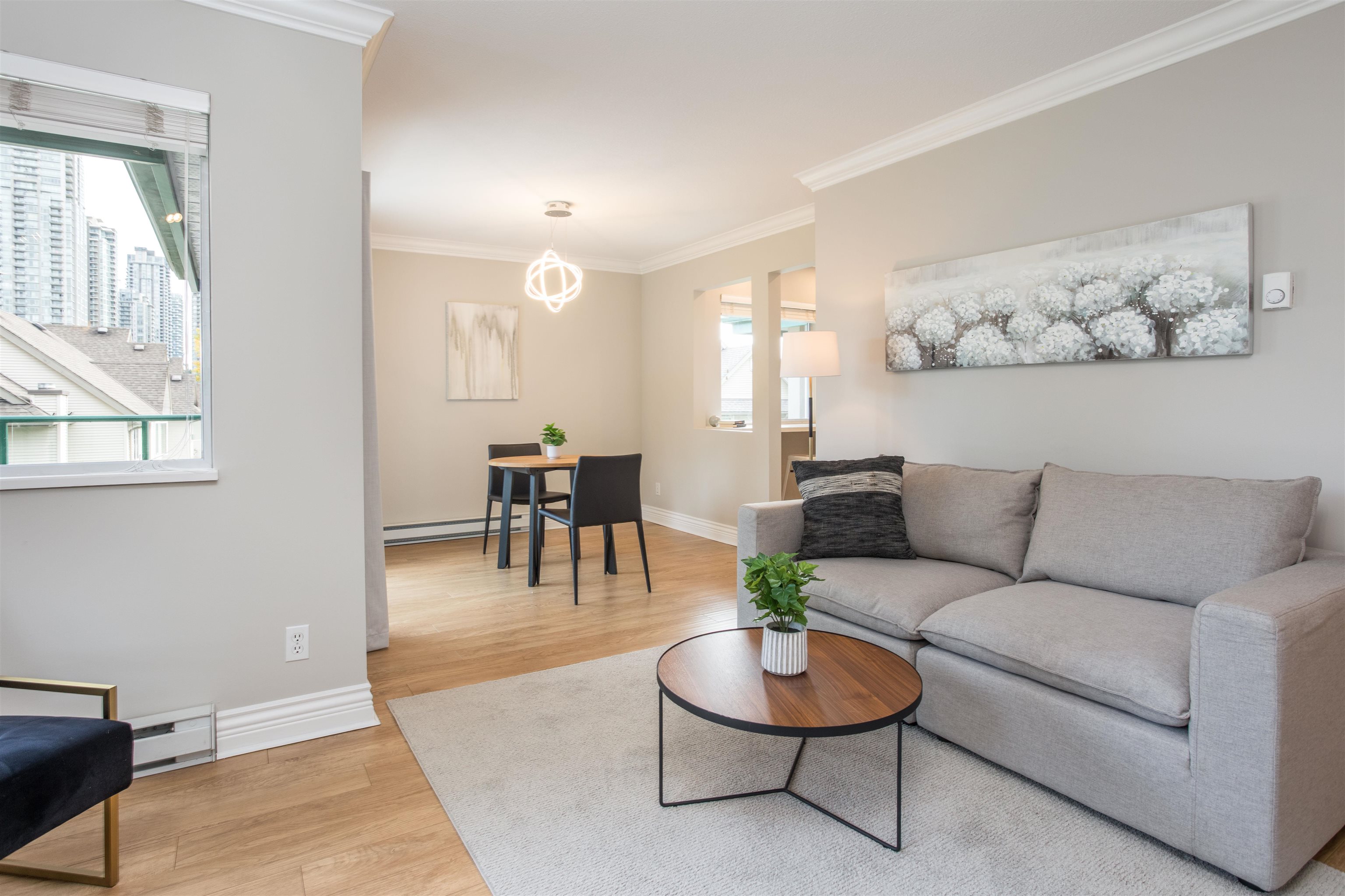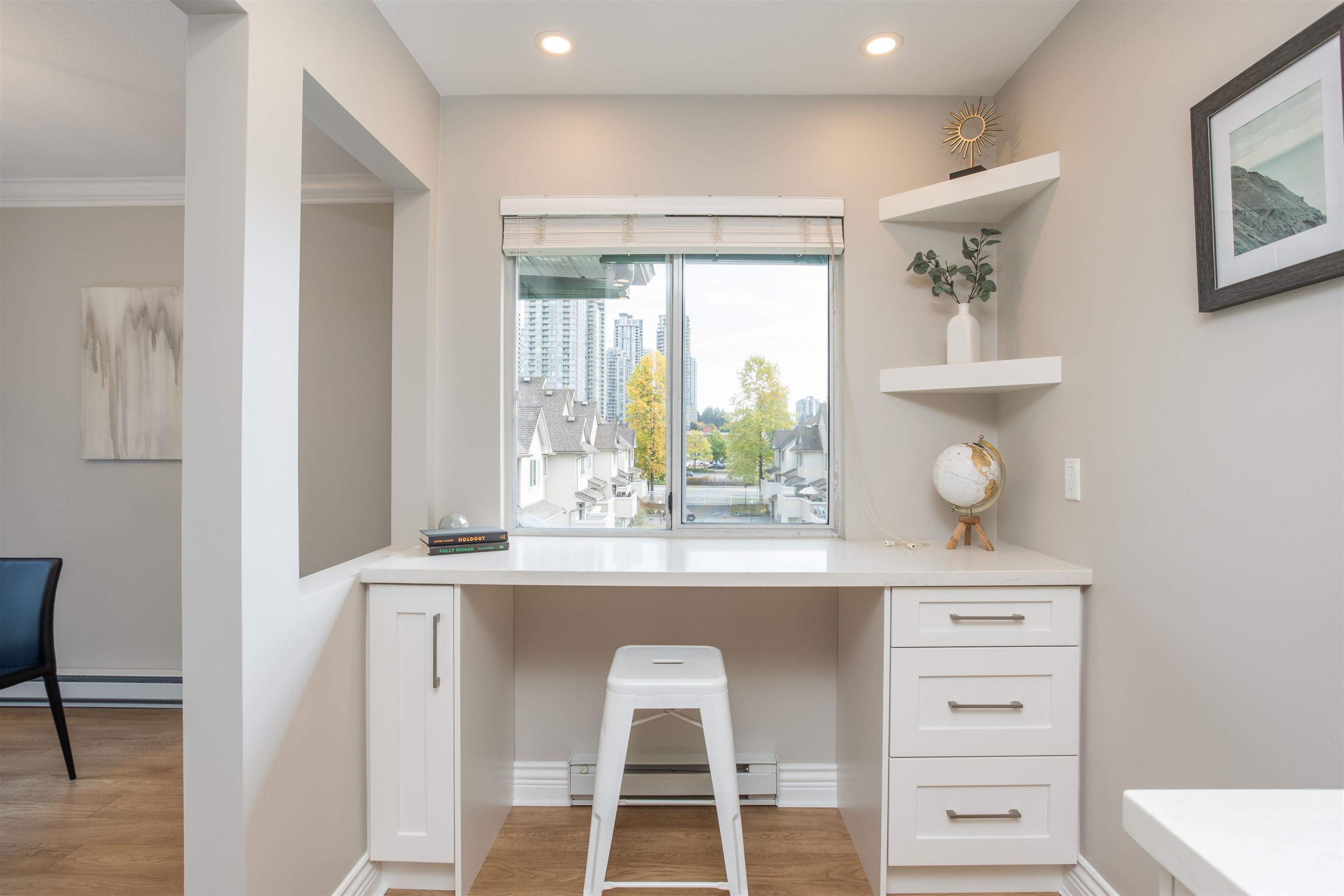 TOP FLOOR CORNER UNIT! Lots of natural daylight! Stunning 1 bed & 1 bath is perfectly situated in the heart of Coquitlam on a quiet cul-de-sac, just steps from Coquitlam Centre, Lafarge Lake & the Aquatic Centre. Recently updated! Kitchen w/ white shaker cabinets & built in lighting, quartz counters, stainless-steel appliances, glass tile backsplash, pot lights, new fixtures w/ a built-in desk-ideal for working from home. The unit boasts laminate floors, crown mouldings, thick baseboards & a spacious patio ...