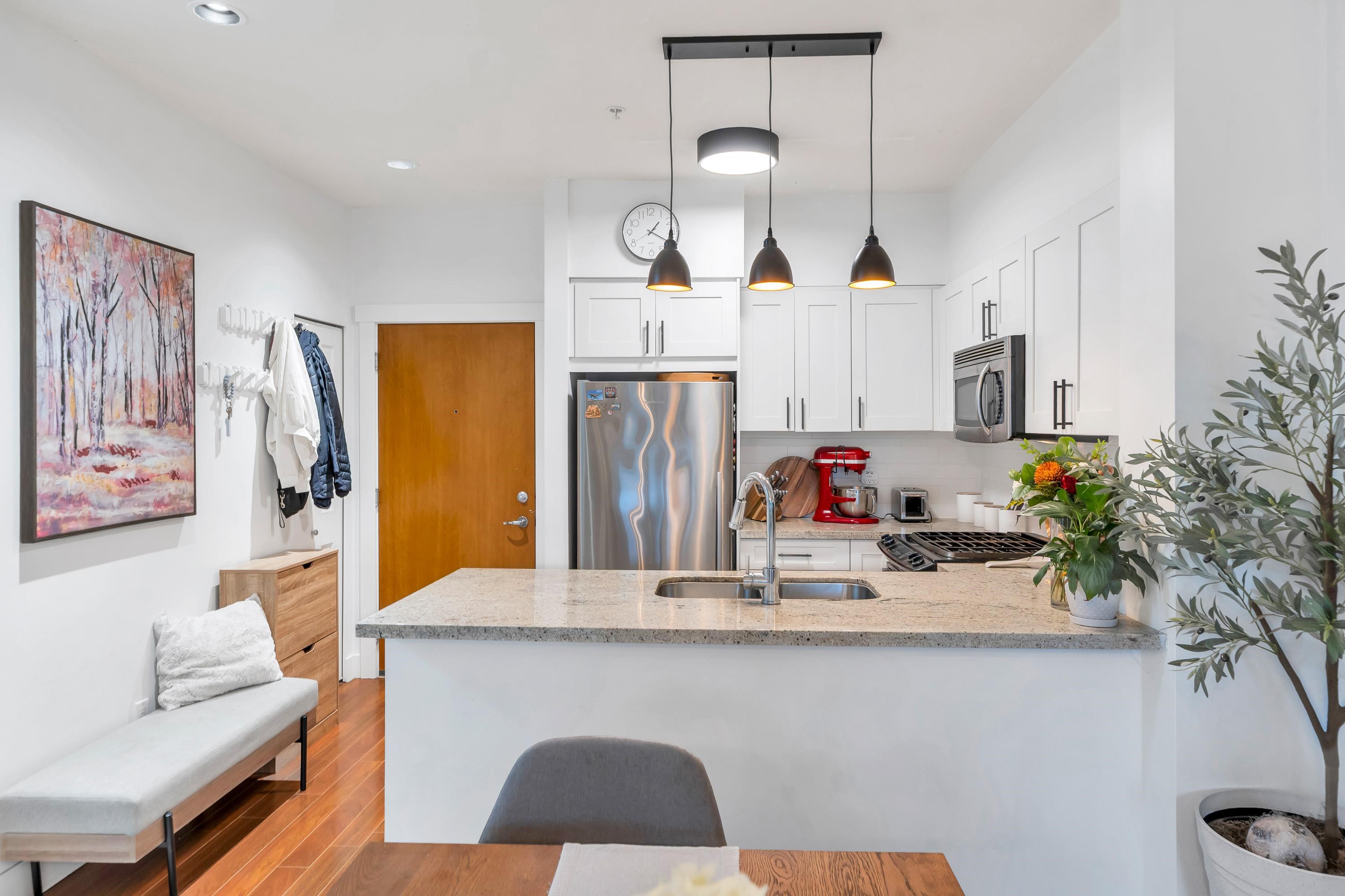 South-facing 2 bed, 2 bath home at Branches by Polygon. Bright open layout with 9’ ceilings, granite counters, stainless appliances, gas cooktop, and sunny covered balcony. Primary bedroom with walk-in closet and ensuite. Includes 2 side-by-side parking and storage. Well-managed building with fitness studio, guest suite, courtyard, and caretaker. Steps to Lynn Valley Centre, shops, and transit: An easy, reliable condo in a sought-after North Van community.