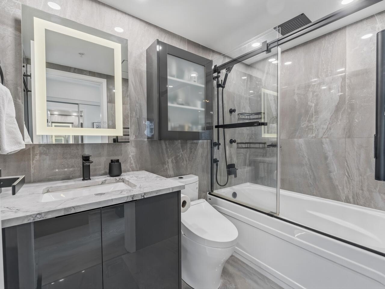 Exceptional fully renovated corner residence at Azura with breathtaking, unobstructed views of False Creek, David Lam Park & the North Shore mountains. This 762 sqft 1 bed + den offers a bright, open layout with floor-to-ceiling windows and refined luxury throughout. Complete high-end renovation (2022) features hardwood floors, custom millwork, built-in storage, wine room w/2 fridges, granite counters (leather finish) with waterfall island, gas range & premium appliances. Spa-inspired bath with heated floor...