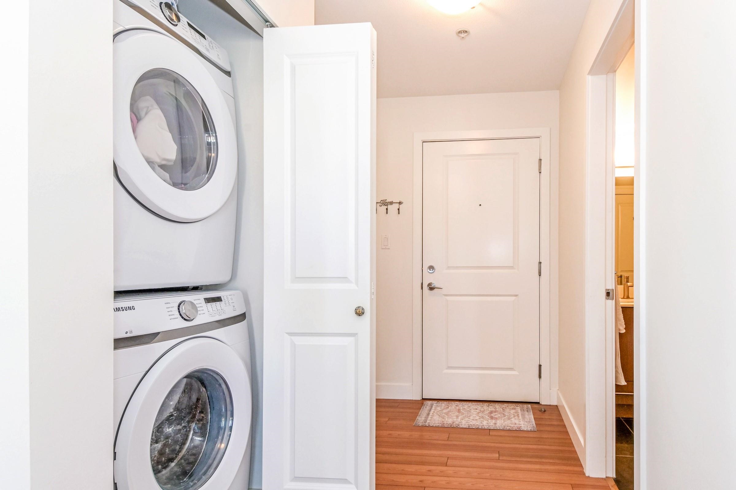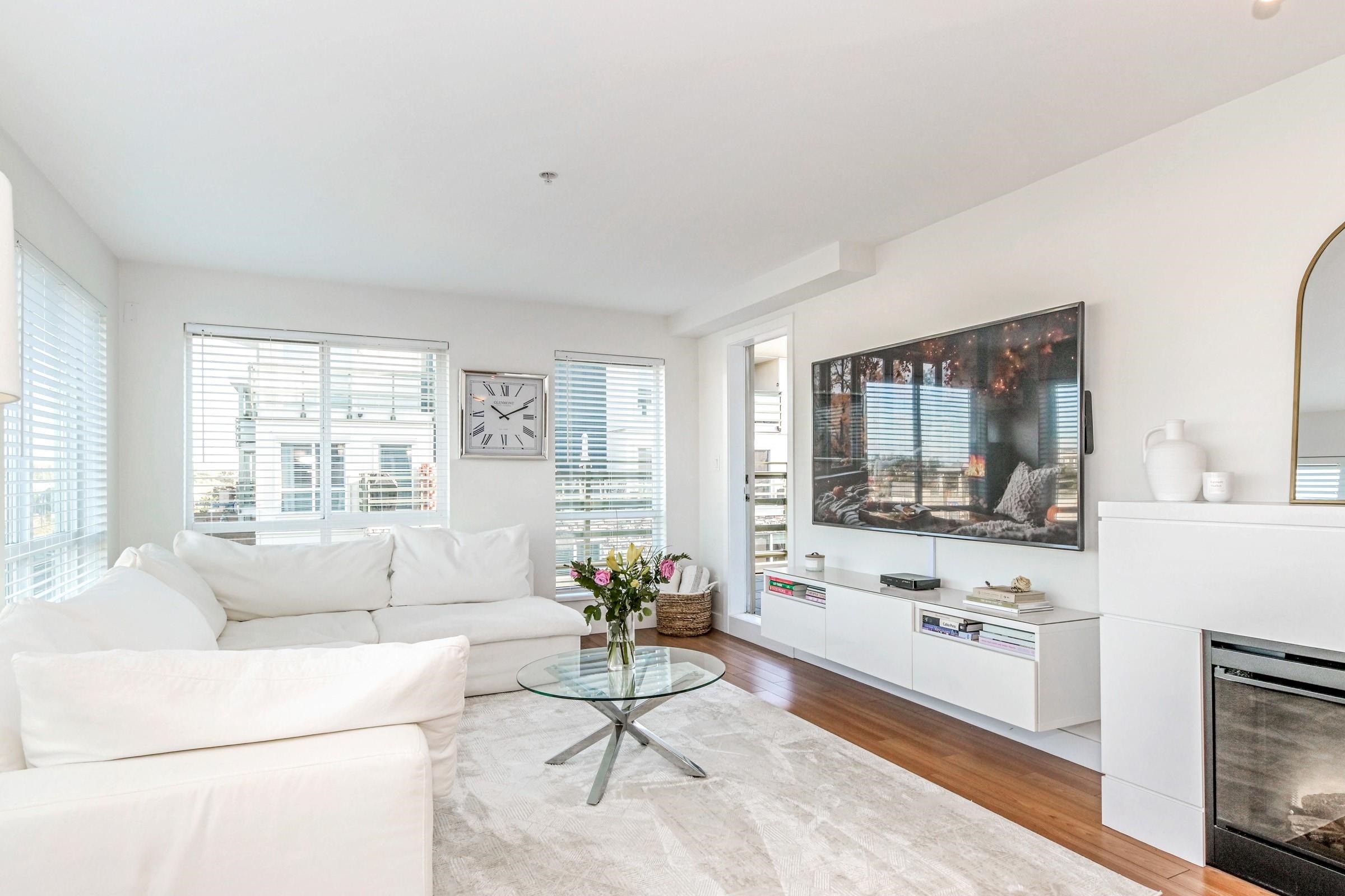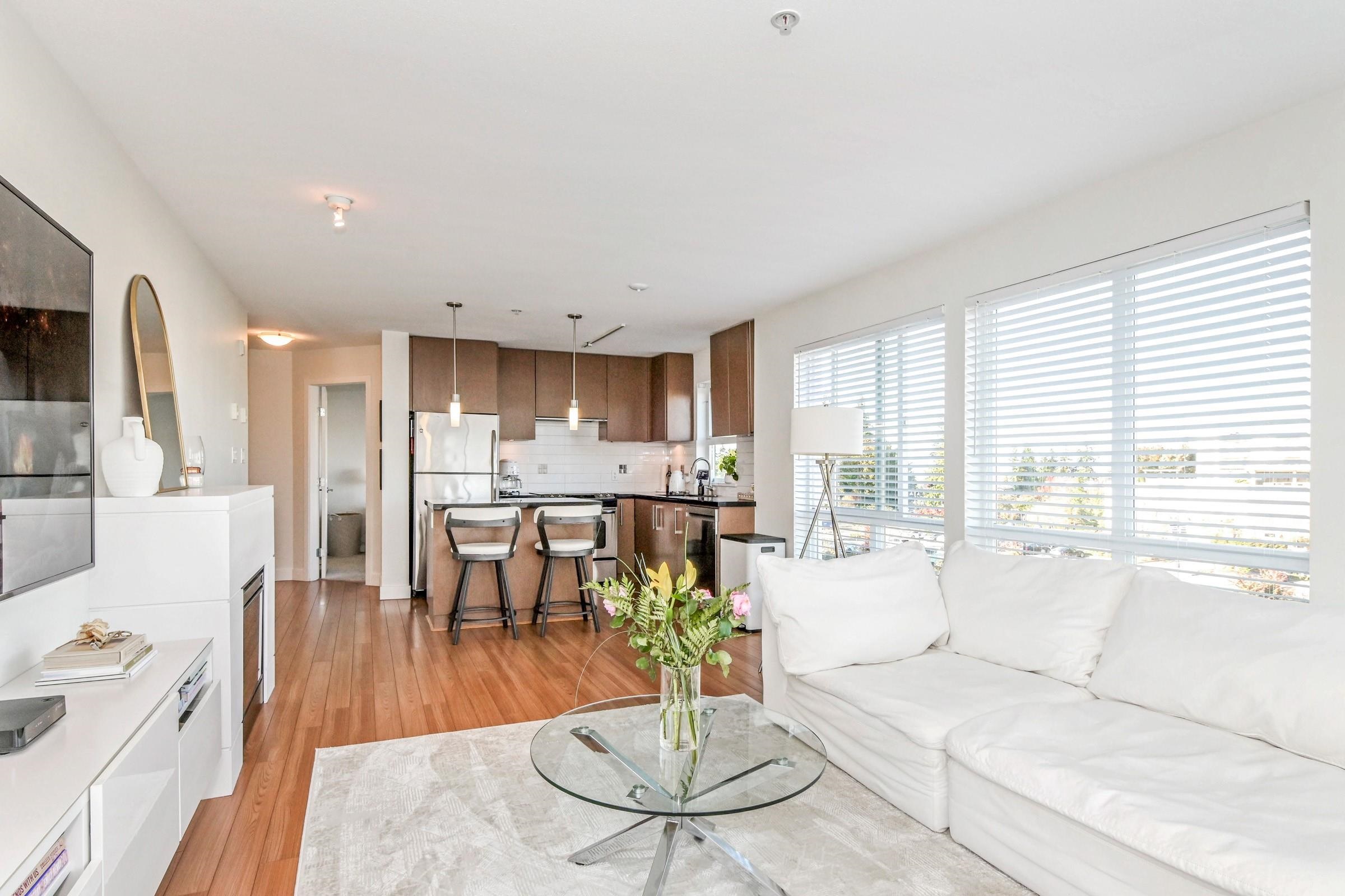 Beautiful bright, 1 bed, 1 bath corner unit with additional large windows offering gorgeous views of the North Shore Mountains and Mt. Baker. Open layout with bright, naturally lit kitchen. Large private deck. Located within the vibrant Morgan Crossing - steps to Thrifty Foods, London Drugs, banks, restaurants, Everything Wine, and transit. Walk to all your daily needs - no car required. 2 pets allowed. Quick possession possible!