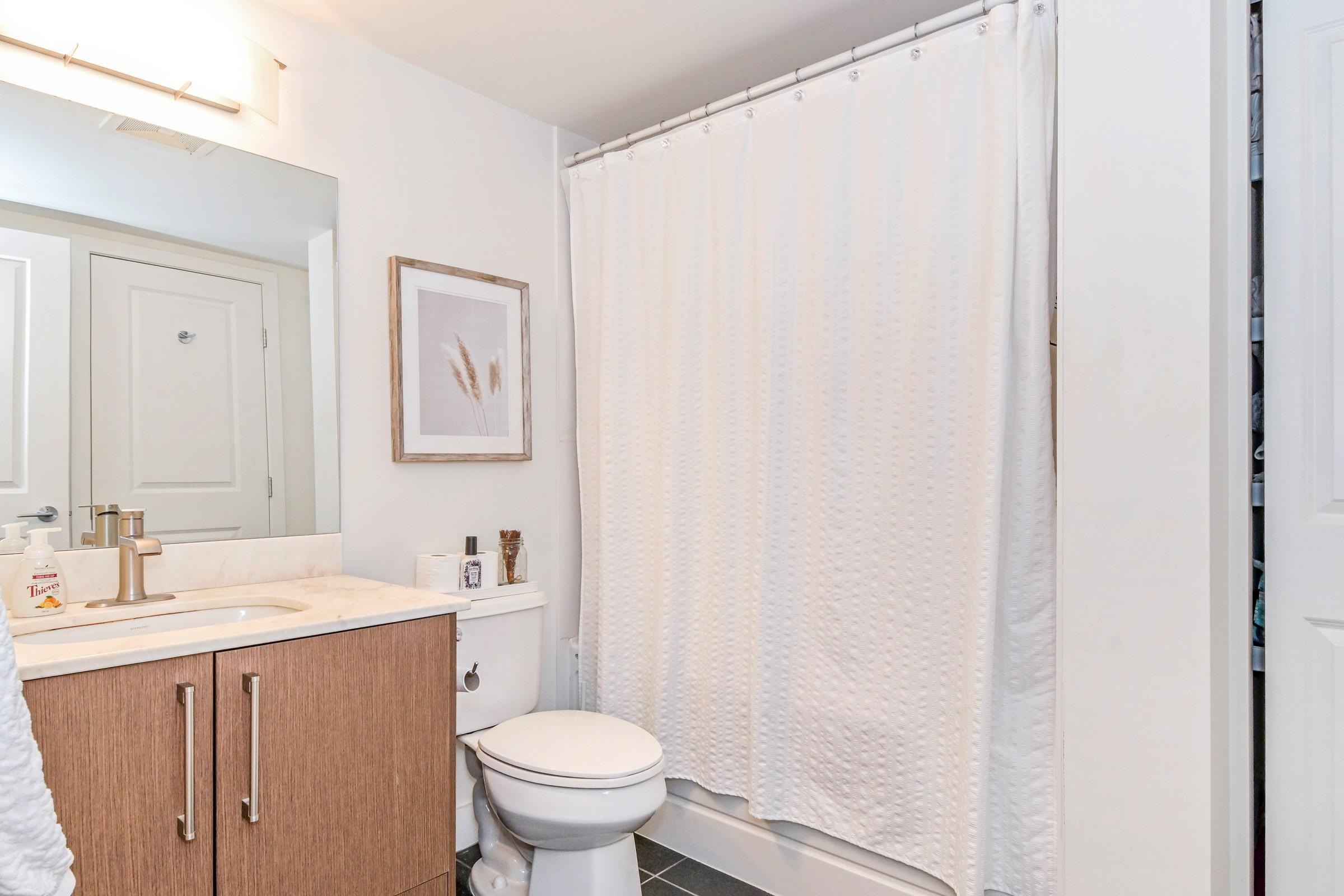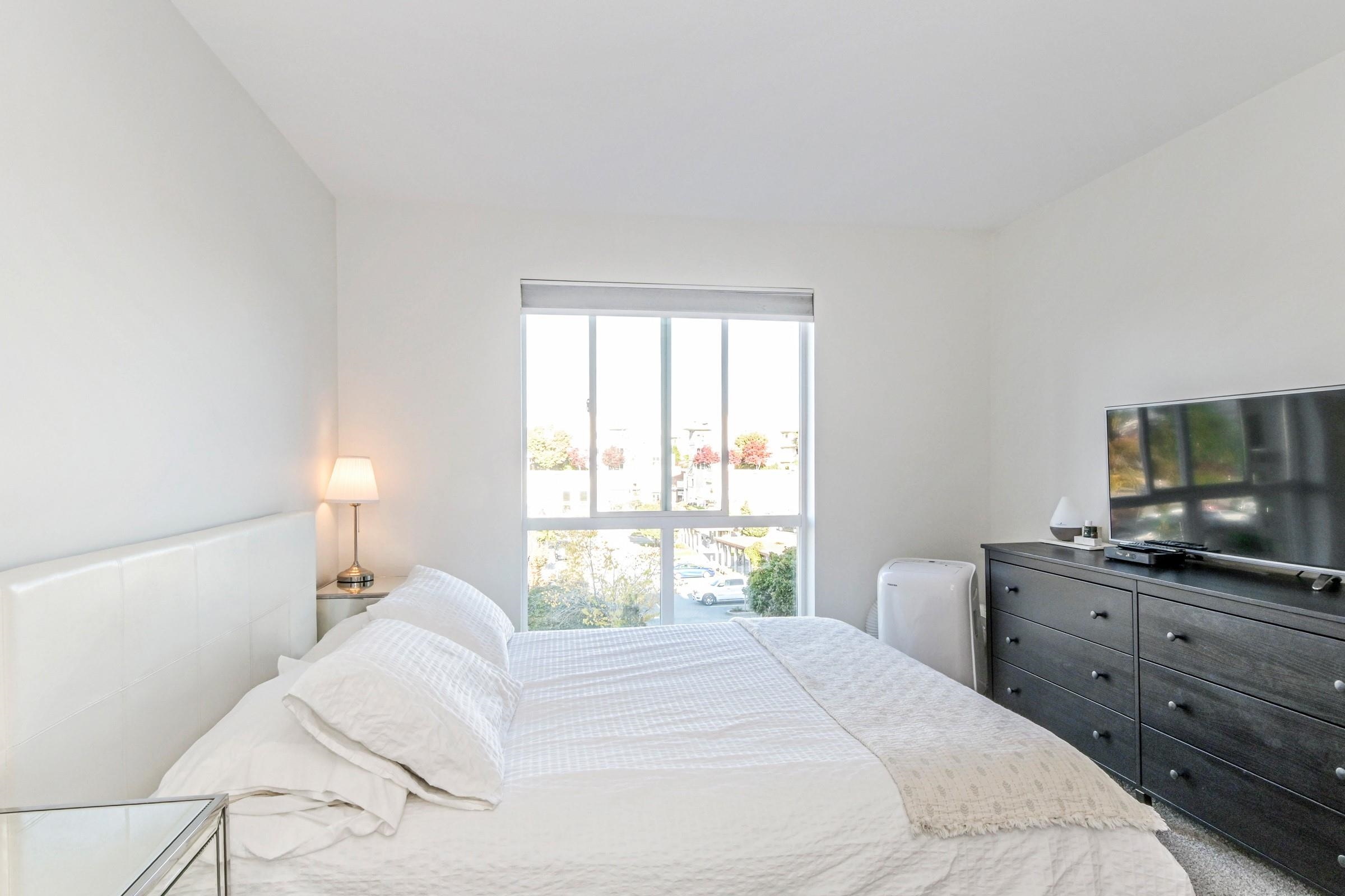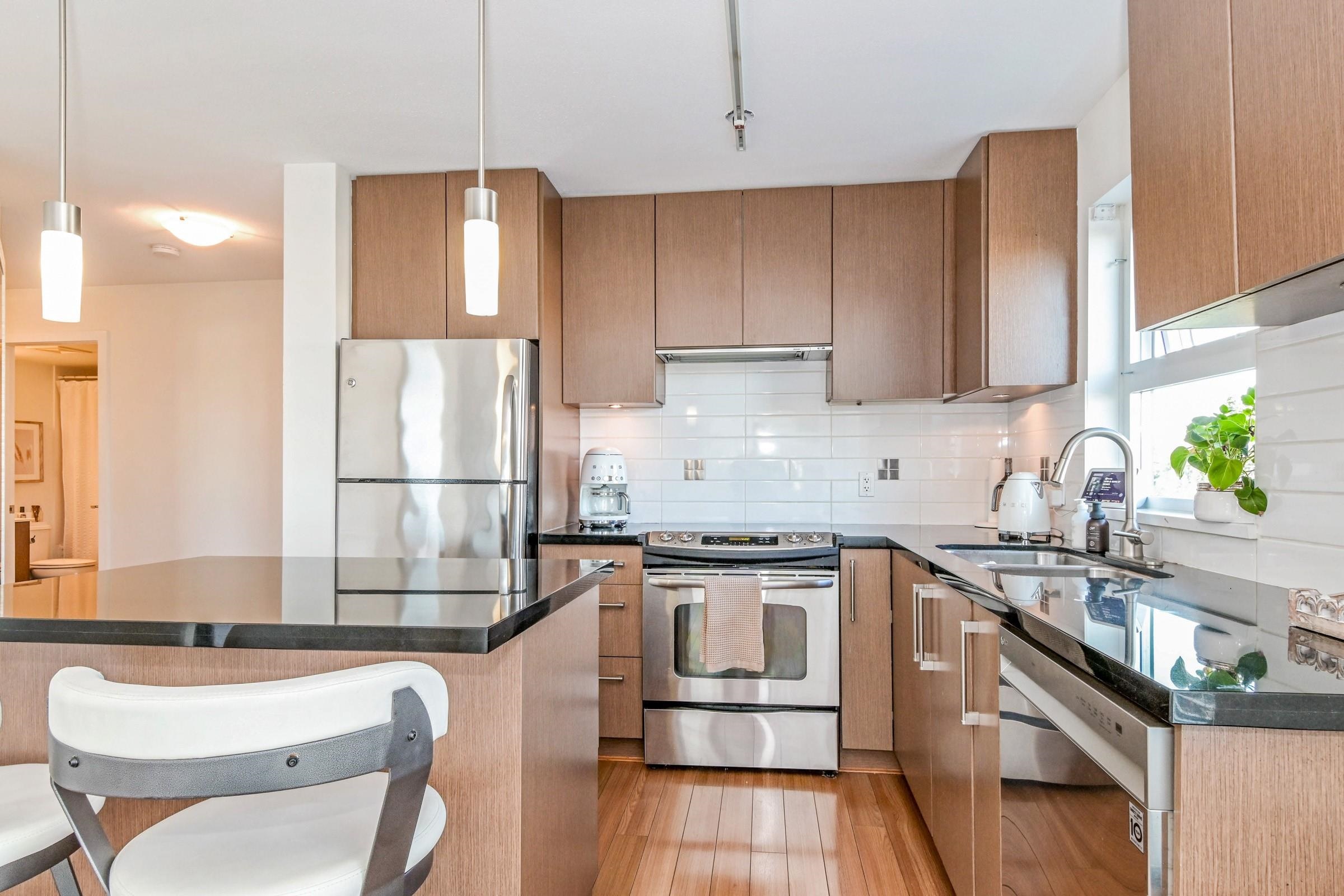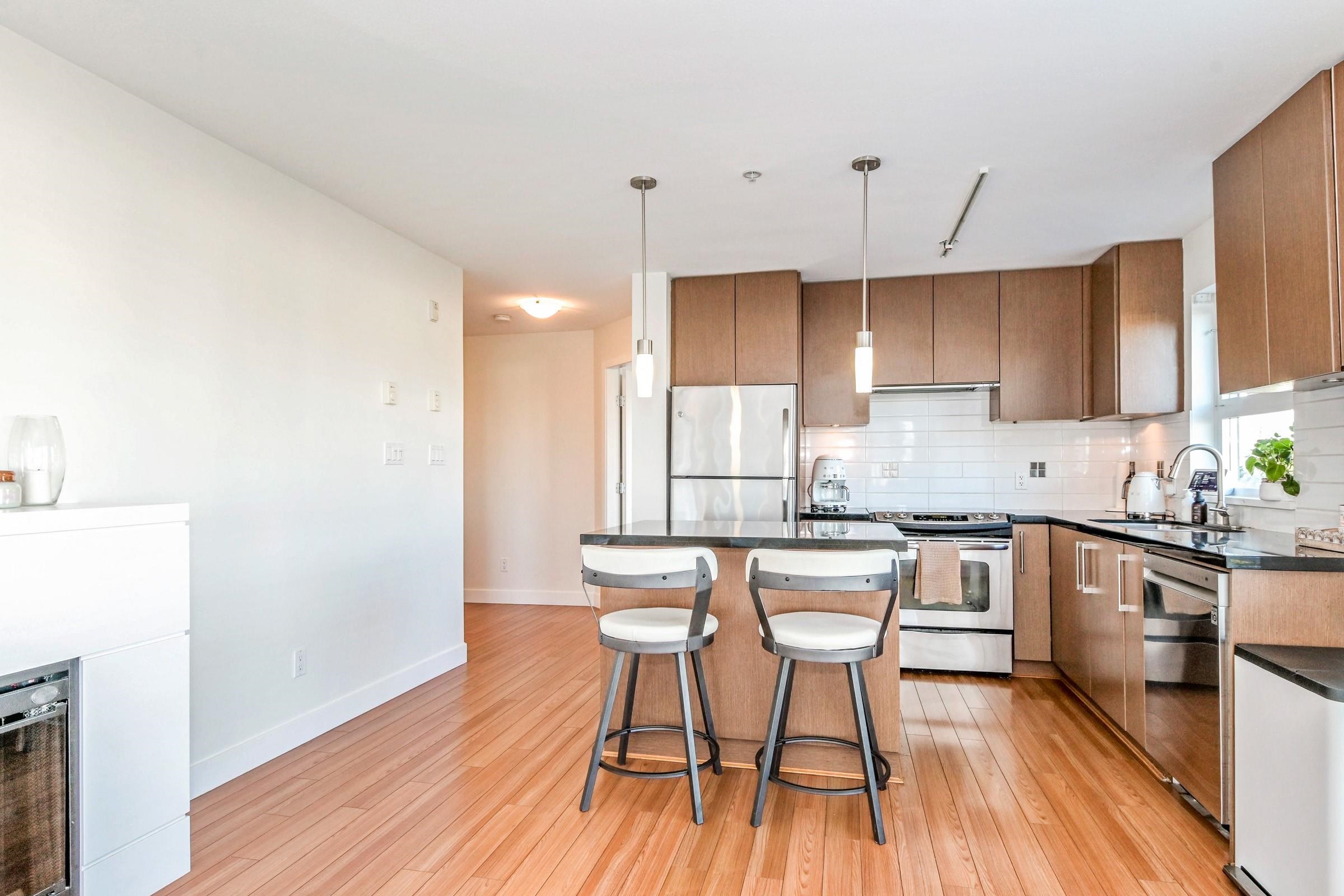 Beautiful bright, 1 bed, 1 bath corner unit with additional large windows offering gorgeous views of the North Shore Mountains and Mt. Baker. Open layout with bright, naturally lit kitchen. Large private deck. Located within the vibrant Morgan Crossing - steps to Thrifty Foods, London Drugs, banks, restaurants, Everything Wine, and transit. Walk to all your daily needs - no car required. 2 pets allowed. Quick possession possible!