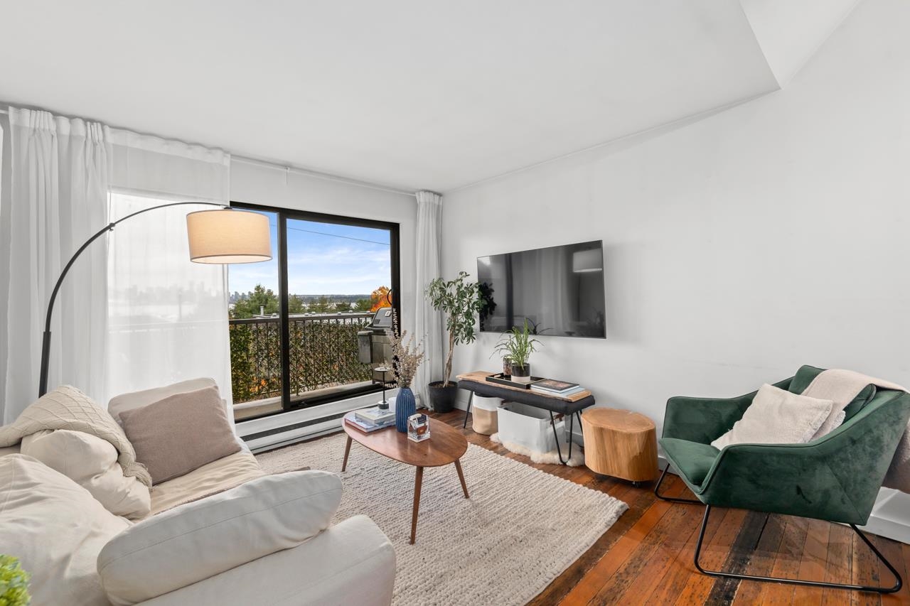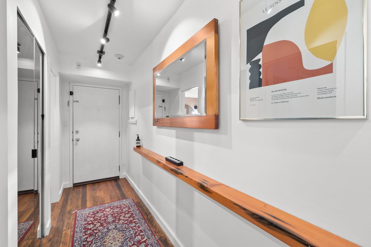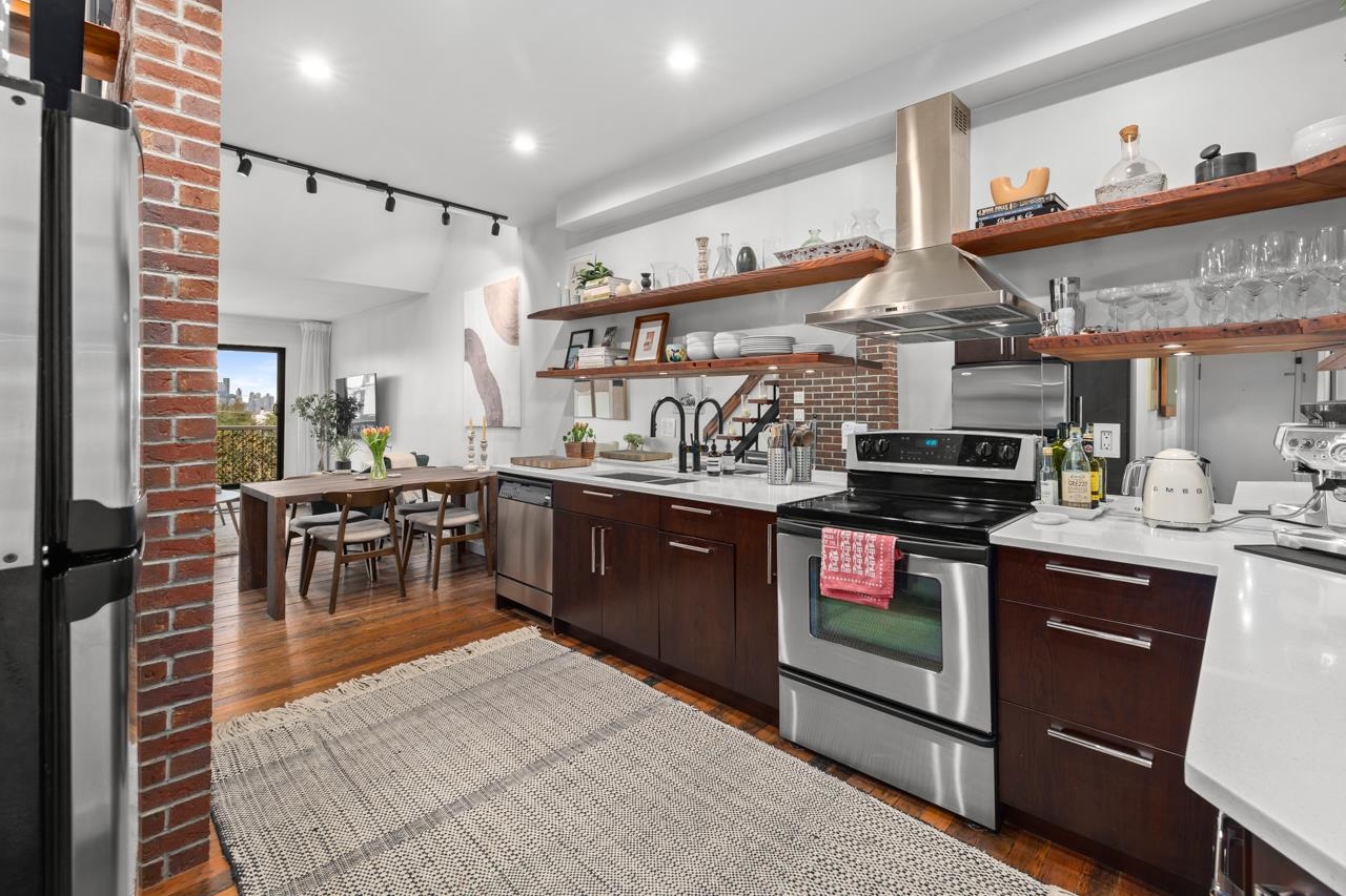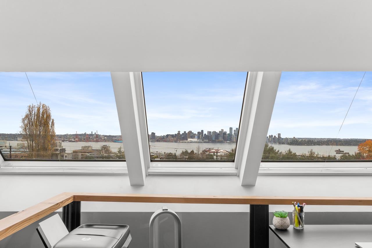 Character-filled 2-bedroom penthouse loft in the heart of Lower Lonsdale with unobstructed ocean and city views. This bright 2-level, 886 sq ft home features vaulted ceilings, skylights, exposed brick, and wood beams for a true New York–loft feel. The main level includes reclaimed fir floors from the North Shore Shipyards, an updated kitchen with custom cabinetry and stainless steel appliances, open dining/living space, a spacious bedroom, a brand-new bathroom, and a south-facing balcony. Upstairs, the loft...