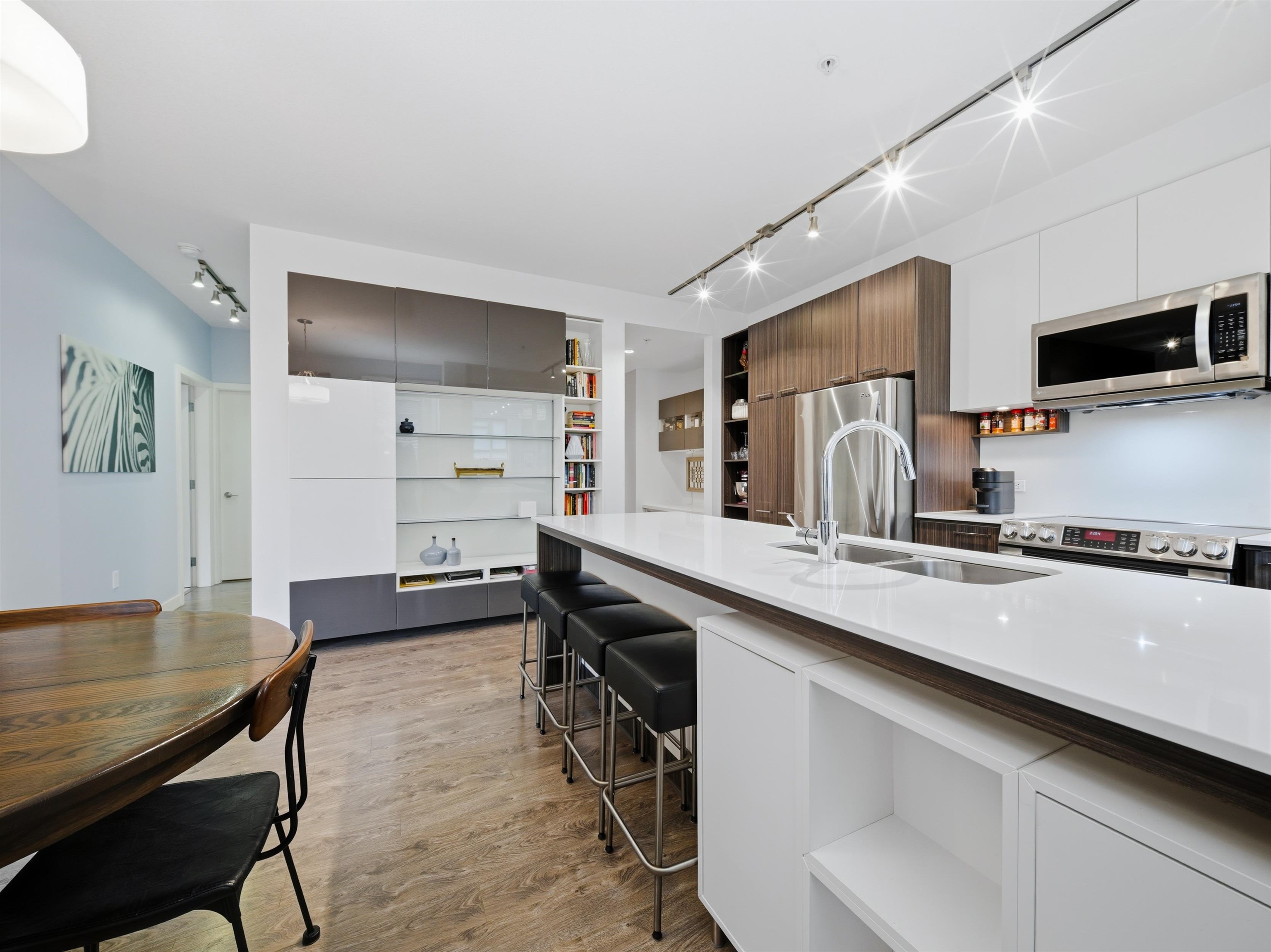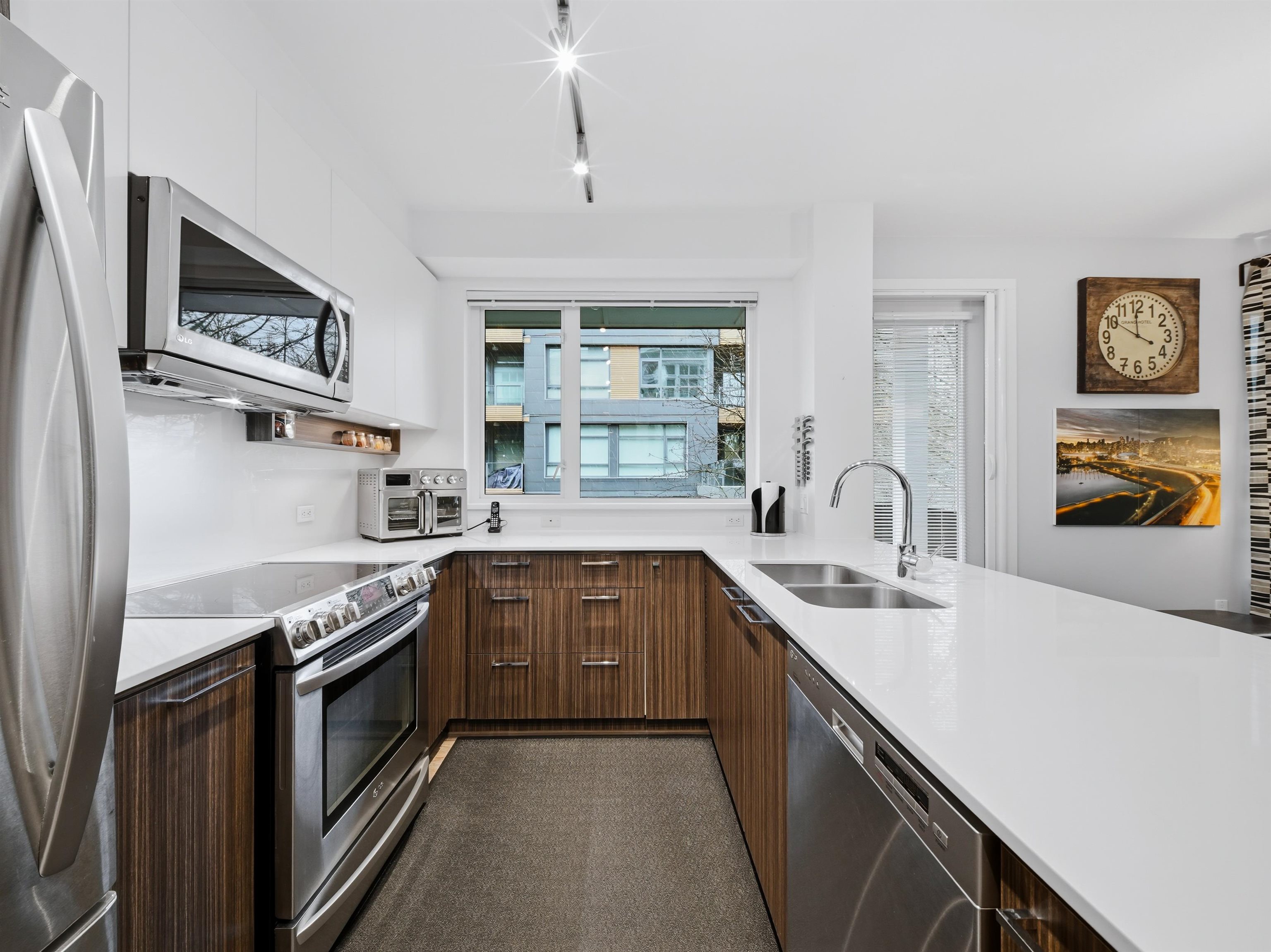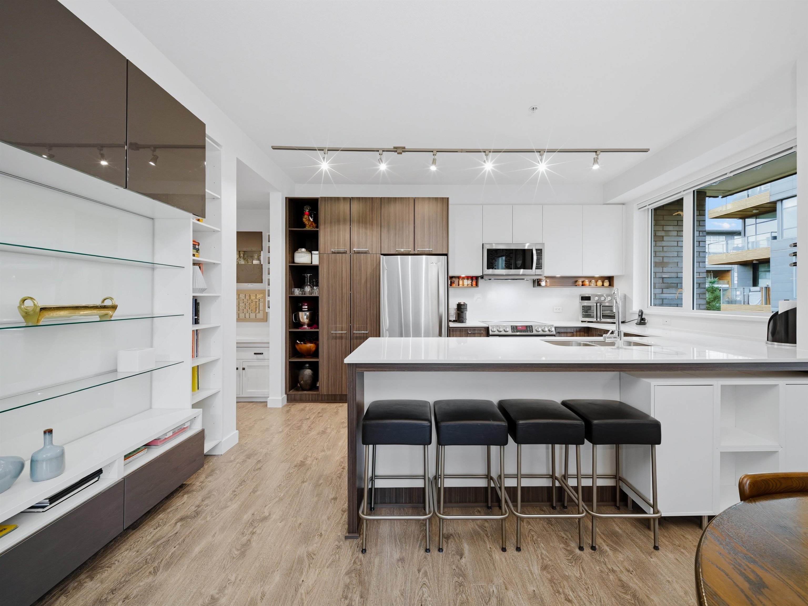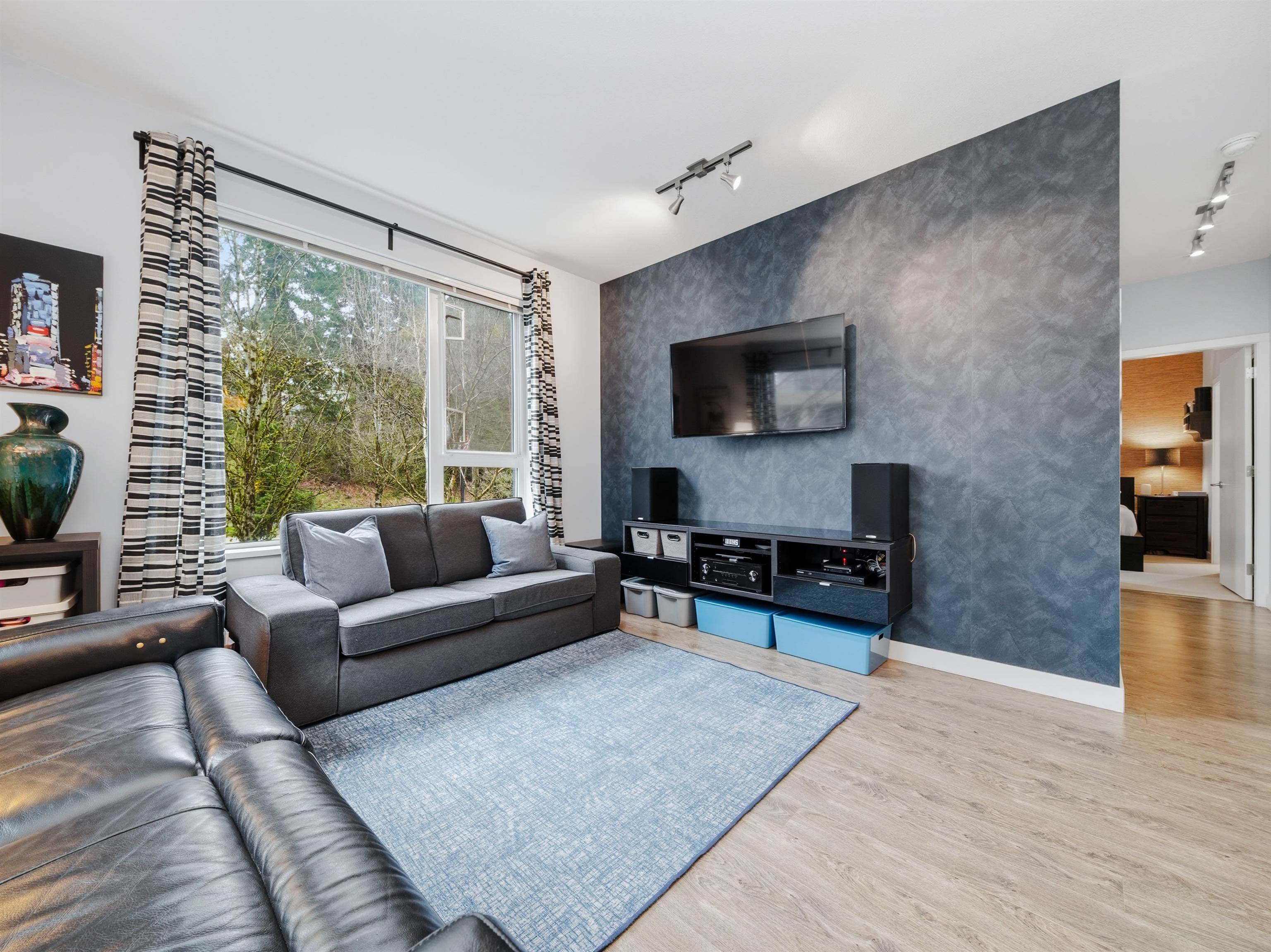 Well-designed corner unit at Nest by Mosaic on Burnaby Mountain. This NW-facing 2 bed, 2 bath home features thoughtful upgrades including modern built-in storage, enhanced closets, and a versatile hidden office in the second bedroom. Open layout offers quartz countertops, stainless steel appliances, and a custom, functional bar area. The primary bedroom fits a king bed and includes a walk-in closet and ensuite with double sinks. Enjoy two balconies, one off the primary for a quiet retreat, the other ideal f...