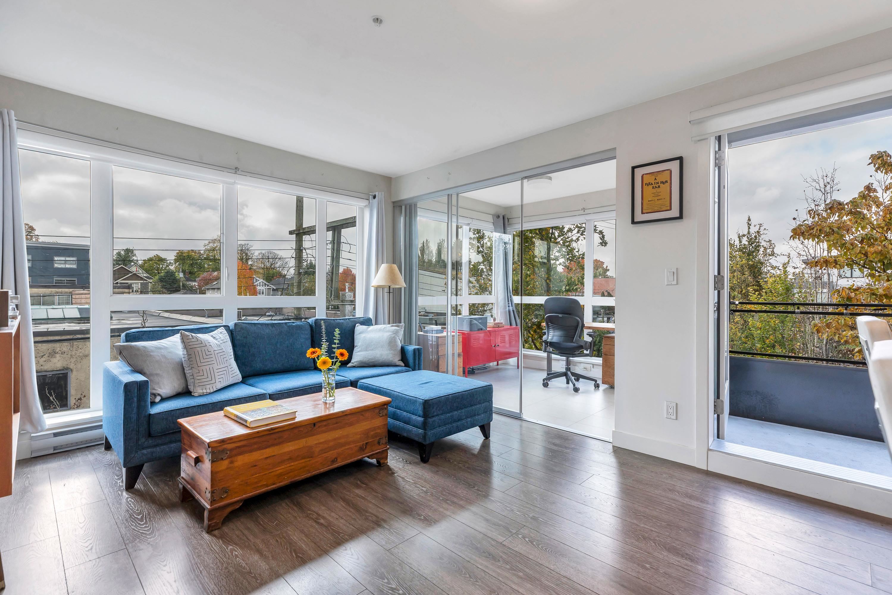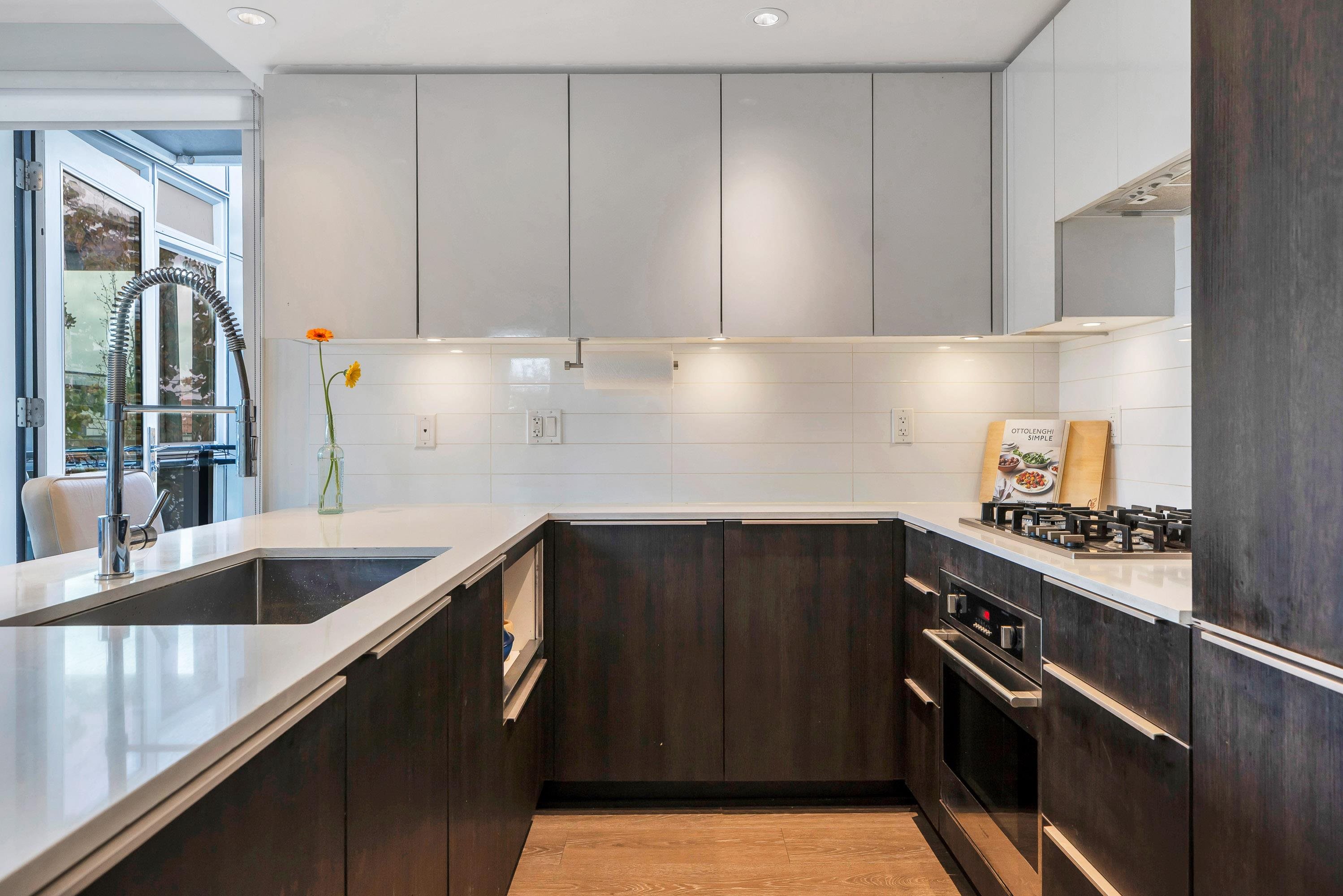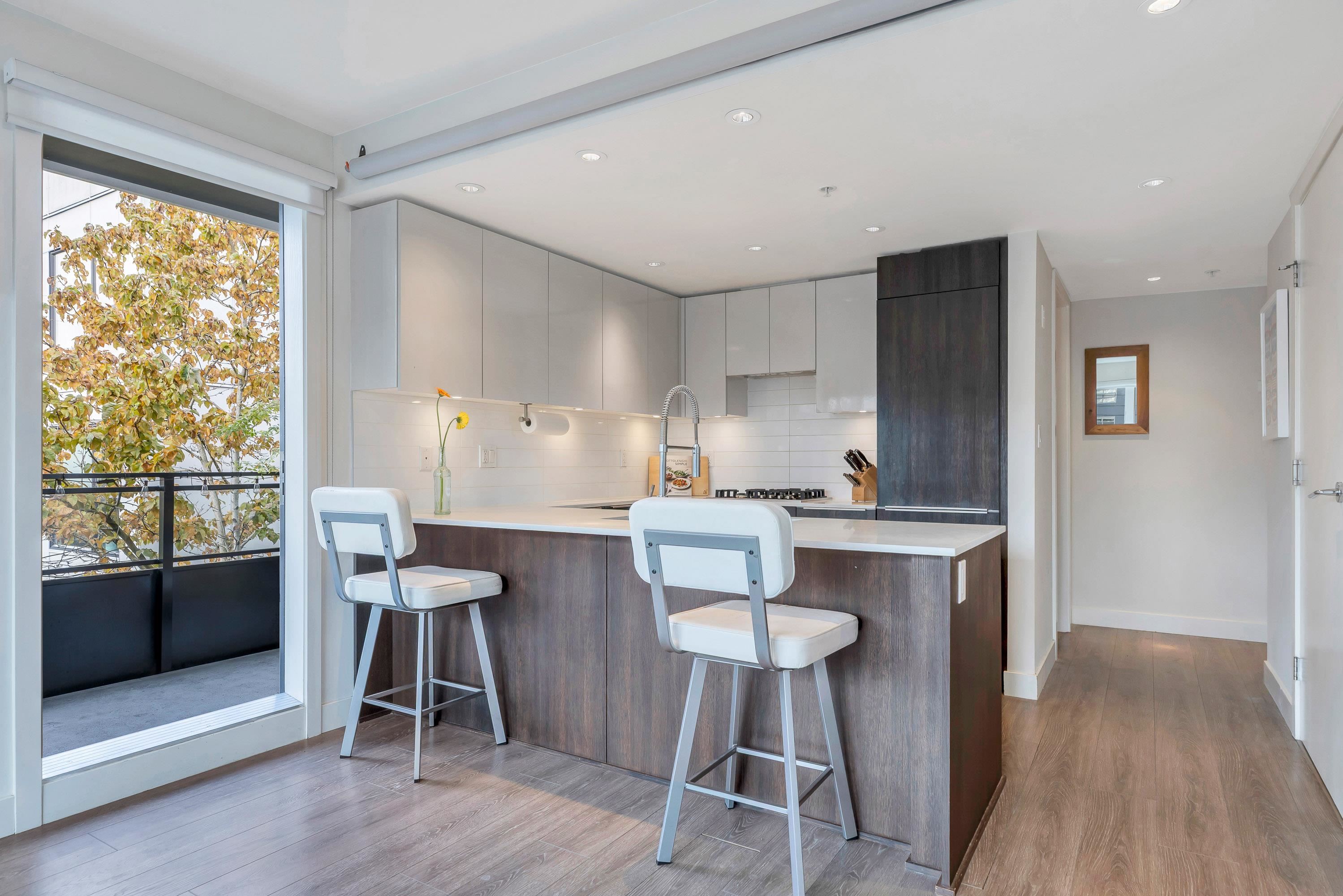 Bright & modern 1 bed + den + flex in the sought-after Bohème. This quiet upper-level corner home features a sunny southwest-facing balcony overlooking the lush courtyard, perfect for morning coffee. Open-concept layout with kitchen featuring Blomberg s/s appliances, gas cooktop, quartz counters & breakfast bar. Work from home in the dedicated office/den. Walk-in closet, large flex/storage room. 1 parking & locker included. Enjoy the gym, party room, playgound, additional common deck & bike storage options....