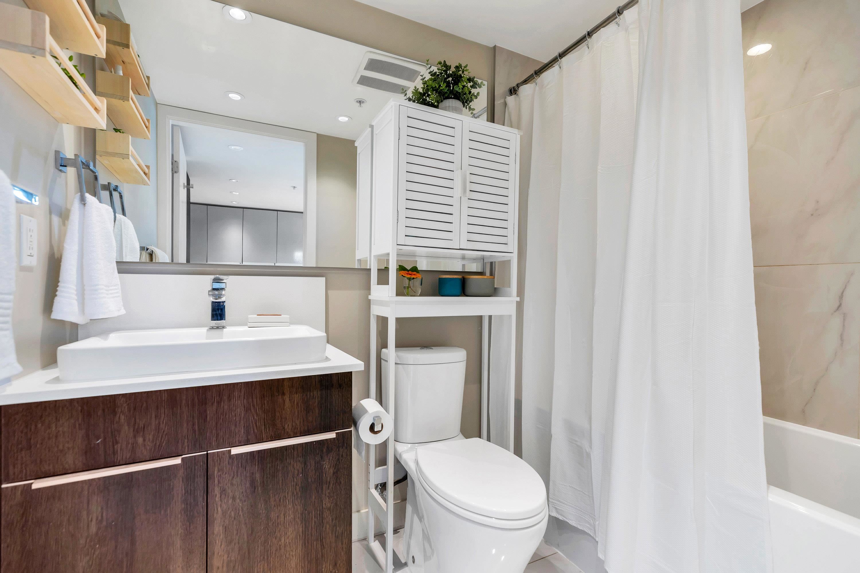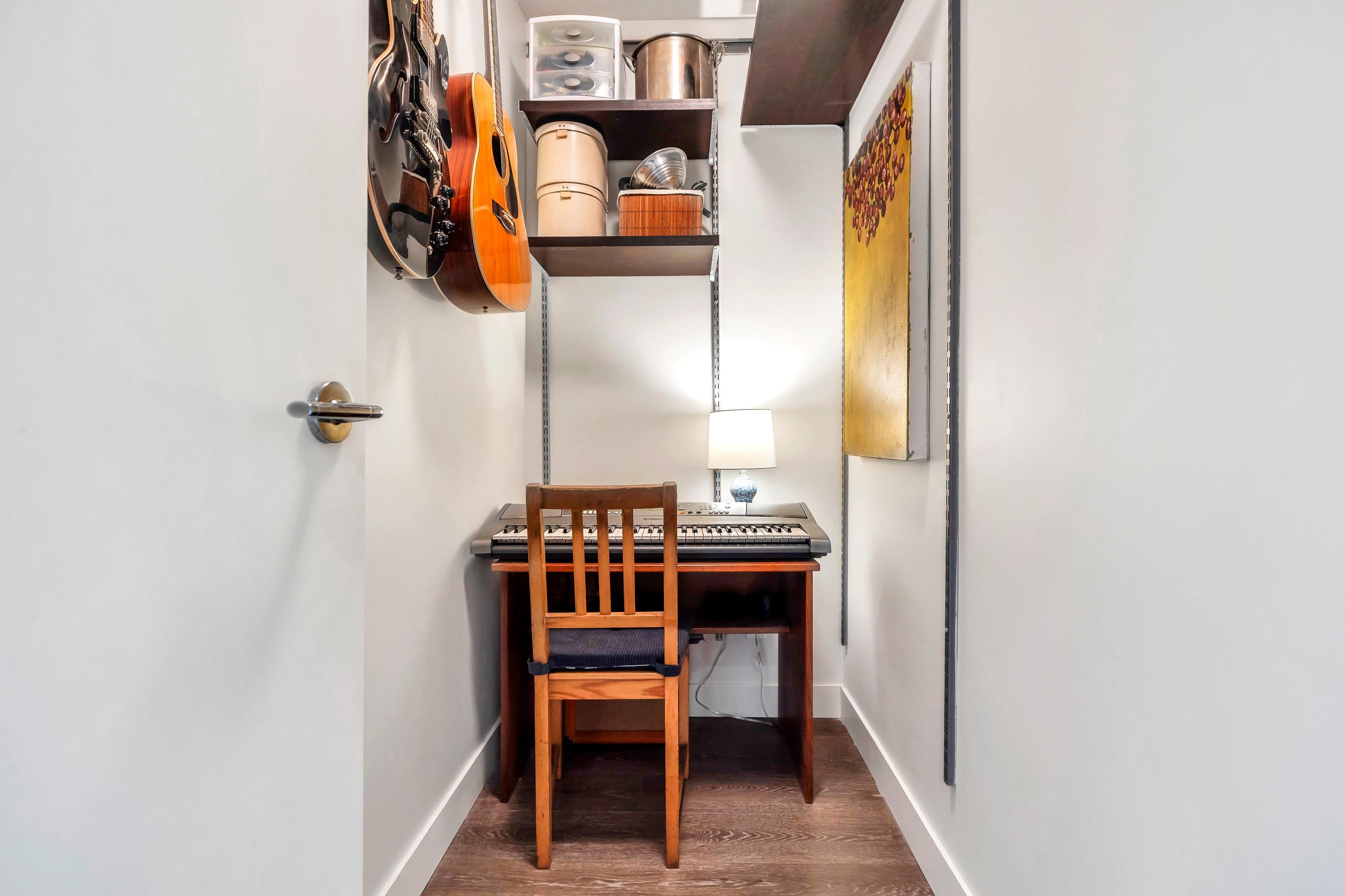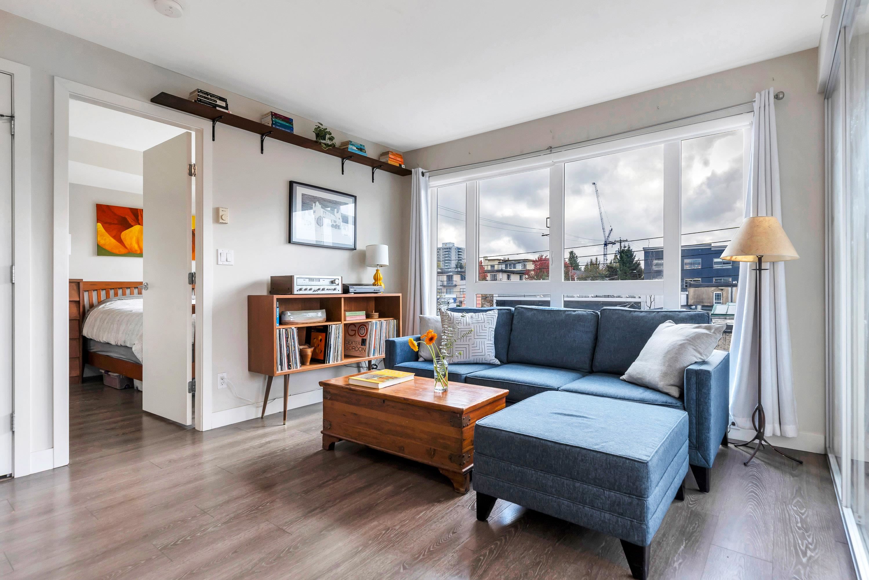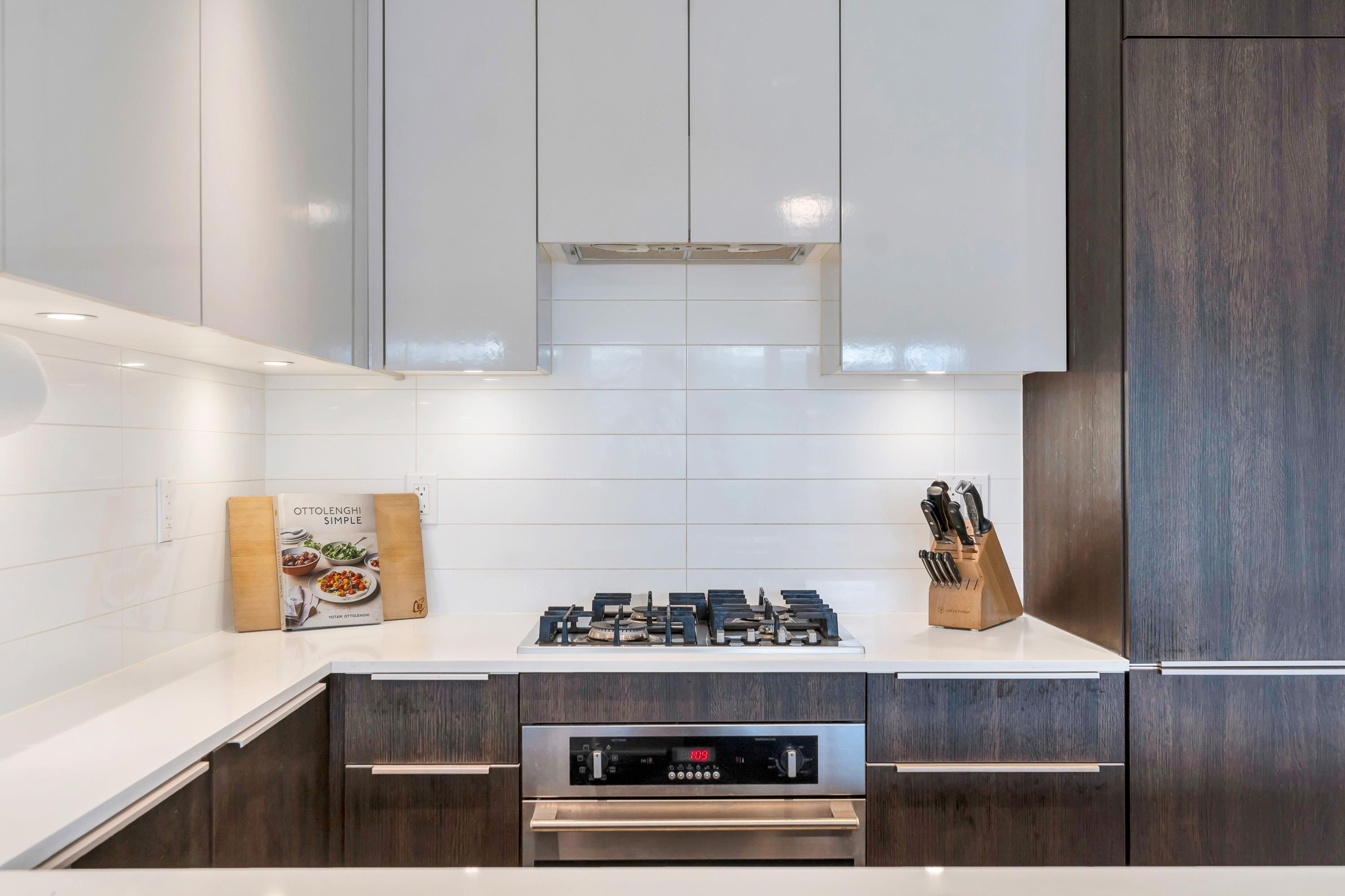 Bright & modern 1 bed + den + flex in the sought-after Bohème. This quiet upper-level corner home features a sunny southwest-facing balcony overlooking the lush courtyard, perfect for morning coffee. Open-concept layout with kitchen featuring Blomberg s/s appliances, gas cooktop, quartz counters & breakfast bar. Work from home in the dedicated office/den. Walk-in closet, large flex/storage room. 1 parking & locker included. Enjoy the gym, party room, playgound, additional common deck & bike storage options....