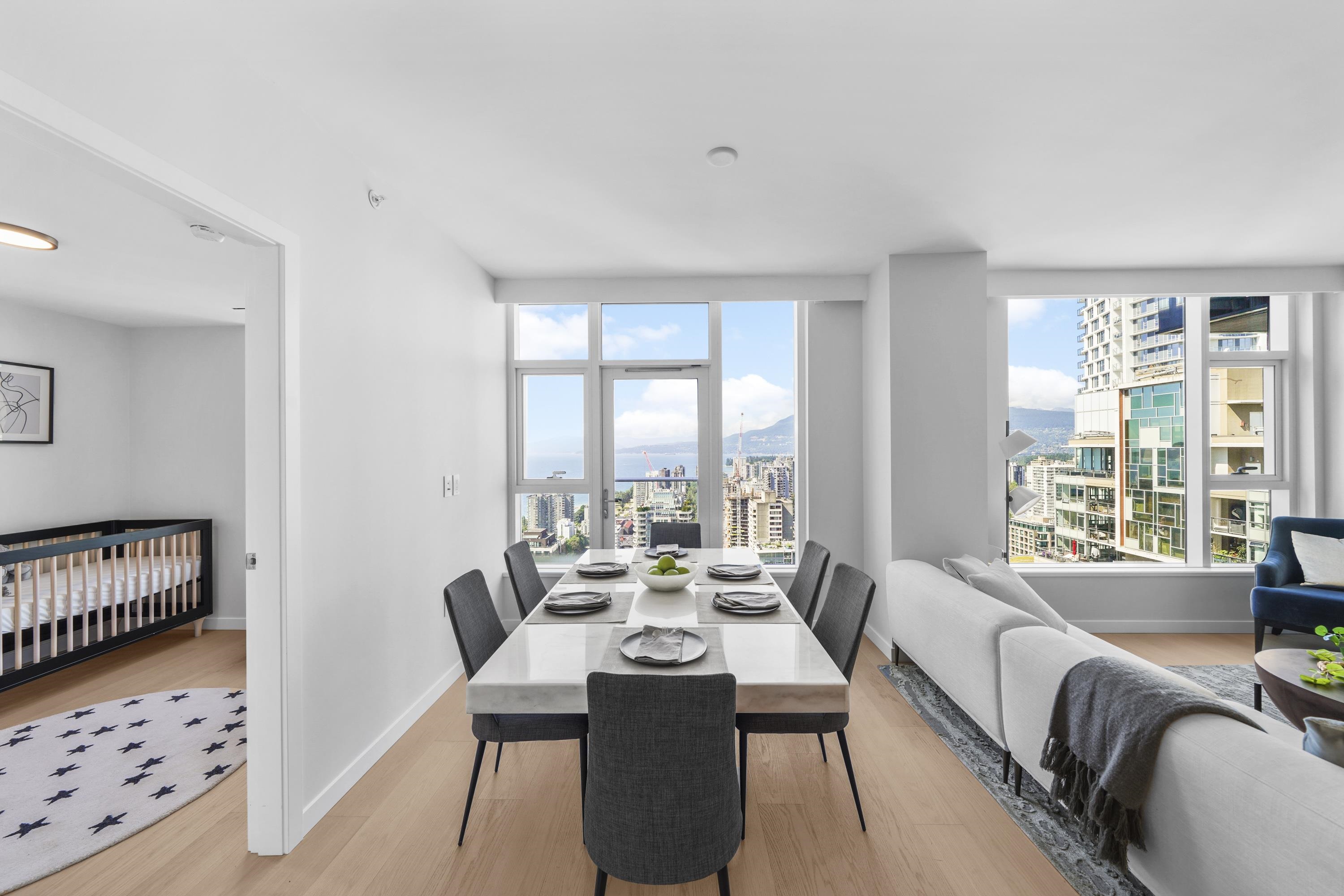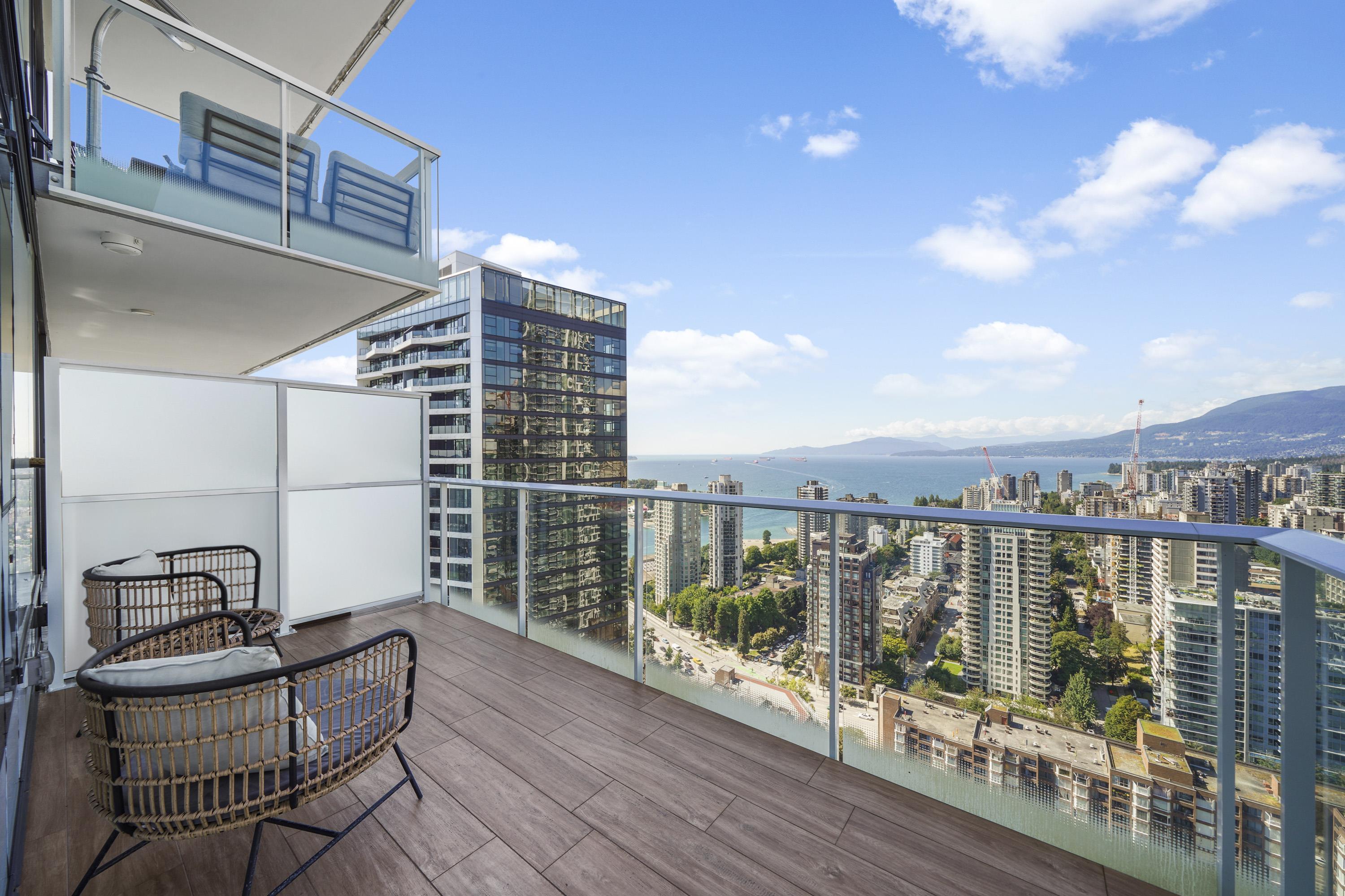 Refined West Coast living in this stunning 985 sq. ft. 2 bed 2 bath & Den home with English Bay views. Featuring A/C, a smart-home system, built-in speakers & motorized blinds. Floor-to-ceiling windows frame captivating views of English Bay, the North Shore mountains & more. The chef-inspired kitchen is equipped with a premium Sub-Zero and Wolf appliance package, perfect for both everyday living and entertaining. Enjoy world-class amenities including an outdoor pool, hot tub, fully equipped fitness centre, ...