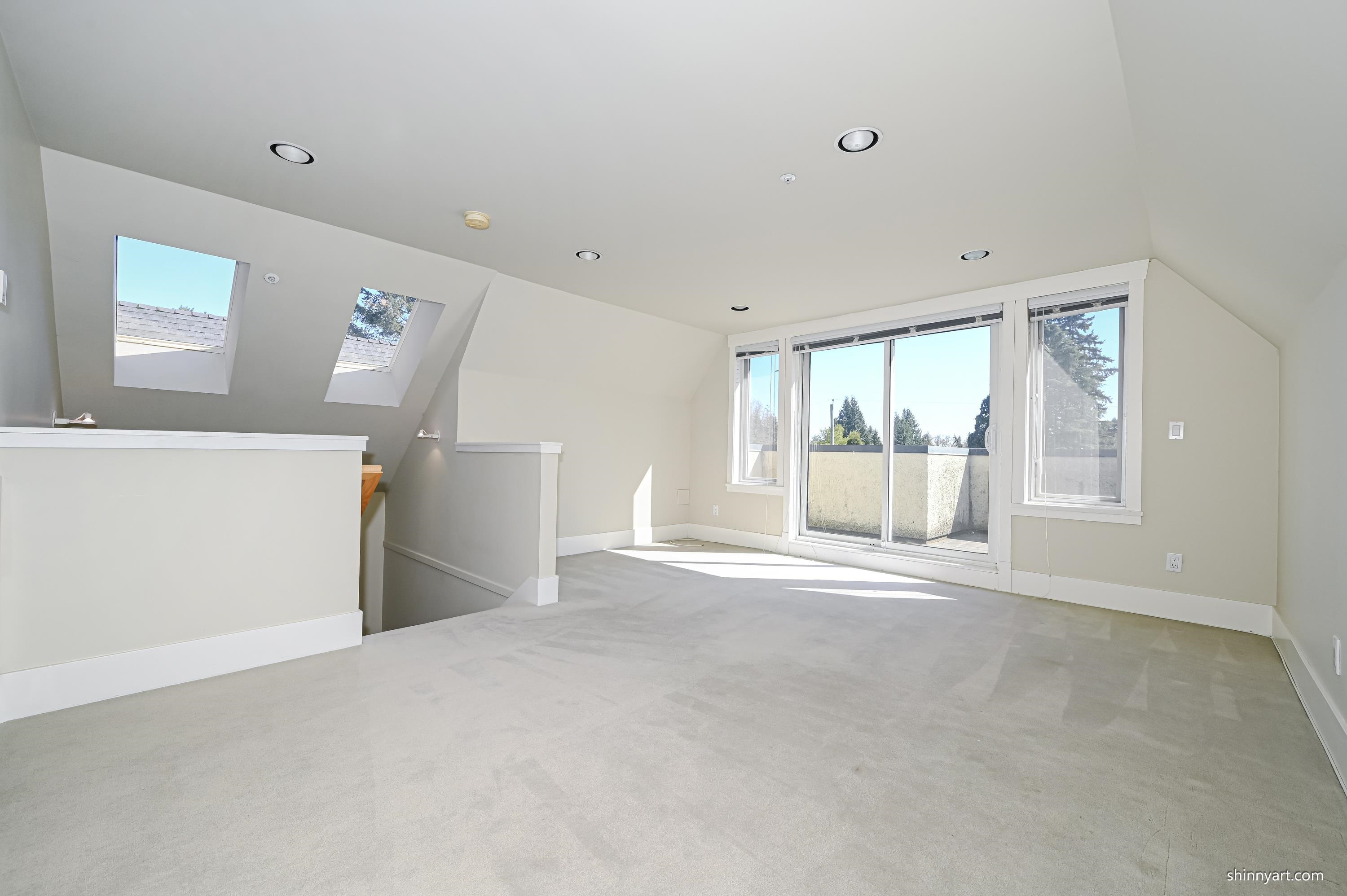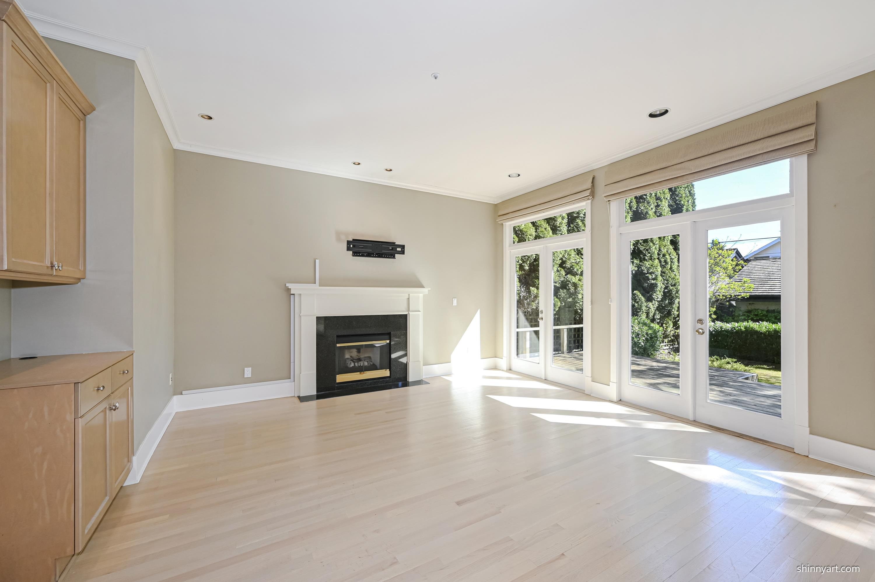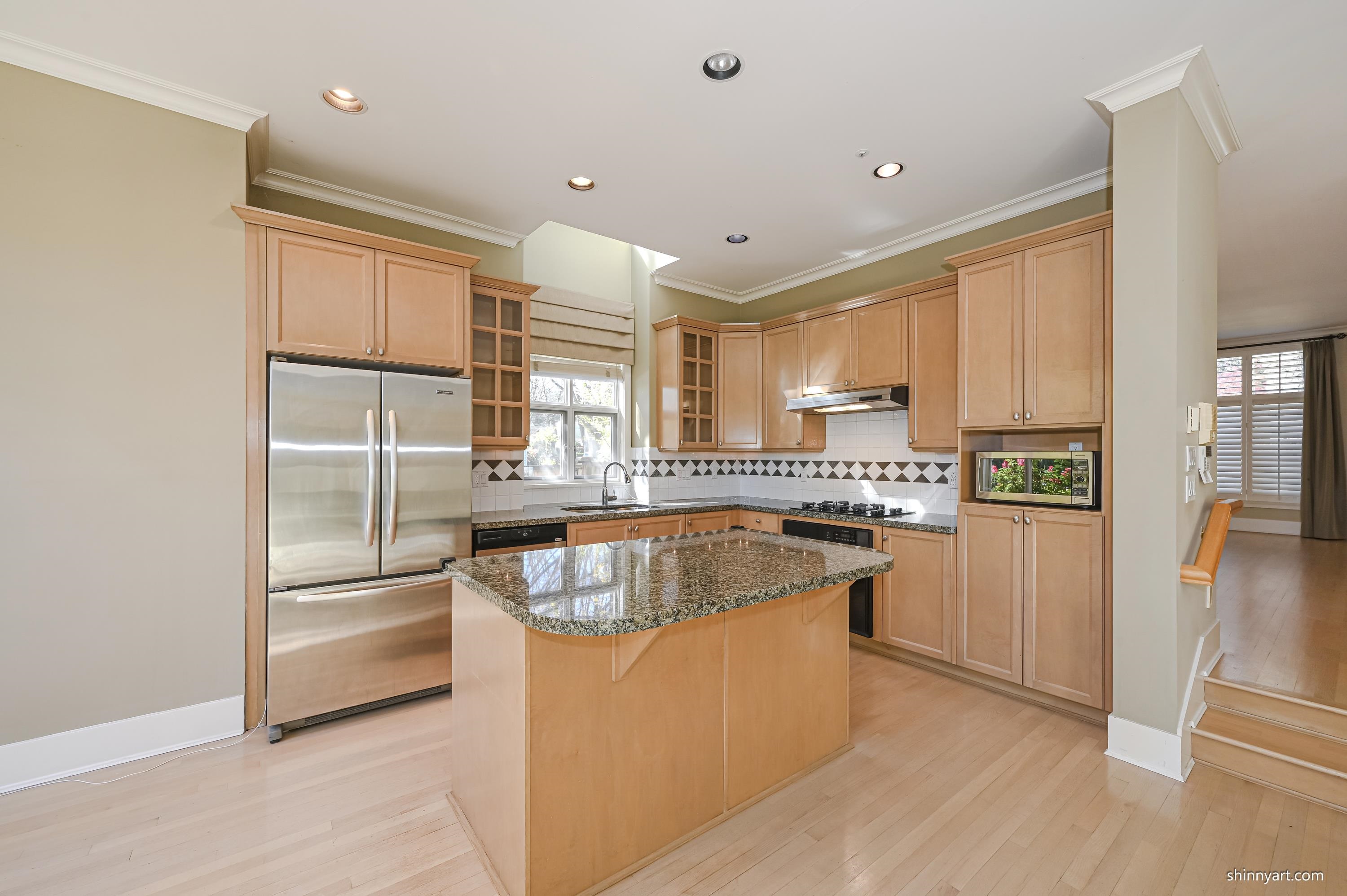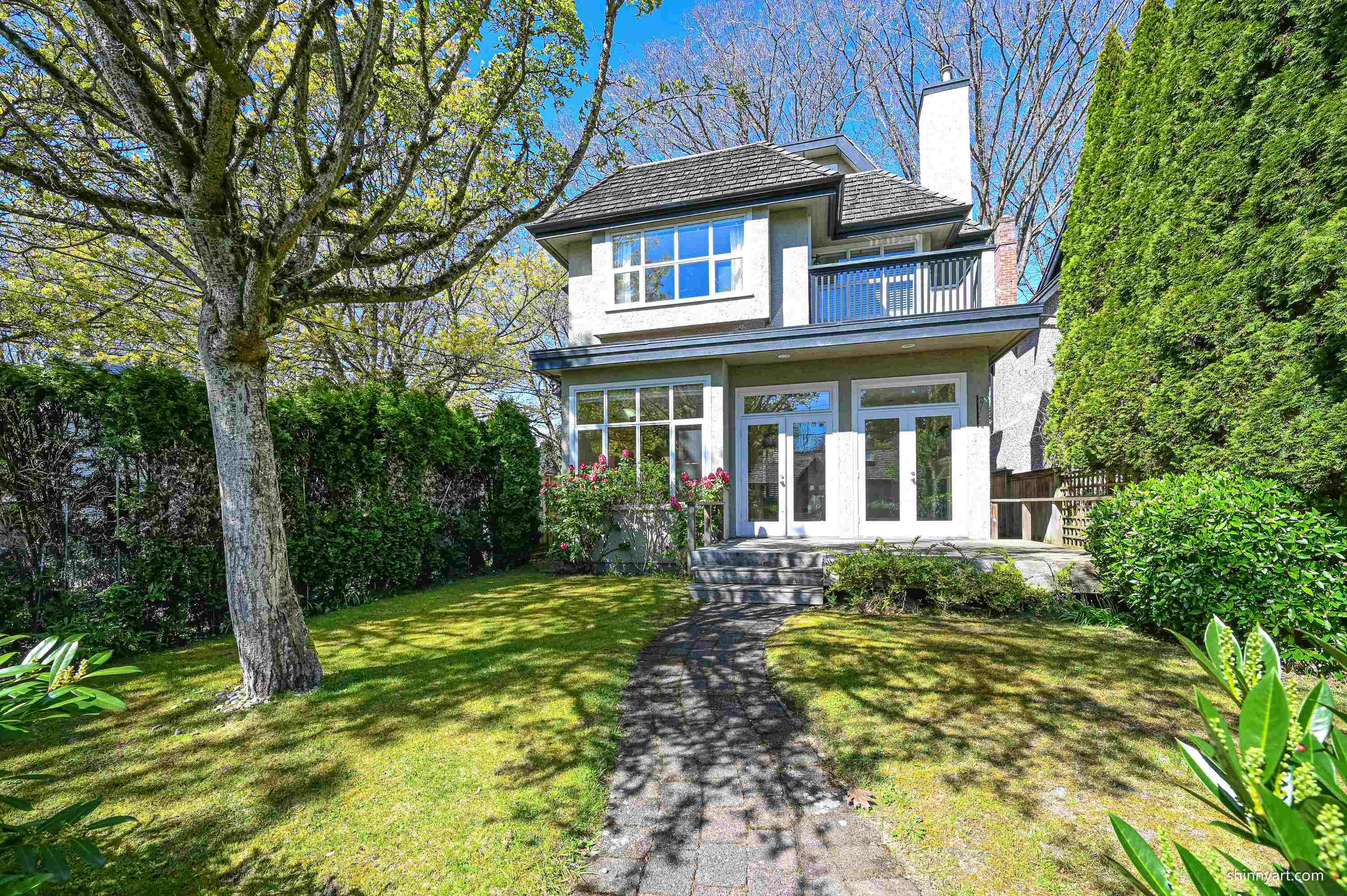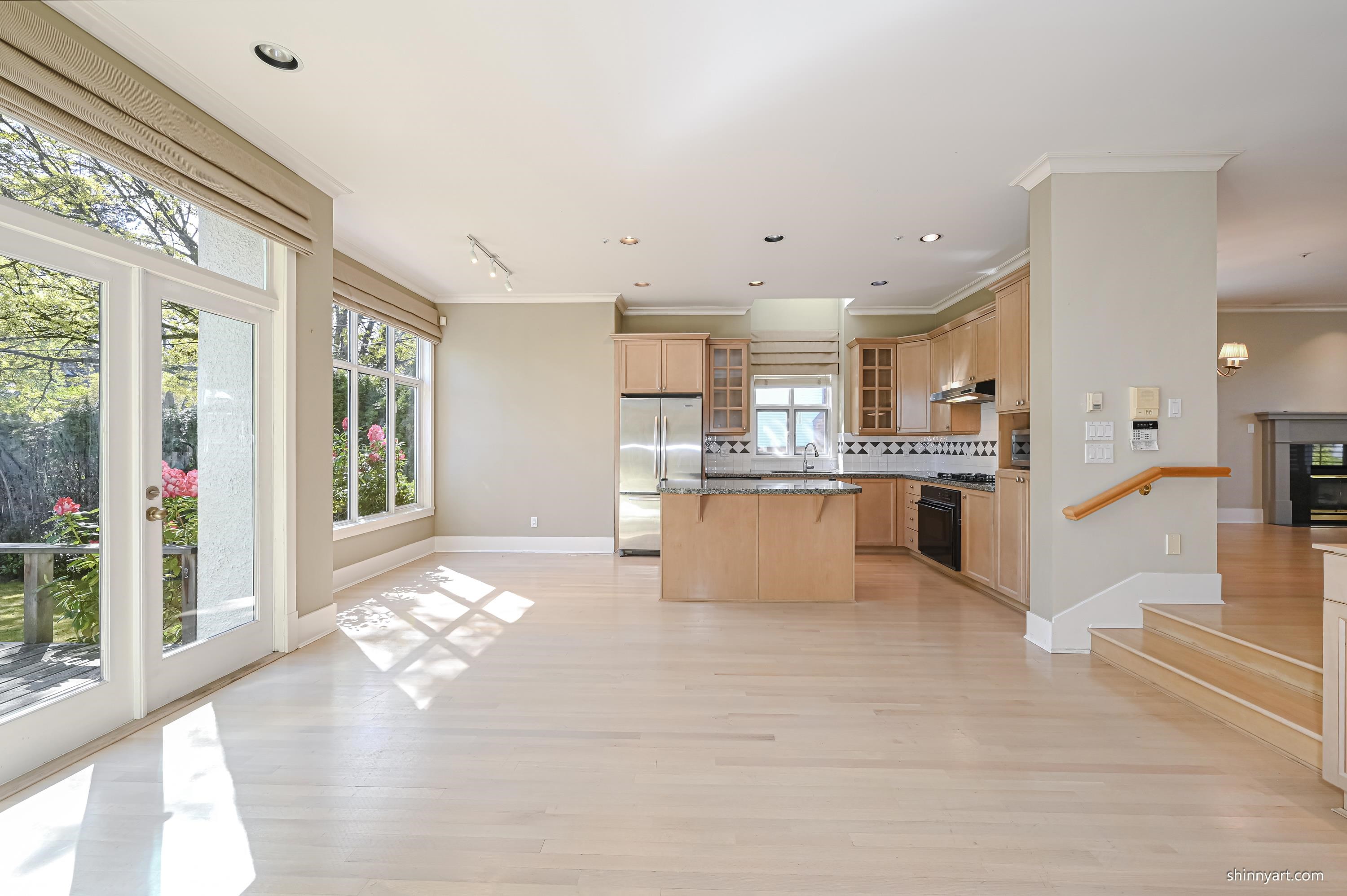 Elegant family home, corner property, beautifully appointed with bright open floor plan. Upon entry, gracious living and dining rooms greet you then through to open family room and kitchen with 9 foot ceilings. Double French doors lead from the gourmet kitchen with granite island to a private south facing back deck and garden. Oak floors on the main and radiant heat on all levels. Three generous bedrooms and bathrooms up including generous master ensuite with Jacuzzi tub. Penthouse top level could be fourth...