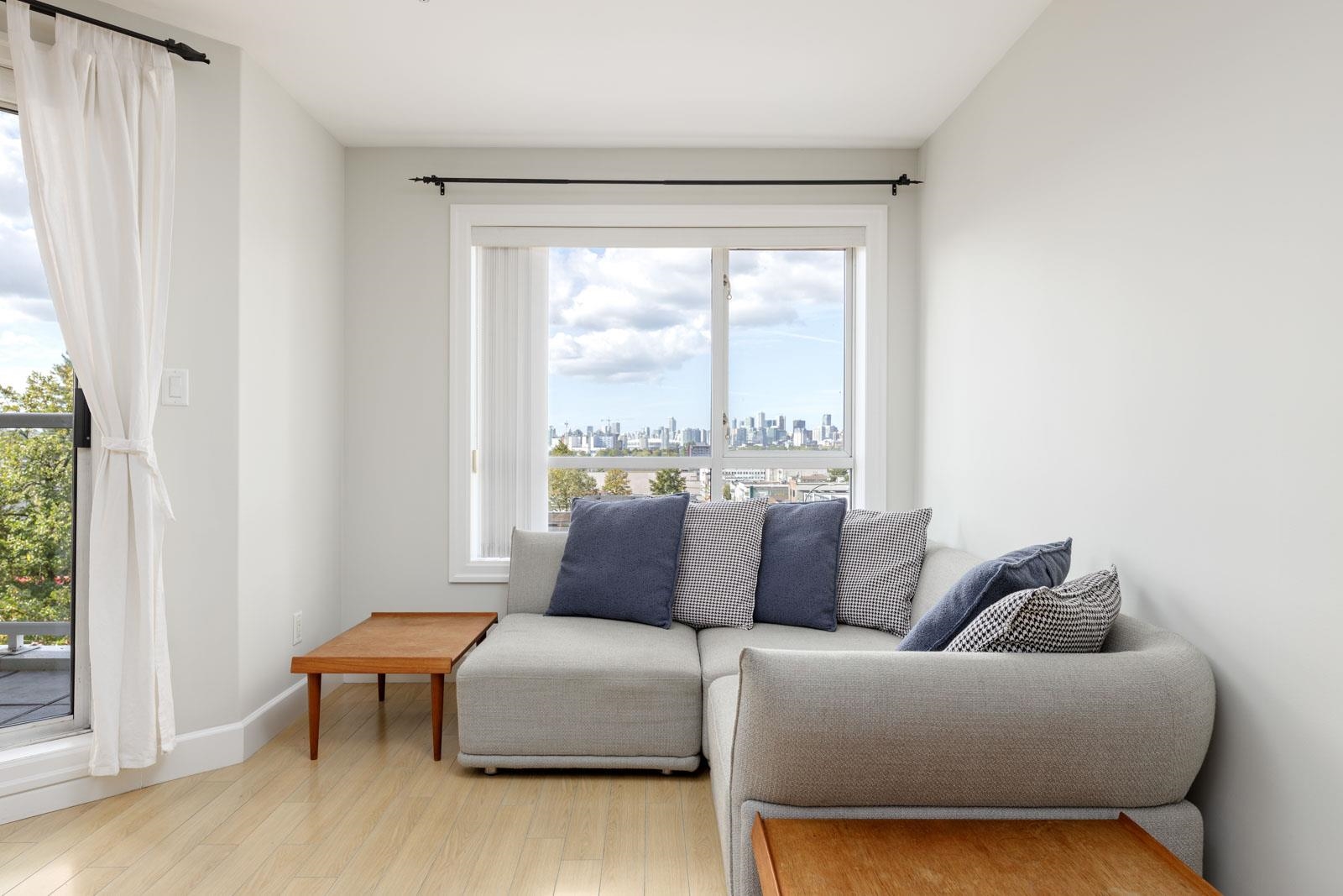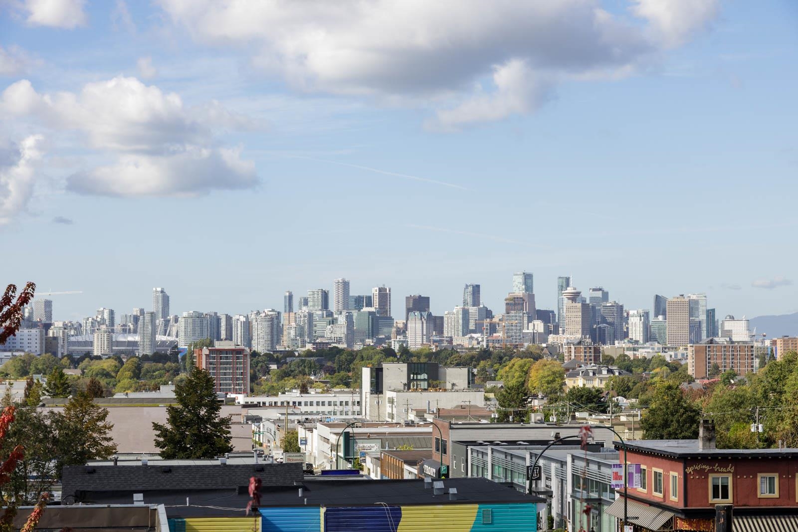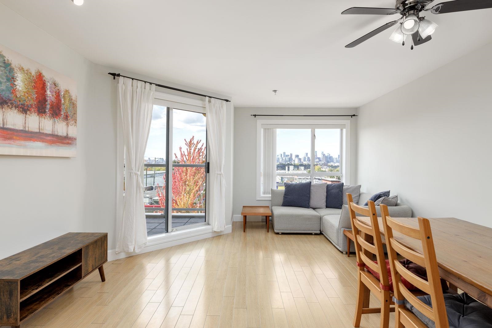 Welcome home to Cityview Terraces, nestled in the East Vancouver neighbourhood. This top-floor condo boasts a bright, open-concept floorplan with over-height ceilings and floor-to-ceiling windows that frame West-facing views of Downtown Vancouver and the North Shore mountains. Step out onto the private balcony to take in the evening sunsets and city skyline. The kitchen is thoughtfully designed with abundant cabinetry, granite countertops, and stainless steel appliances. The breakfast bar is perfect for enj...