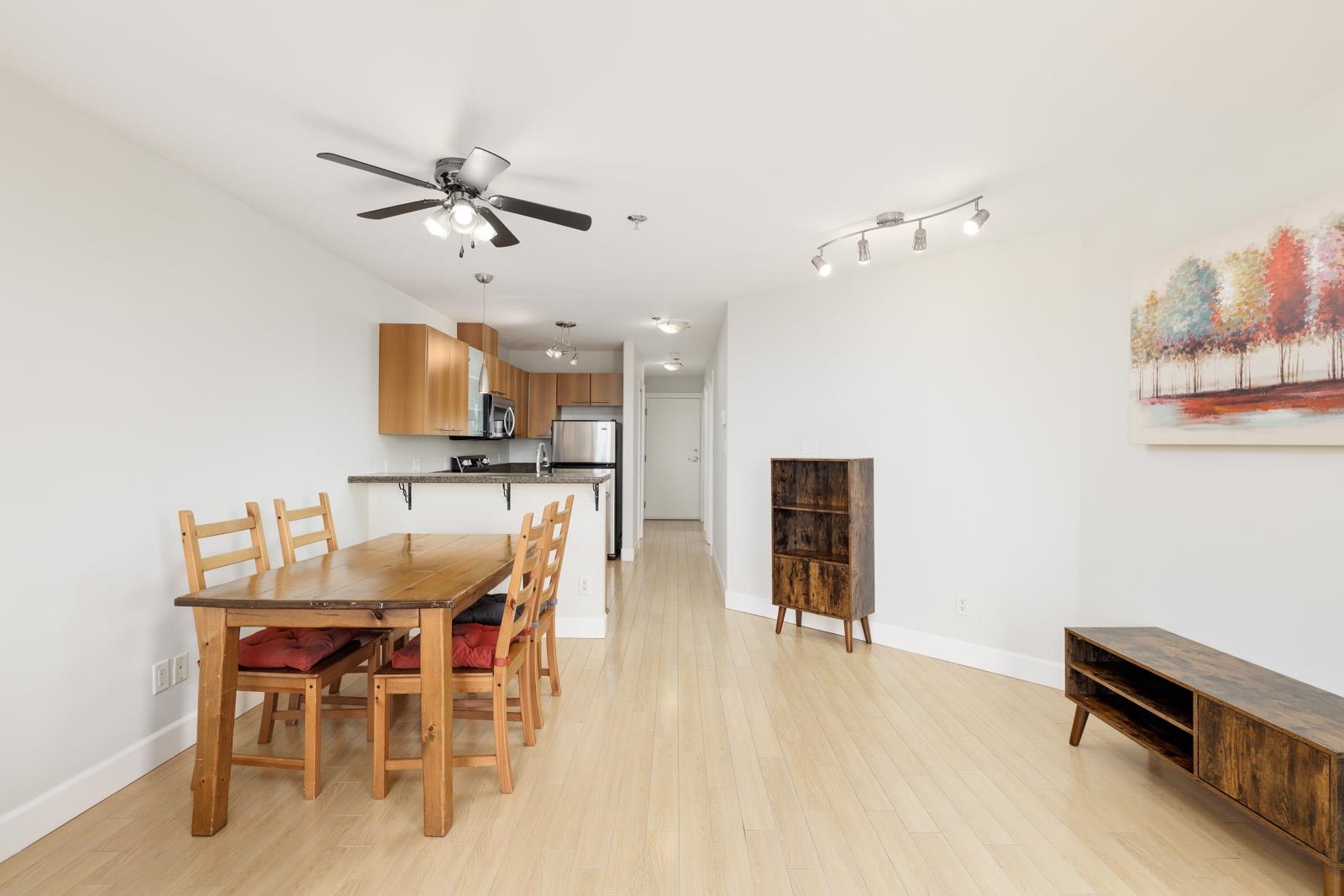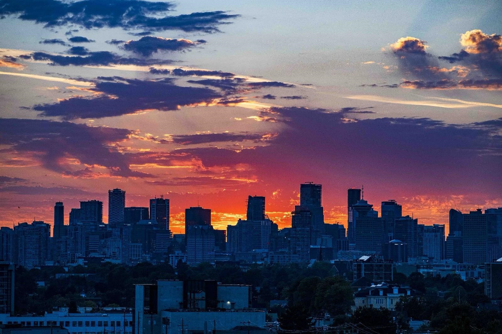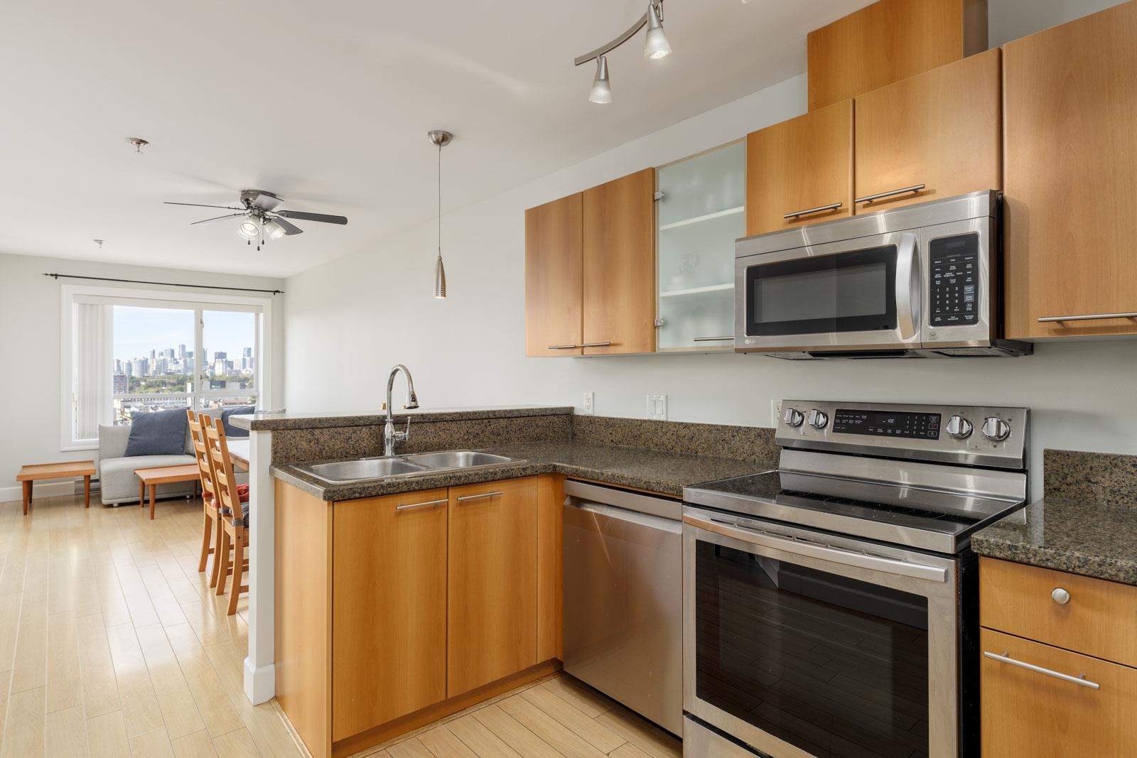Welcome home to Cityview Terraces, nestled in the East Vancouver neighbourhood. This top-floor condo boasts a bright, open-concept floorplan with over-height ceilings and floor-to-ceiling windows that frame West-facing views of Downtown Vancouver and the North Shore mountains. Step out onto the private balcony to take in the evening sunsets and city skyline. The kitchen is thoughtfully designed with abundant cabinetry, granite countertops, and stainless steel appliances. The breakfast bar is perfect for enj...