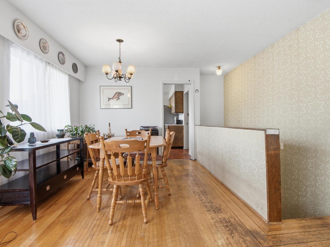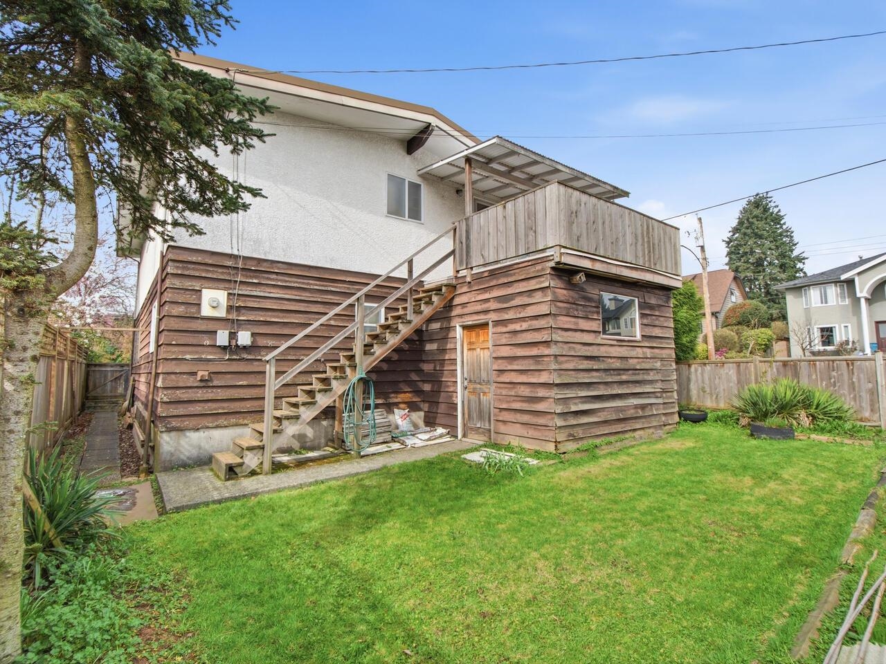 Solid home that is ready for rental, renos or redevelopment. 3 bdrms up. Kitchen has sunny deck access. Further expansion potential down. Recent new roof. Fully fenced backyard with handy storage area. Corner lot in an excellent location just steps to parks, shopping, restaurants, schools and transit. SSMUH is designated directly across the street. This is a detached house investment at a townhouse price!