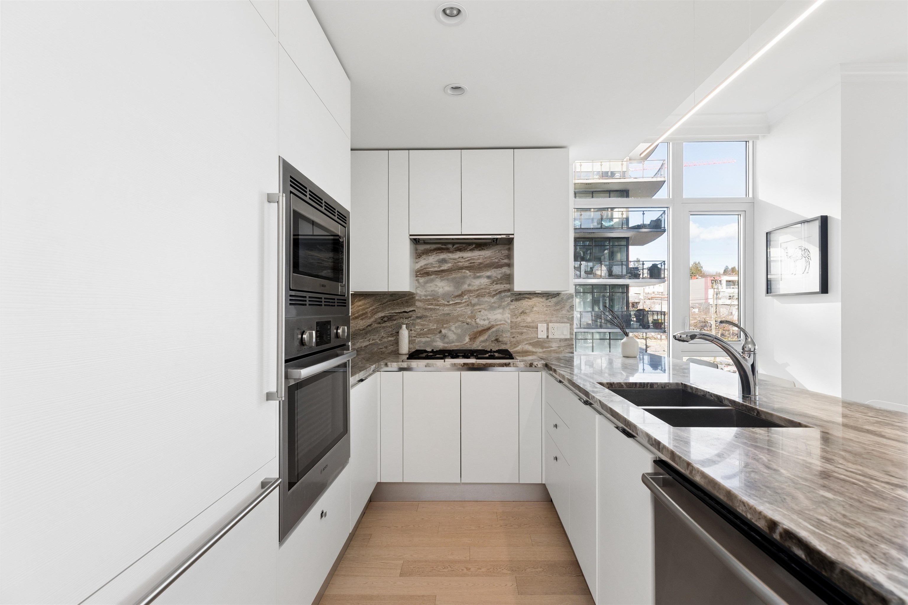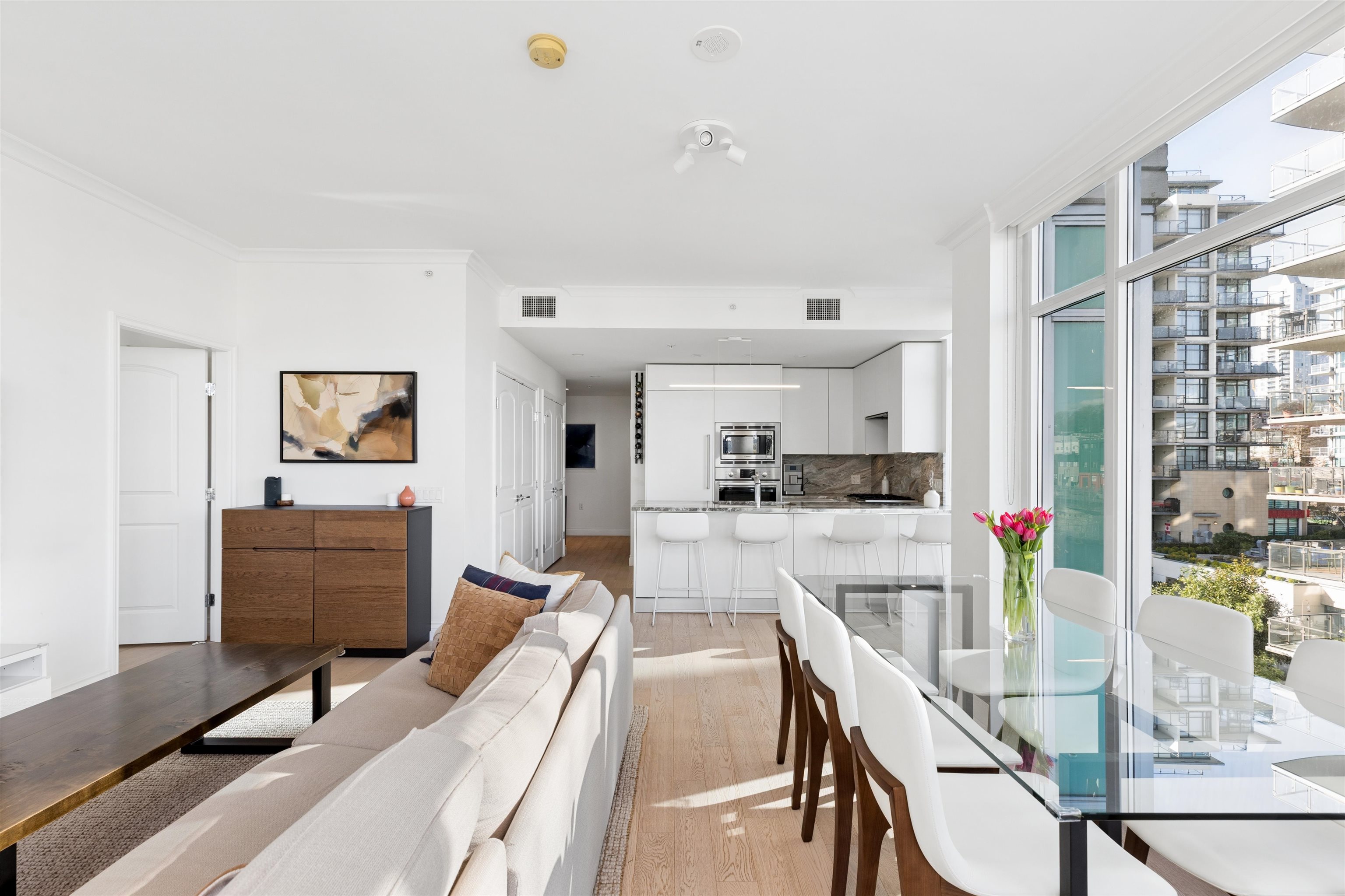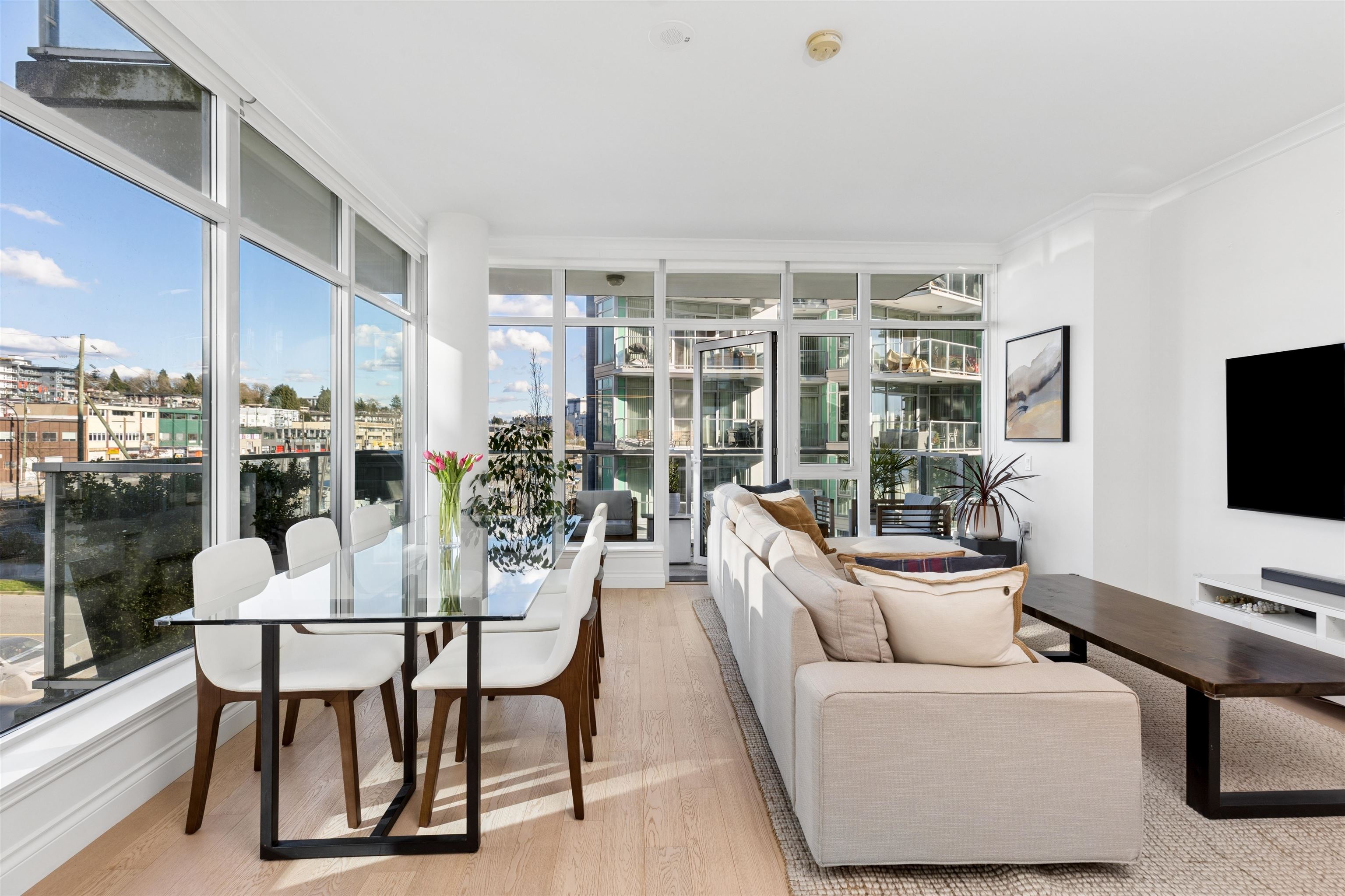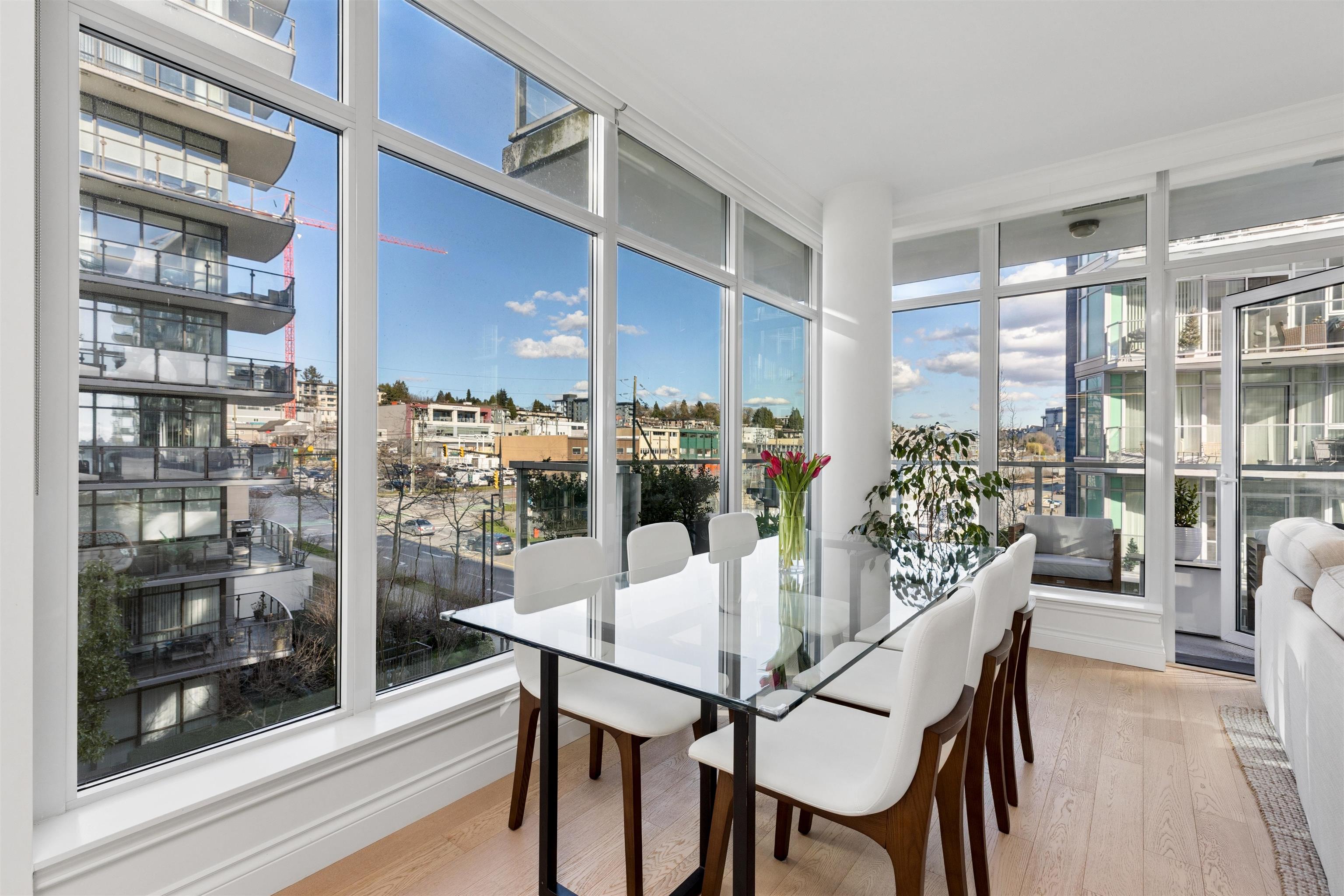 Enjoy waterfront living at the vibrant Shipyards! Welcome to Cascade East - Lower Lonsdale’s premier waterfront address. This 1,127 sqft. 2 bed, 2 bath corner home offers a thoughtfully designed, accessible layout with enhanced spacing throughout, ideal for comfortable, effortless living. The oversized primary features extended hardwood flooring throughout, complemented by updated lighting and modern roller shades. The gourmet kitchen with Bosch appliances, ample counter space, and breakfast bar opens to br...