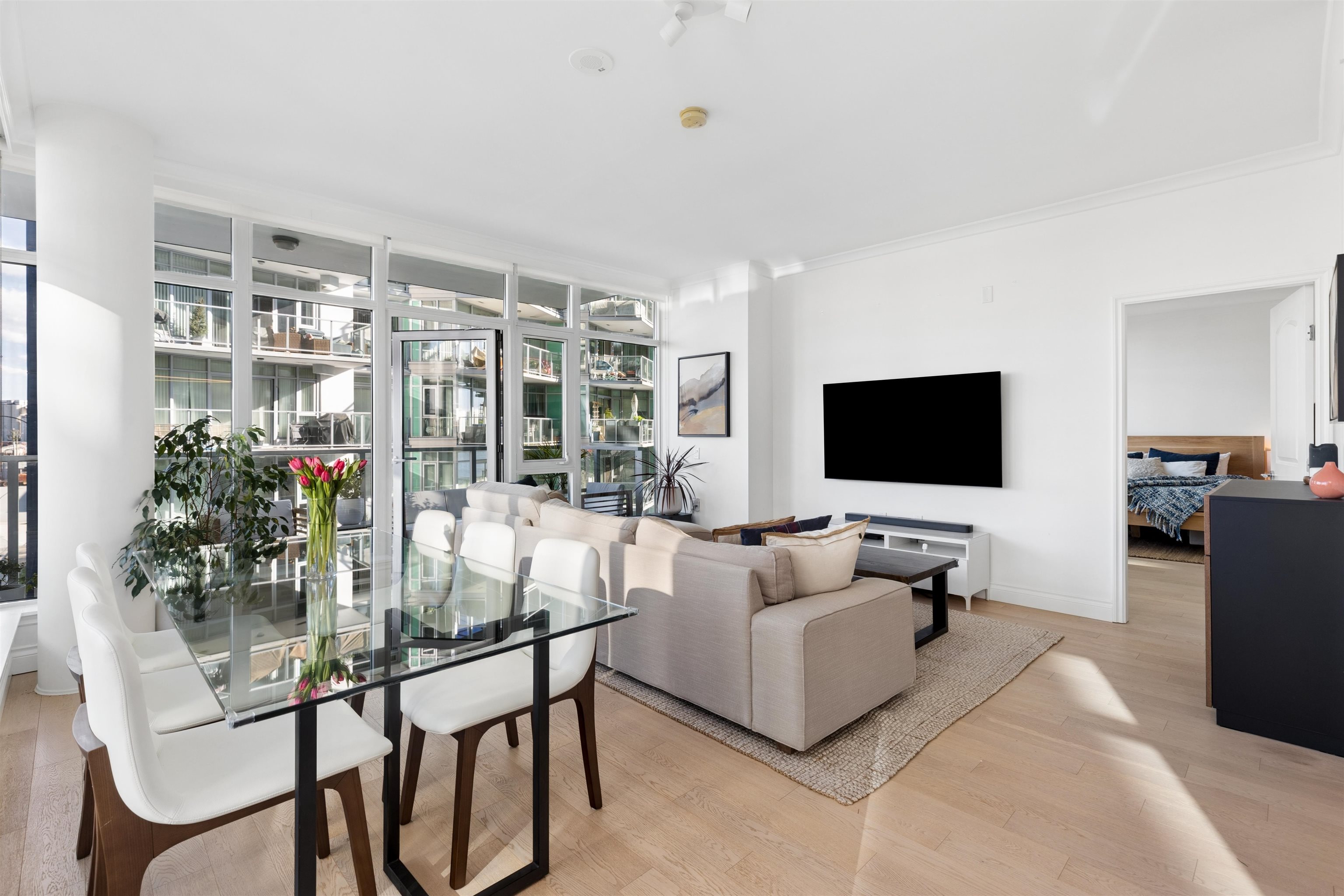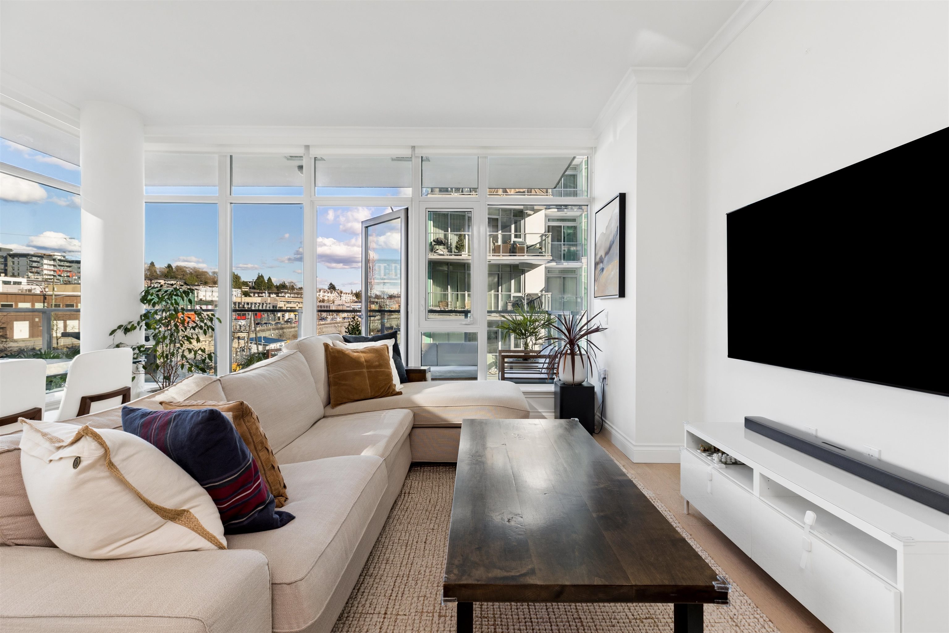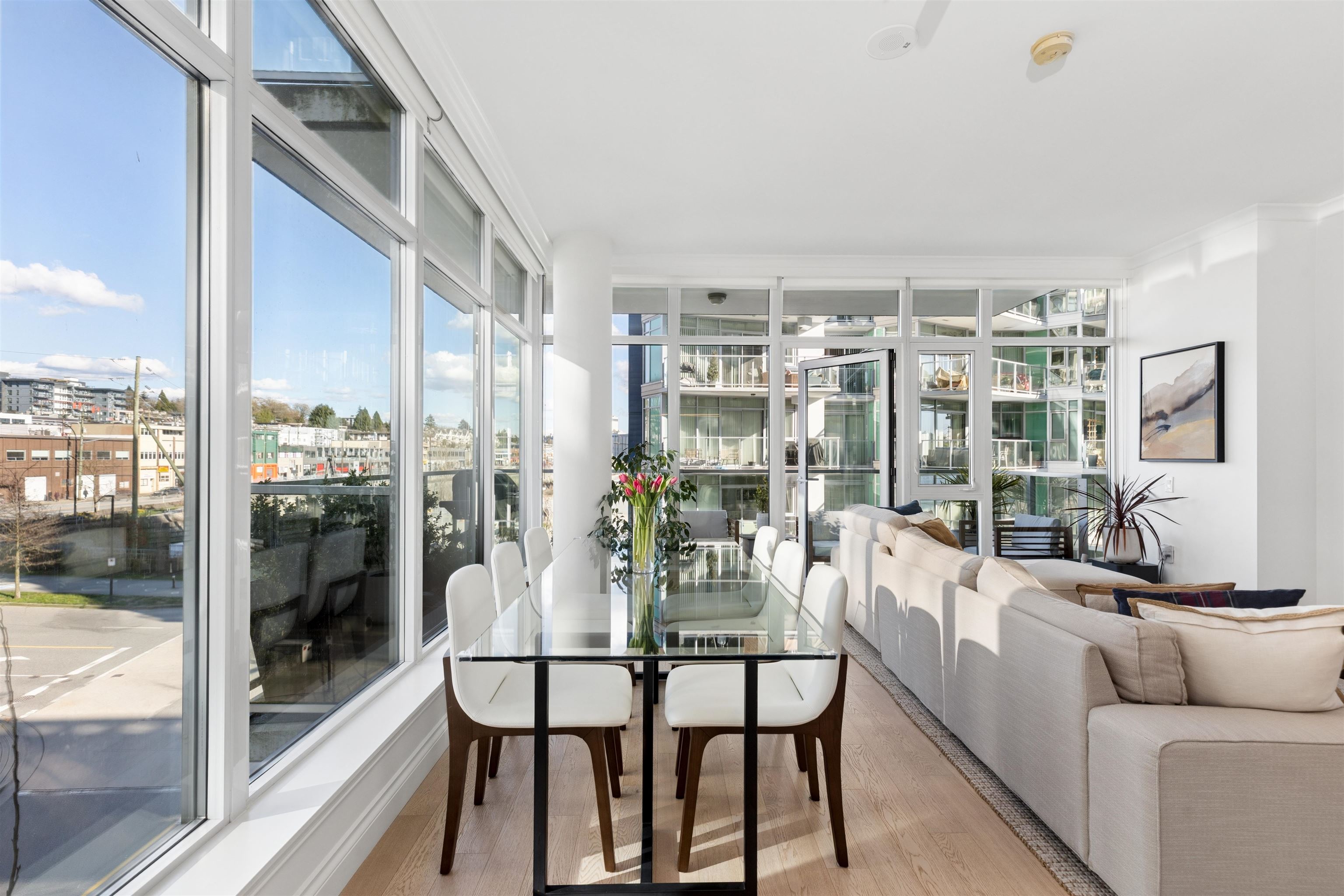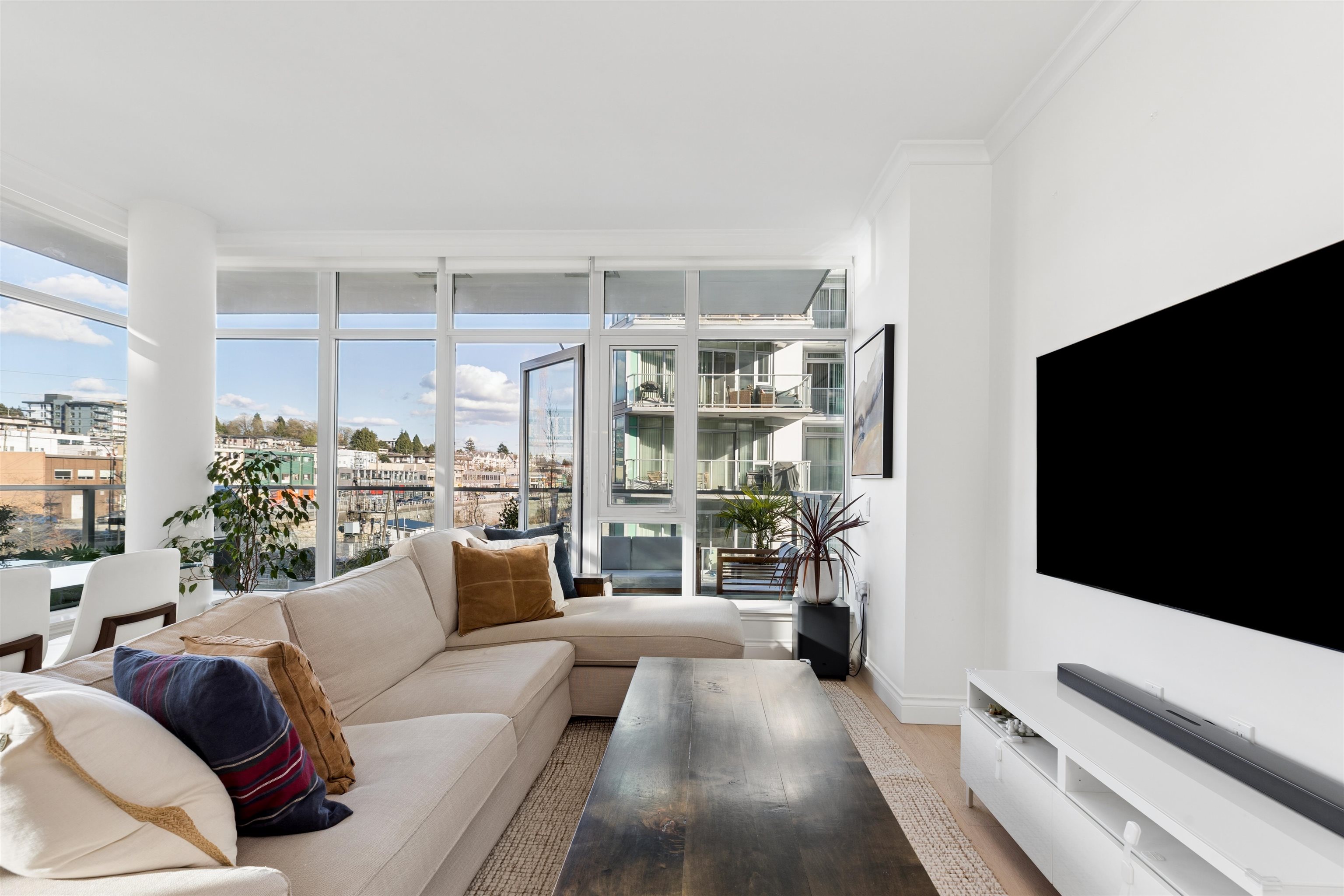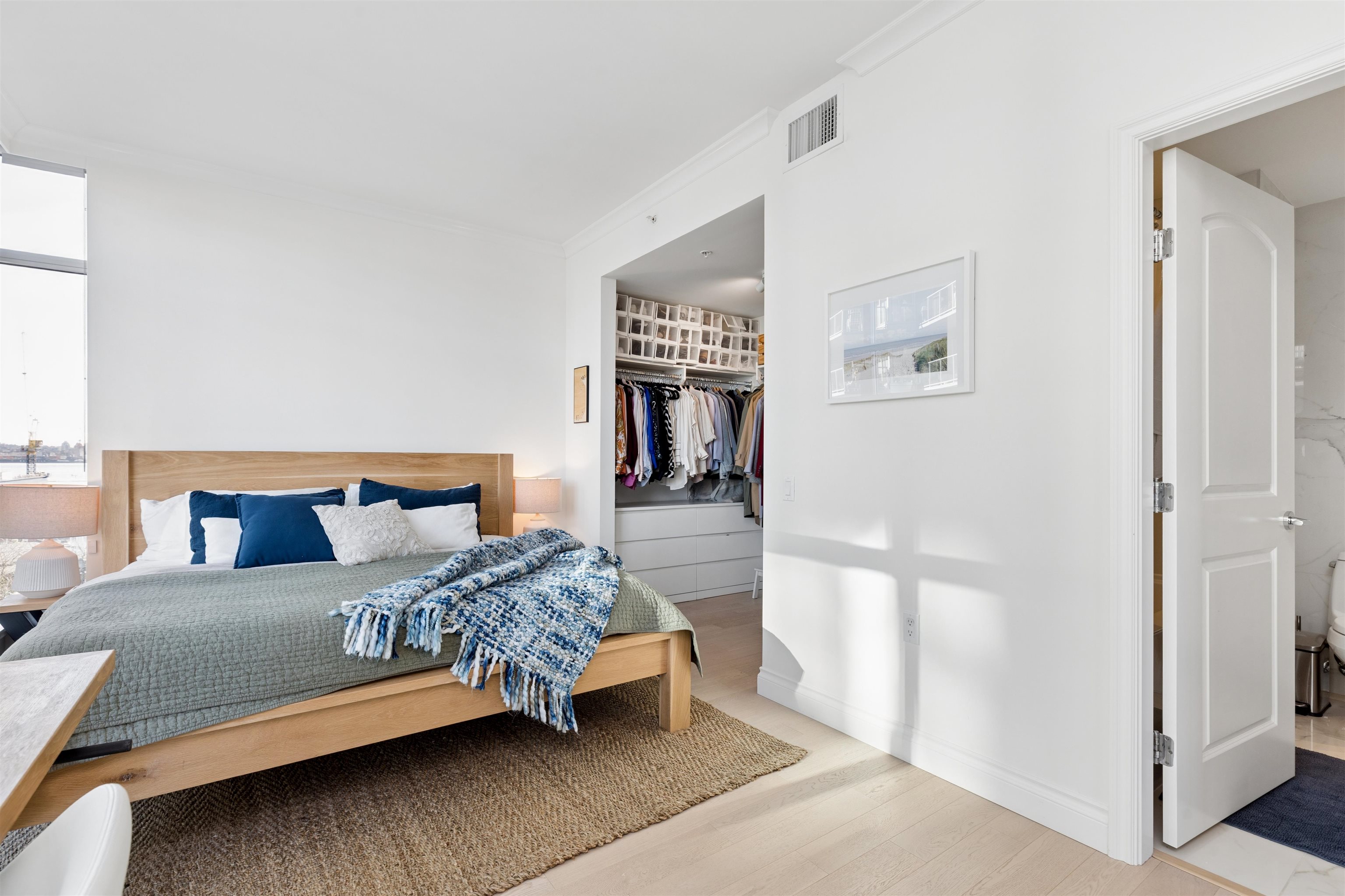 Enjoy waterfront living at the vibrant Shipyards! Welcome to Cascade East - Lower Lonsdale’s premier waterfront address. This 1,127 sqft. 2 bed, 2 bath corner home offers a thoughtfully designed, accessible layout with enhanced spacing throughout, ideal for comfortable, effortless living. The oversized primary features extended hardwood flooring throughout, complemented by updated lighting and modern roller shades. The gourmet kitchen with Bosch appliances, ample counter space, and breakfast bar opens to br...