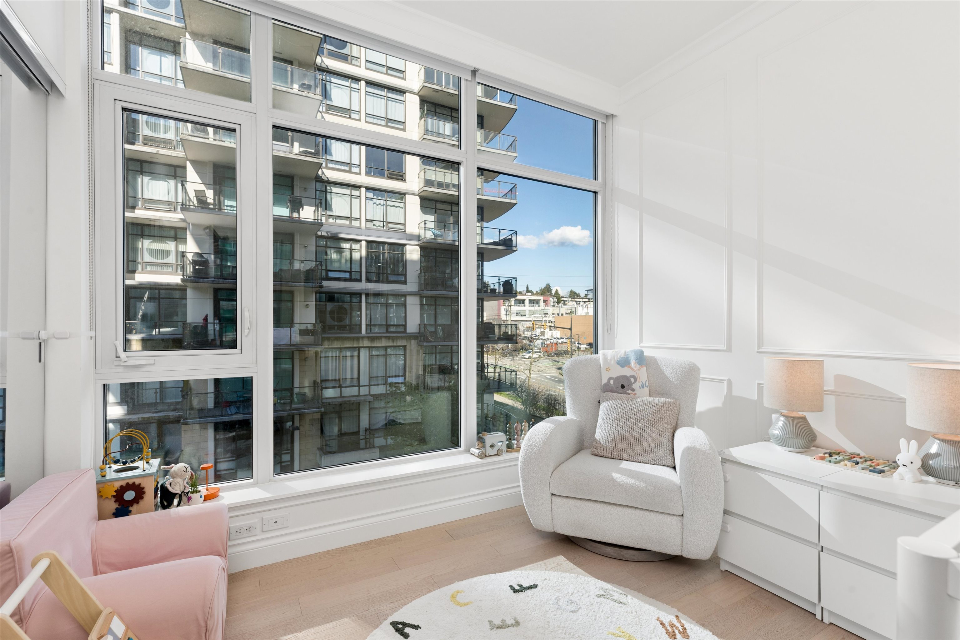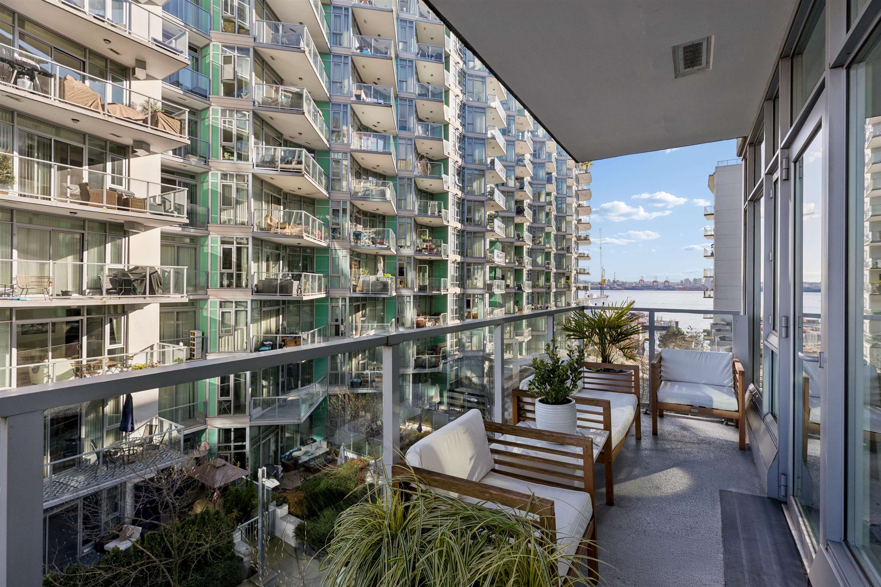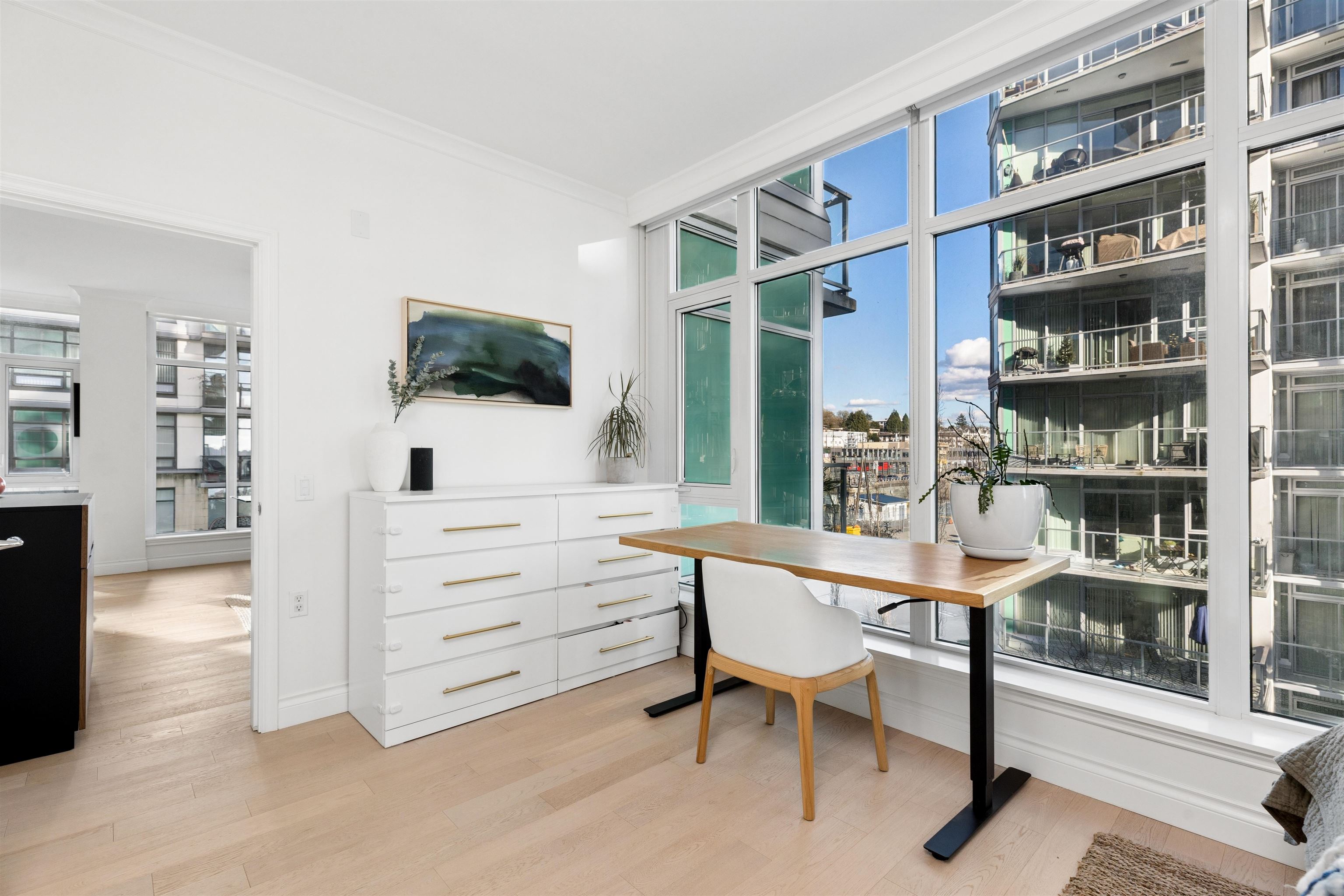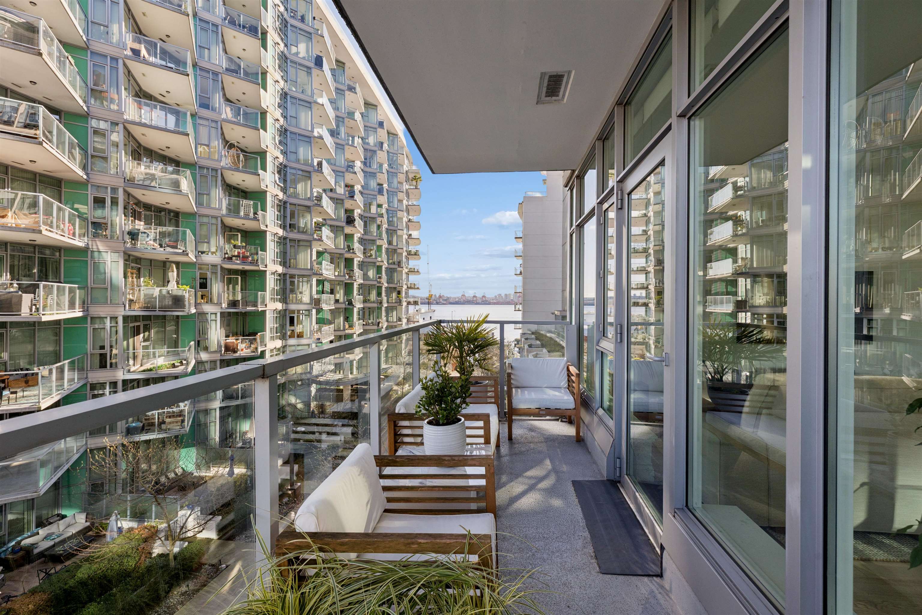 Enjoy waterfront living at the vibrant Shipyards! Welcome to Cascade East - Lower Lonsdale’s premier waterfront address. This 1,127 sqft. 2 bed, 2 bath corner home offers a thoughtfully designed, accessible layout with enhanced spacing throughout, ideal for comfortable, effortless living. The oversized primary features extended hardwood flooring throughout, complemented by updated lighting and modern roller shades. The gourmet kitchen with Bosch appliances, ample counter space, and breakfast bar opens to br...