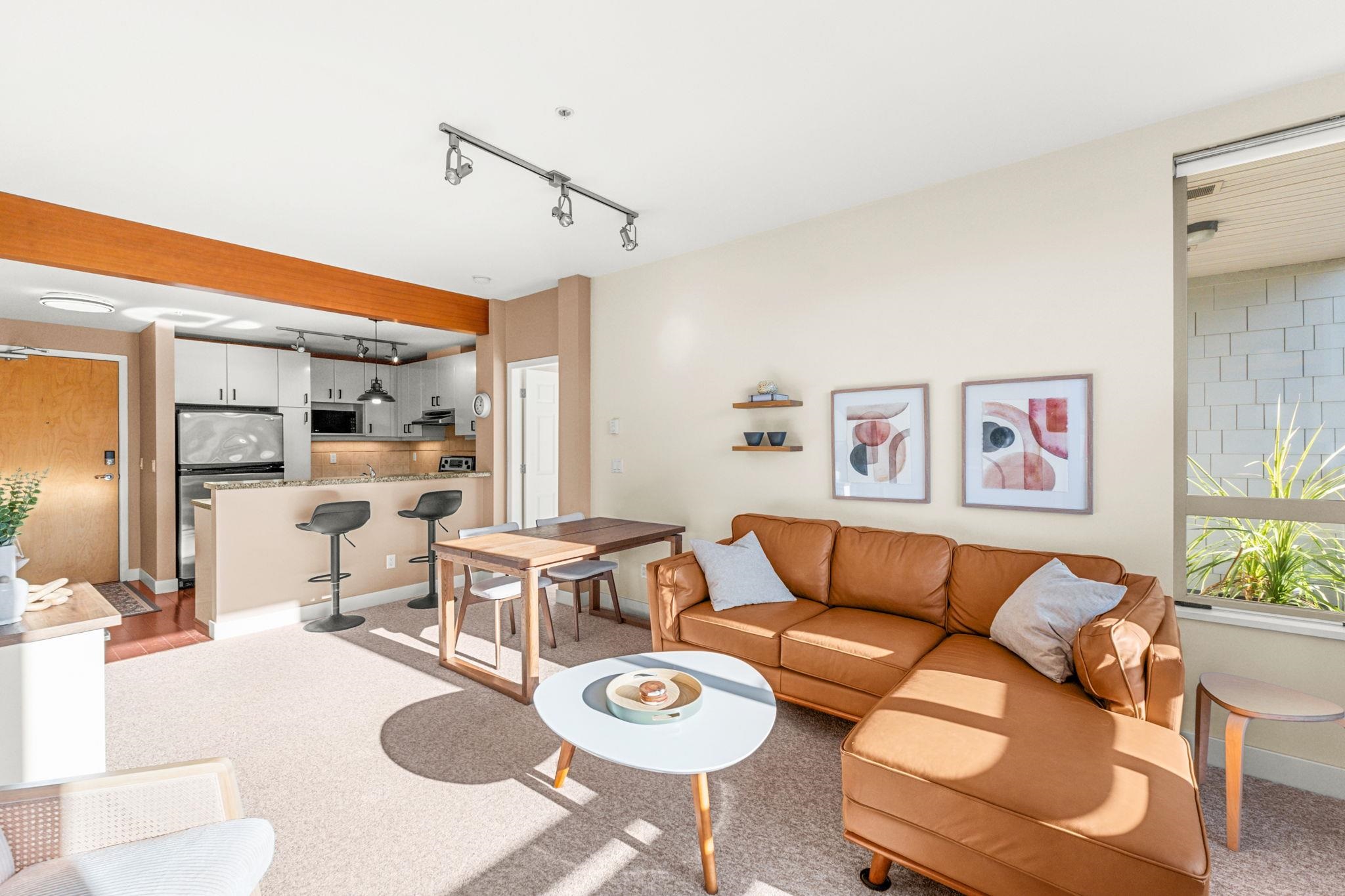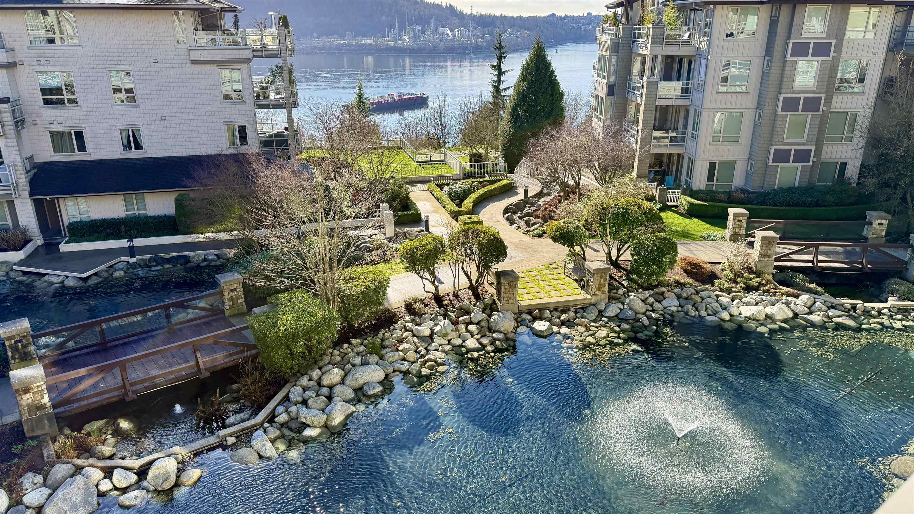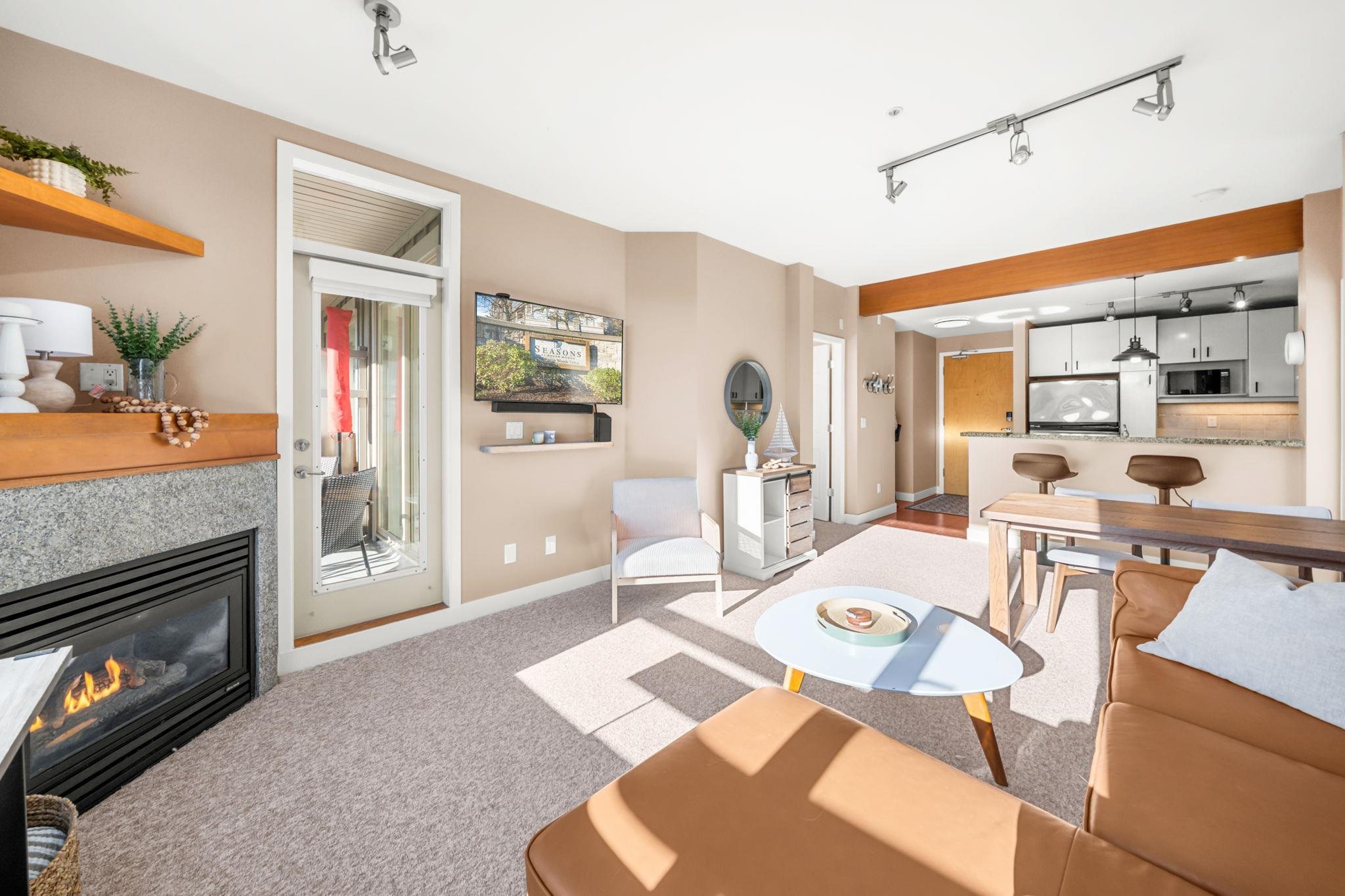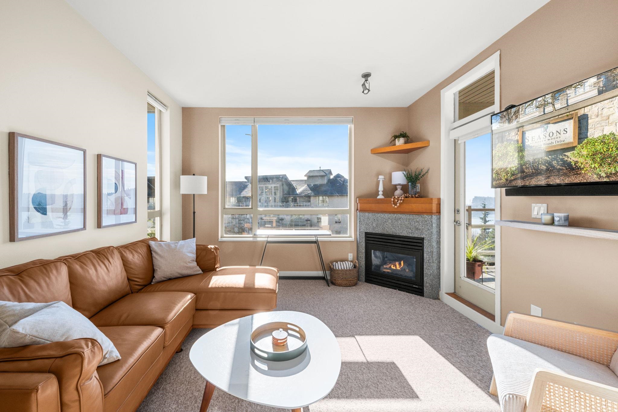 Experience elevated living at Seasons, a rare sub-penthouse corner suite with 2 bedrooms and 2 bathrooms, soaring 9-foot ceilings, and spectacular south-facing water and fountain views. The gourmet kitchen features stainless steel appliances, granite counters, and a sleek eating bar, while the inviting gas fireplace adds warmth. Enjoy in-suite laundry, 2 side-by-side parking stalls, and a storage locker. Exclusive amenities include a gym, party room, theatre room, and on-site resident manager. Just moments ...