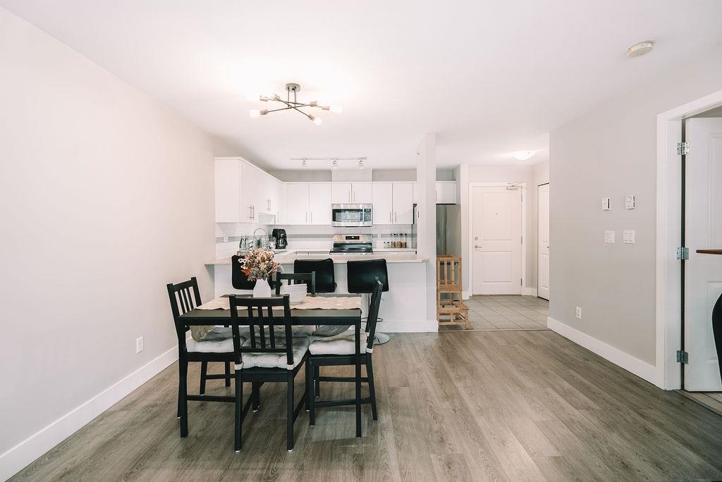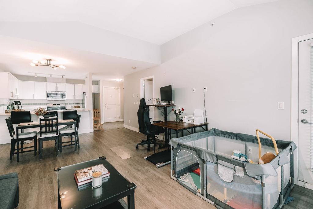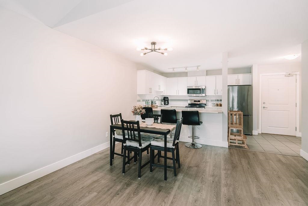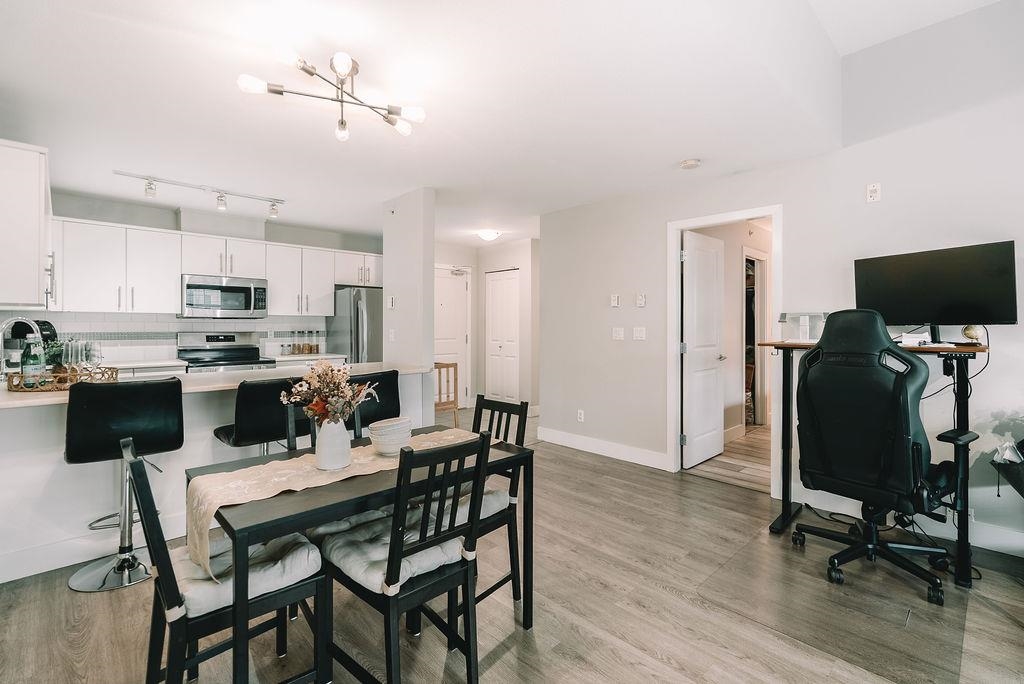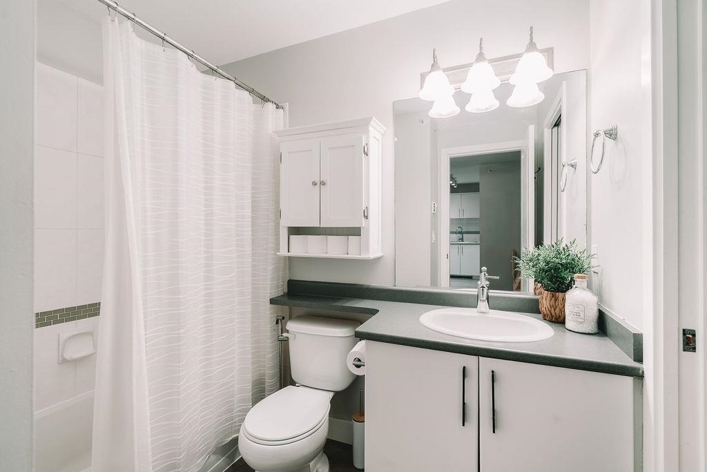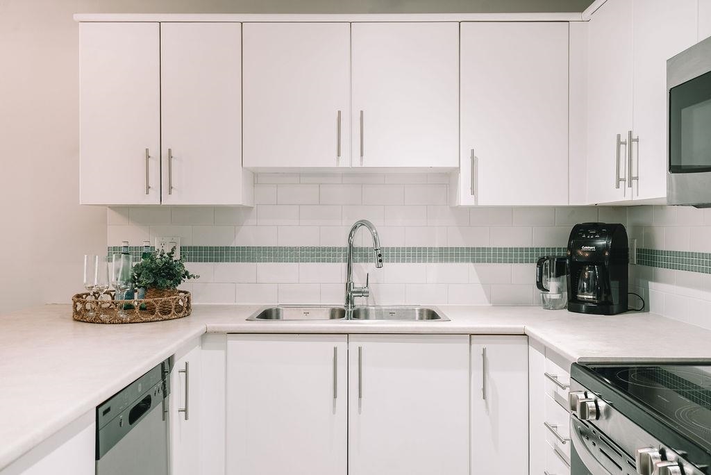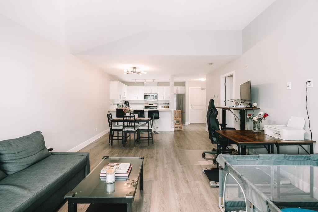 TOP FLOOR UNIT AT THE URBANO! Welcome to your large 1 bedroom home with over 730 sq ft of living space. Featuring open concept kitchen with lots of counterspace including long breakfast bar area, S/S appliances & room to entertain. Spacious dining room plus living room has vaulted ceilings with oversize window for natural light. Generous primary bedroom with W.I.C & cheater ensuite. Fully covered balcony for year round enjoyment. Close to the elevator for easy access. Well run strata with low maintenance fe...