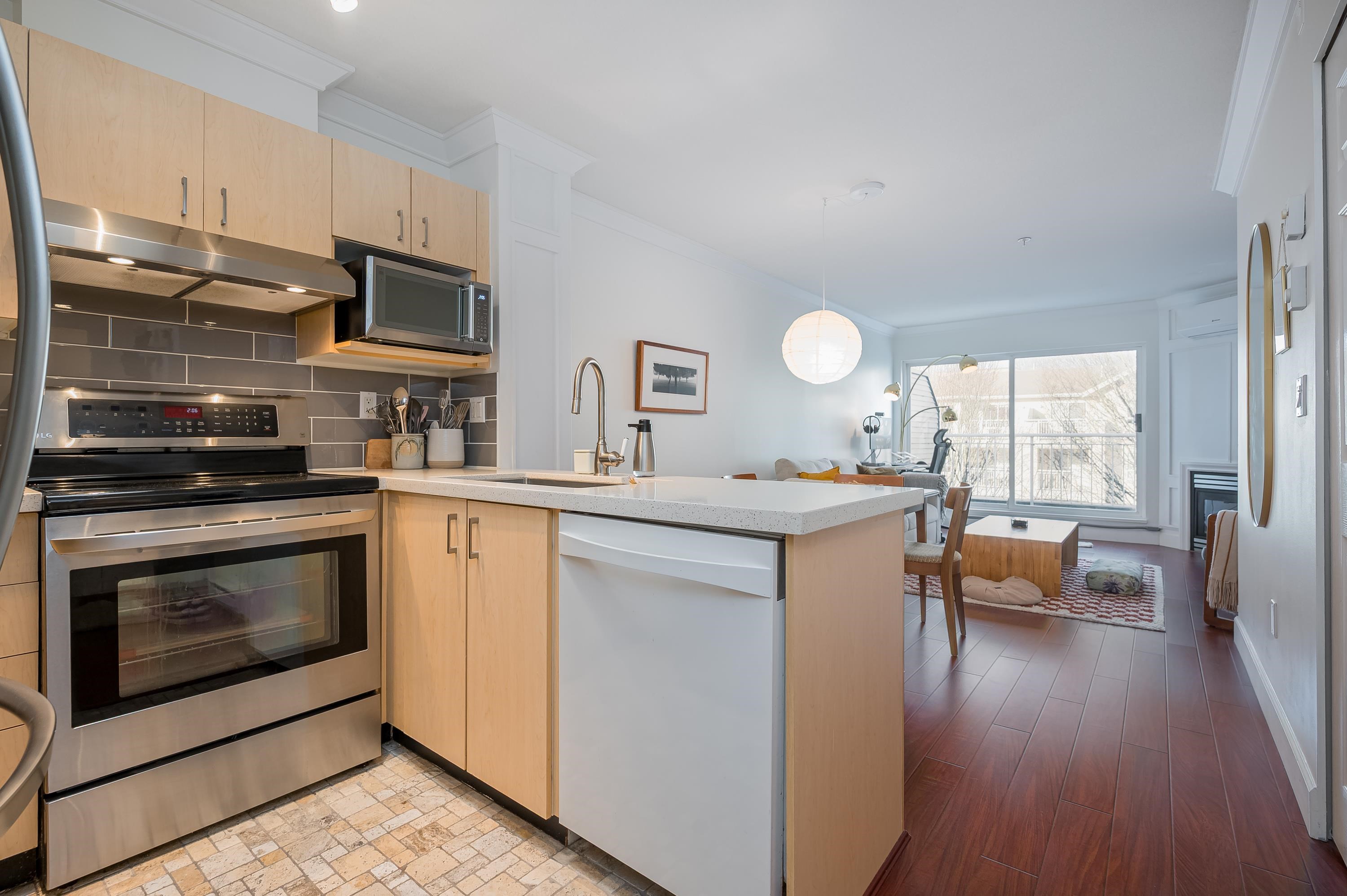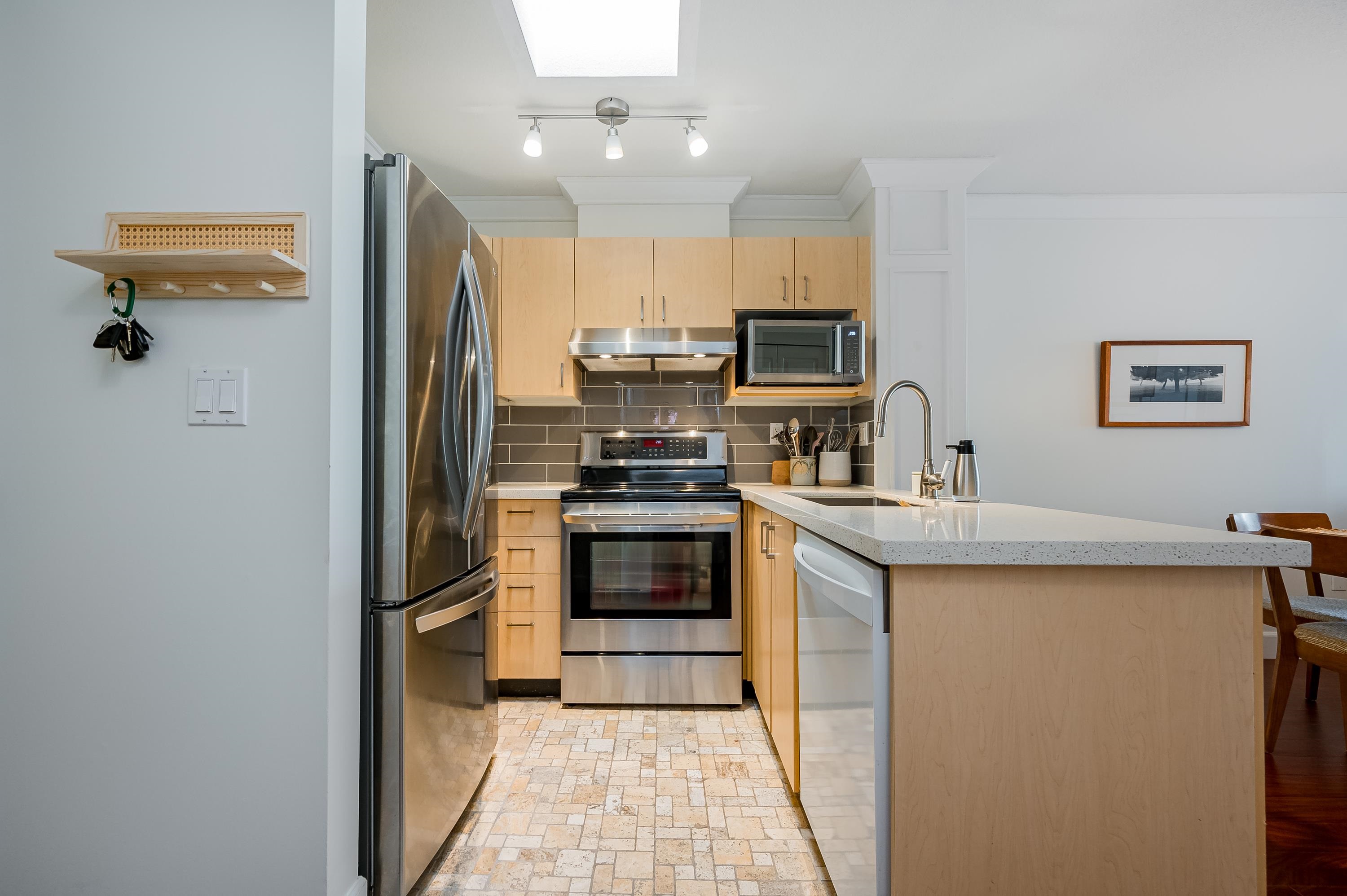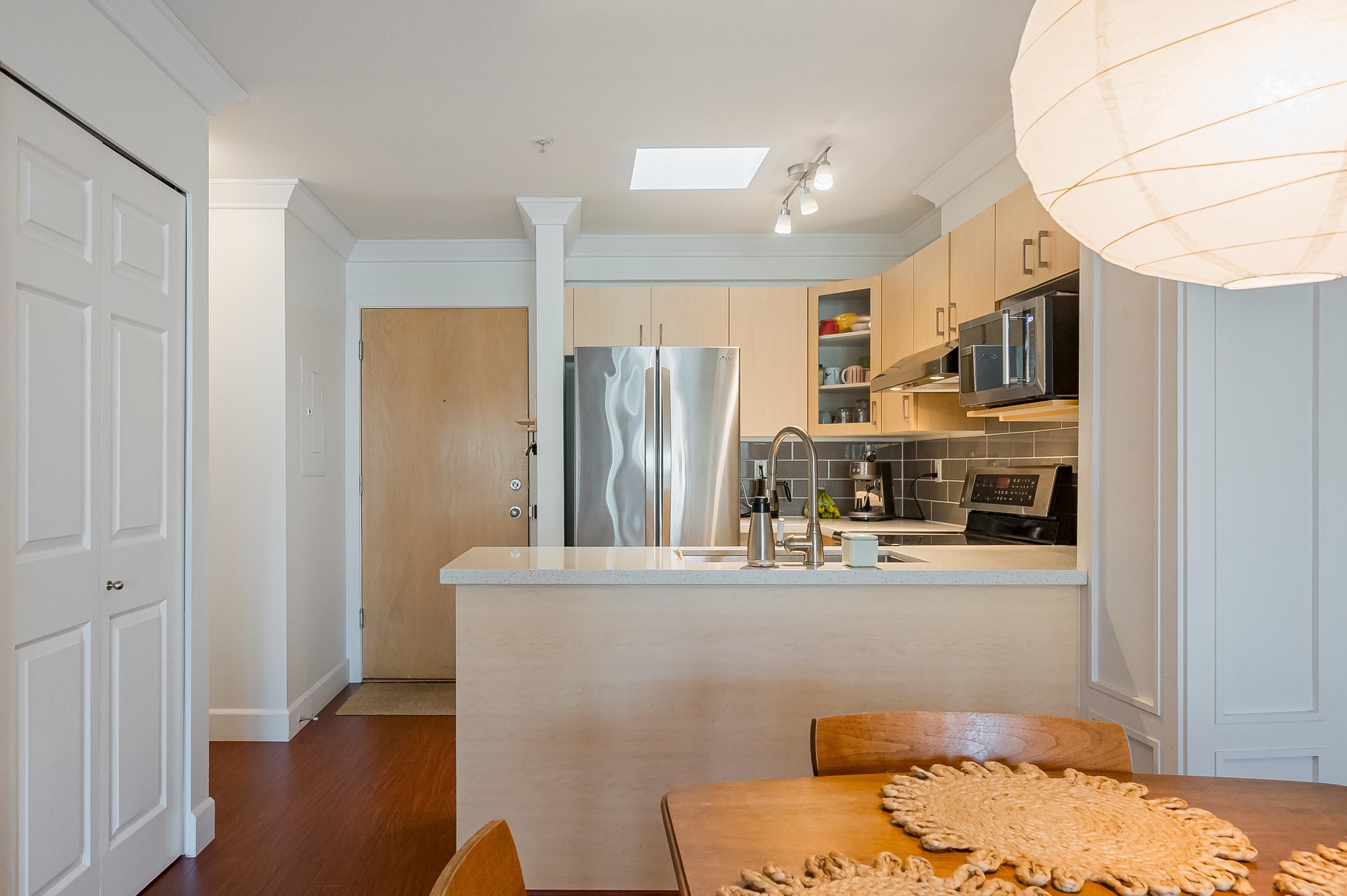 Top Floor 1 Bedroom Penthouse in a Perfect location! This 1 bedroom in the popular 'Rosewood' building is updated and has a new heat pump and A/C! Great floor plan, this unit has updated appliances and quartz counters in the kitchen and bathroom, big Deck faces north and gives nice privacy in bloom, living area is a good shape and has gas fireplace, in suite laundry with room for storage. 1 parking and 1 locker down as well as bike room. Just across the street from superstore, Willowbrook mall and all level...
