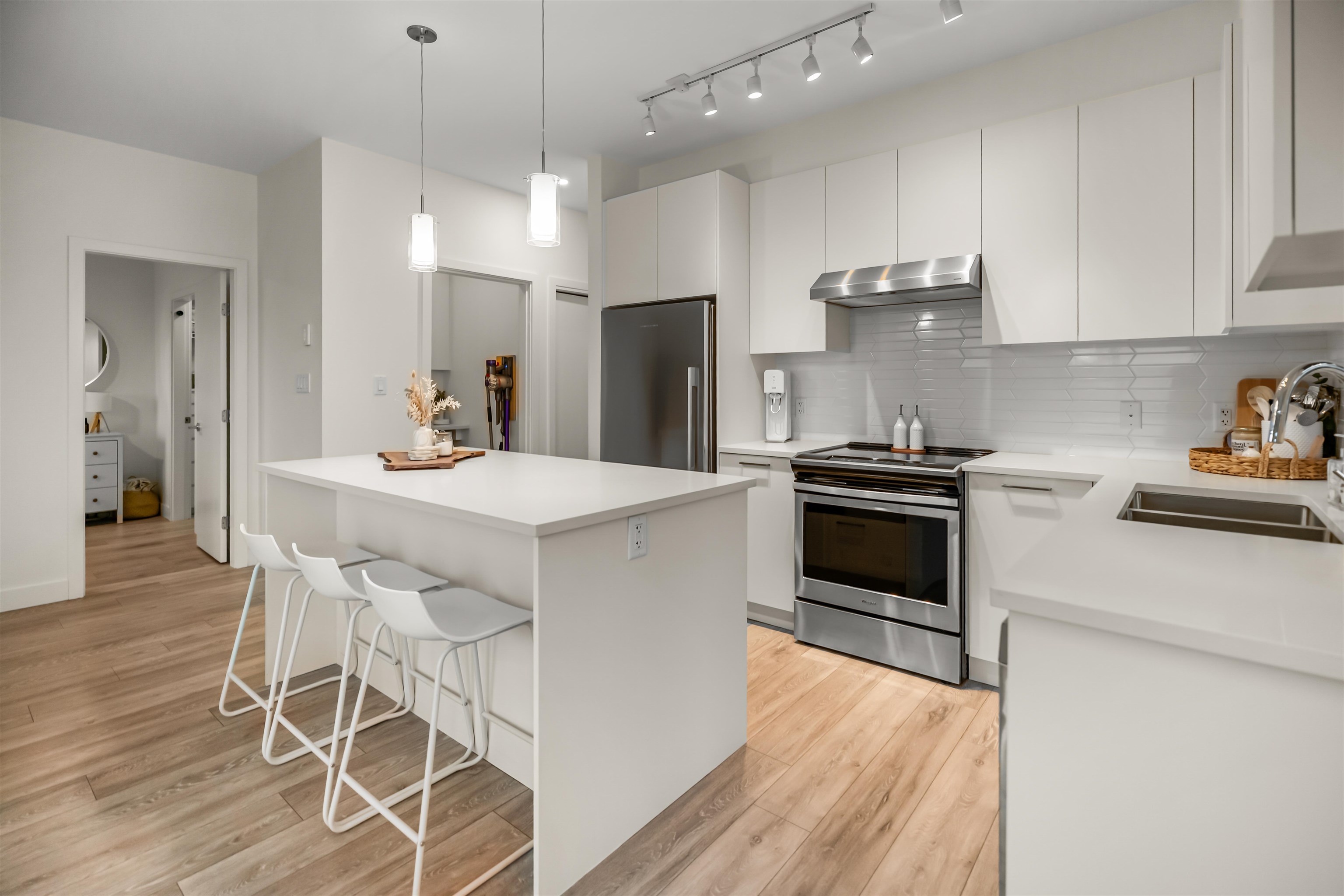 Welcome to your 2 bedroom and 2 full bathroom home at the WYATT in Willoughby Heights. This stylish condo offers a favorable corner unit open concept layout with soaring ceilings, oversized Low-E windows, and a south-west facing exposure. The kitchen features quartz countertops, full-height tile backsplash, soft-close cabinetry, a large island, and a premium stainless steel appliance package. Added benefits include a covered balcony, 2 underground parking spots and 1 storage. Pet and rental friendly buildin...