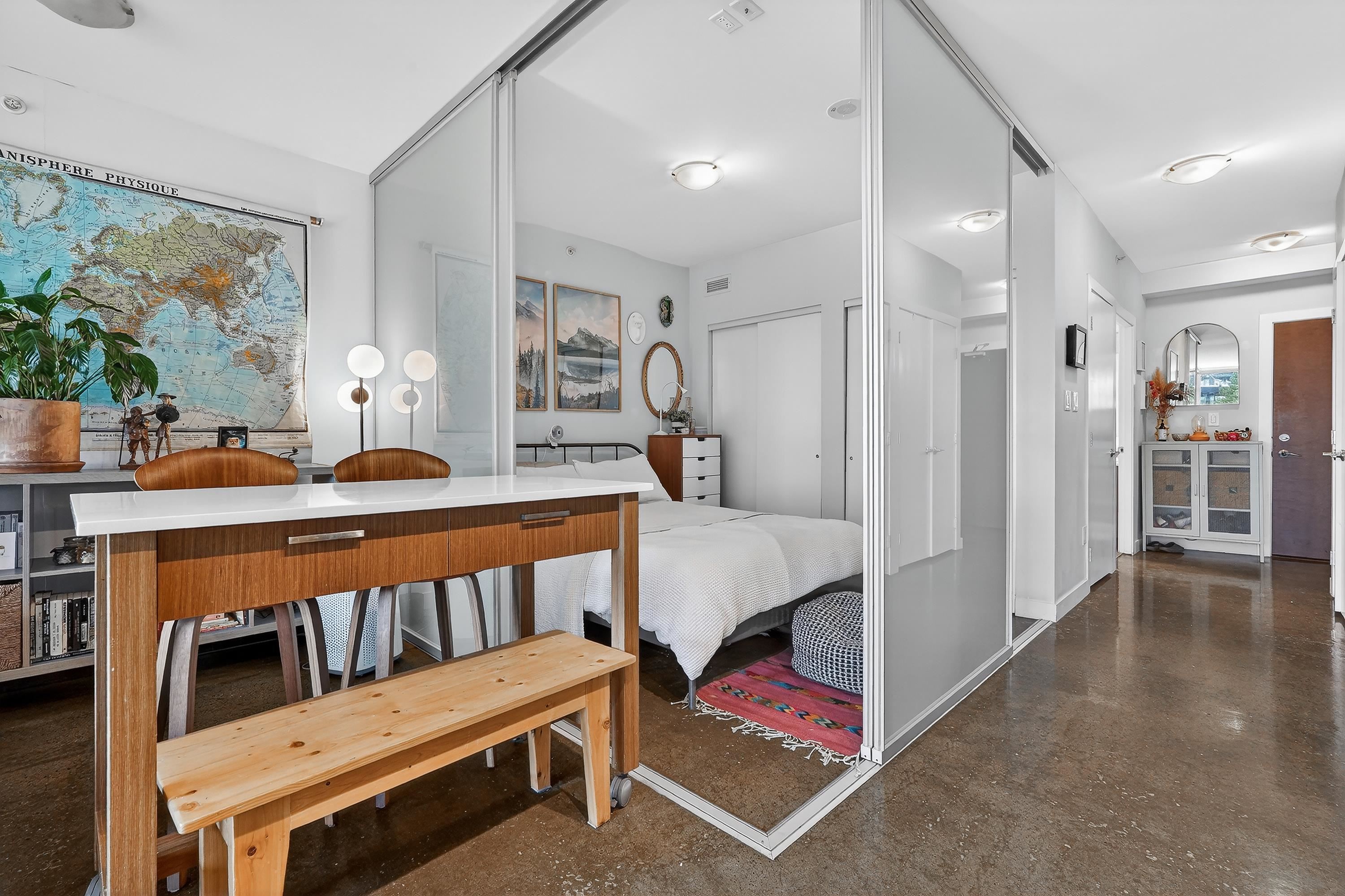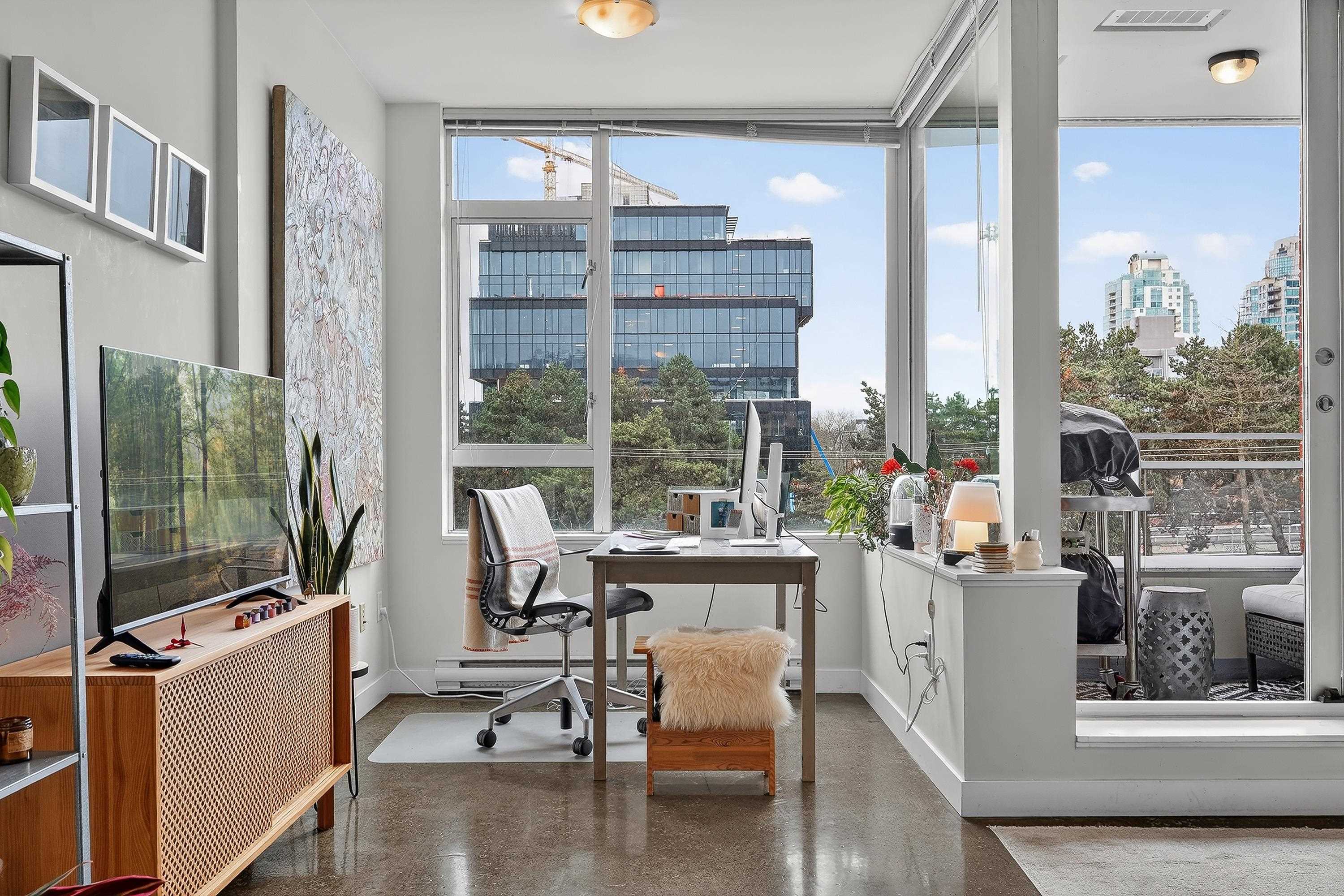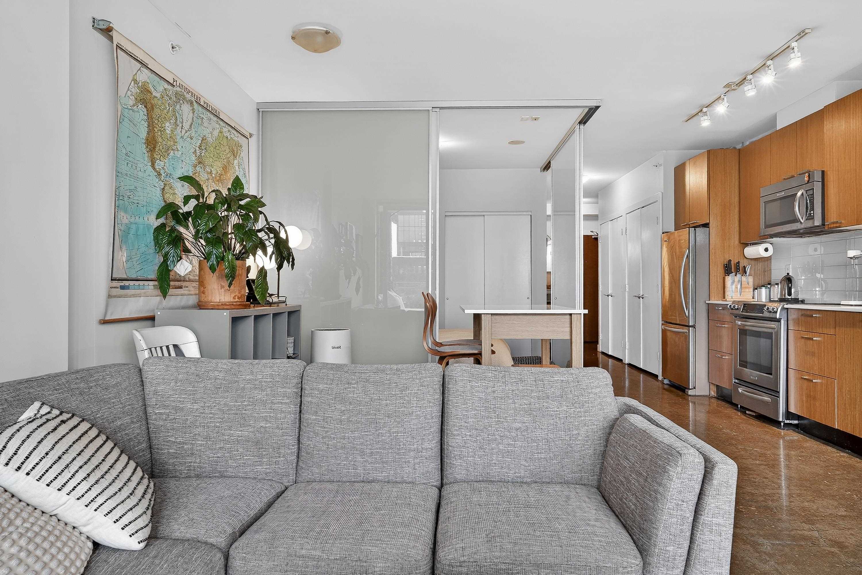 Loft-inspired living in V6A at the heart of Strathcona/False Creek Flats. Sun-soaked S-facing 1 bed with soaring ceilings, oversized windows & an open layout that lives much larger than its 690 sqft. Chef-friendly kitchen w/ quartz counters, s/s appls & smart storage flows into a versatile lounge/dining/WFH zone. Tucked-away bdrm, in-suite laundry, secure parking & locker. Concrete building offers gym, full-time concierge & efficient floorplans. Stroll to cafés, breweries, art studios, the Seawall, SkyTrain...
