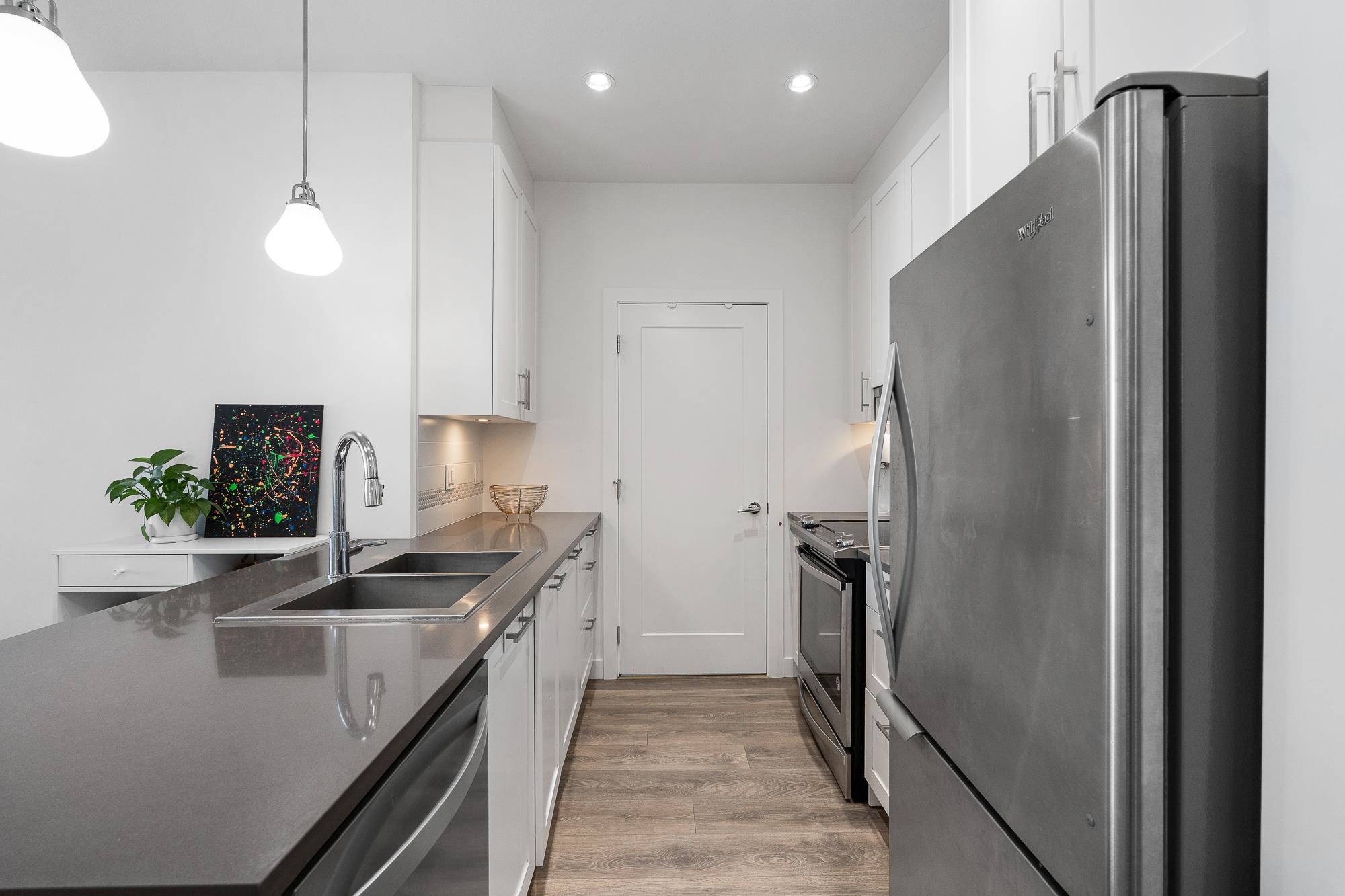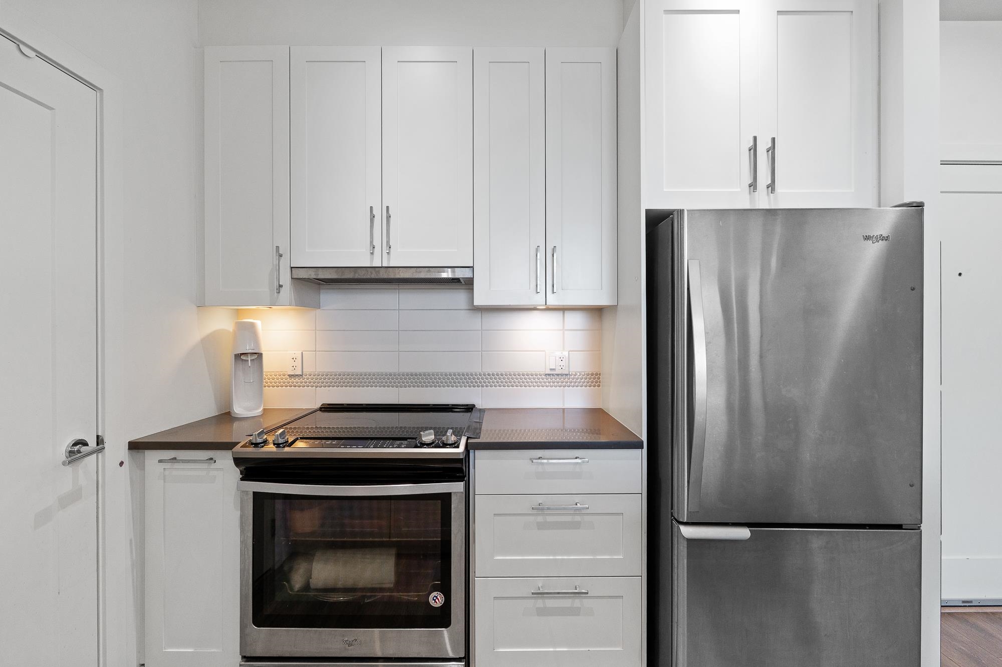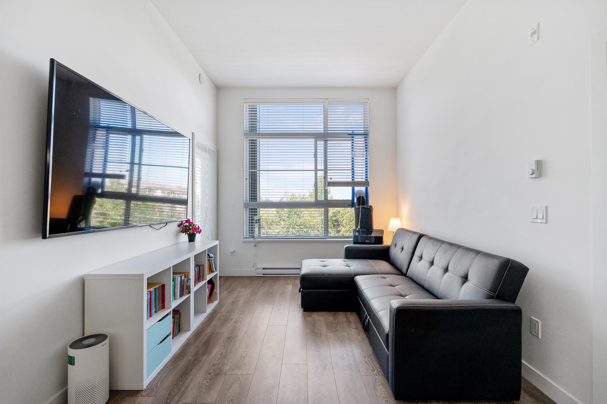 Top floor unit at The WEX! This 2 bed, 2 bath + den home offers a functional layout with modern design. Features a stylish island kitchen with quartz counters, floor-to-ceiling cabinets & S/S appliances, spacious living/dining area—ideal for entertaining. Large primary bedroom with walk-in shower. 1 parking and 1 storage locker included. Steps to Willoughby Town Centre, transit, parks & shops.