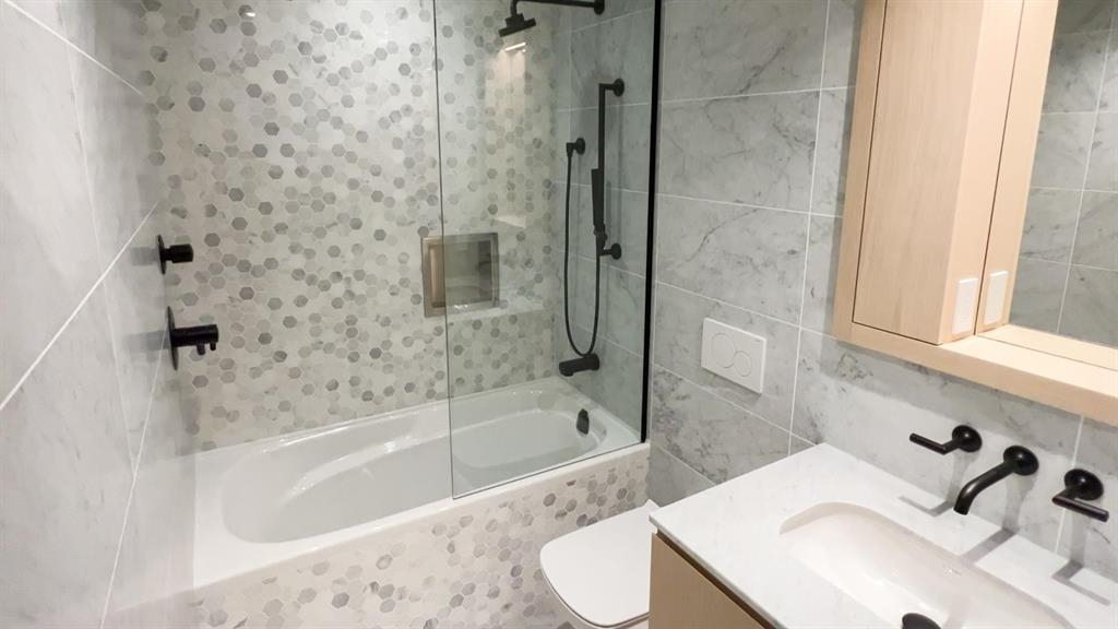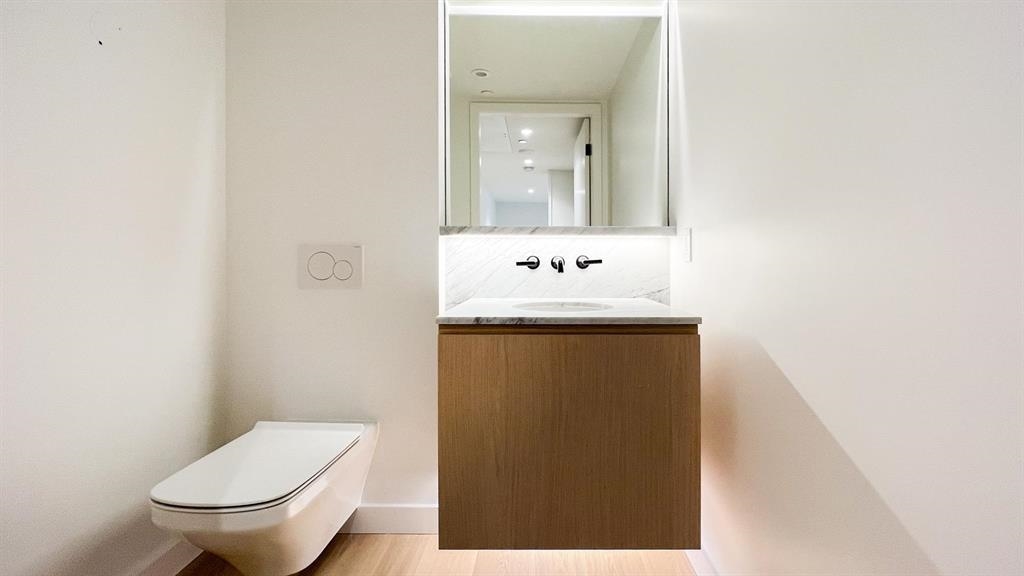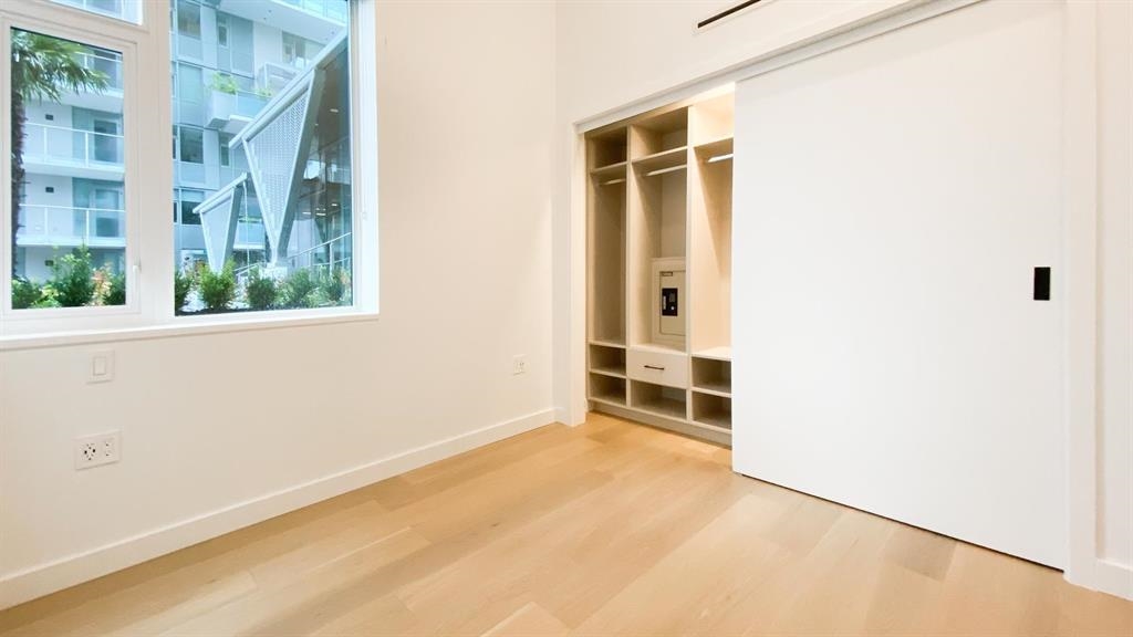 Mirabel by Marcon, rare 1 bedroom floor plan with 1 full bath ensuite + powder room. Feature 13'3" extra high ceiling, make the unit more spacious with lots of natural light. Patio opens to roof garden. It features high-end appliances, quartz counter tops, built-in safe, geothermal heating & A/C, exercise room, outdoor playground and roof garden. Walking distances to water front, restaurants, shopping, parks and more. No Parking, One storage locker.