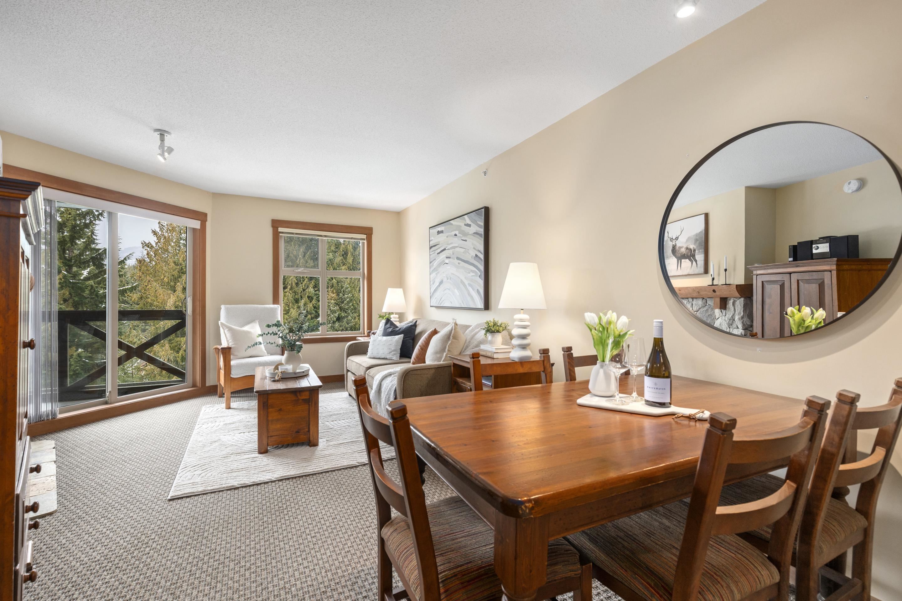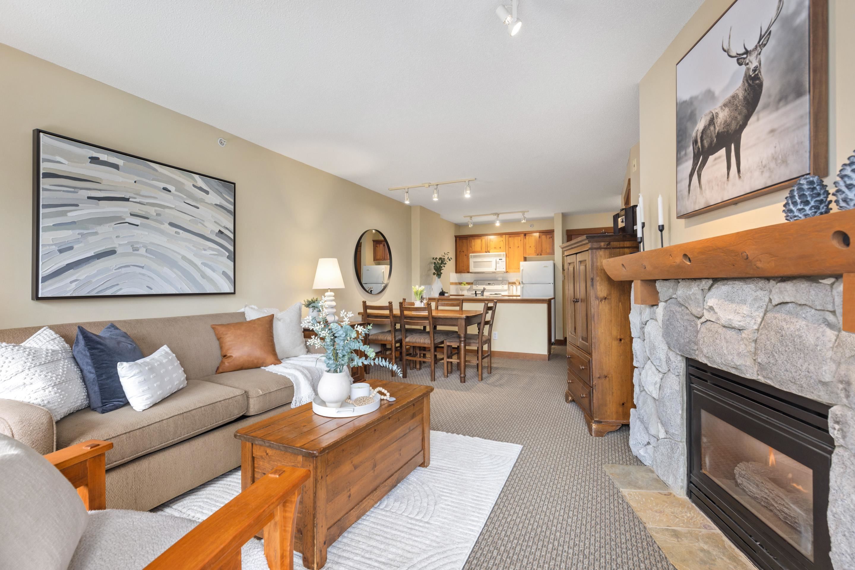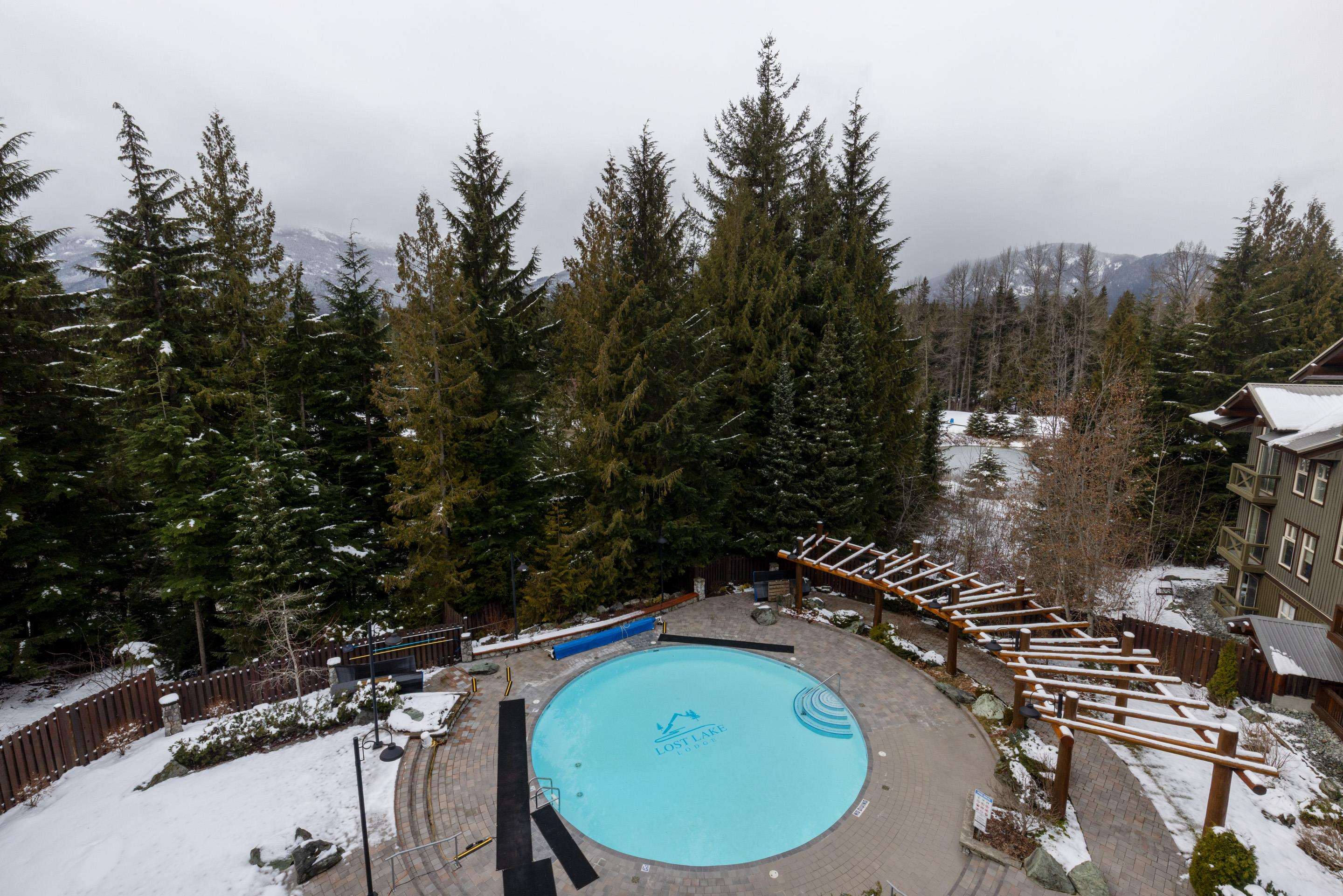 Experience the ultimate alpine lifestyle in this immaculate top-floor retreat at Lost Lake Lodge. This 560 sq. ft. 1-bedroom, 1-bathroom residence offers a bright and airy atmosphere. The open-concept living area features a cozy gas fireplace, perfect for relaxing after a day of mountain adventures. Step out onto your private balcony to enjoy serene views overlooking the year-round heated pool and hot tub, framed by mountain views. Located in the prestigious Benchlands, you are steps from Lost Lake trails a...
