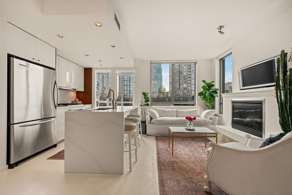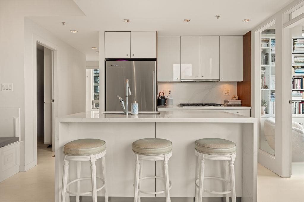 Experience refined coastal living at Alvar, in sought-after BEACH DISTRICT! This beautifully renovated 1 BED + DEN home offers an elegant, open-concept layout in one of the BEST BUILDINGS in the area. Expansive windows flood the space with natural light, complementing the airy 9-foot ceilings and the sophisticated white interior feels warm, welcoming & effortlessly timeless! Storage is abundant with a huge pantry and storage locker. The den/office with built-ins creates the perfect work-from-home retreat. C...