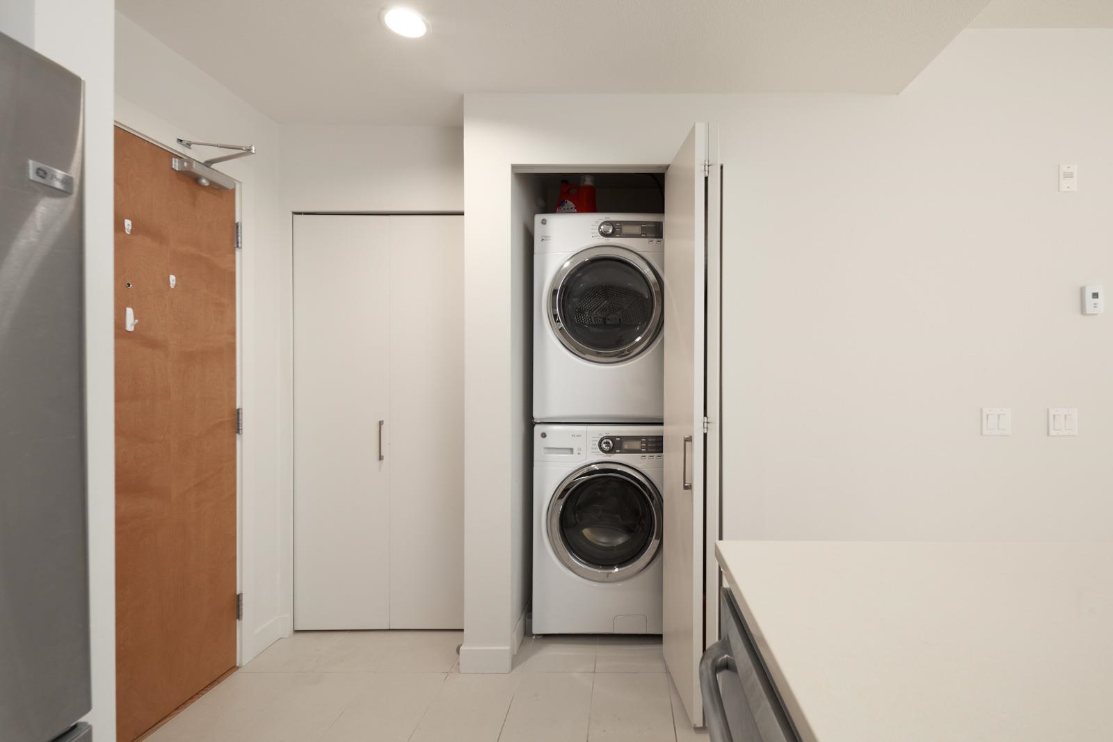 Welcome home to Sail, situated in the highly sought-after Wesbrook Village area of UBC. This semi-furnished condo features an open-concept floor plan, laminate flooring throughout, over-height ceilings, and floor-to-ceiling windows that flood the home with natural light and fresh air. Step out onto the spacious balcony to enjoy views of the interior garden and courtyard. The contemporary kitchen features European-style cabinetry, quartz countertops, stainless steel appliances, and a spacious peninsula with ...