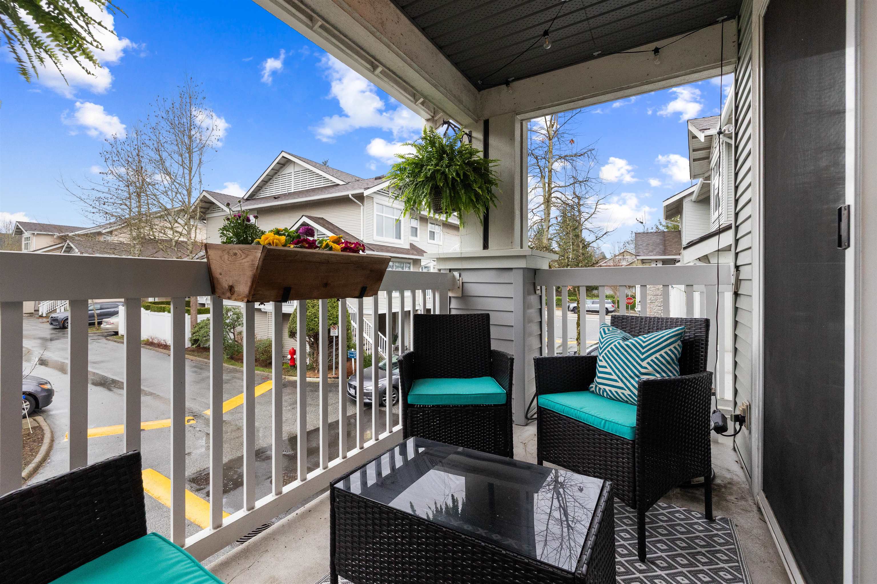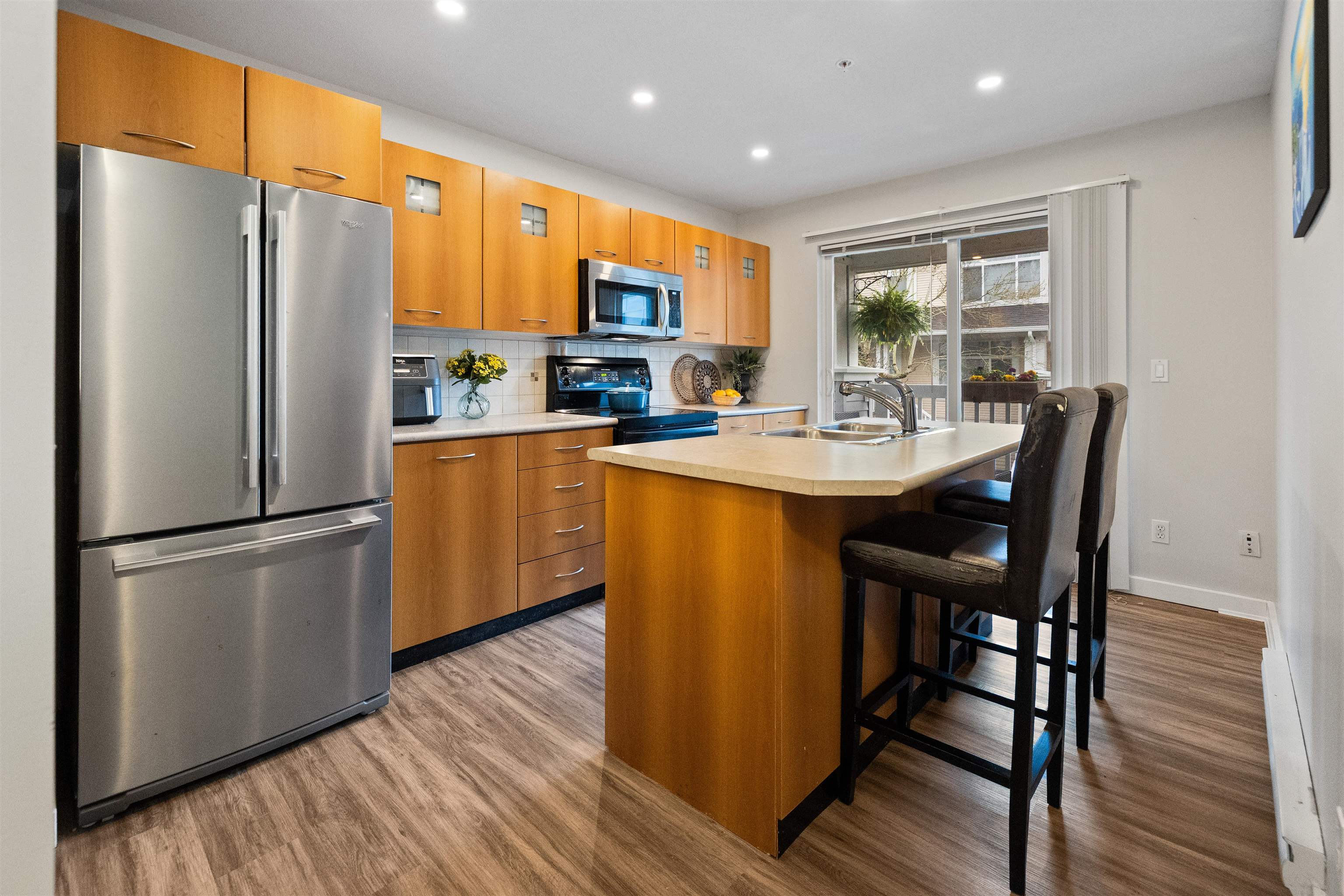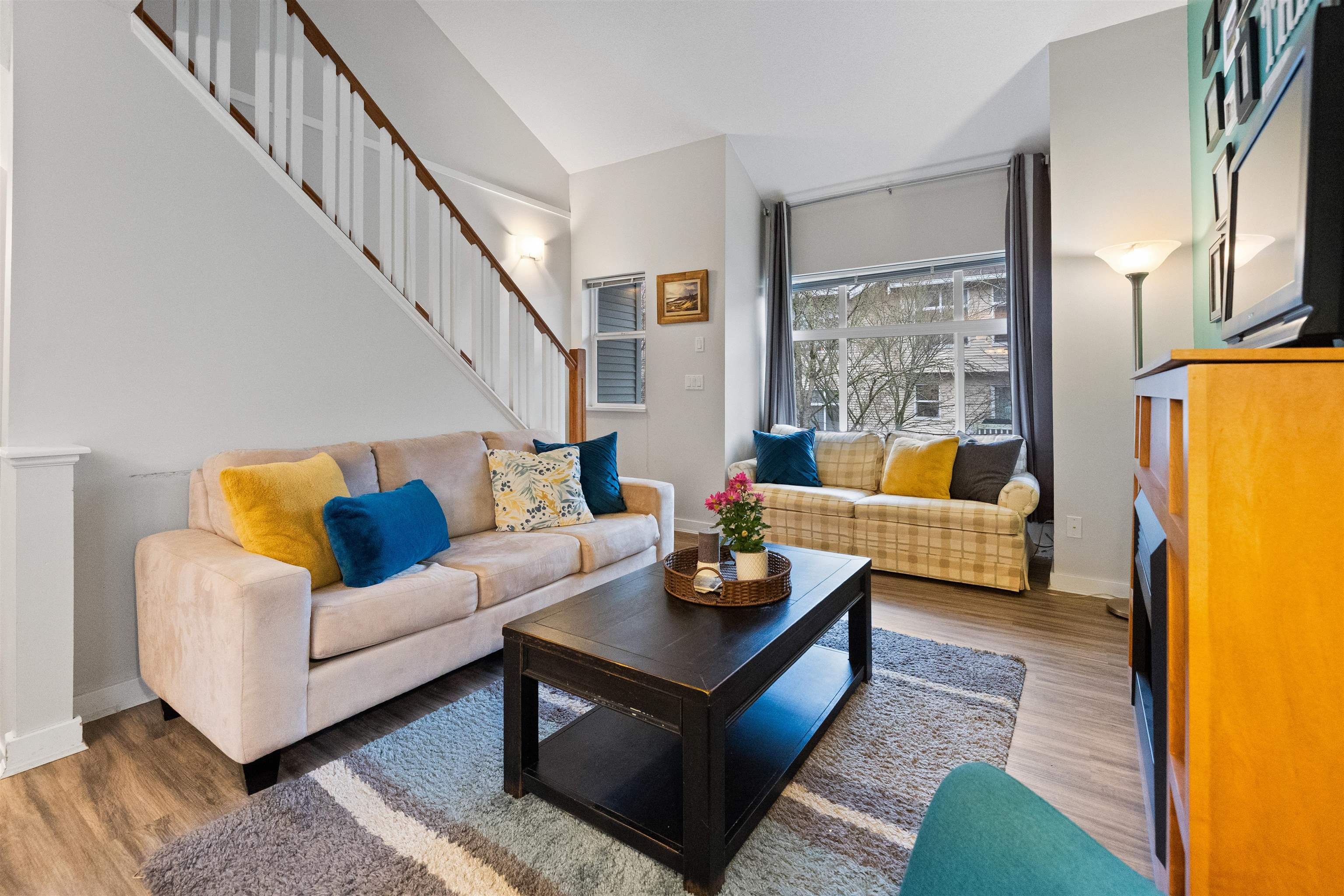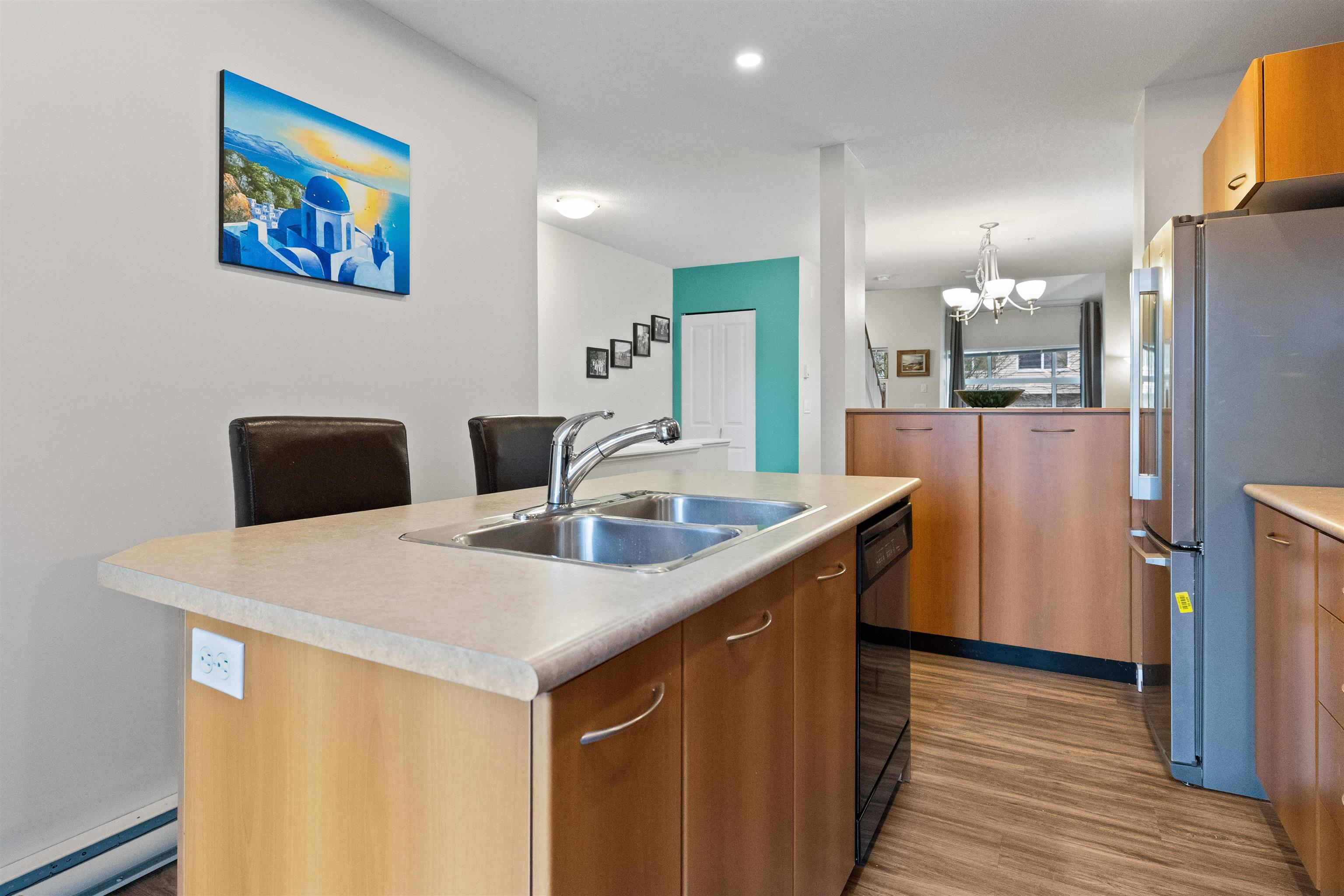 Welcome to this bright and spacious end-unit townhome in the highly sought-after Denim community! This 2-bedroom home features vaulted ceilings in the living room and bedrooms, surround sound speakers, designer paint tones, and laminate flooring. The large kitchen offers ample cabinetry, a generous island, and access to a covered balcony—perfect for entertaining. Enjoy a sunny south-facing patio and fully fenced yard. Conveniently located near schools, with shopping, amenities, transit, and quick Highway #1...
