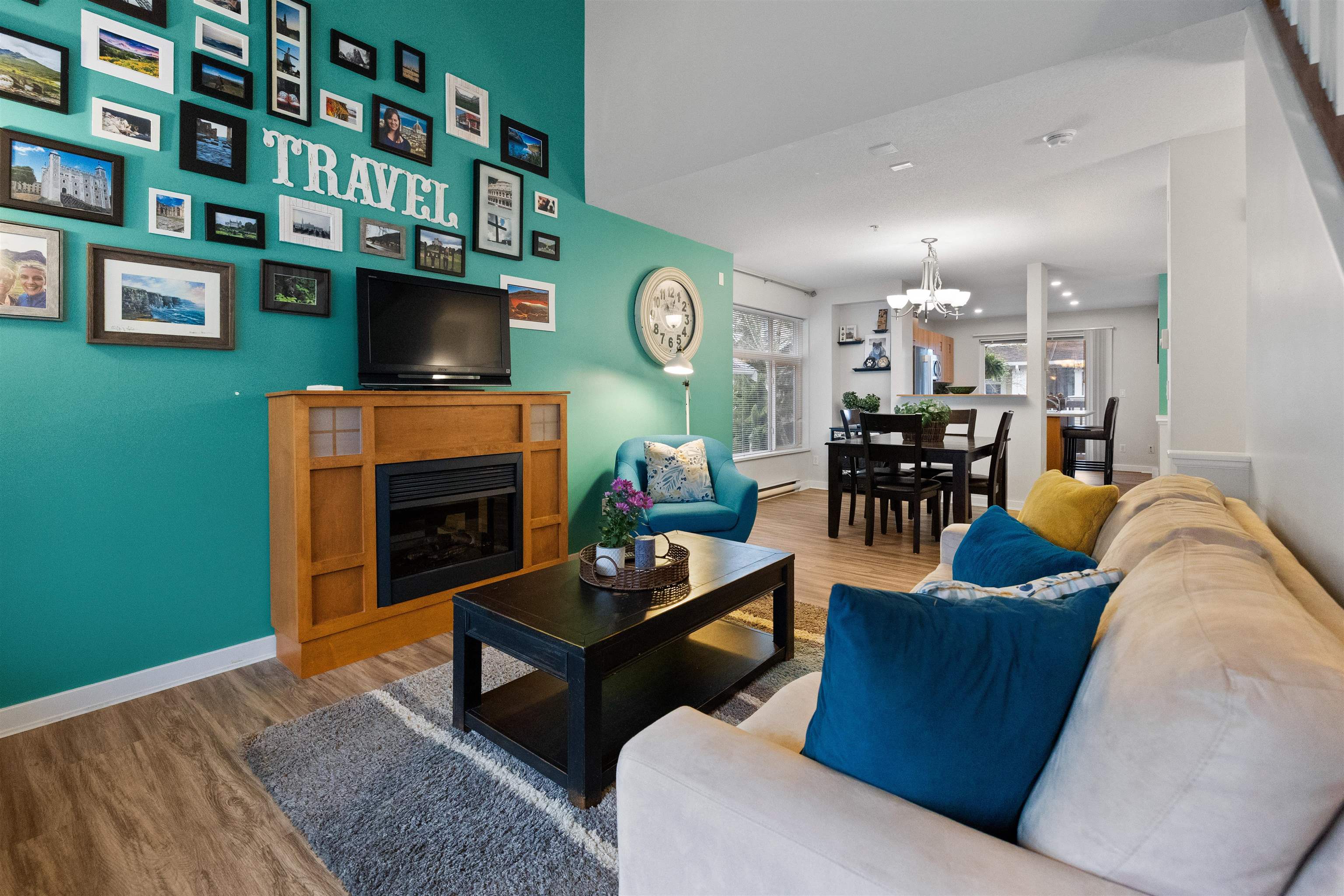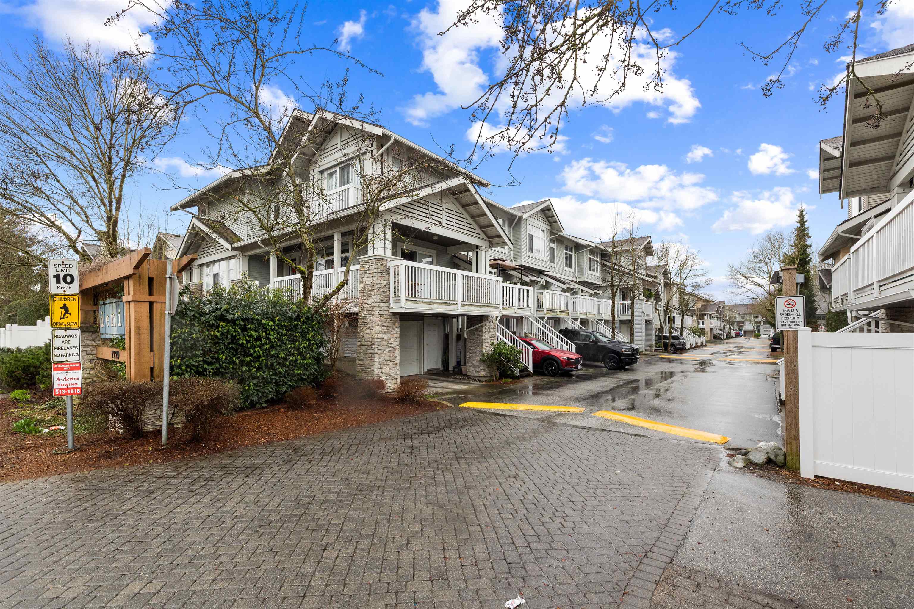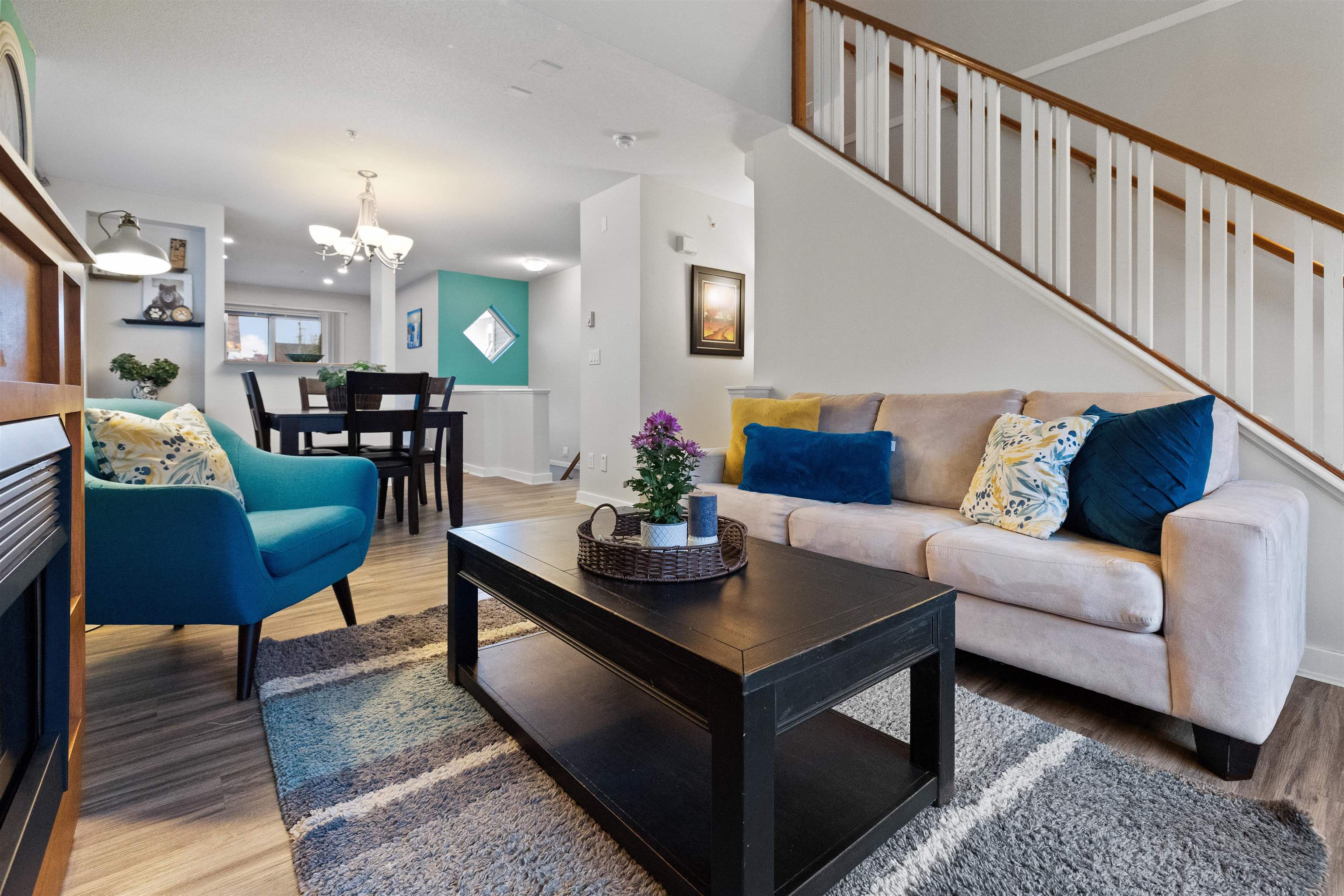 Welcome to this bright and spacious end-unit townhome in the highly sought-after Denim community! This 2-bedroom home features vaulted ceilings in the living room and bedrooms, surround sound speakers, designer paint tones, and laminate flooring. The large kitchen offers ample cabinetry, a generous island, and access to a covered balcony—perfect for entertaining. Enjoy a sunny south-facing patio and fully fenced yard. Conveniently located near schools, with shopping, amenities, transit, and quick Highway #1...