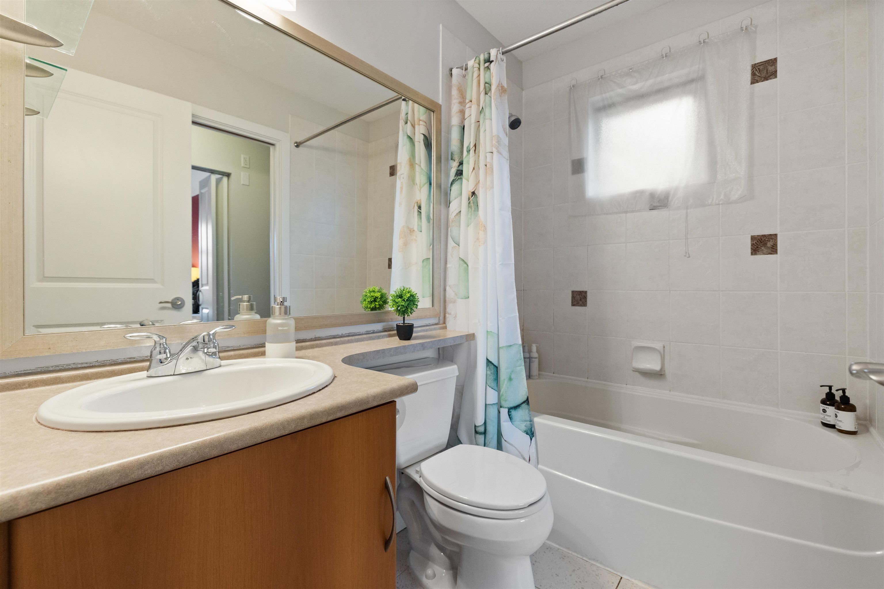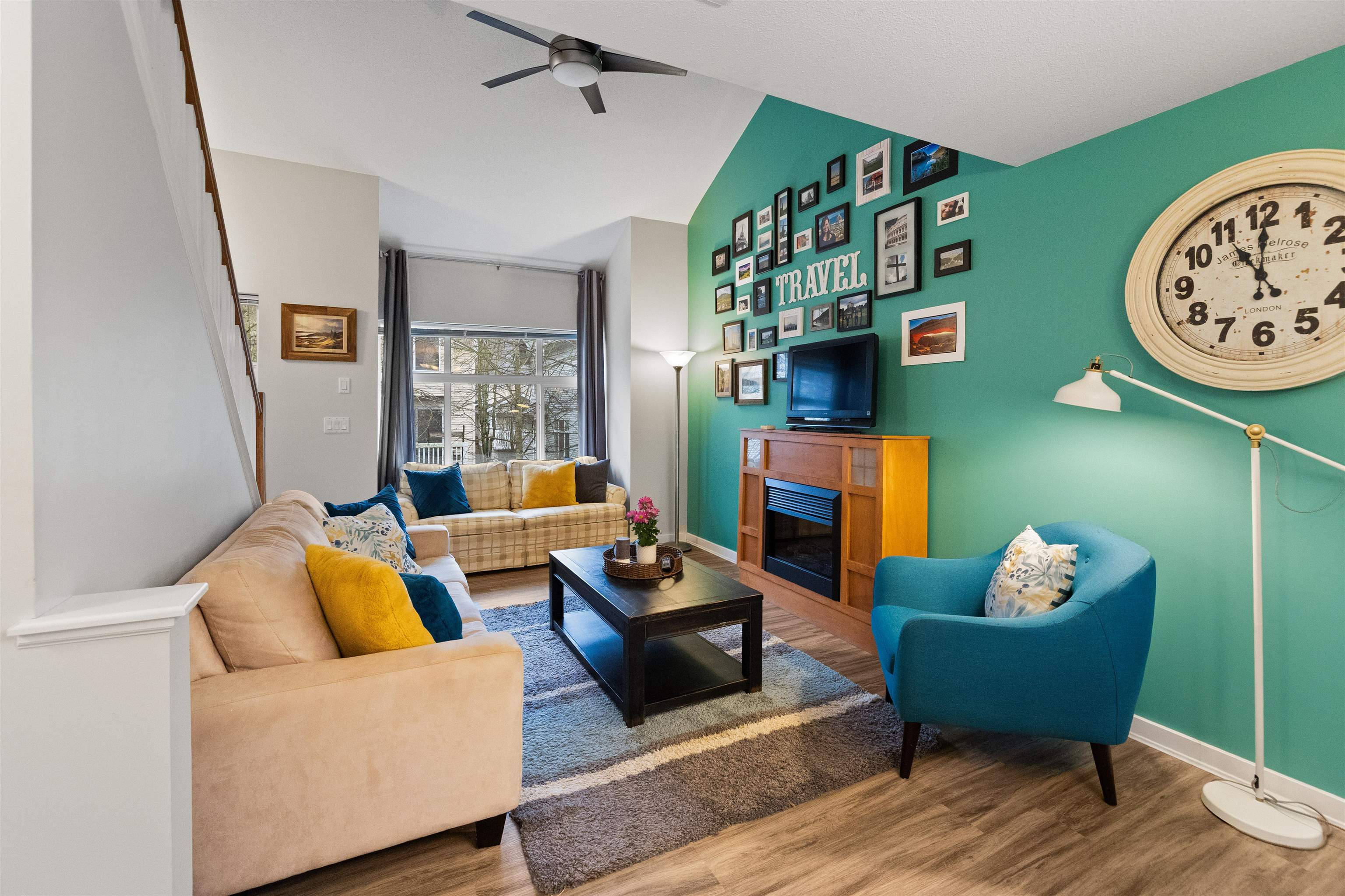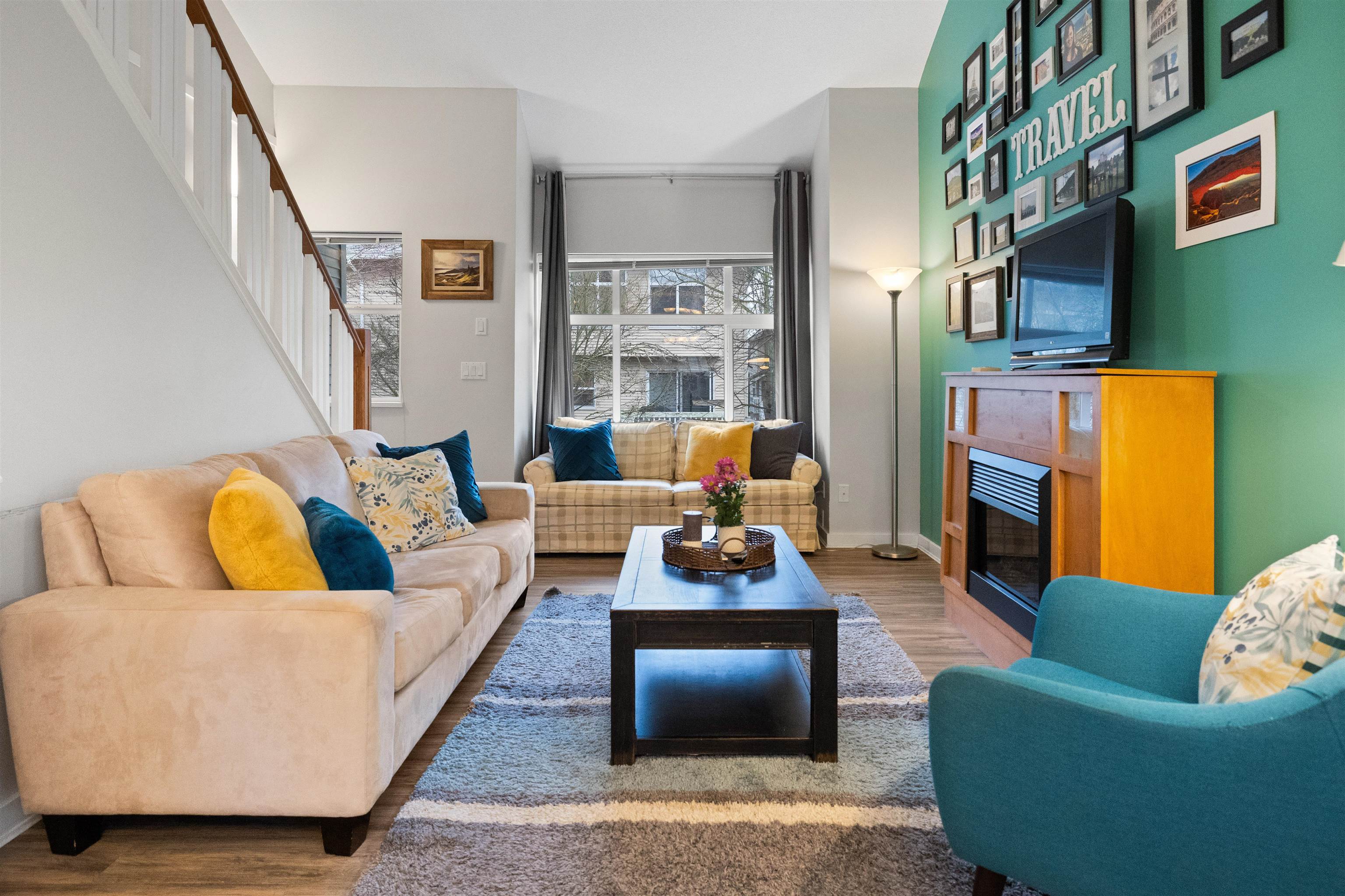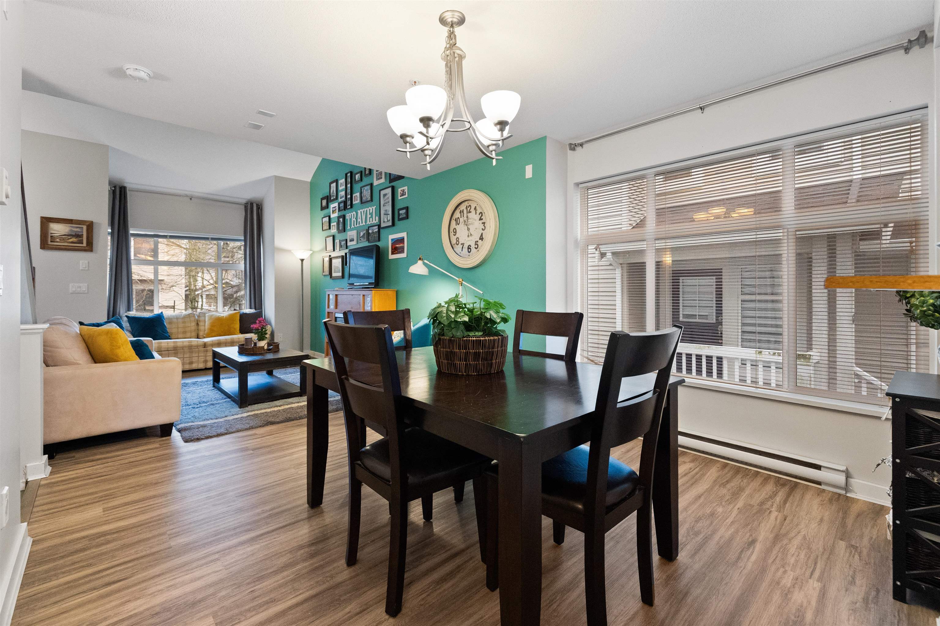 Welcome to this bright and spacious end-unit townhome in the highly sought-after Denim community! This 2-bedroom home features vaulted ceilings in the living room and bedrooms, surround sound speakers, designer paint tones, and laminate flooring. The large kitchen offers ample cabinetry, a generous island, and access to a covered balcony—perfect for entertaining. Enjoy a sunny south-facing patio and fully fenced yard. Conveniently located near schools, with shopping, amenities, transit, and quick Highway #1...