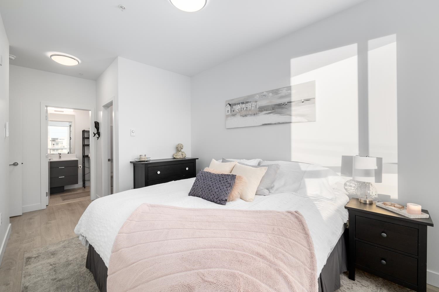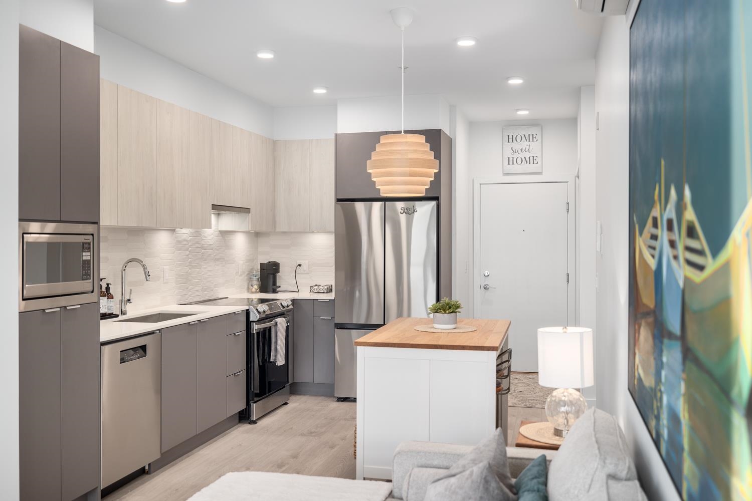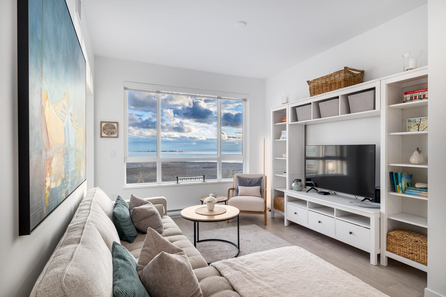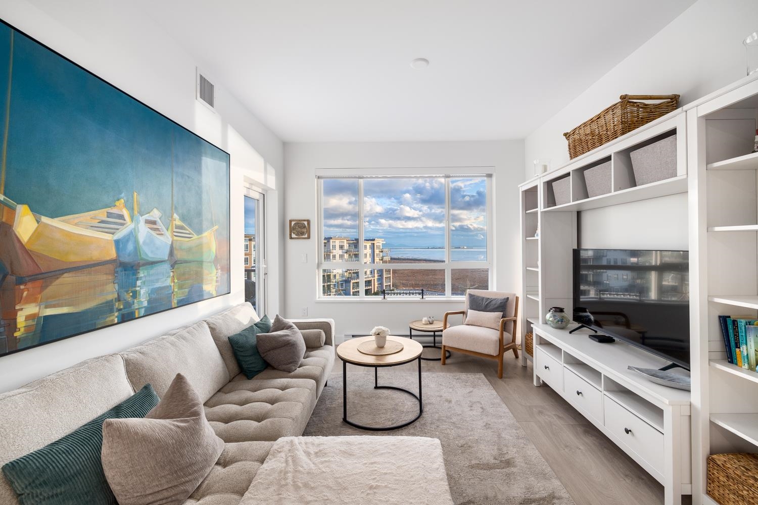 Experience unparalleled luxury and breathtaking, unobstructed ocean views in this barely lived-in penthouse at Salt & Meadow I in Tsawwassen's coveted Seaside Community, Boardwalk. This stunning 2 bed, w/NO GST, boasts soaring ceilings, A/C, stylish roller blinds, and elegant natural laminate flooring. Indulge in the luxury of stunning sunsets from your generous patio, while taking in the panoramic view of both Vancouver and Gulf Islands- truly a mesmerizing backdrop. The open-concept living area seamlessly...