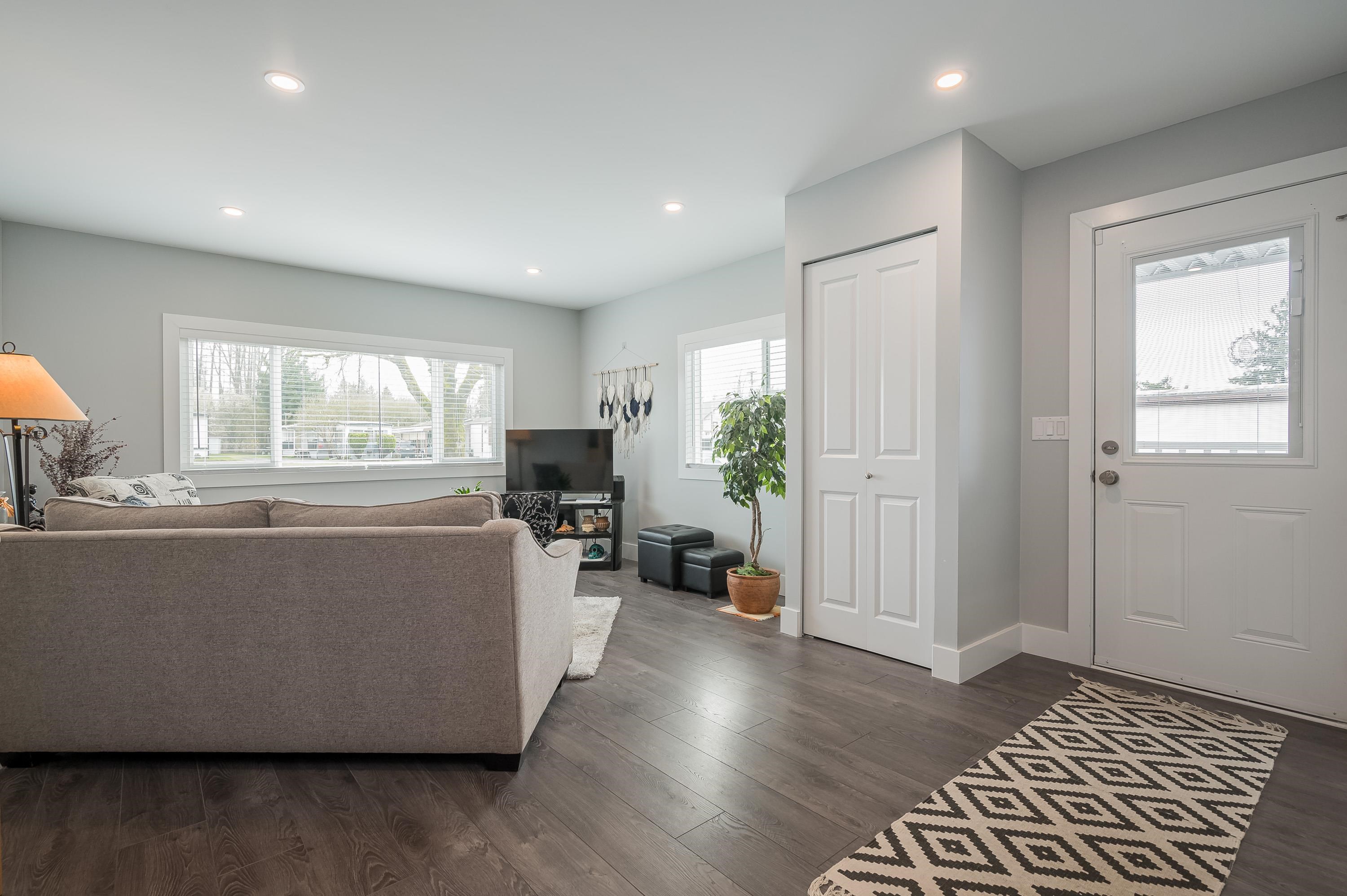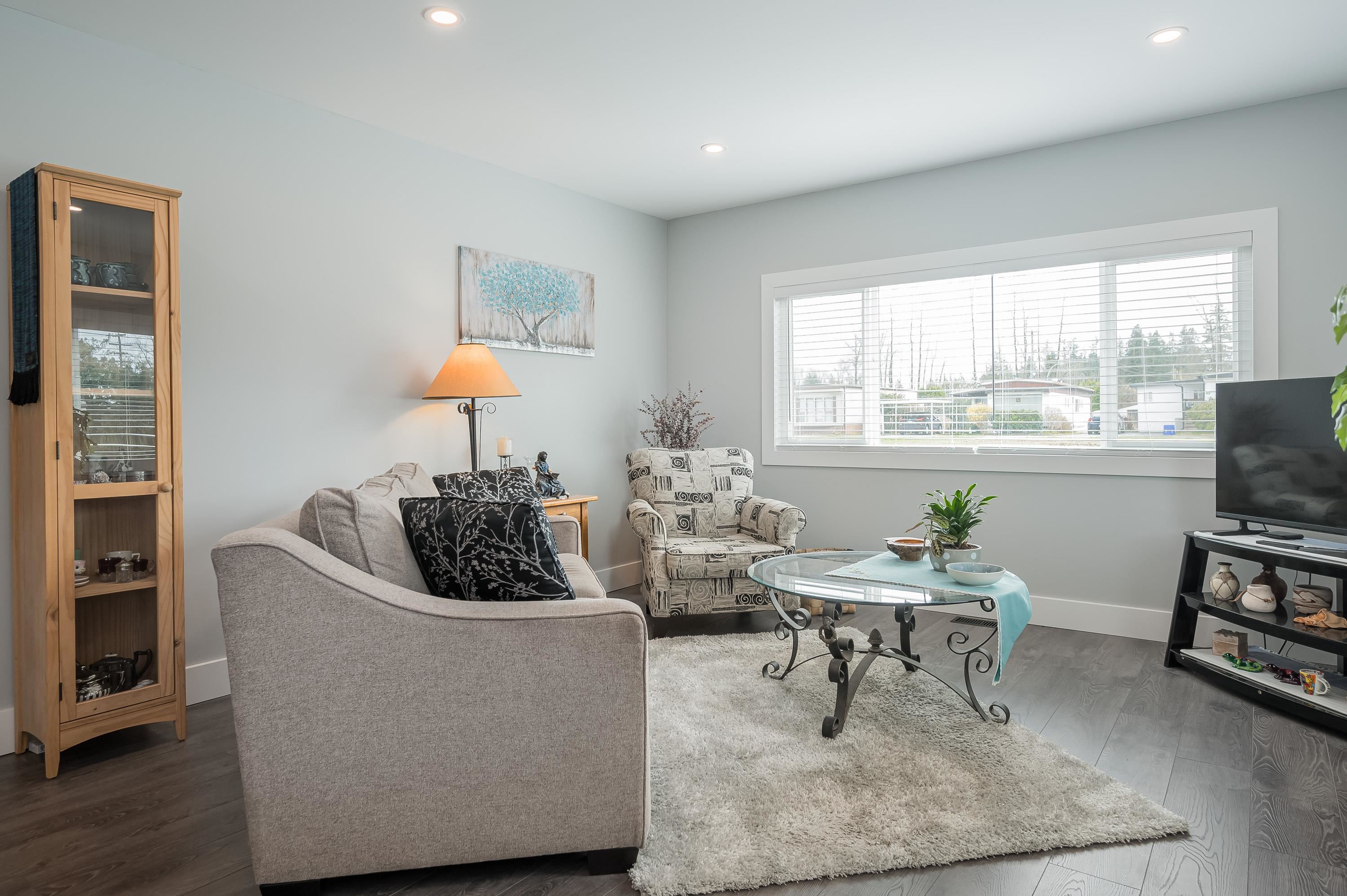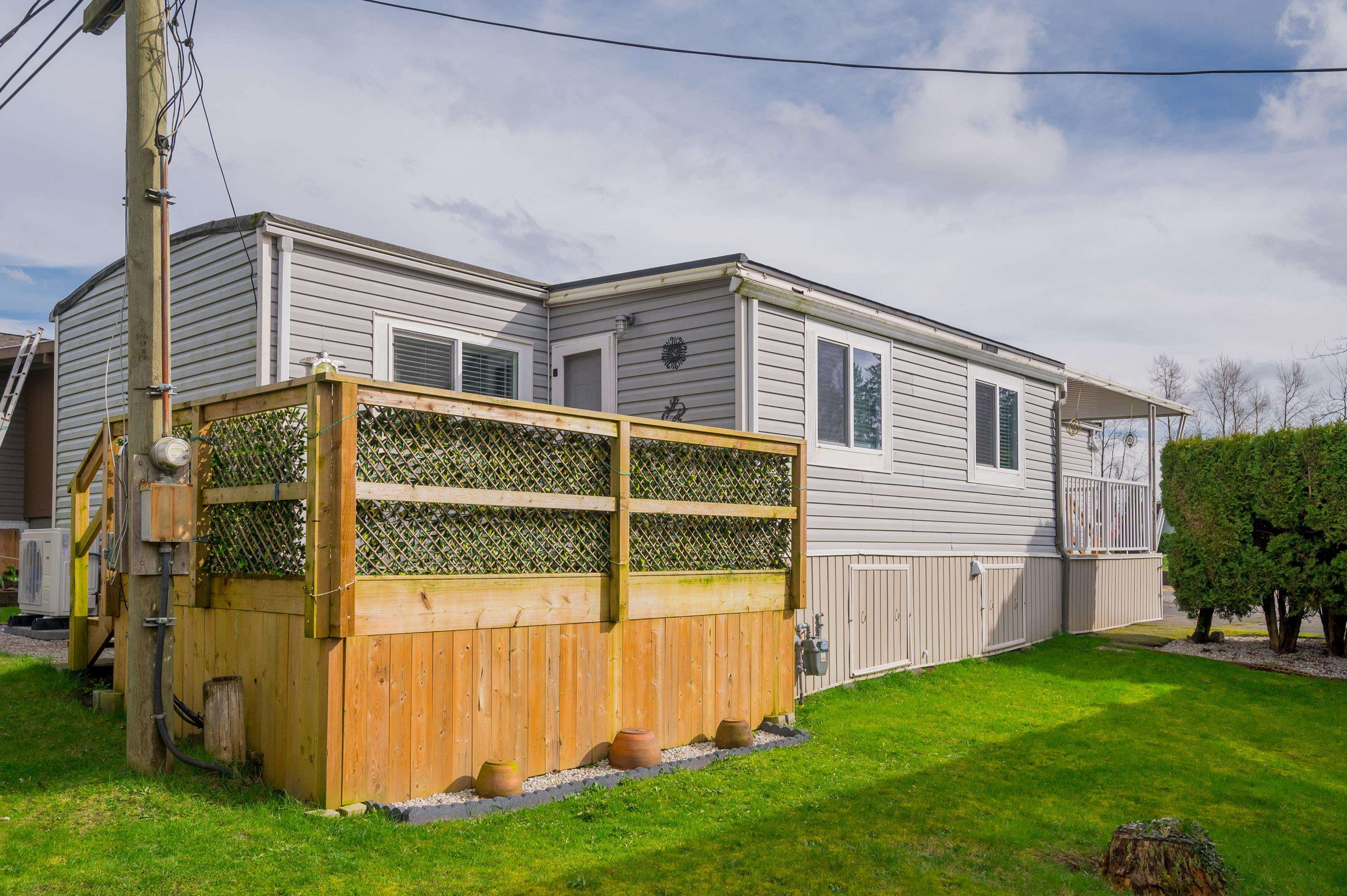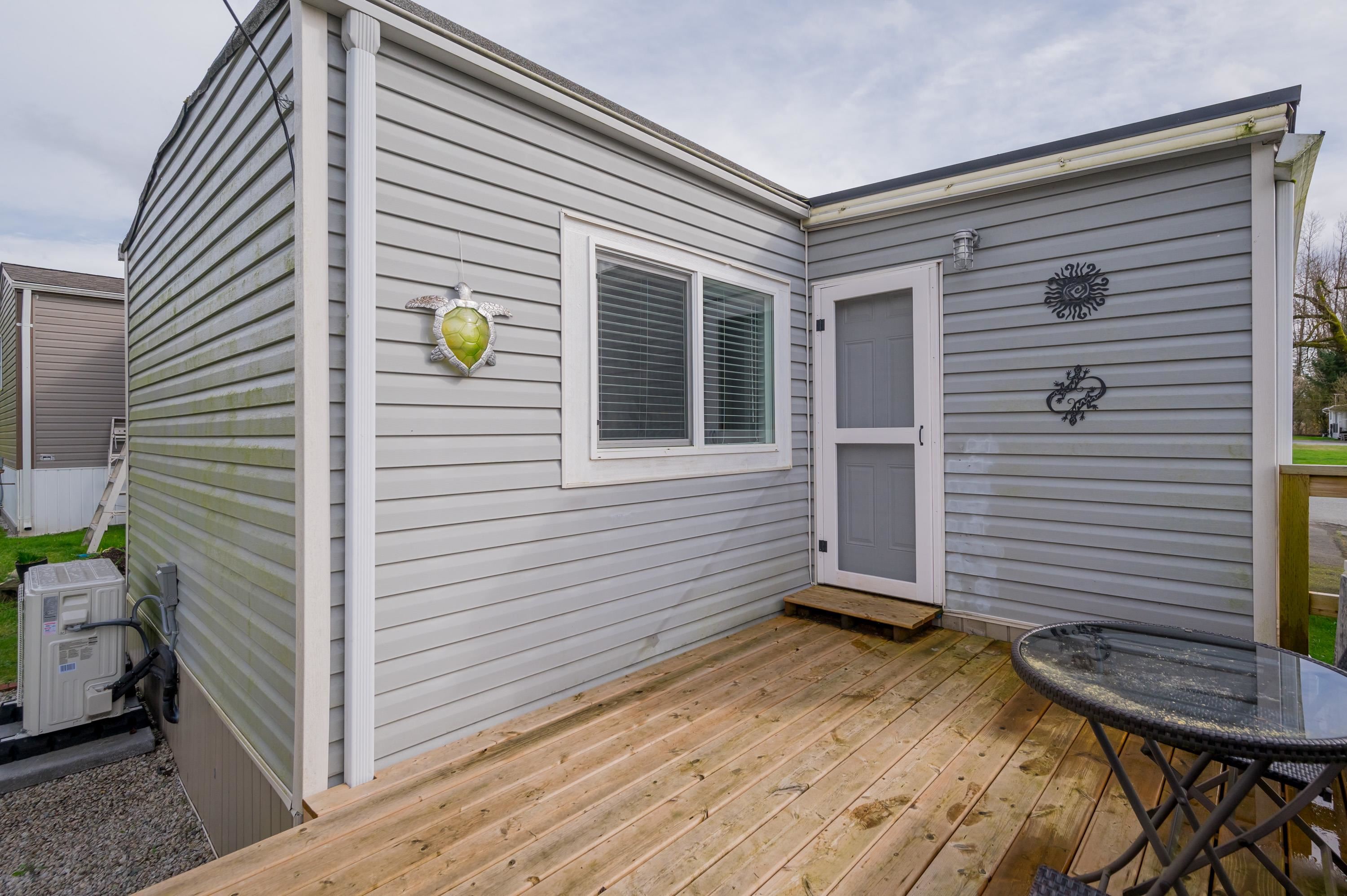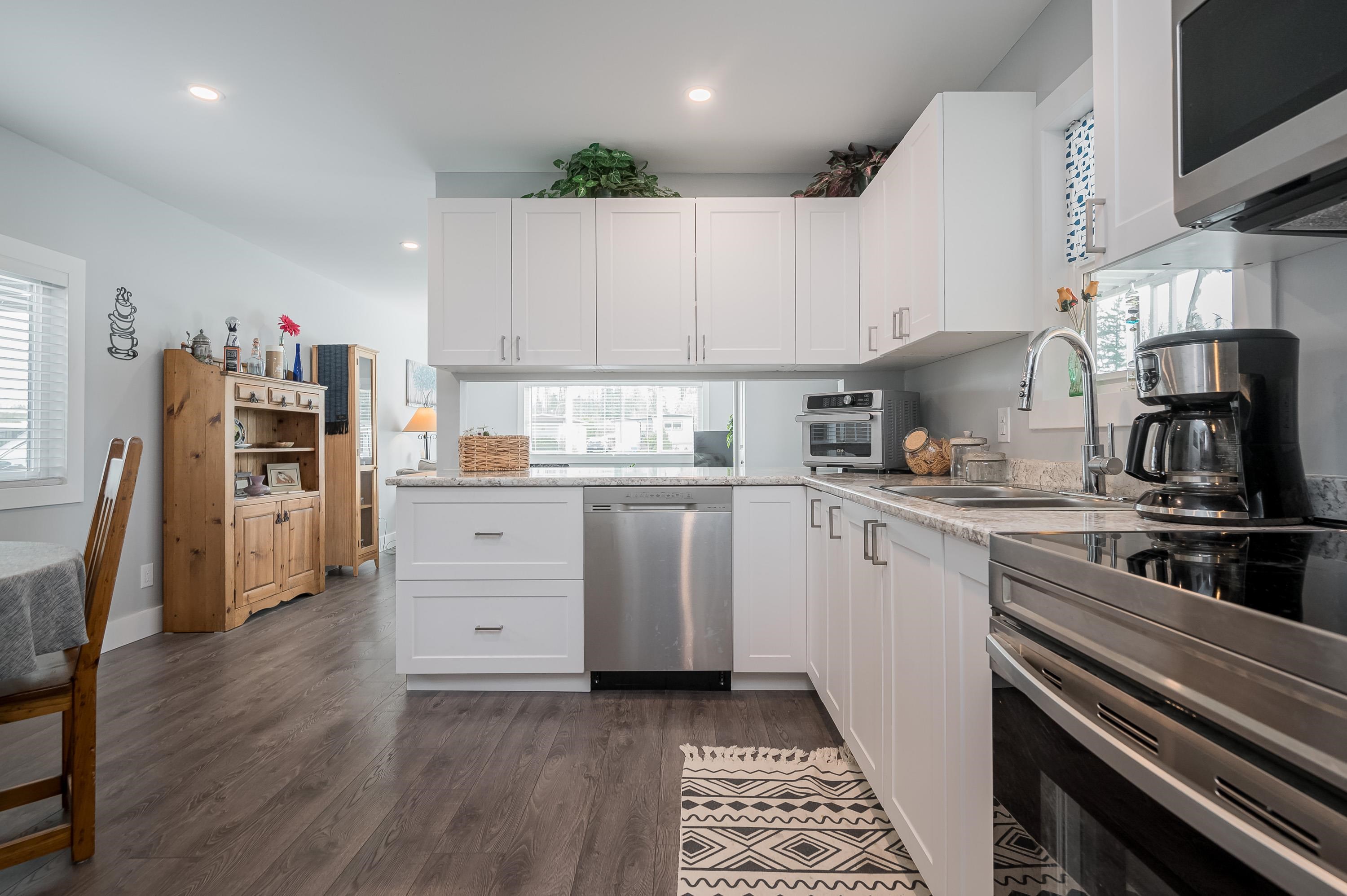Step into this freshly renovated and bright 14' single-wide manufactured home, offering 2 Bedrooms /1 Bathroom with spacious walk-in shower. There's a versatile Flex Room for a 3rd Bedroom, Den or Office. This home boasts all-new features, including; kitchen, bathroom, laminate flooring, doors, pot lights, windows & New HP and air conditioning. Enjoy cooking with new S/S Appliances. Fantastic outdoor space w/covered front deck and new back deck with steps leading to back & side yard with privacy cedar tree...