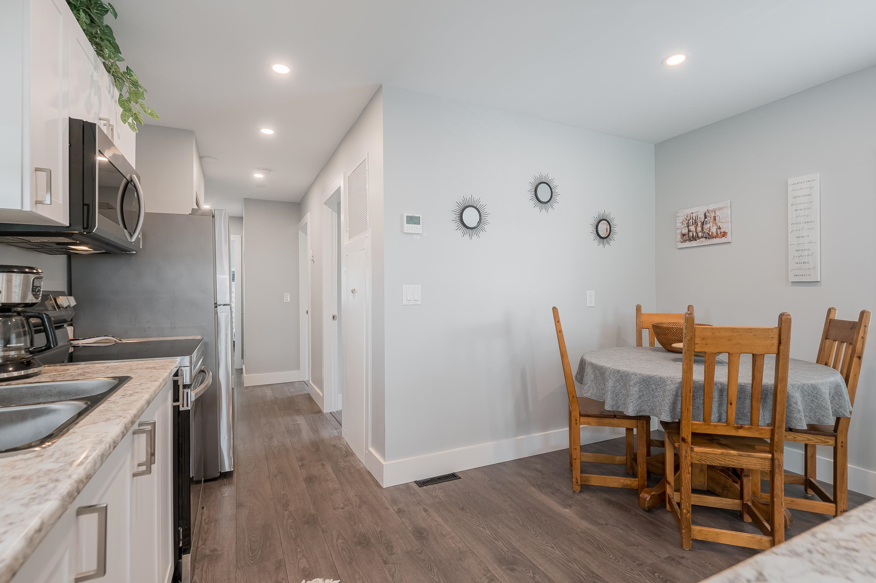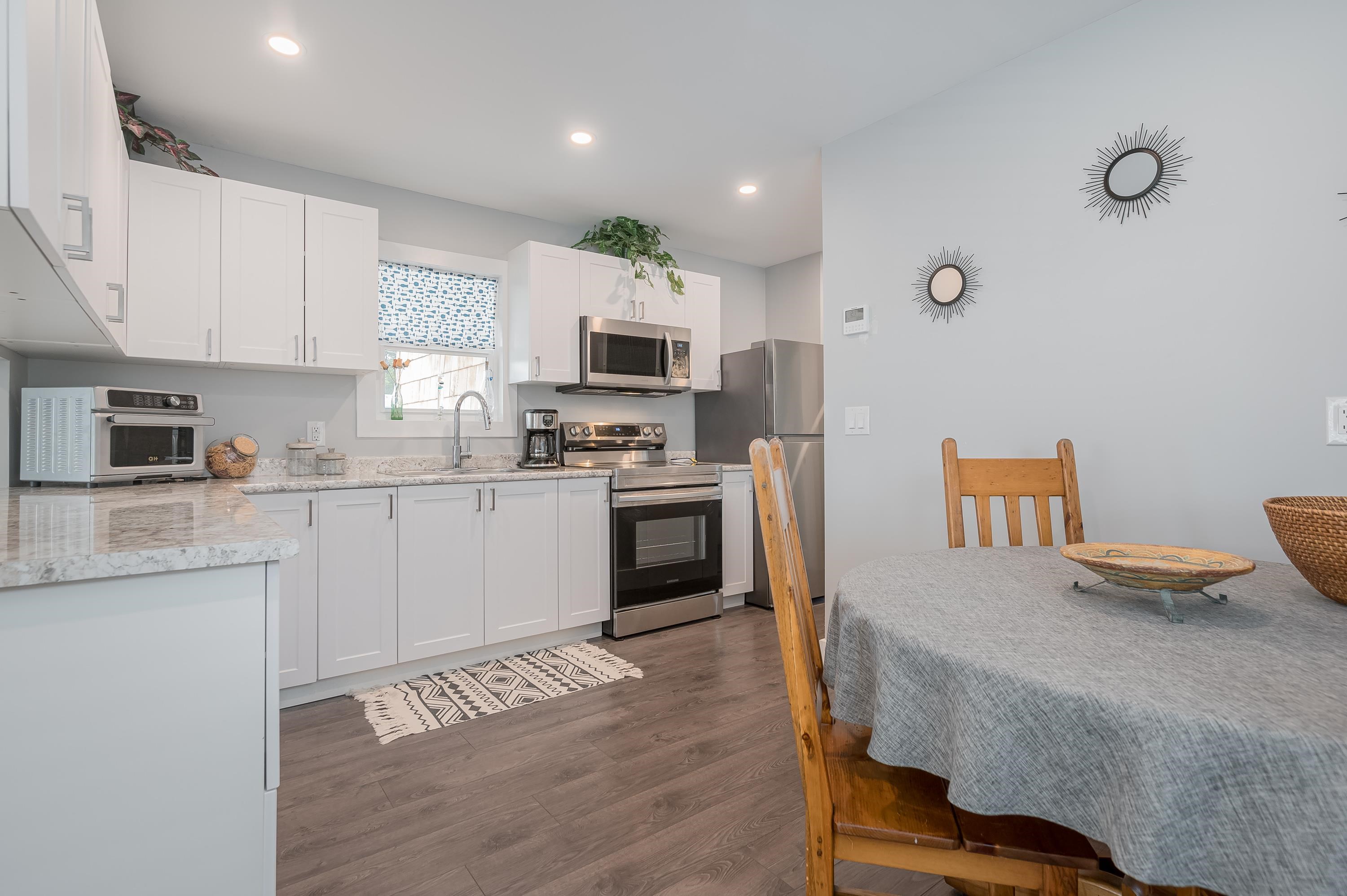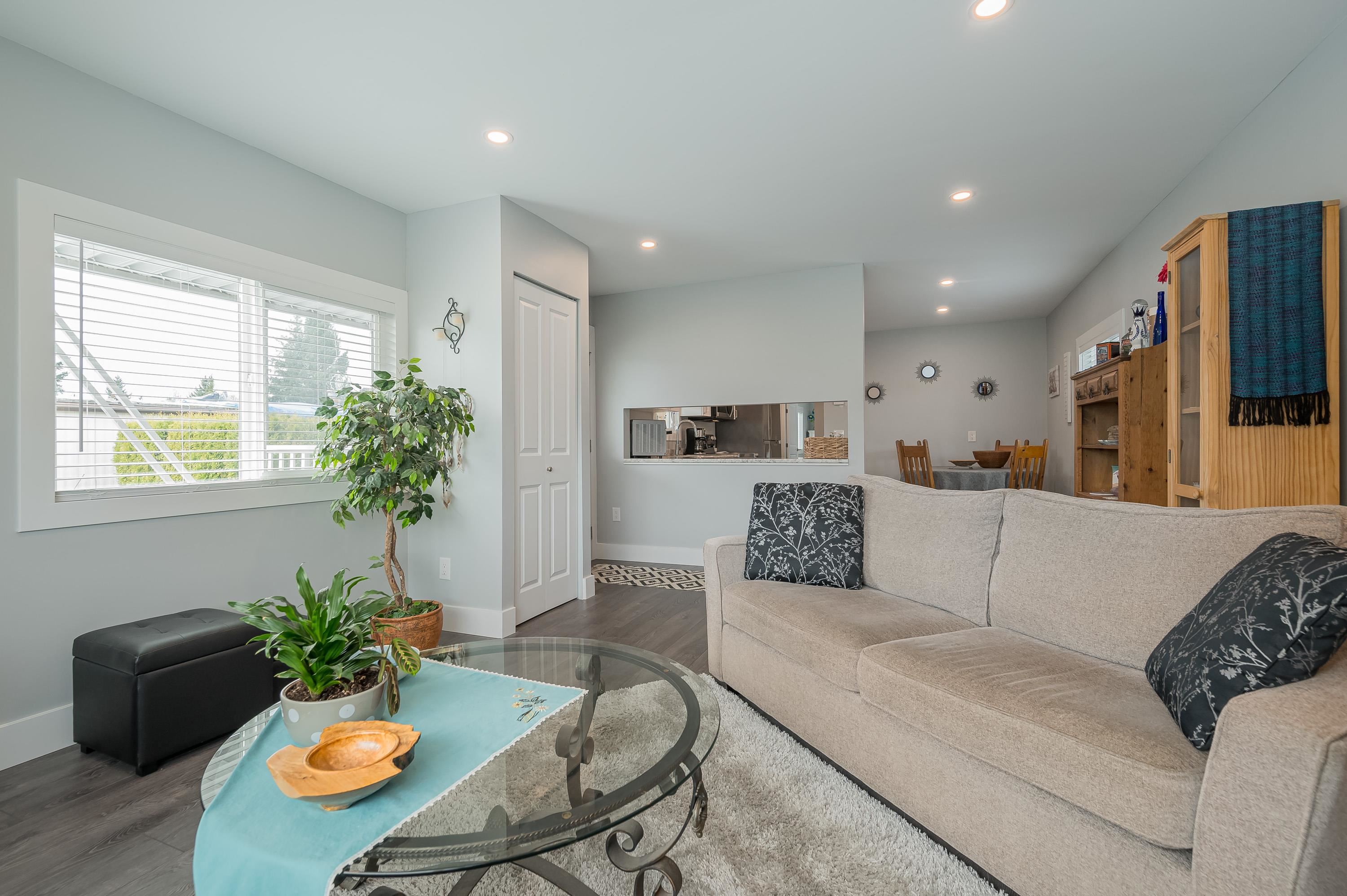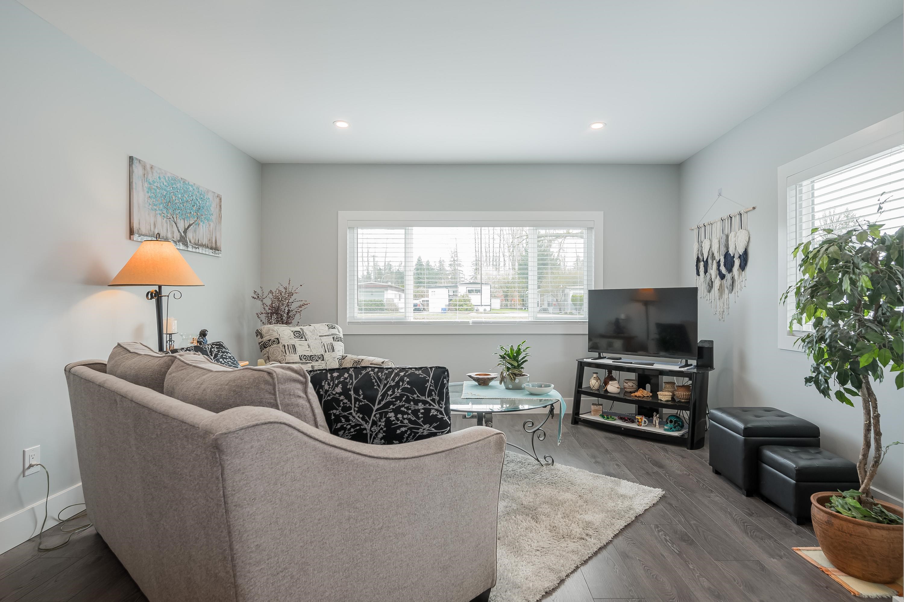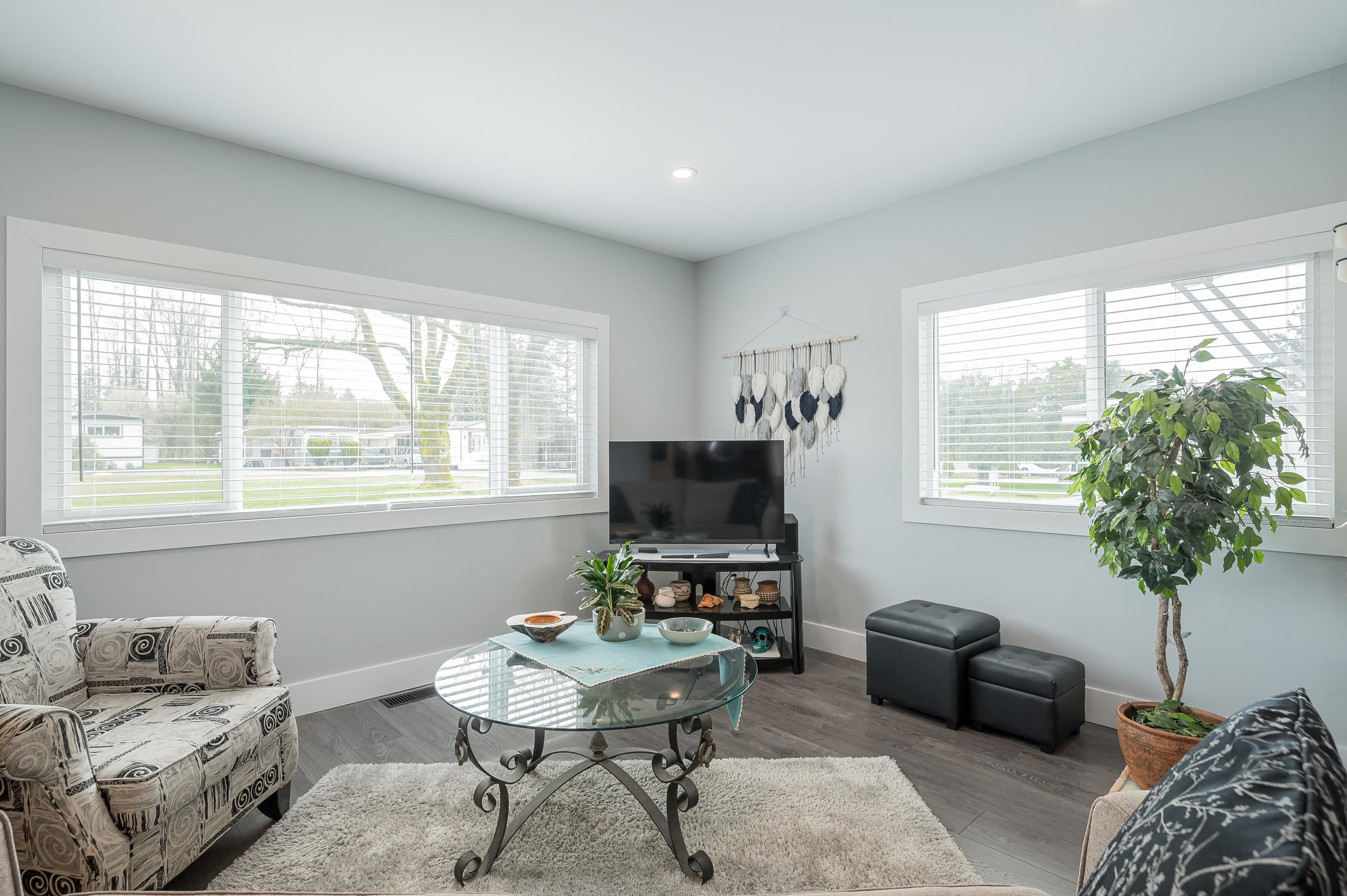 Step into this freshly renovated and bright 14' single-wide manufactured home, offering 2 Bedrooms /1 Bathroom with spacious walk-in shower. There's a versatile Flex Room for a 3rd Bedroom, Den or Office. This home boasts all-new features, including; kitchen, bathroom, laminate flooring, doors, pot lights, windows & New HP and air conditioning. Enjoy cooking with new S/S Appliances. Fantastic outdoor space w/covered front deck and new back deck with steps leading to back & side yard with privacy cedar tree...