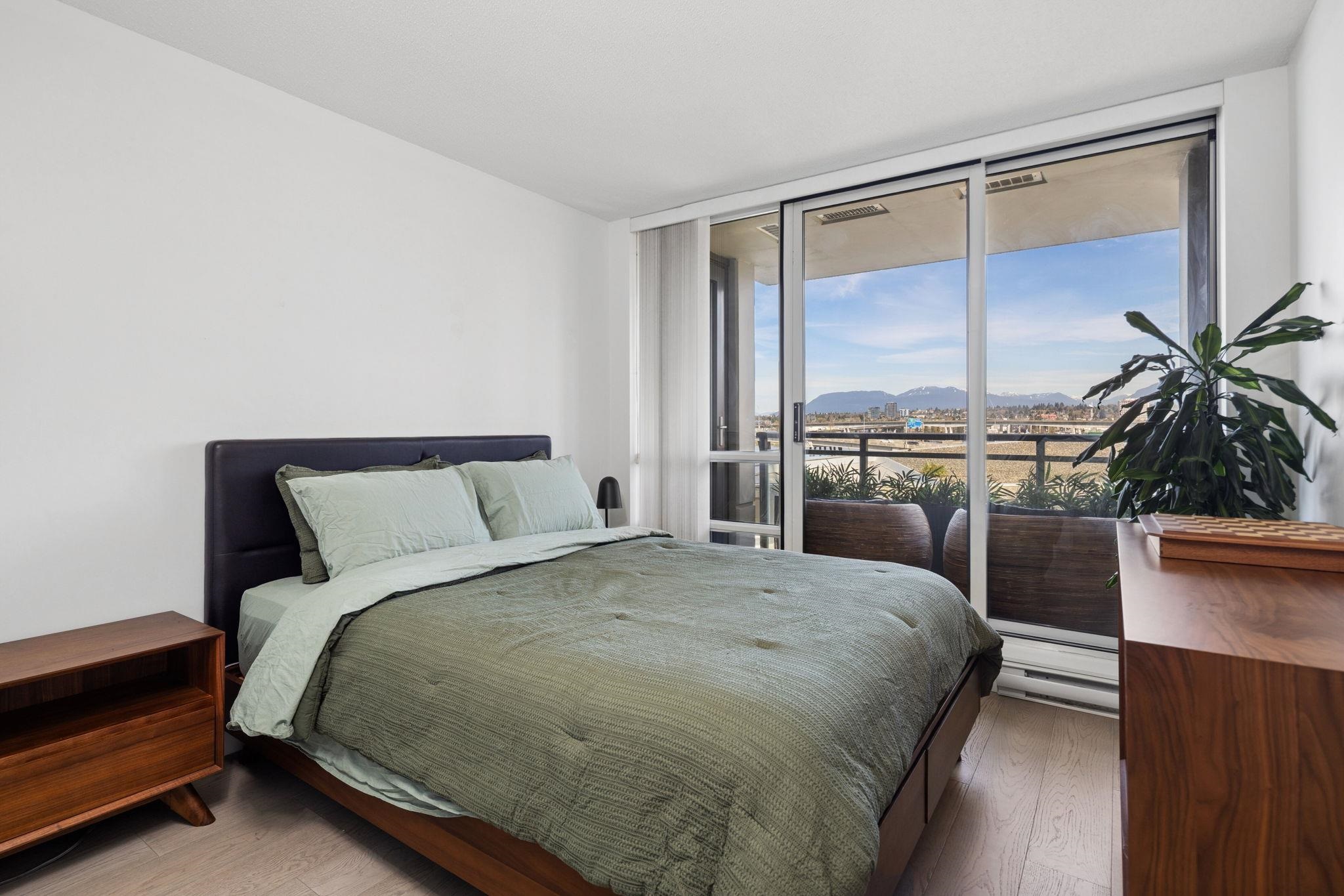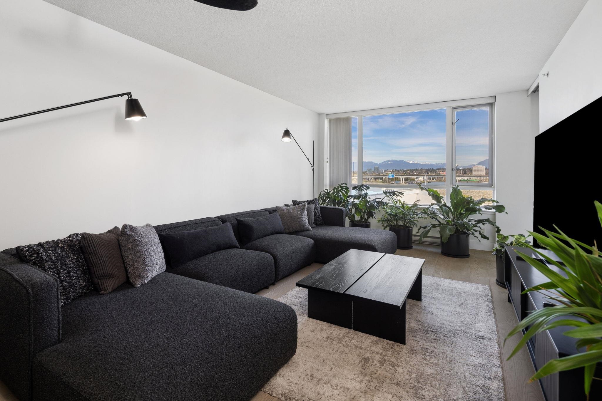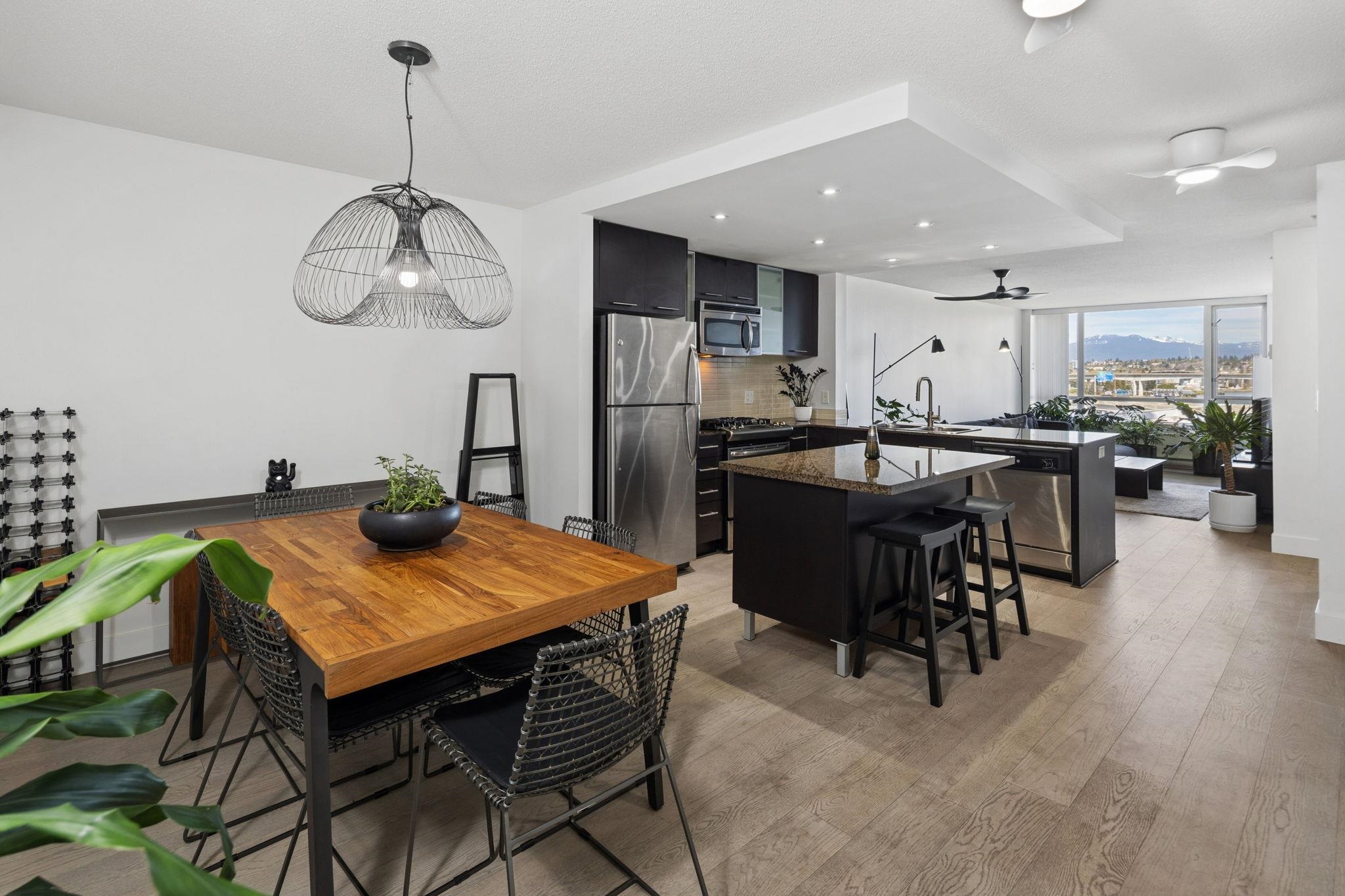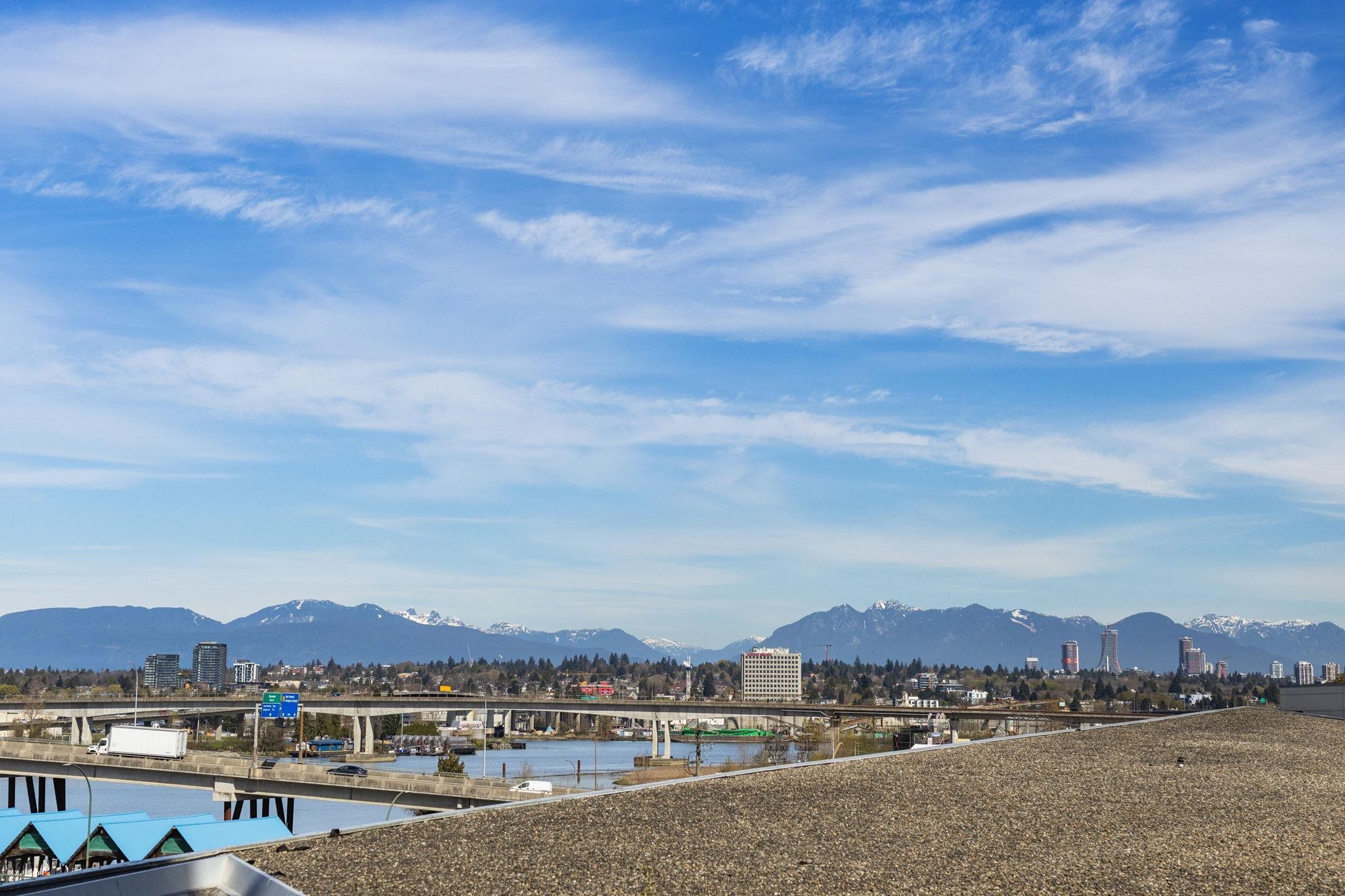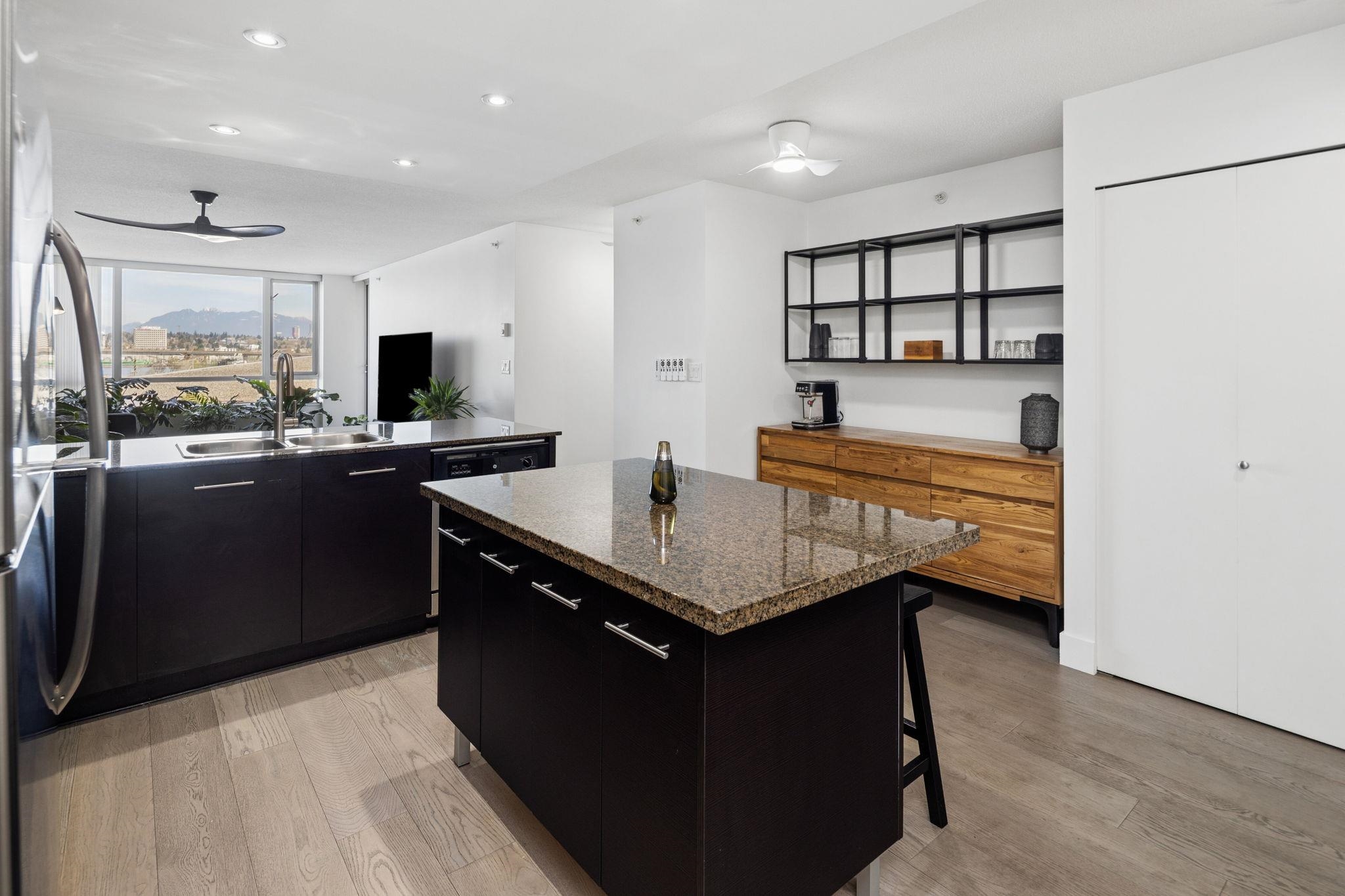 Welcome to Wall Centre Richmond! Enjoy spectacular northwest 180° views of the mountains, water and sunset from this fantastic move-in-ready, 1137sf 2 bedroom 2 full bath condo. Thoughtfully updated with engineered hardwood floors throughout, contemporary lighting and ceiling fans, this bright and functional layout also features granite countertops, s/s appliances, and a spacious portable island with added storage, perfect for everyday living and entertainment. Ideally located just steps to the Canada Line...