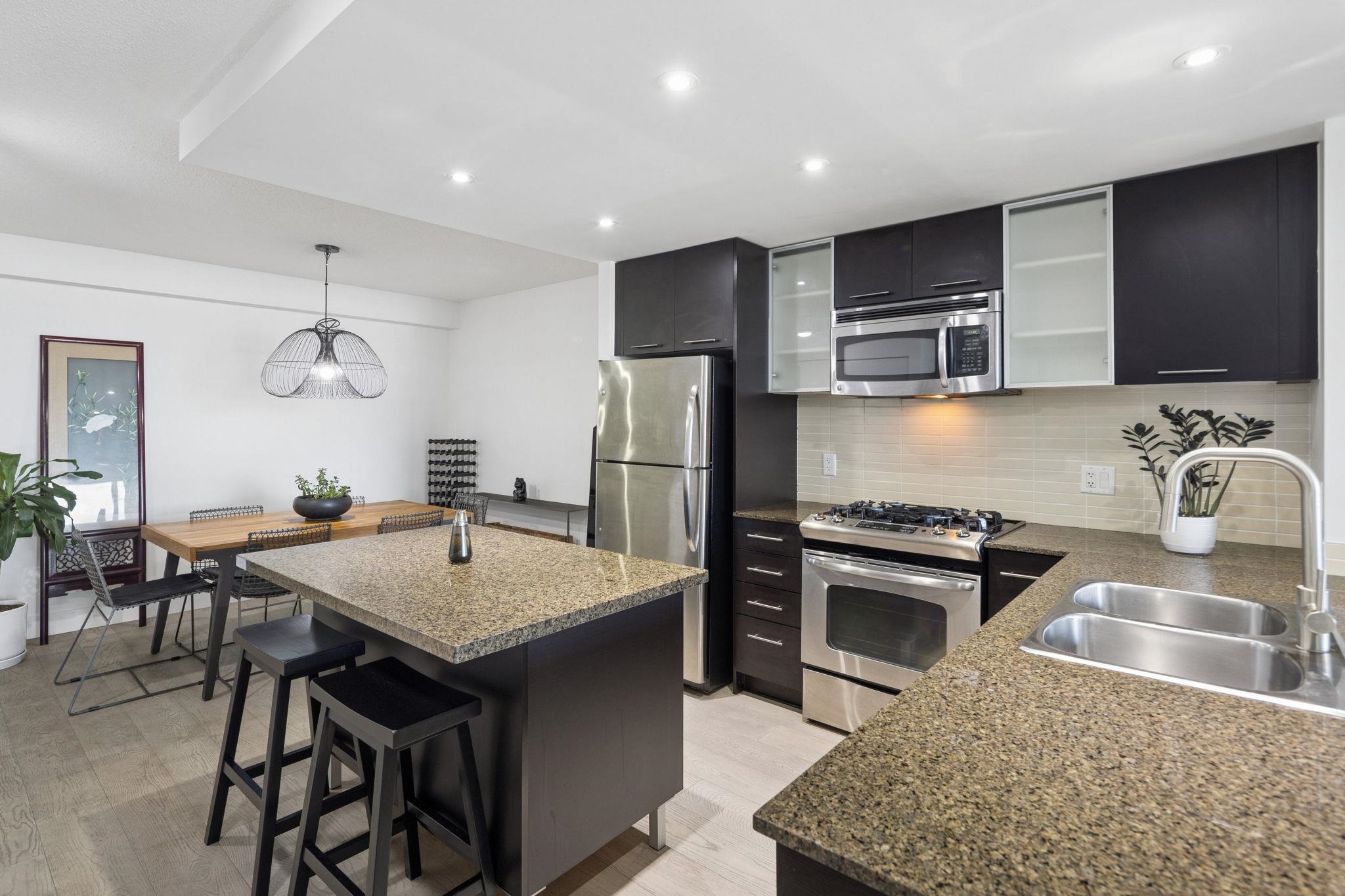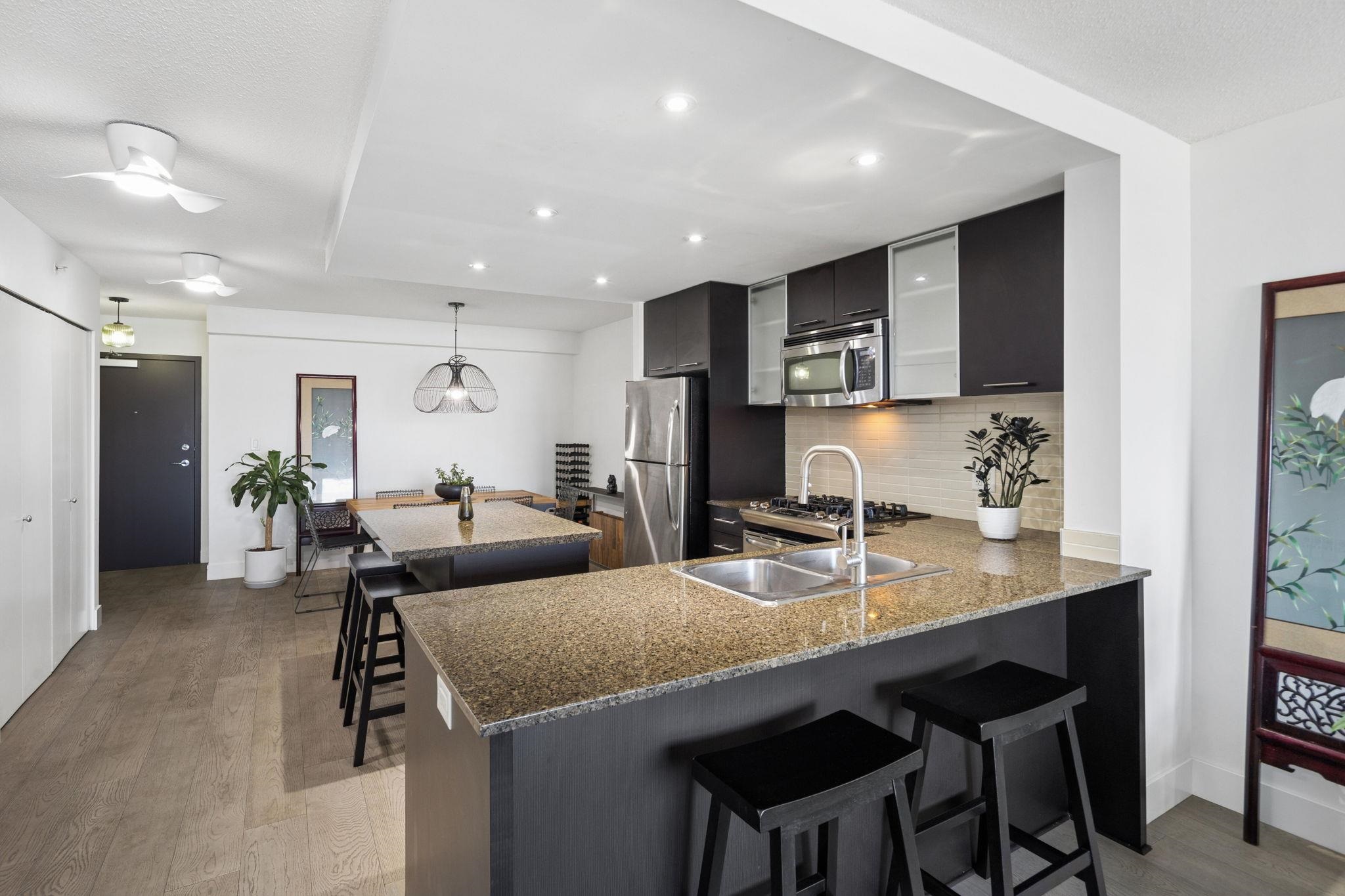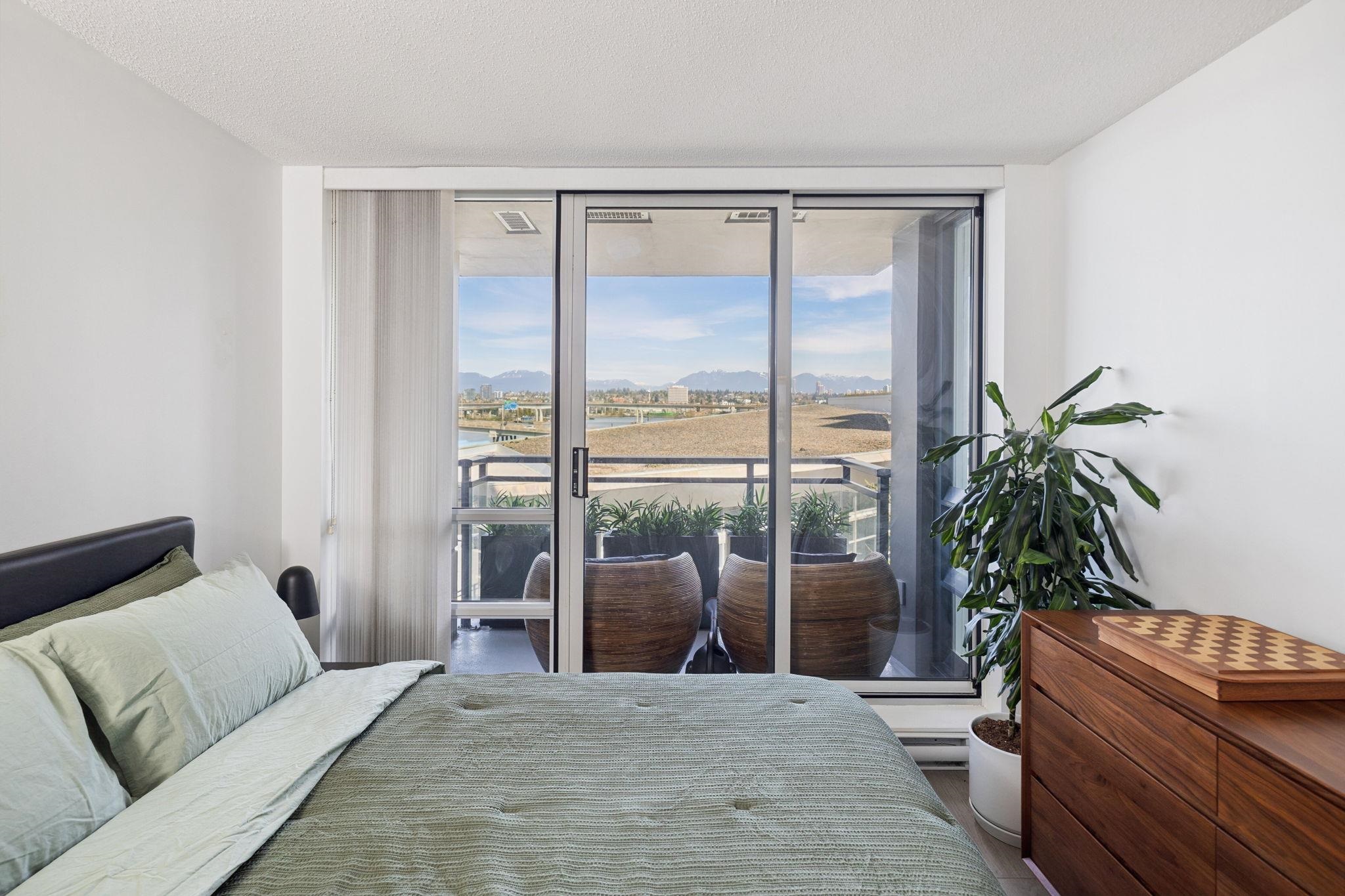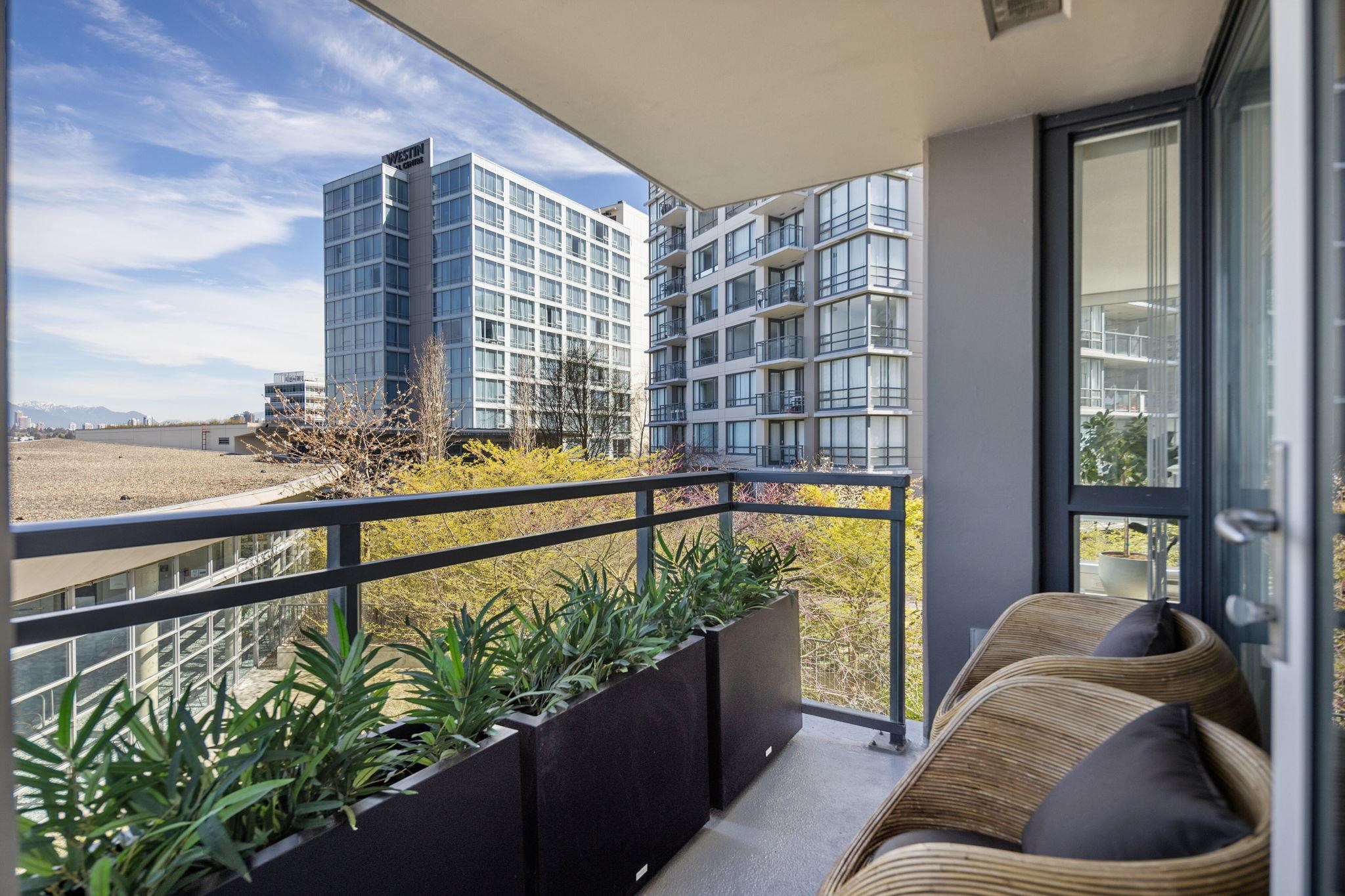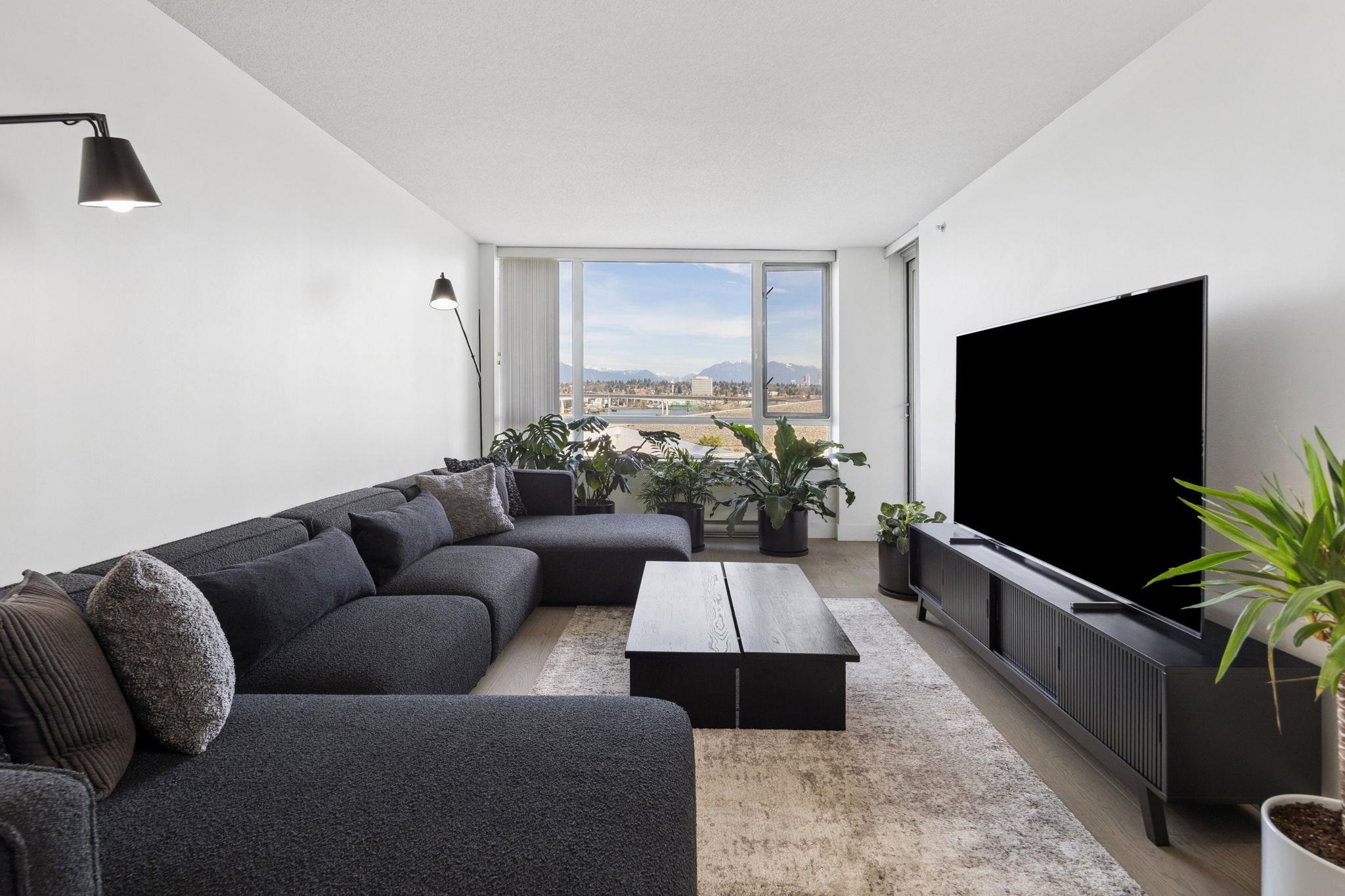 Welcome to Wall Centre Richmond! Enjoy spectacular northwest 180° views of the mountains, water and sunset from this fantastic move-in-ready, 1137sf 2 bedroom 2 full bath condo. Thoughtfully updated with engineered hardwood floors throughout, contemporary lighting and ceiling fans, this bright and functional layout also features granite countertops, s/s appliances, and a spacious portable island with added storage, perfect for everyday living and entertainment. Ideally located just steps to the Canada Line...