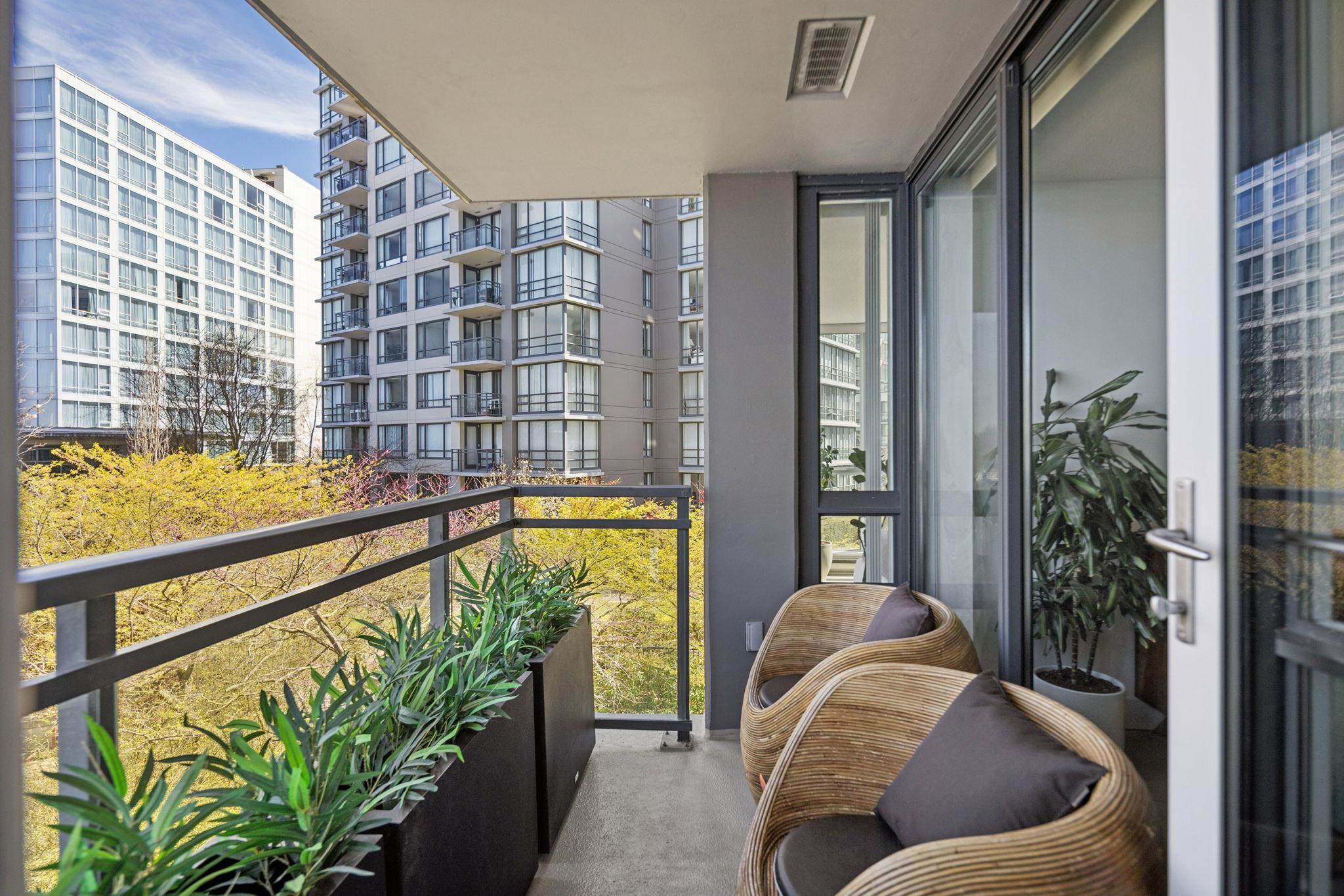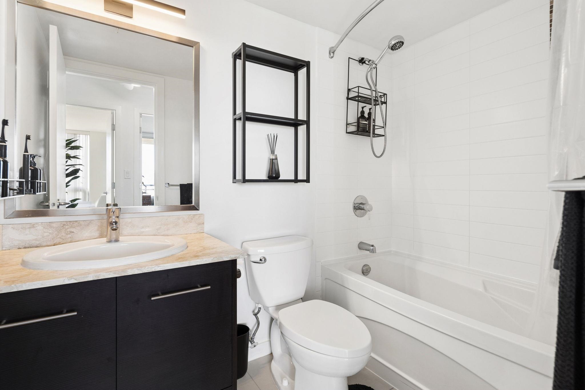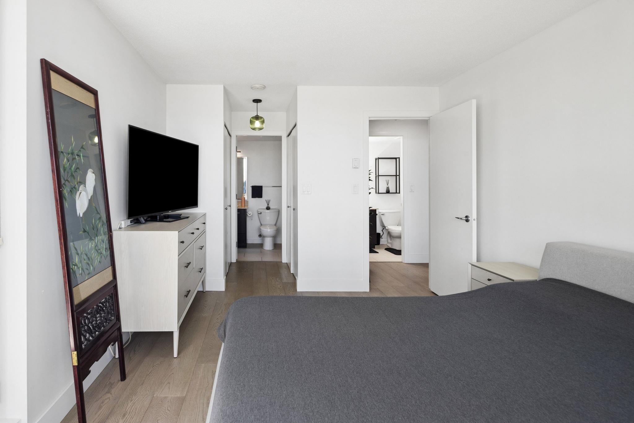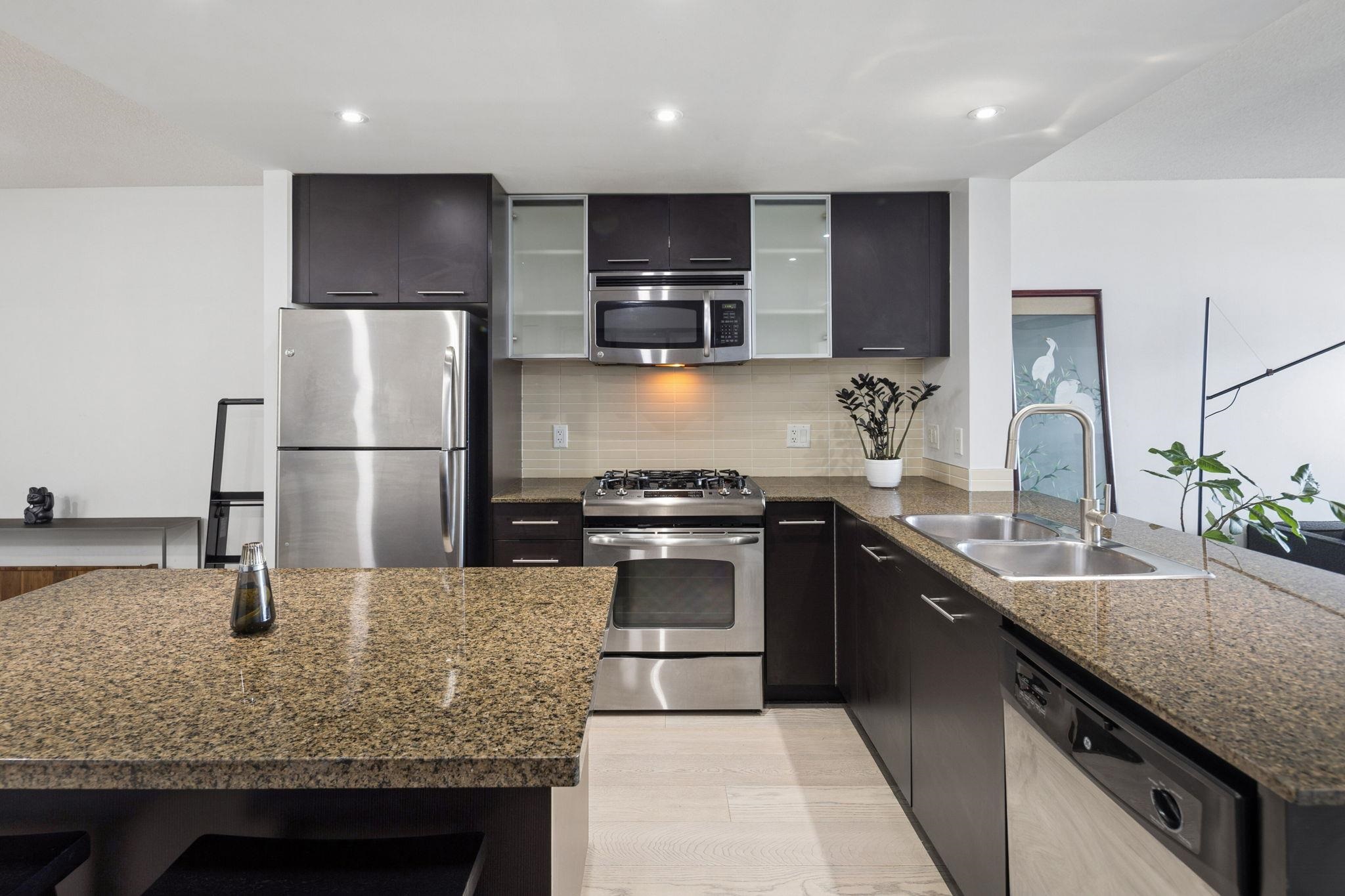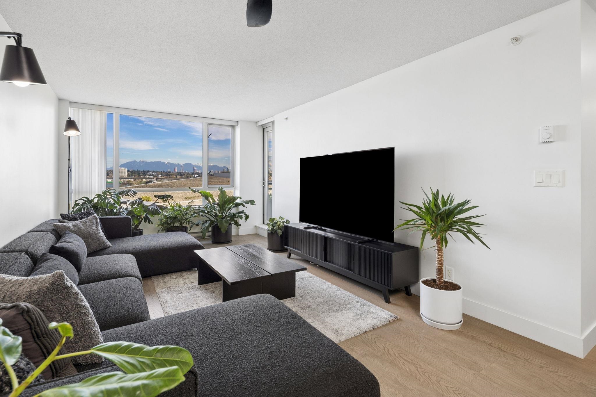 Welcome to Wall Centre Richmond! Enjoy spectacular northwest 180° views of the mountains, water and sunset from this fantastic move-in-ready, 1137sf 2 bedroom 2 full bath condo. Thoughtfully updated with engineered hardwood floors throughout, contemporary lighting and ceiling fans, this bright and functional layout also features granite countertops, s/s appliances, and a spacious portable island with added storage, perfect for everyday living and entertainment. Ideally located just steps to the Canada Line...