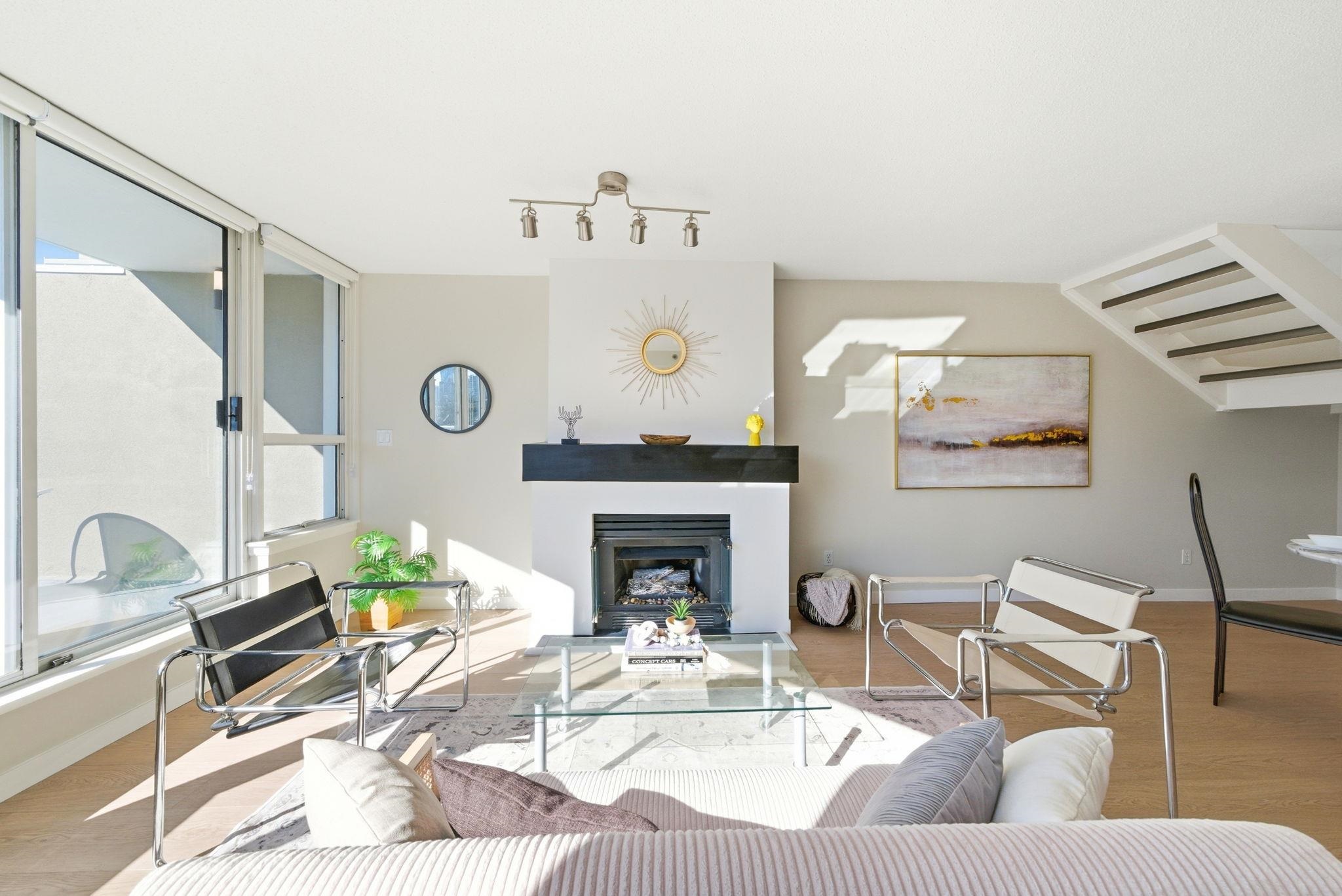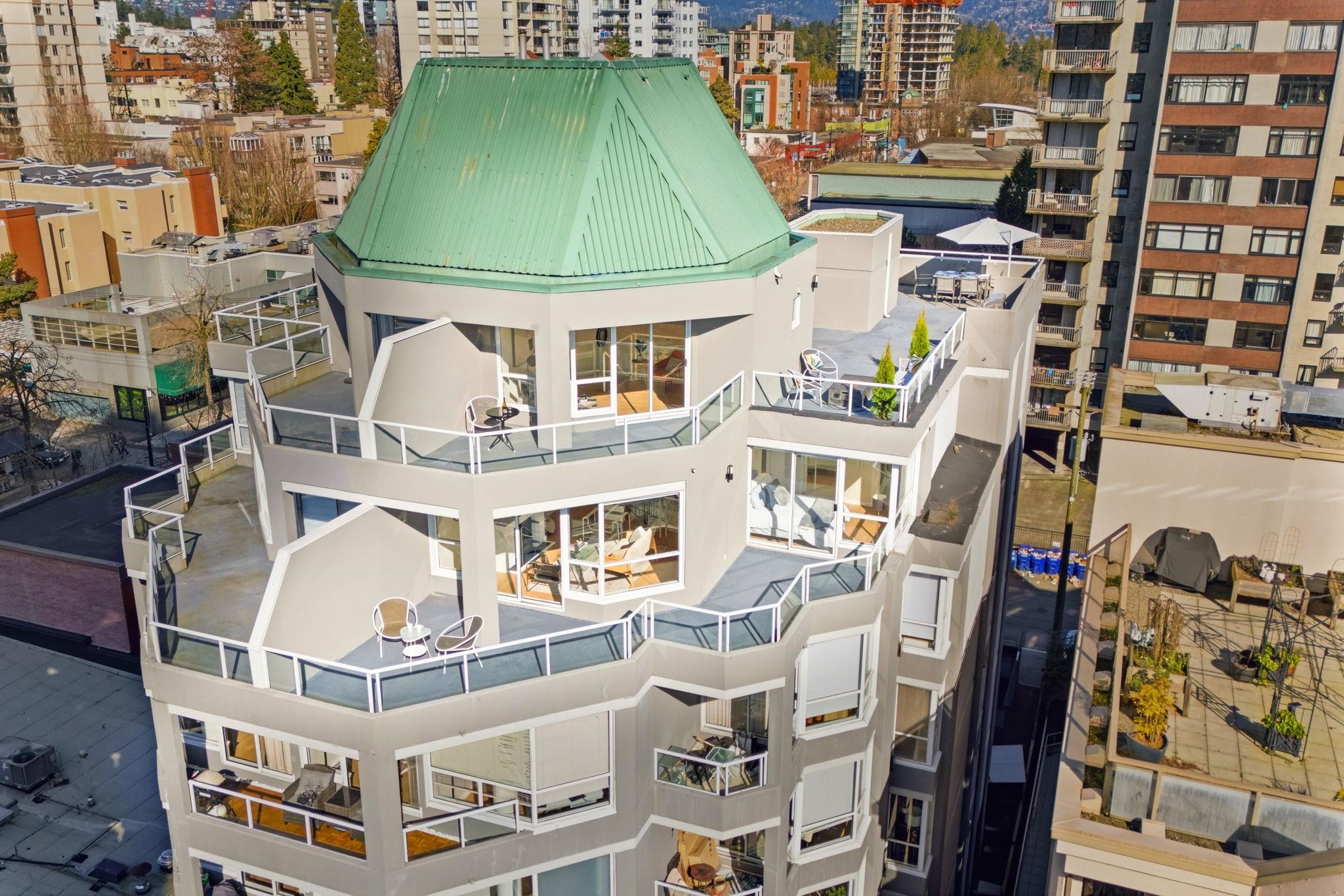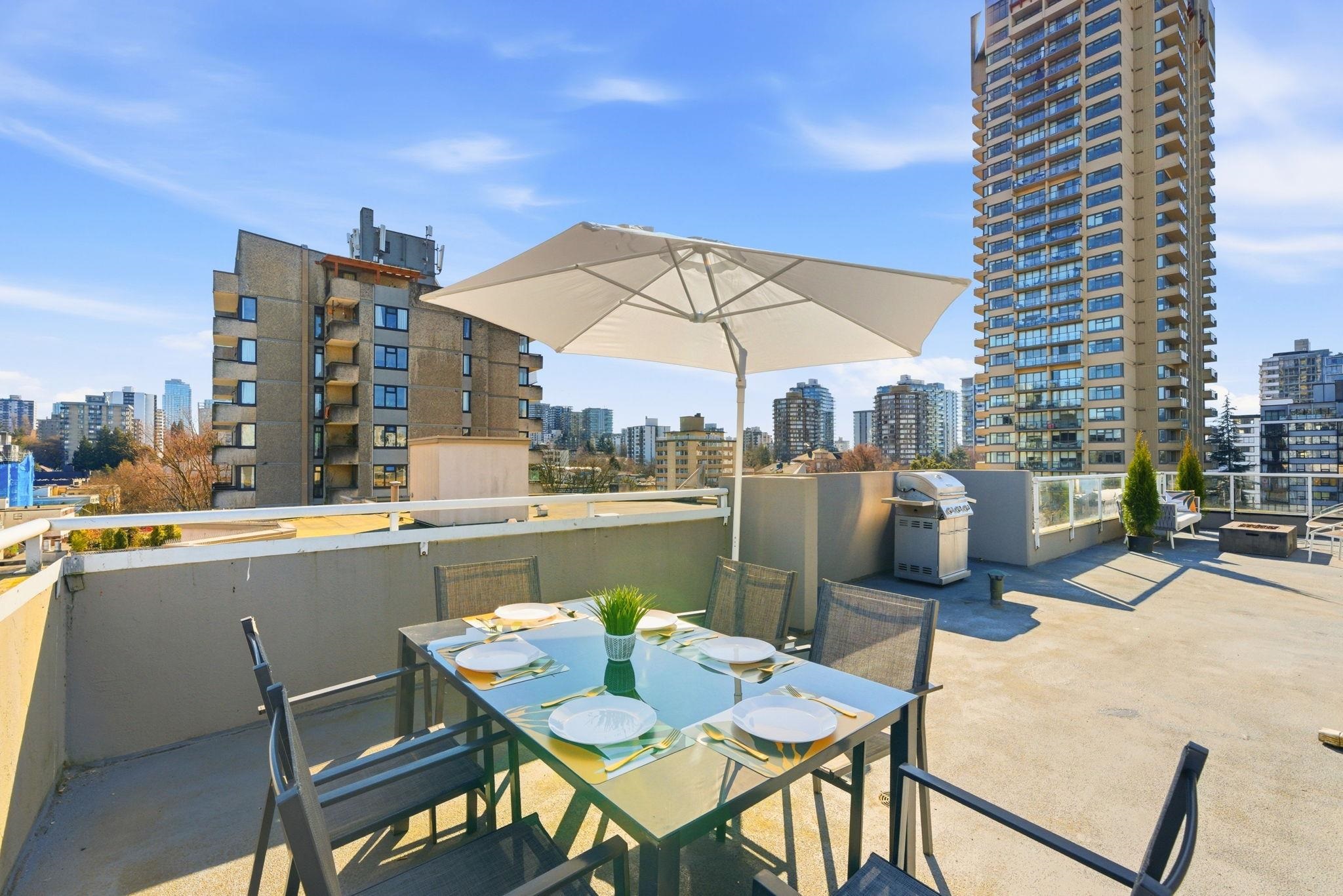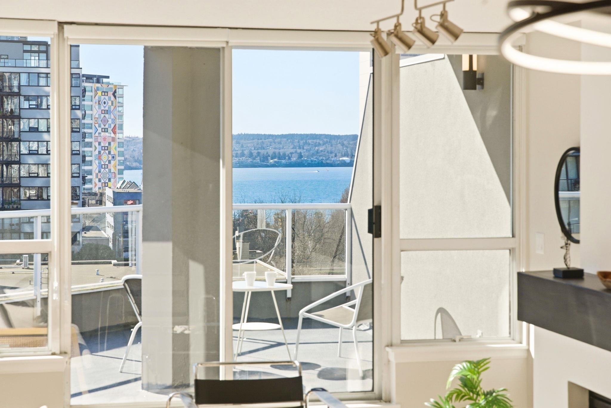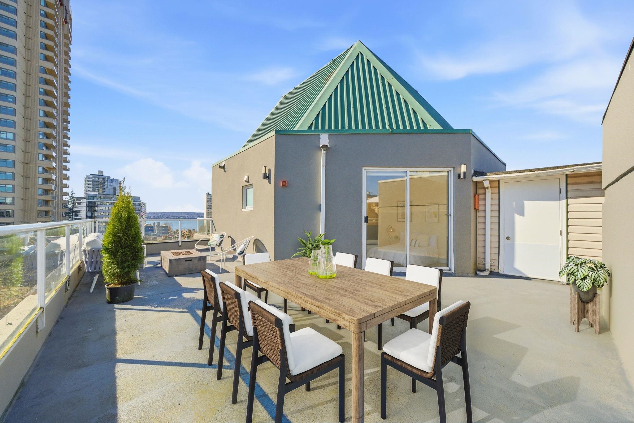SPECTACULAR WEST END PENTHOUSE WITH OVER 1,100 SQFT OF PRIVATE OUTDOOR SPACE. Nearly 1,550 sqft over 2 levels w/ sweeping views of English Bay & the North Shore mountains. The main level features open living w/ gas fireplace, striking floating staircase & access to a south-facing wraparound patio. The primary suite is on the main w/ ensuite, generous closets & patio access, plus a large second bedroom, kitchen & laundry. Upstairs offers a third bedroom, powder room & flex space w/ built-in wine fridge openi...