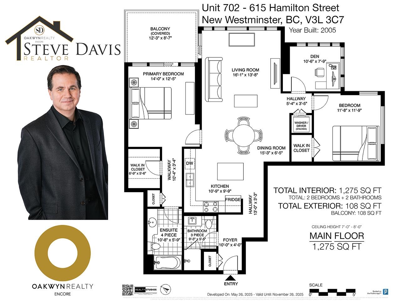 Welcome to The Uptown at 615 Hamilton Street, New Westminster. This bright and spacious 2 bed + den, 2 bath home offers 1,275 square feet of thoughtfully designed living space. Enjoy a private, covered balcony with northeast exposure, perfect for year-round relaxation. The versatile, light-filled den is ideal for a home office. Features include oversized windows, engineered hardwood flooring, a cozy gas fireplace, and a kitchen with a central island. The building offers excellent amenities: gym, amenit...