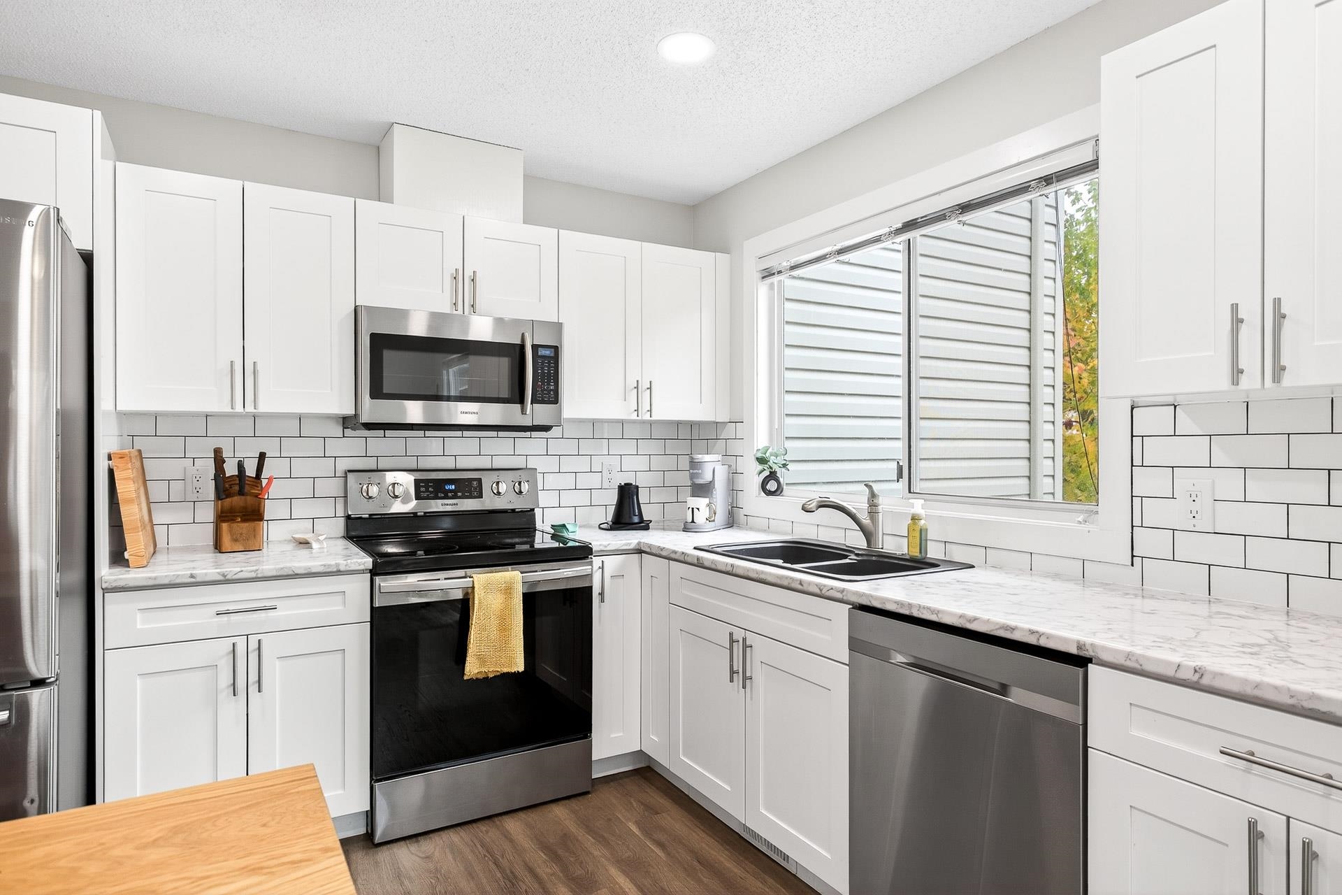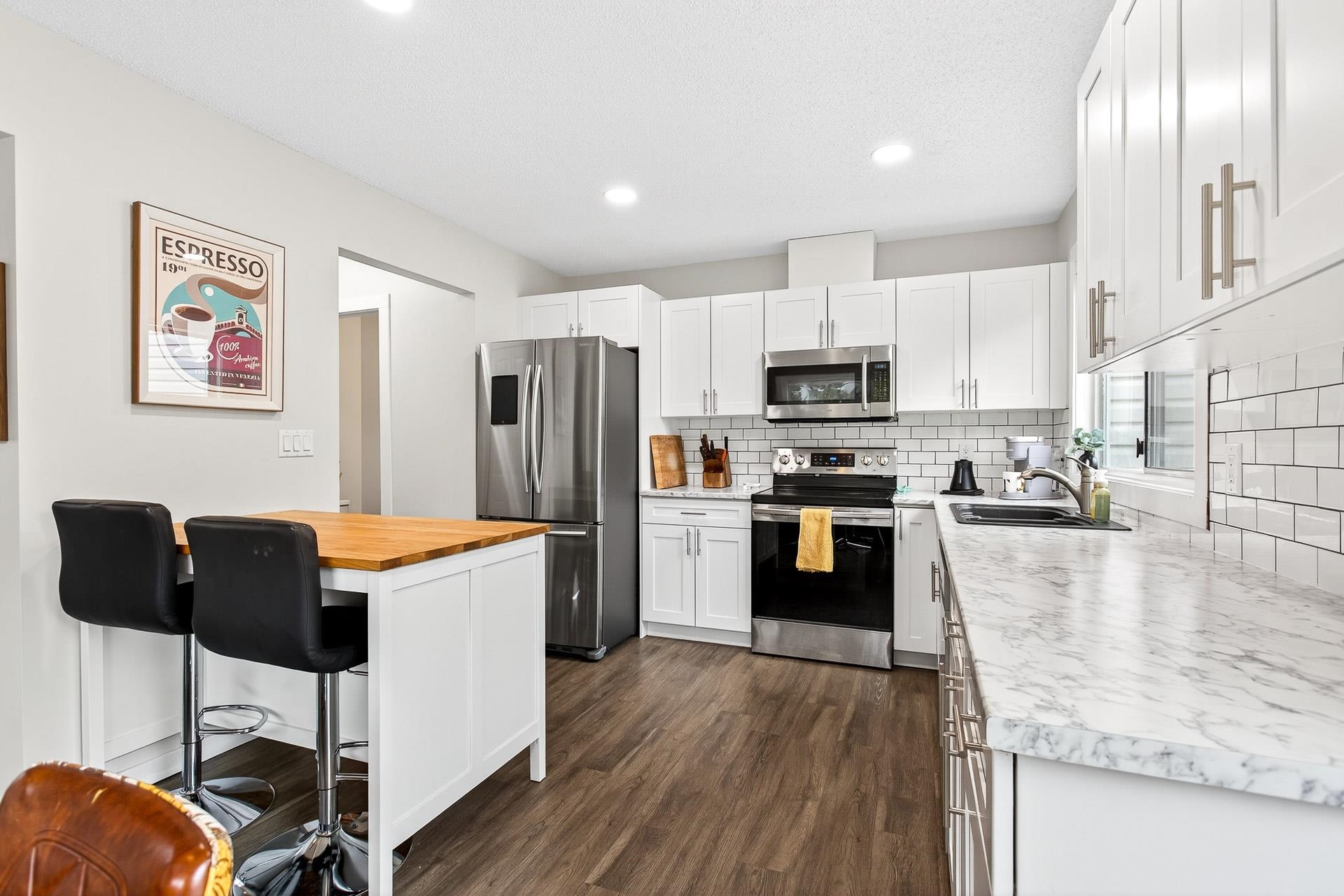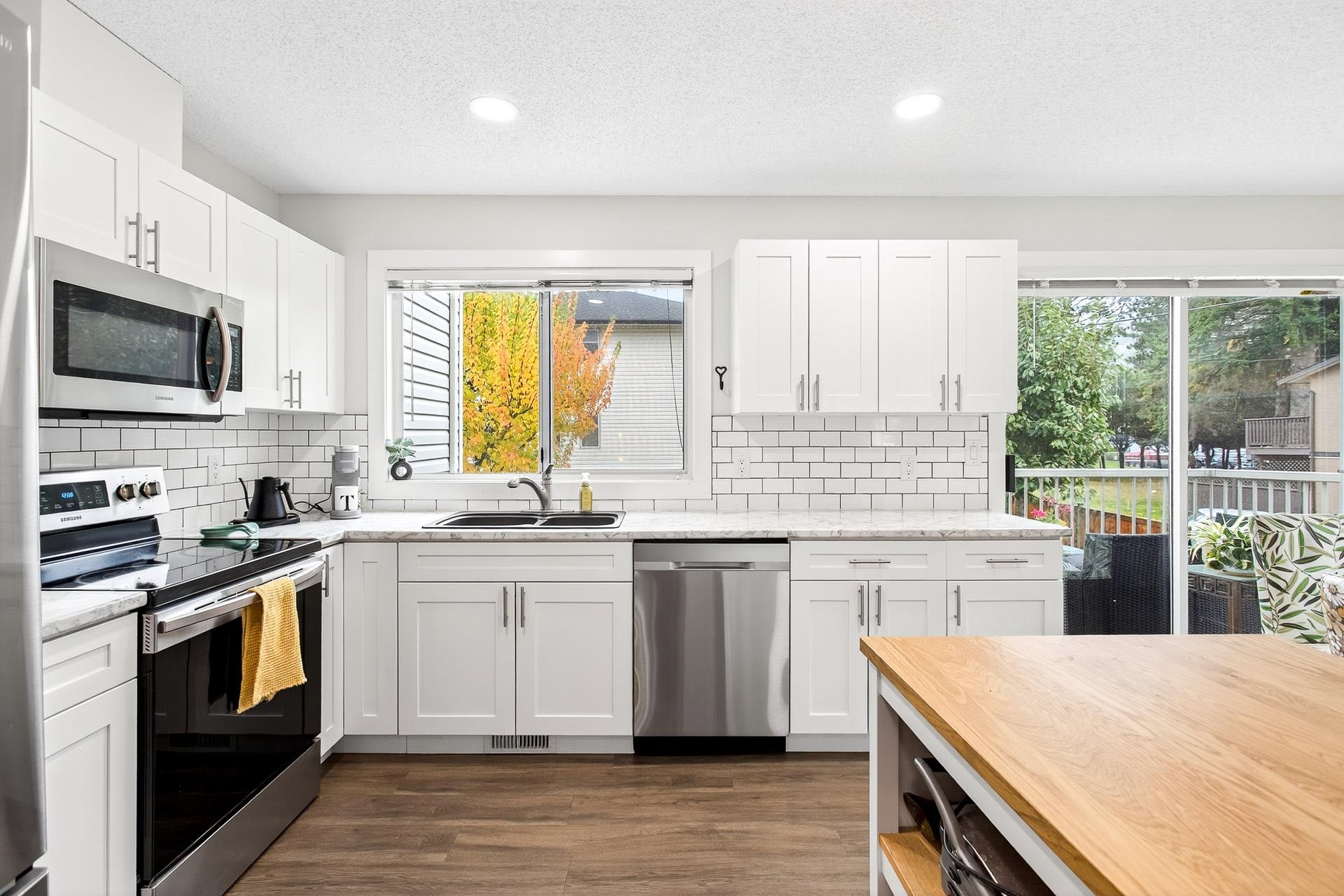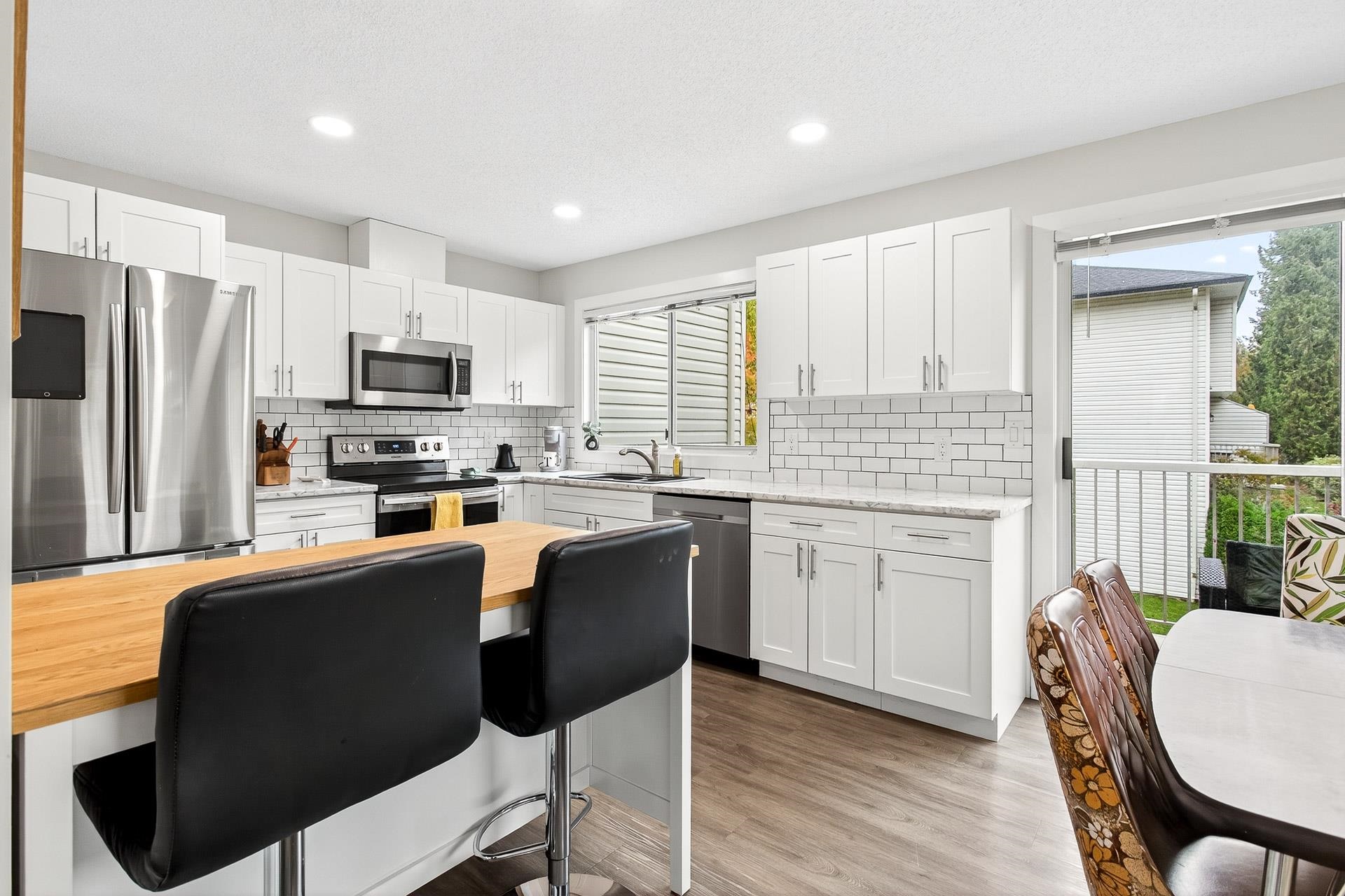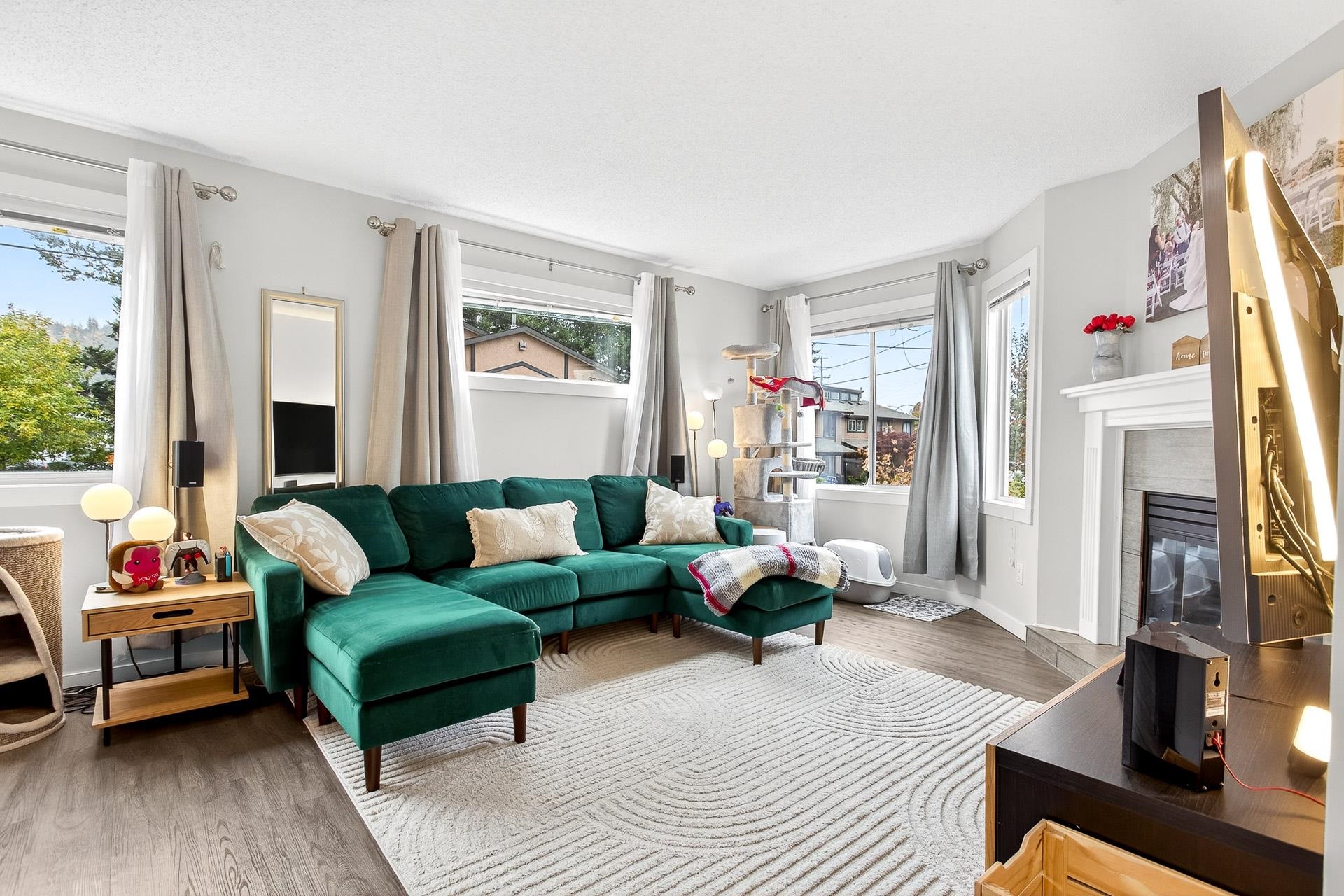 **Parkview Place** Spacious, Bright and updated END UNIT! Extensively renovated in 2021 including all white kitchen with S/S appliances, laminate flooring, baths, sinks, window blinds, pot lights & cozy gas fireplace. New (2024) hot water tank, two stage furnace + HEAT PUMP. Main level features living room with gas fireplace, dining room, updated kitchen + an eating area with access to the balcony. Upstairs has 3 spacious bedrooms including a primary suite with walk-in-closet + 2pc ensuite. Basement rec roo...