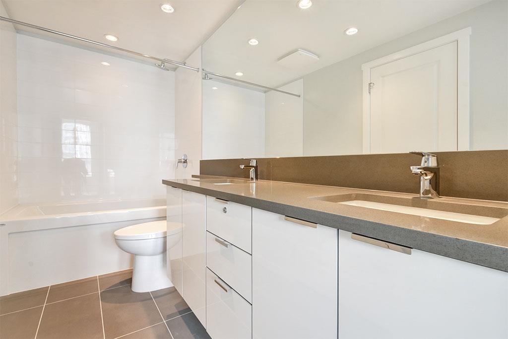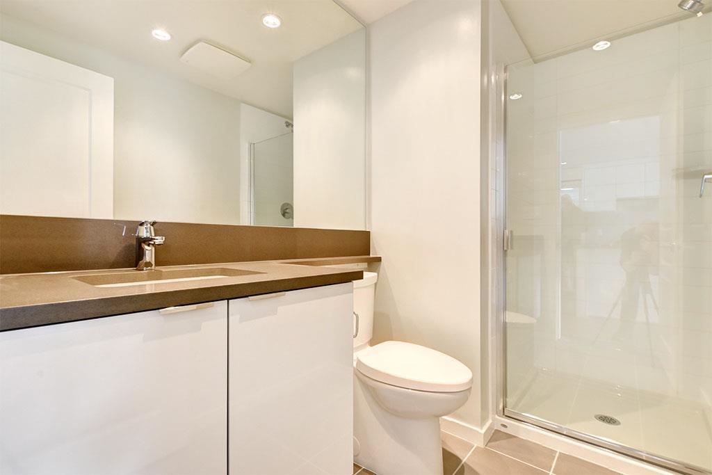 Very functionally designed 2 bedrooms 2 bathrooms condo with high ceilings, an insuite heating and cooling system, and high-end fixtures throughout. Enter straight into the open rectangular living area you find the luxurious open kitchen with large center island with cabinets on one side and built-in dining table on the other end, full-wrap engineered stone countertops, full-height marble tile backsplash, flat-panel cabinetry, integrated Liebherr fridge, KitchenAid gas cooktop and wall oven, and integrated ...