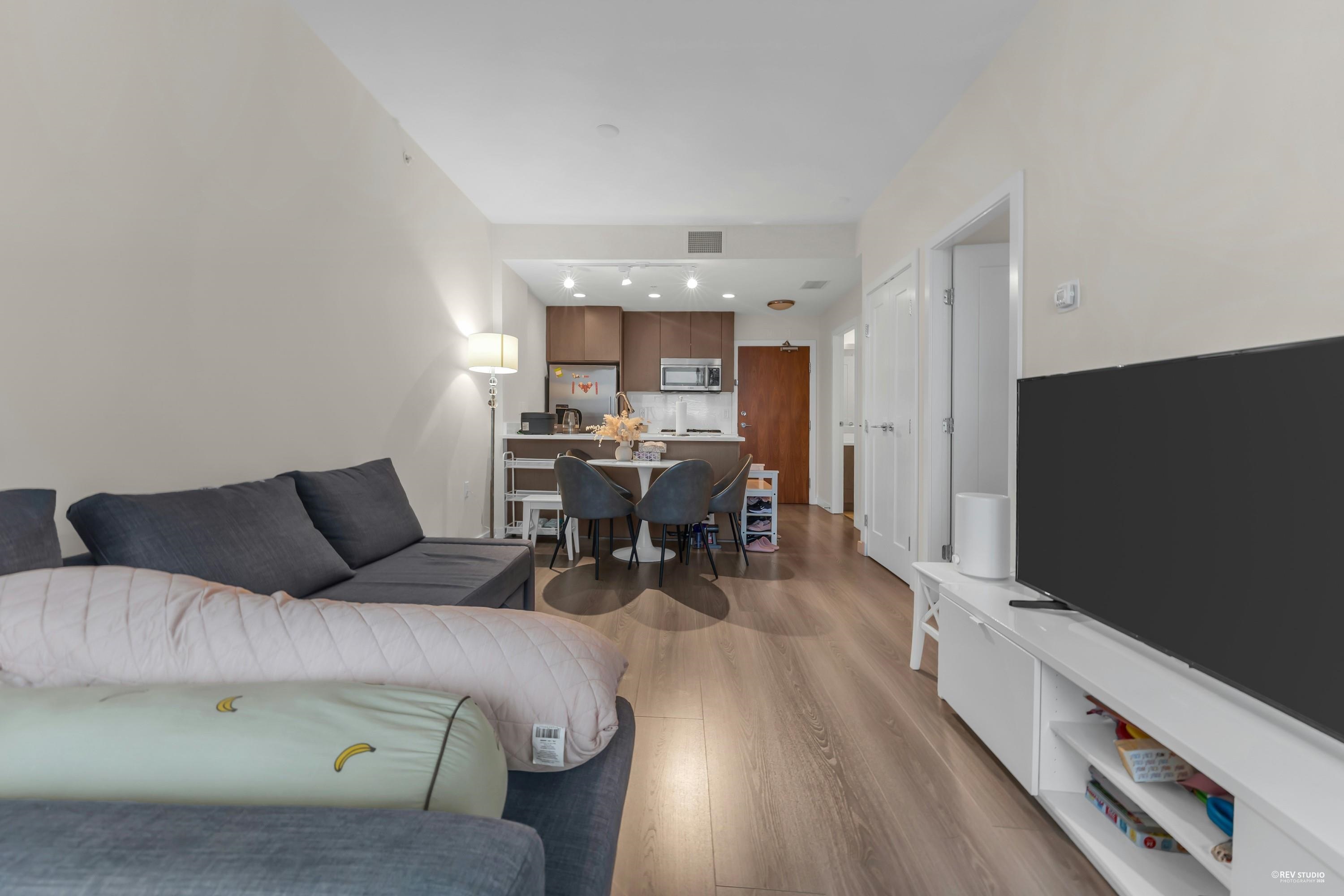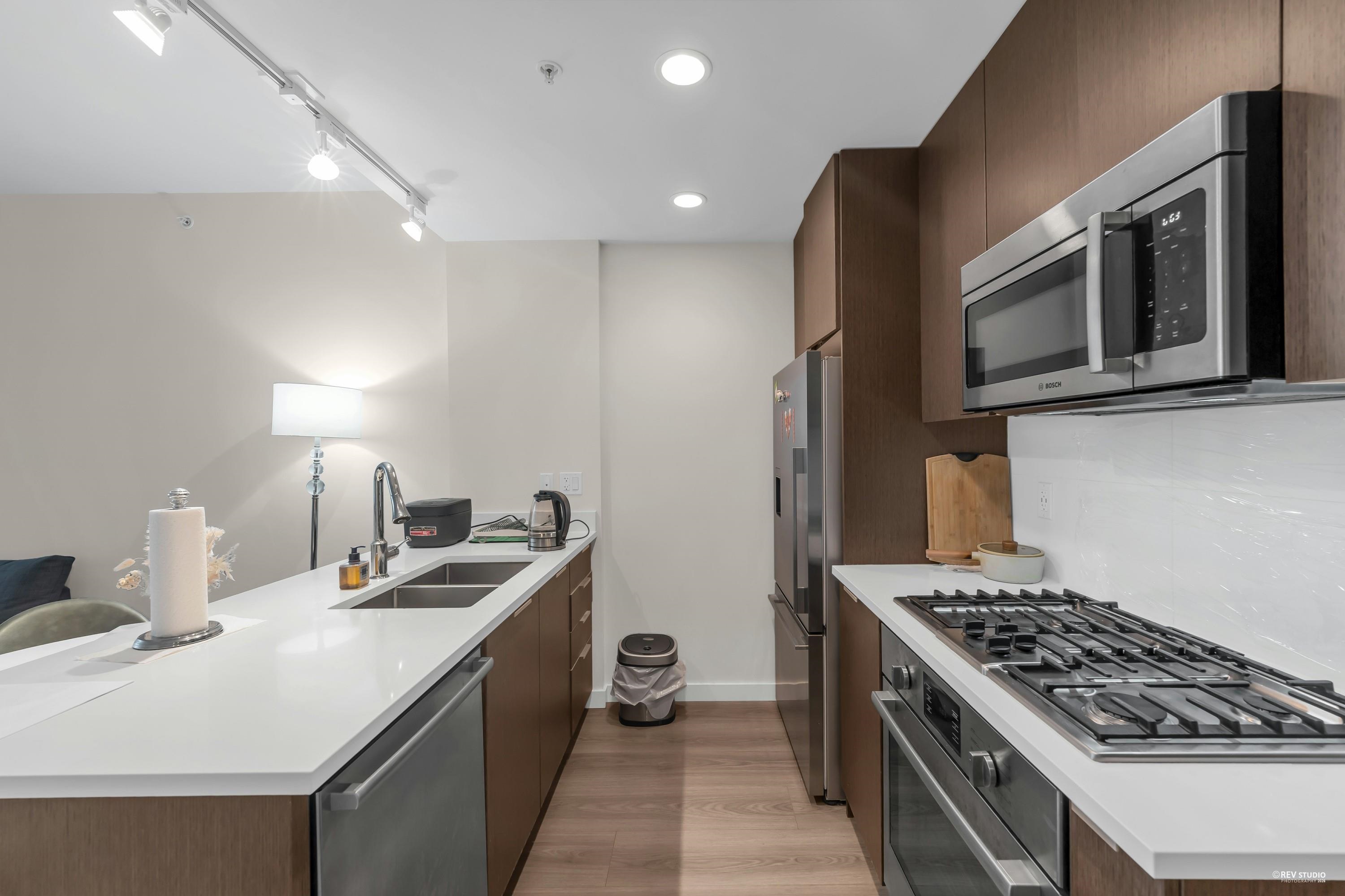 This well-designed 1 bedroom home offers an open-concept layout with 9 ft ceilings, laminate flooring, and full air conditioning. The modern kitchen features quality stainless steel appliances and sleek finishes, flowing seamlessly into the living area. Enjoy a bright east-facing balcony with open views, plus a walk-through closet to a semi-ensuite bathroom. One parking stall included. Residents enjoy resort-style amenities including an indoor pool, hot tub, gym, sports courts, sauna, lounge, and outdoor sp...