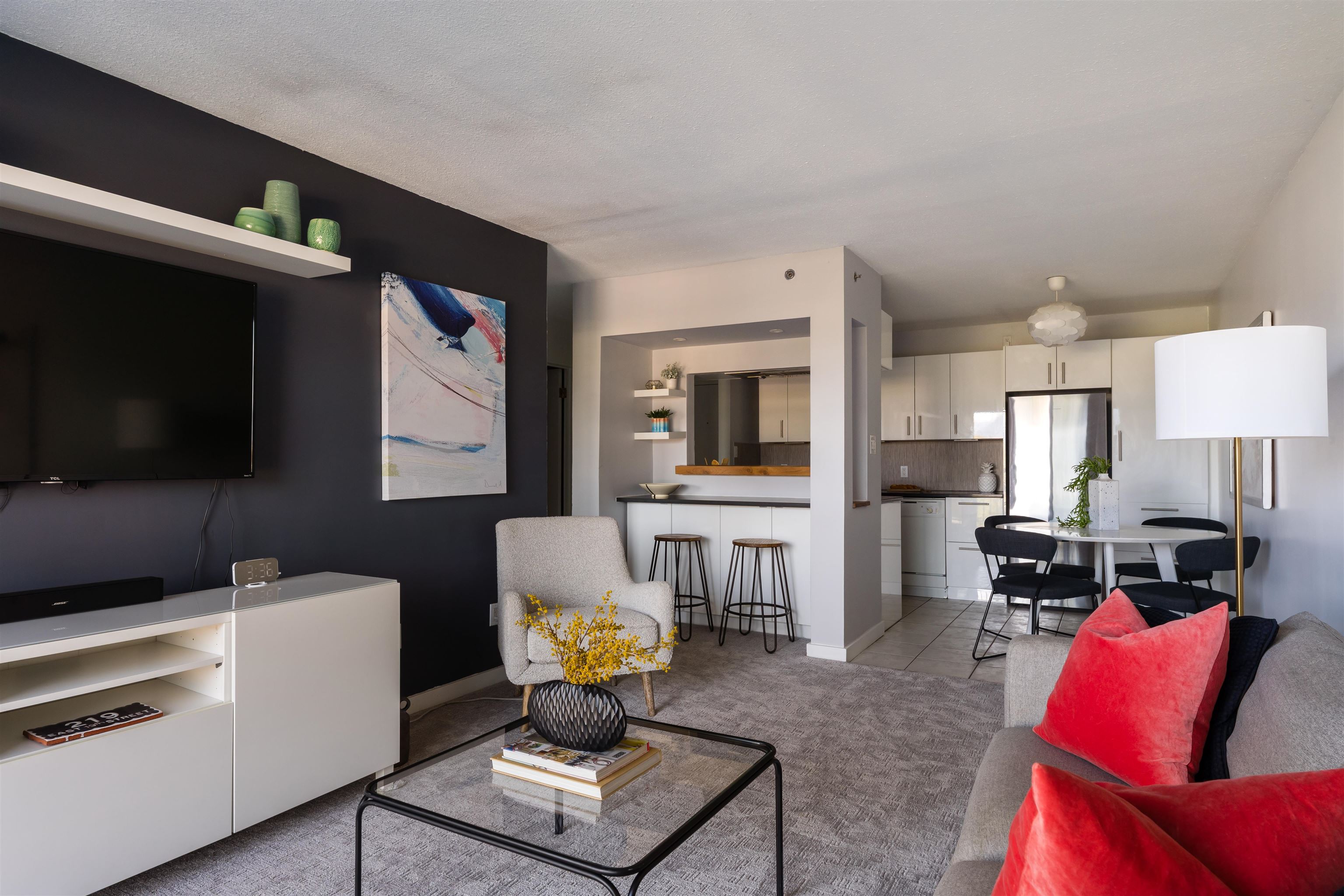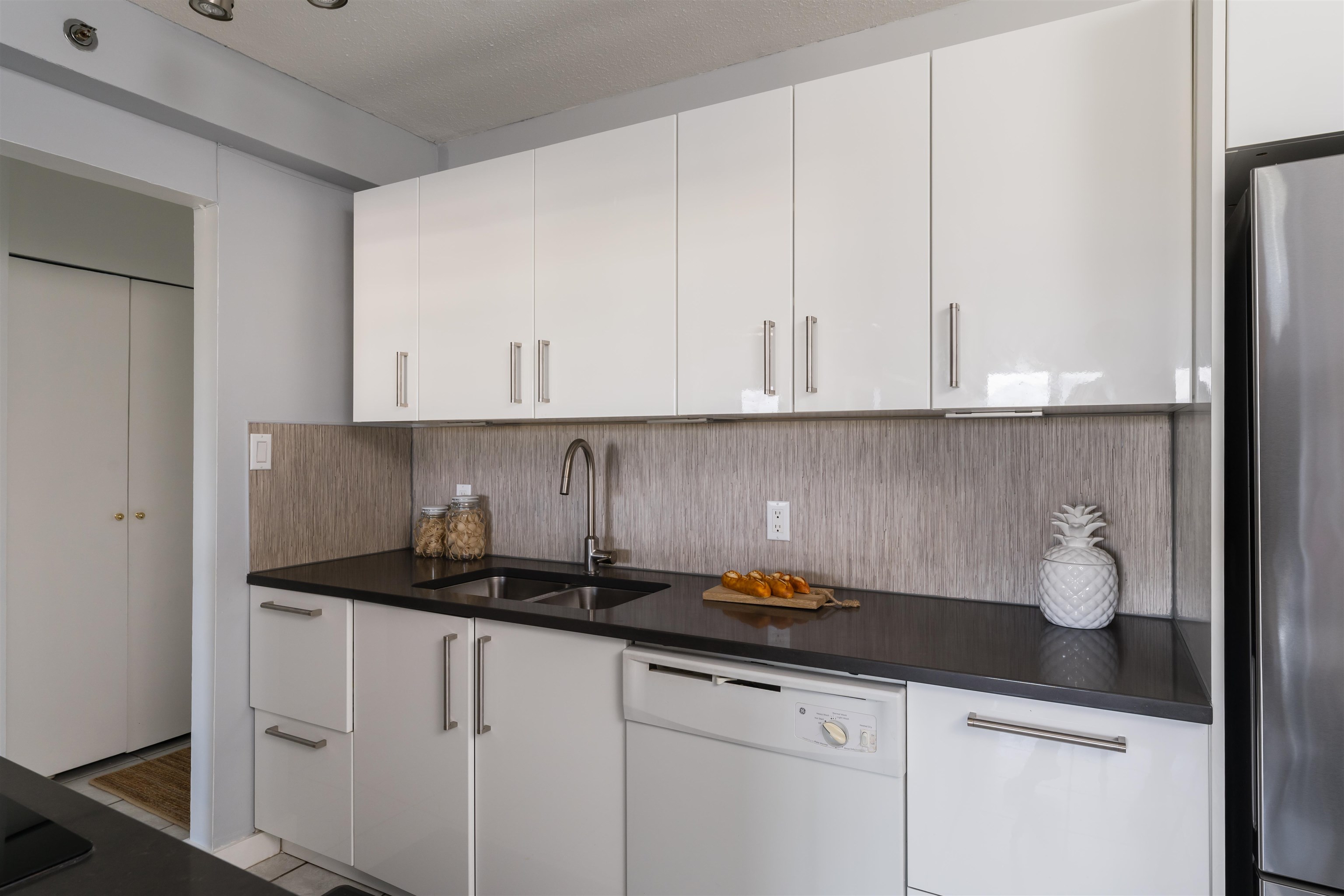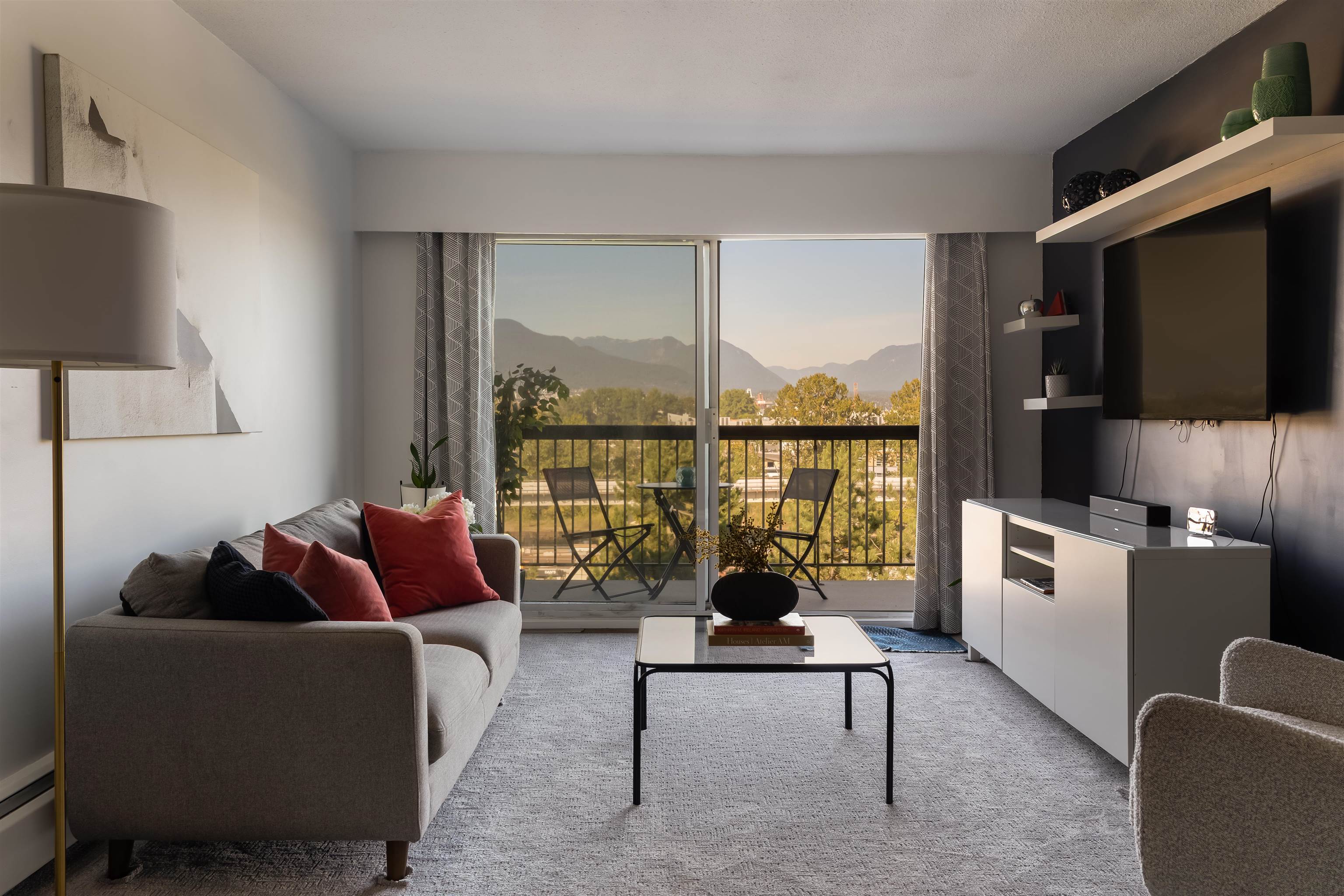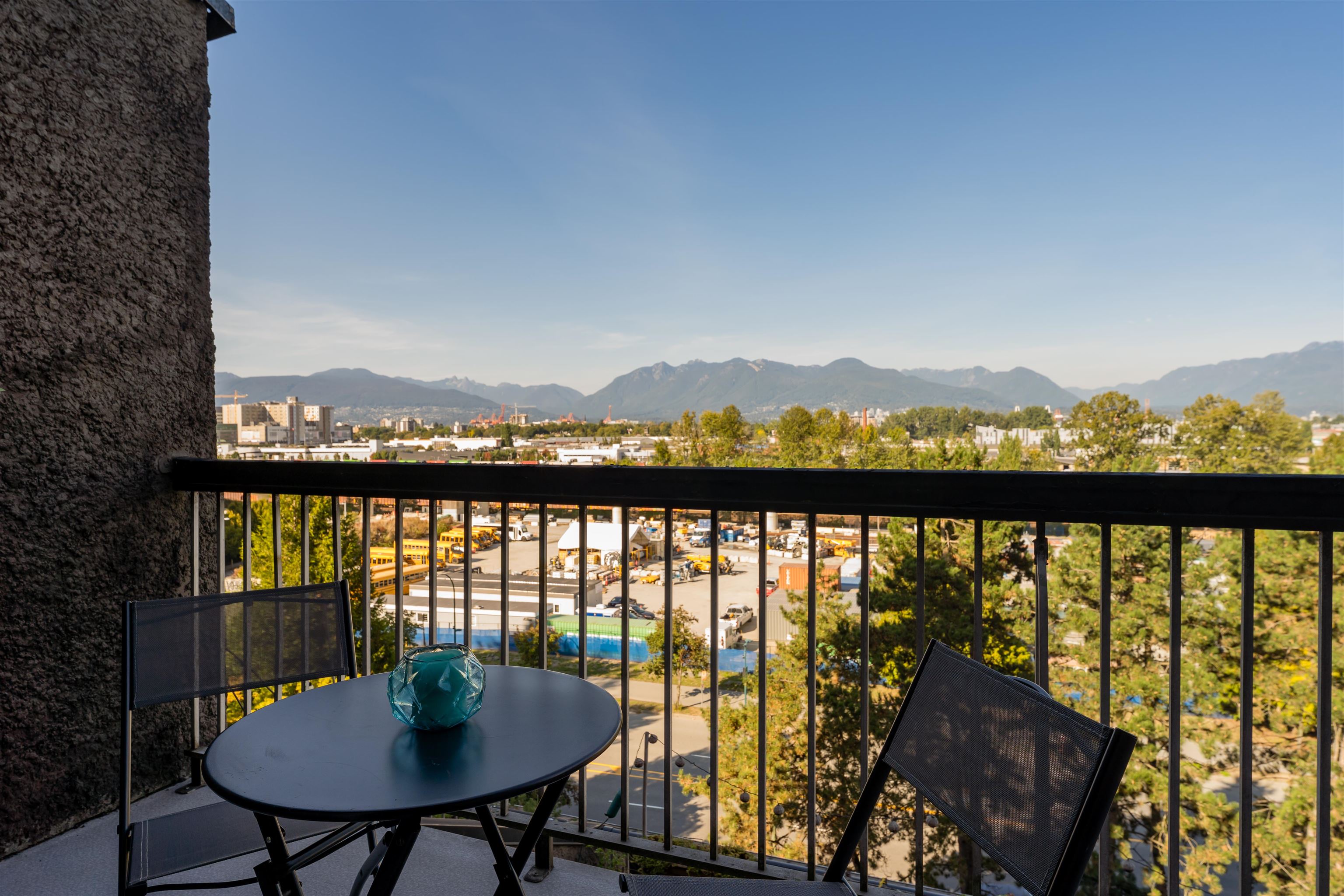 Welcome to Pacific Terraces, a bright 1bed, 1bath, 612SF home w/ beautiful NorthShoreMountain views. Fully reno'd kitchen 2018: cabinetry, counters, backsplash, doublesink+faucet, appliances, & opened walls. New carpet w/ a fresh paint in 2025. Proactive strata approved upcoming exterior renewal: roofs, decks&railings, insulation, rainscreen, cladding, + windows. ~$44,000 levy fully paid by the seller. Previous upgrades: repiping, resurfaced parkade, & seismic work. Amenities: updated gym, sauna, + carwash....