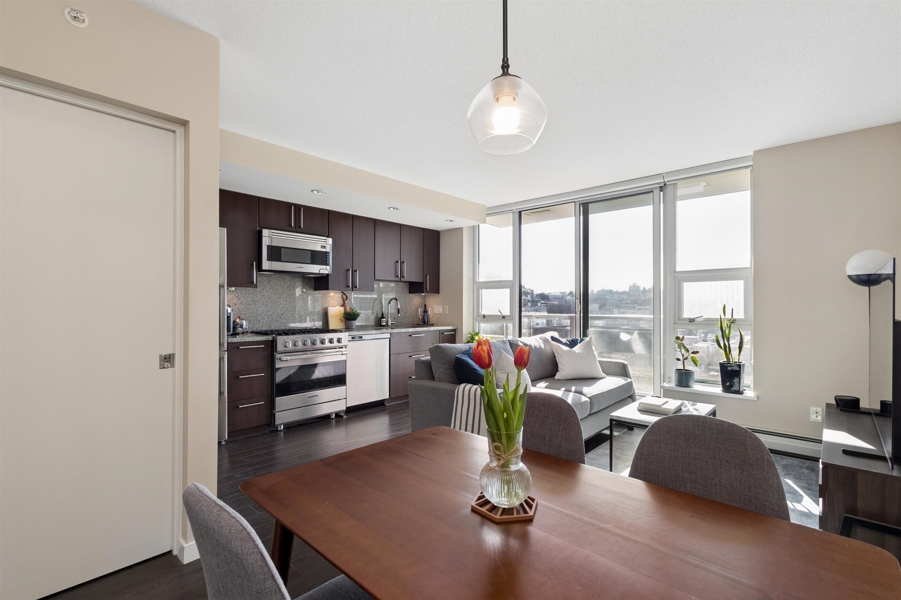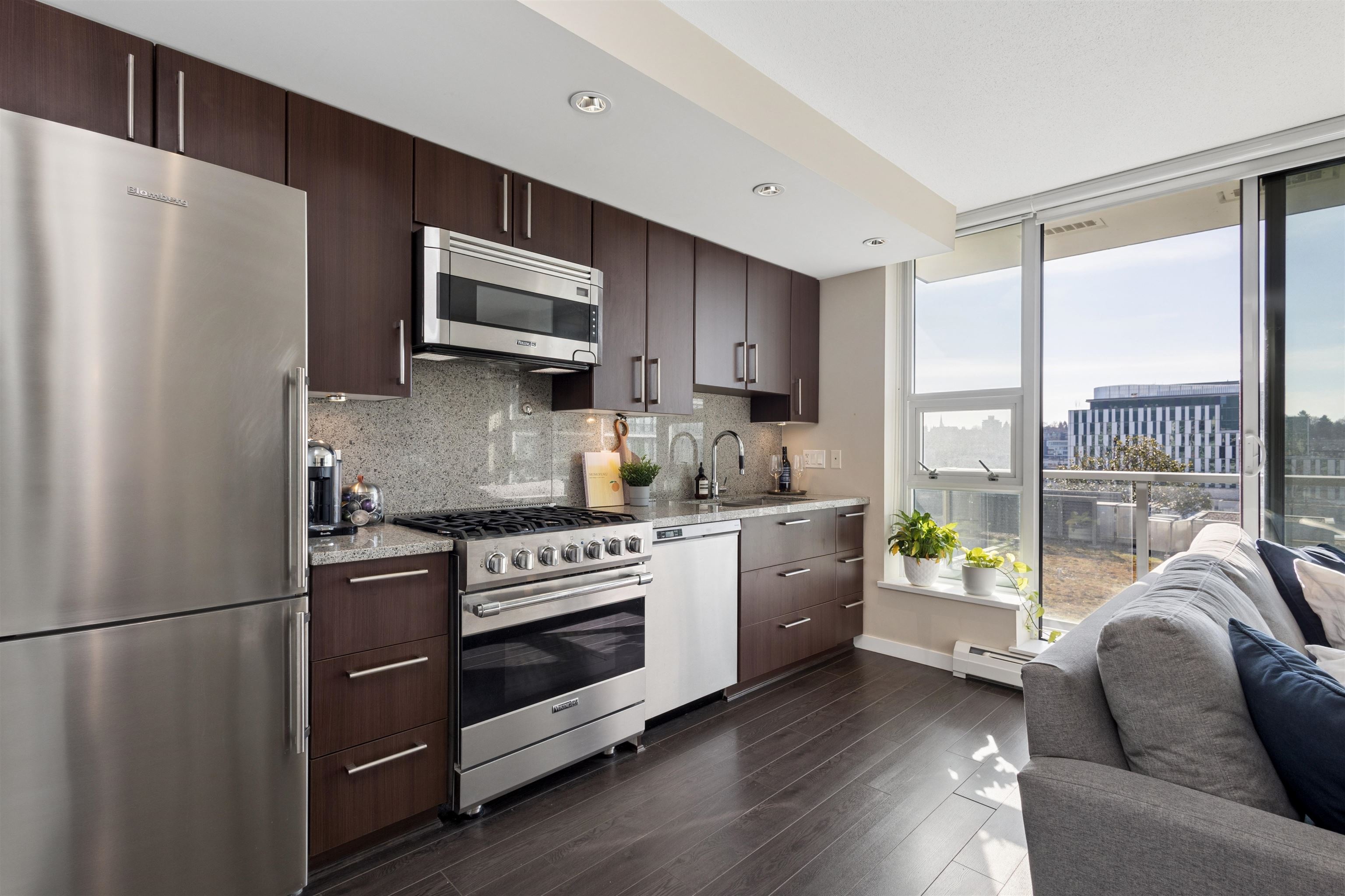Live in the Heart of Olympic Village! Welcome to Wall Centre False Creek, a premium concrete residence just steps from the Seawall. This bright, south-facing Jr 1-bedroom home features an efficient open-concept layout with floor-to-ceiling windows and a private balcony with sunny city views. Built in 2013, the unit boasts high-end finishes, including a gourmet kitchen with a high-end Viking 5-burner gas range, built-in S/S appliances, and granite counters. Residents enjoy 5-star amenities: a fully equipped ...
